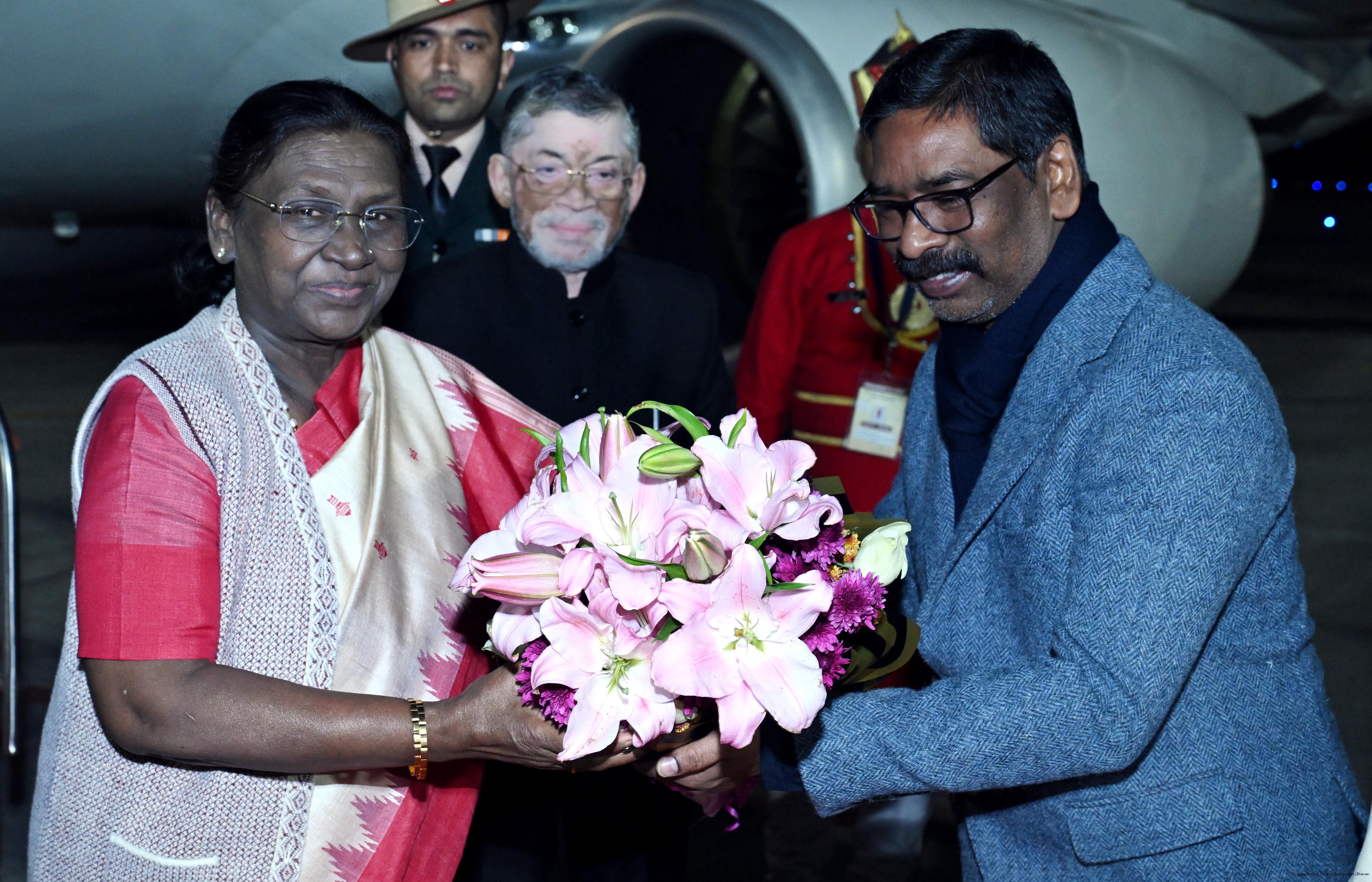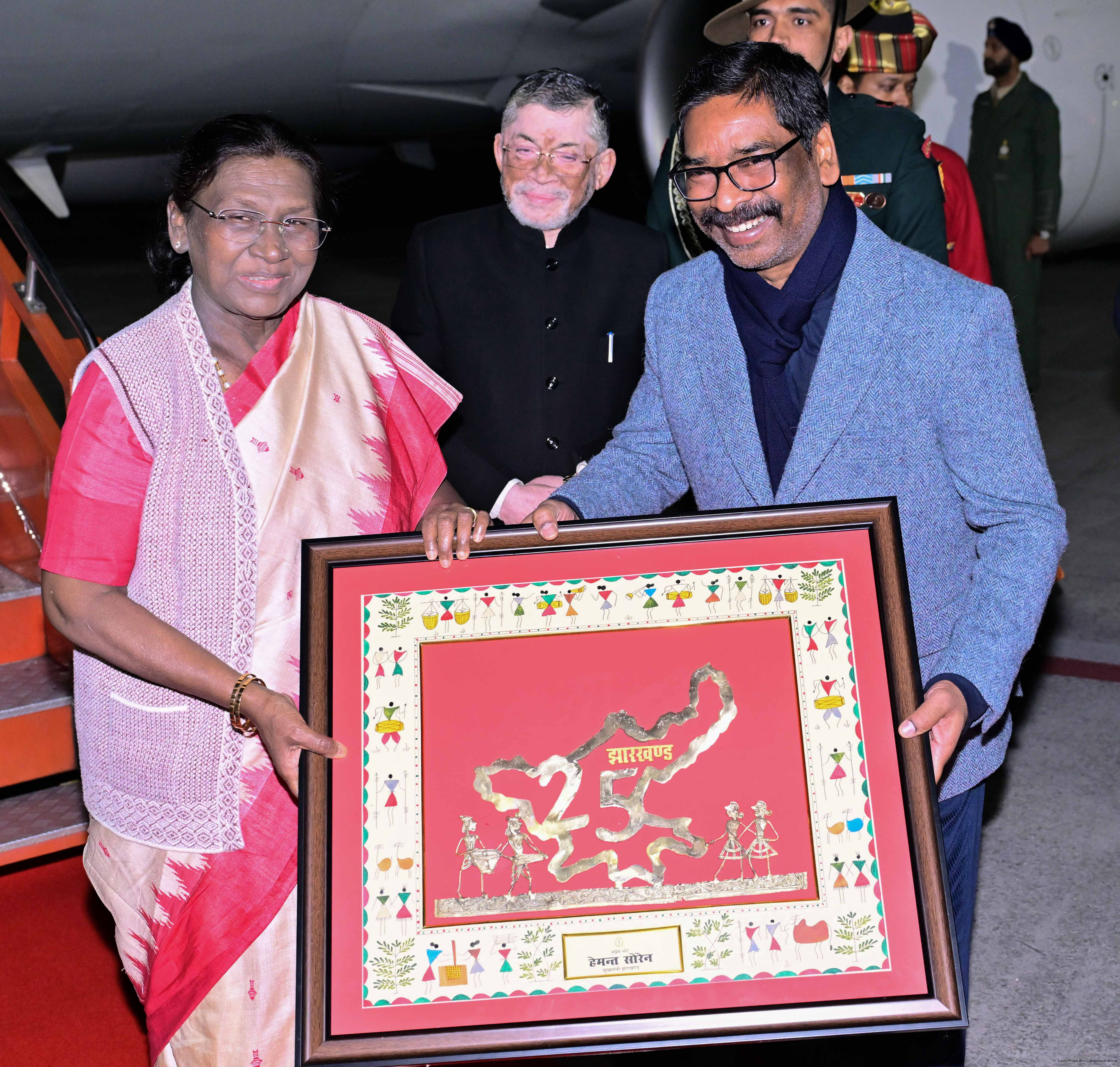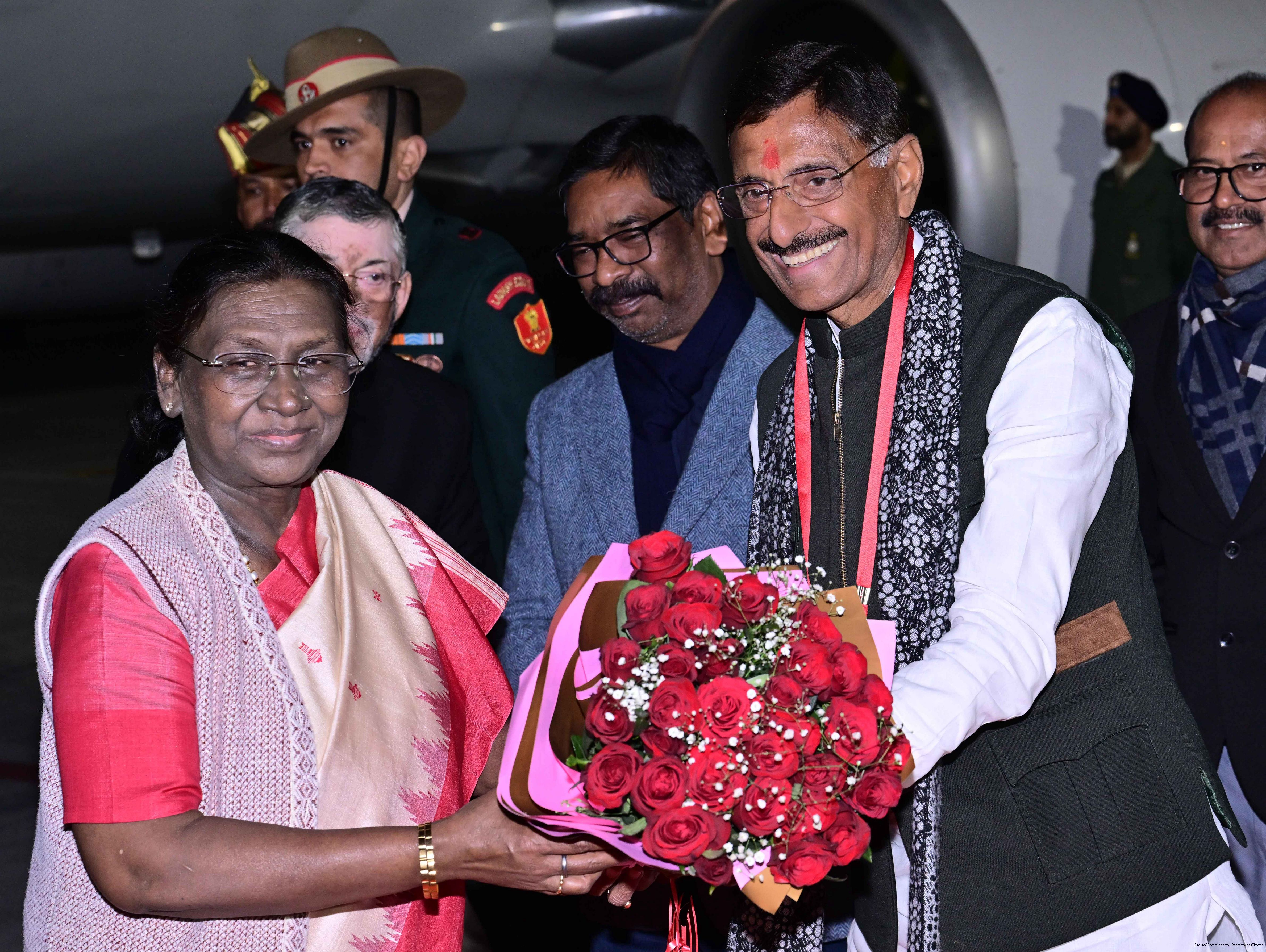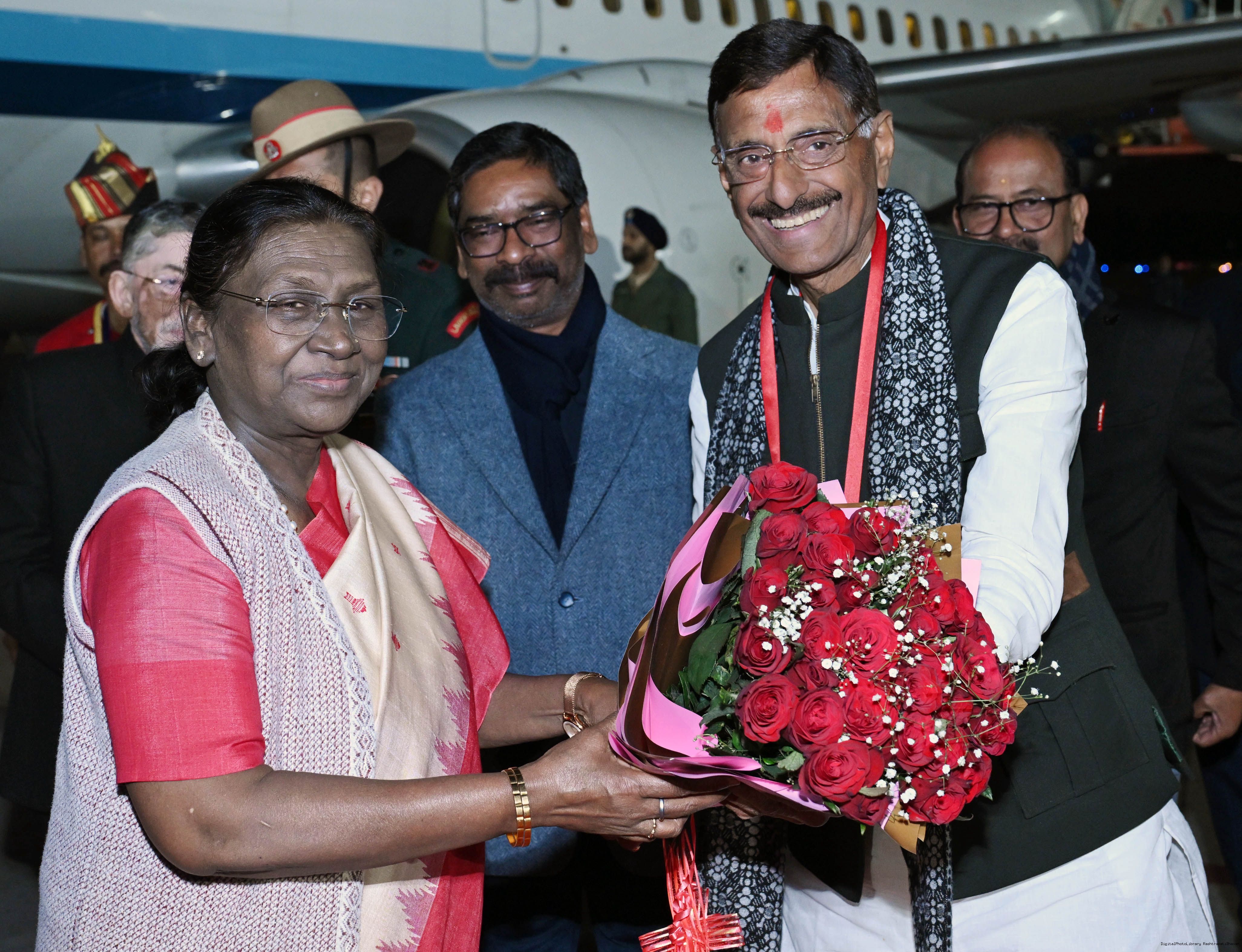 | Caption: | The Governor of Jharkhand, Shri Santosh Kumar Gangwar, Chief Minister Shri Hemant Soren and Minister of State for Defence Shri Sanjay Seth received the President of India, Smt. Droupadi Murmu on her arrival in Ranchi on December 28, 2025. |