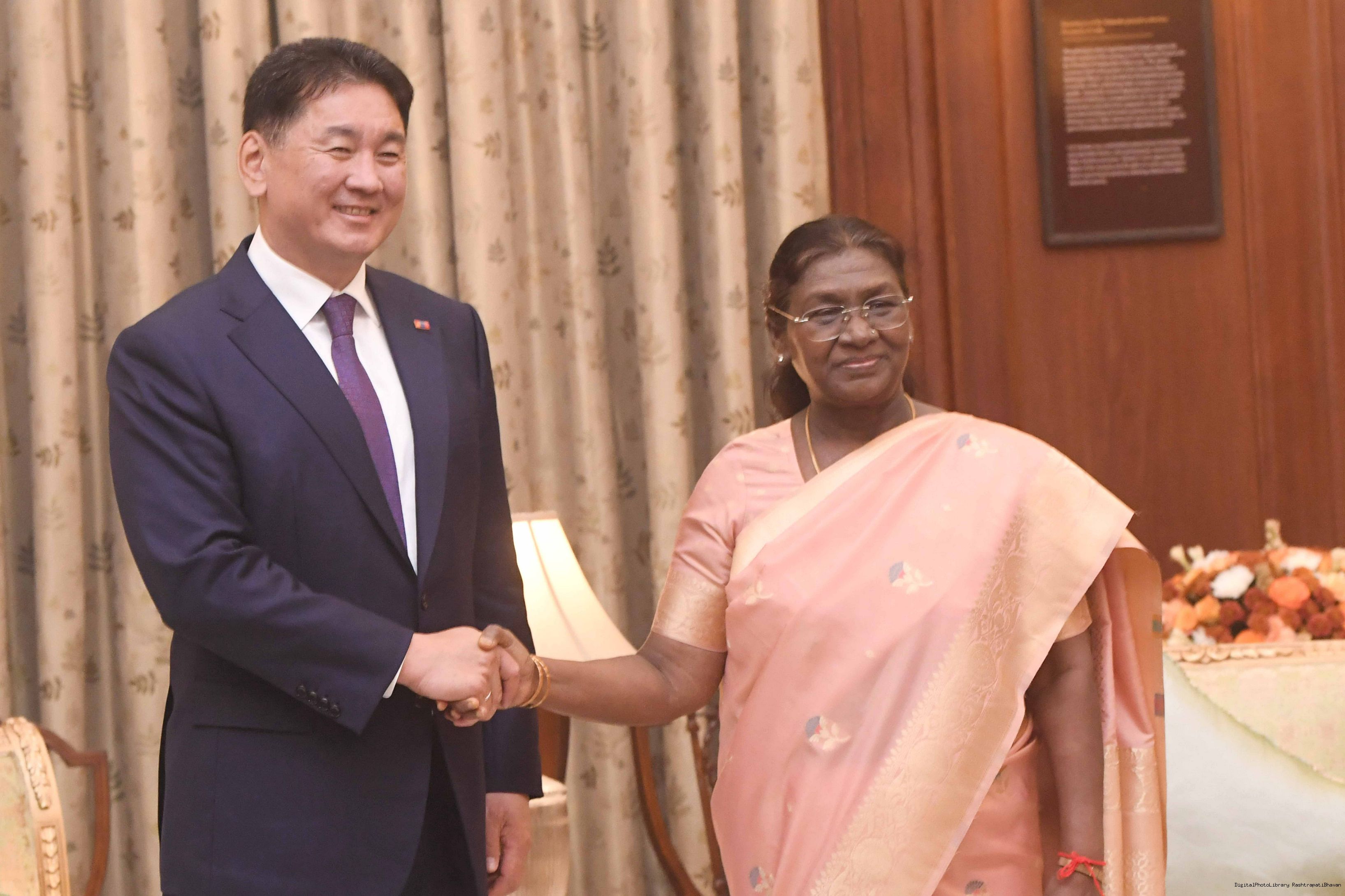 | Caption: | The President of India, Smt. Droupadi Murmu received H.E. Mr Khurelsukh Ukhnaa, President of Mongolia at Rashtrapati Bhavan on October 14, 2025. |