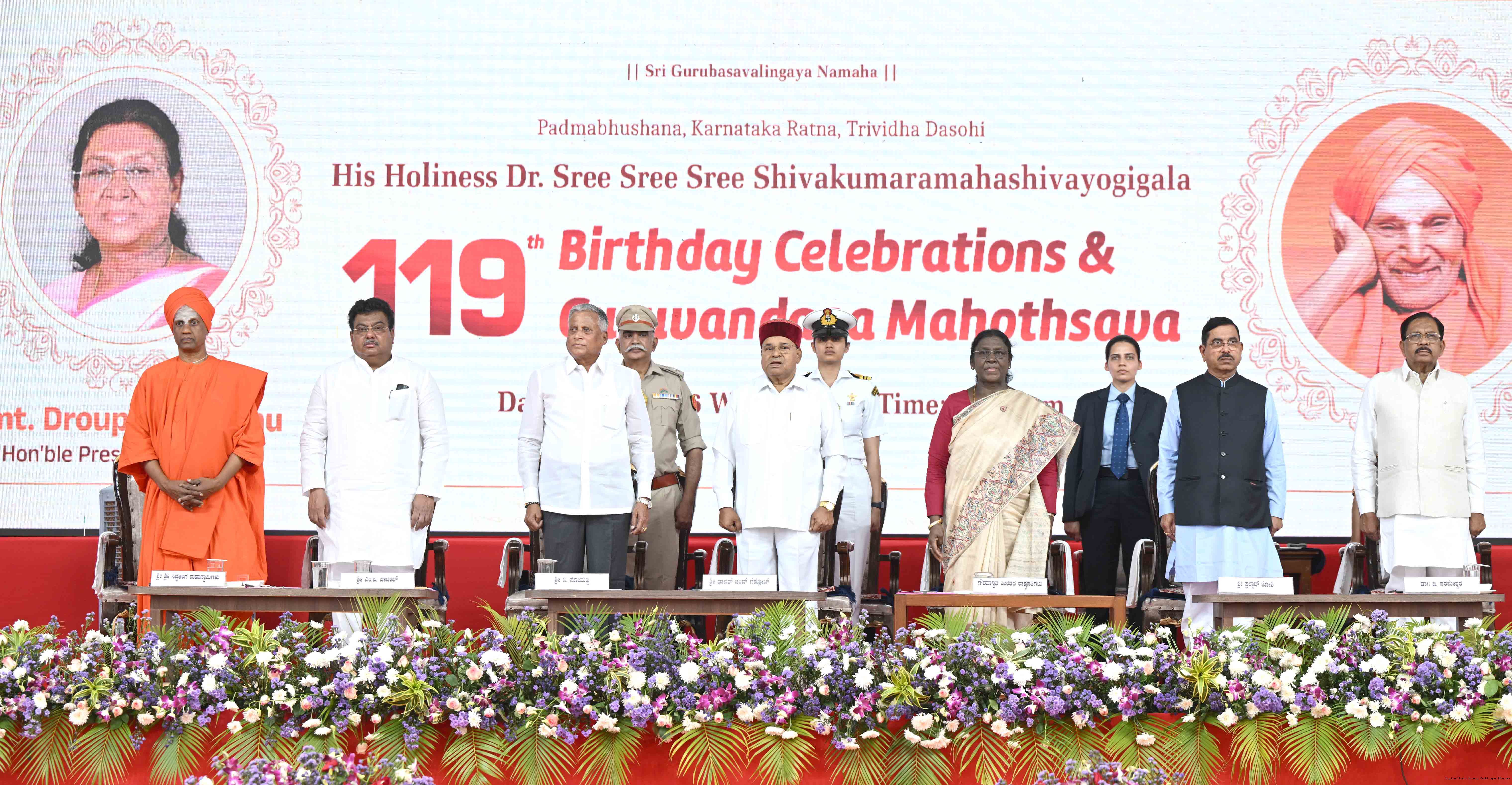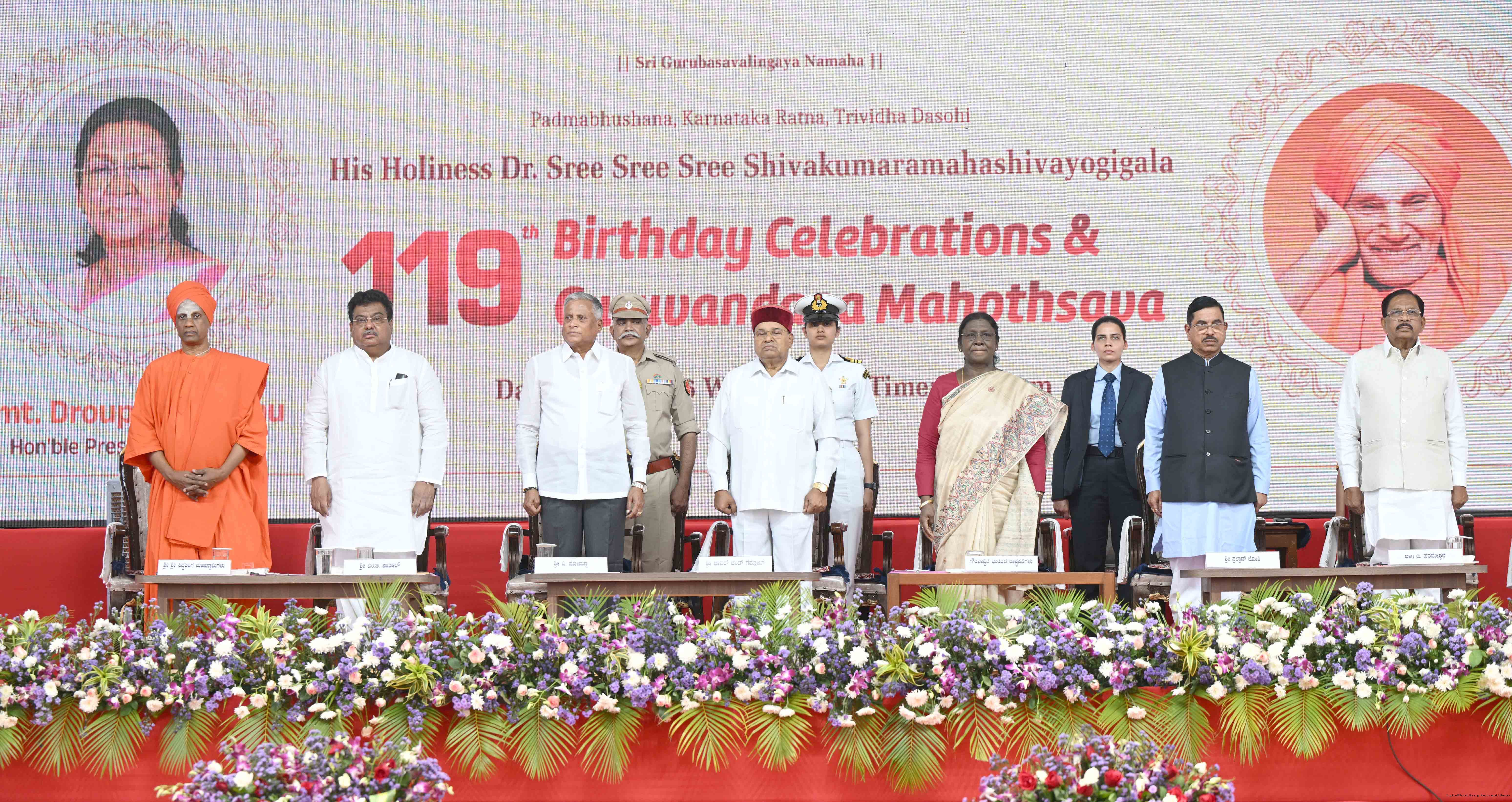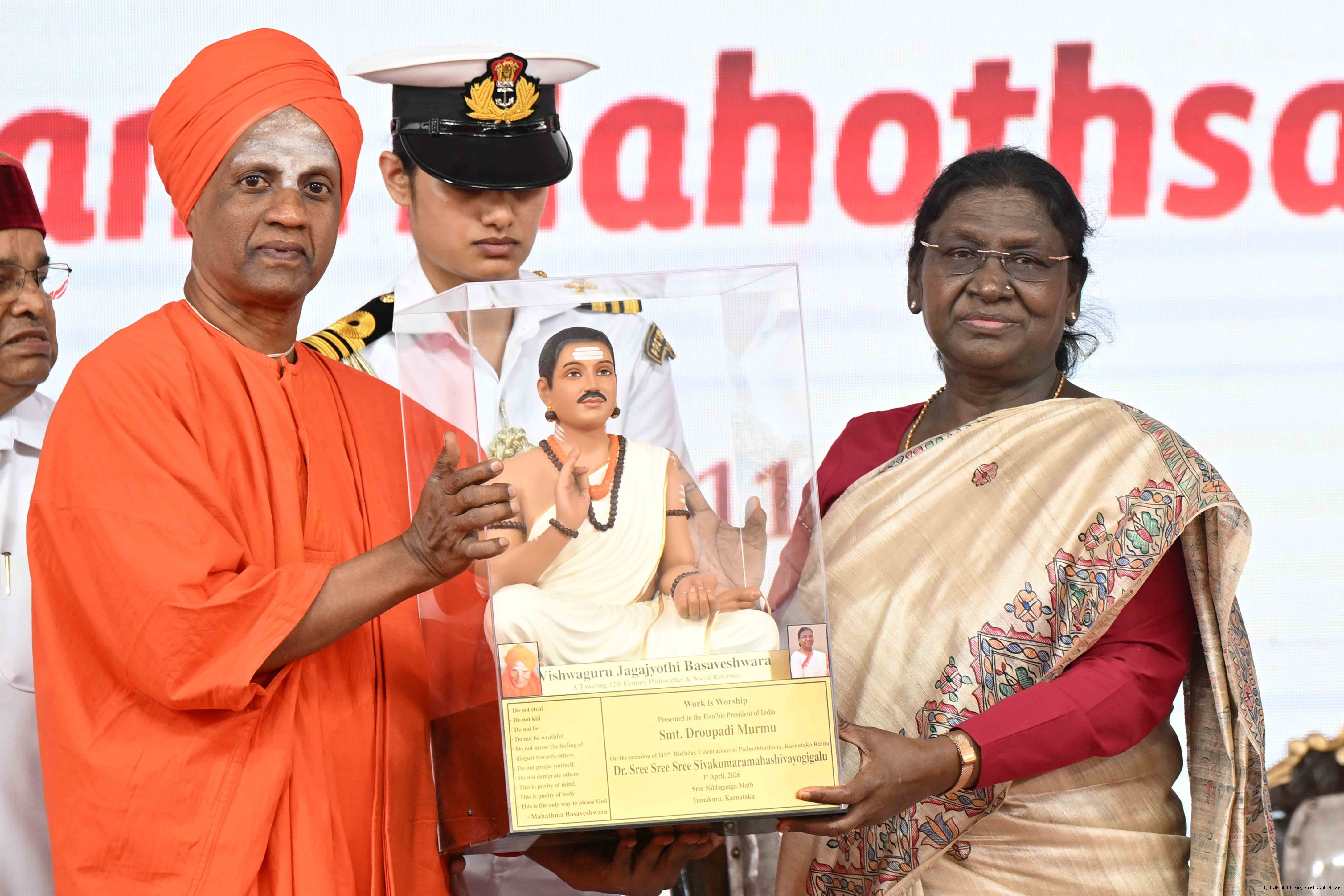 | Caption: | The President of India, Smt Droupadi Murmu graced the 119th birthday celebrations and Guruvandana mahotsava of Dr Sree Sree Sivakumara Mahaswamiji at Sree Siddaganga Math, Tumakuru, Karnataka on April 1, 2026. |