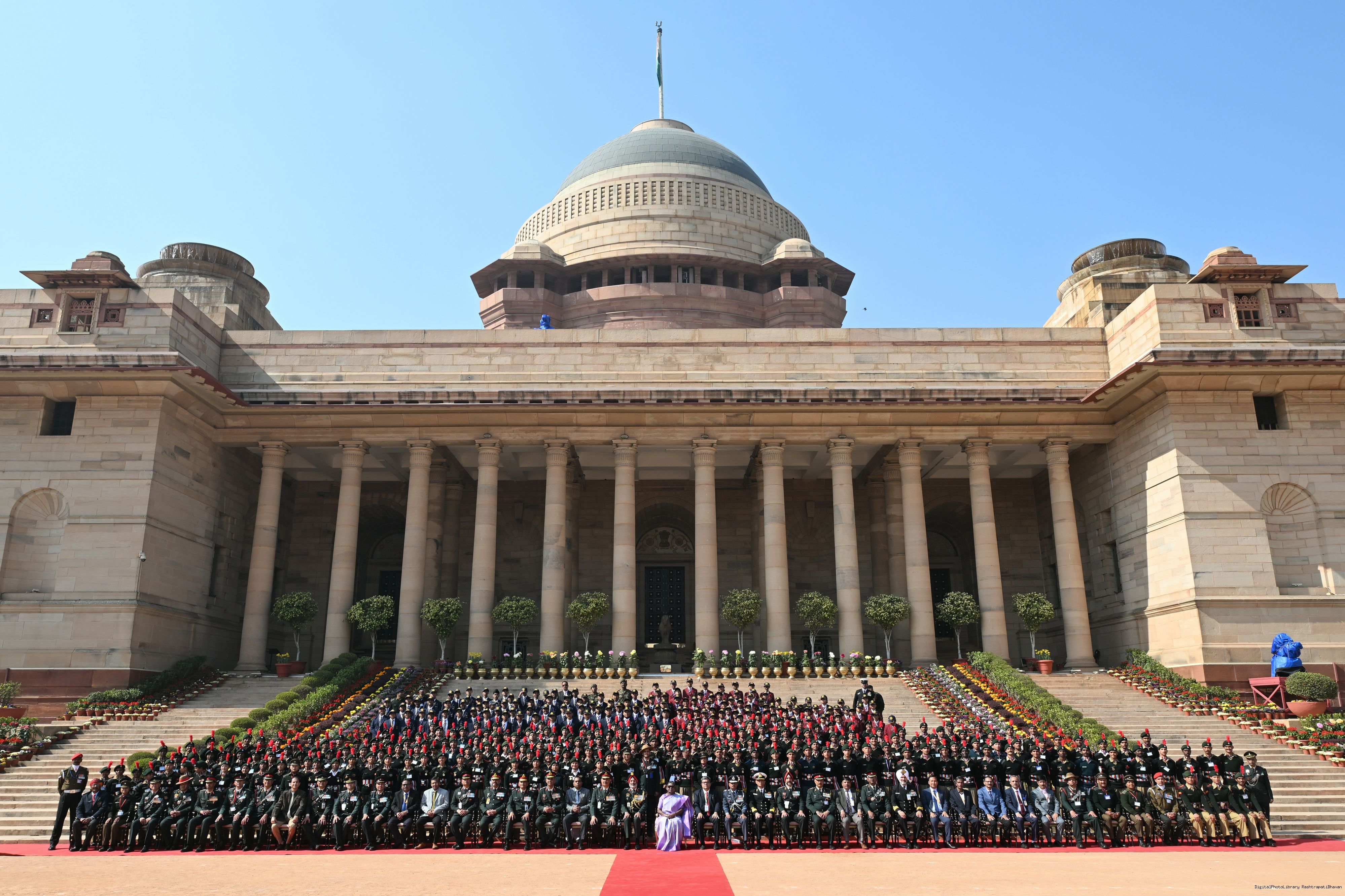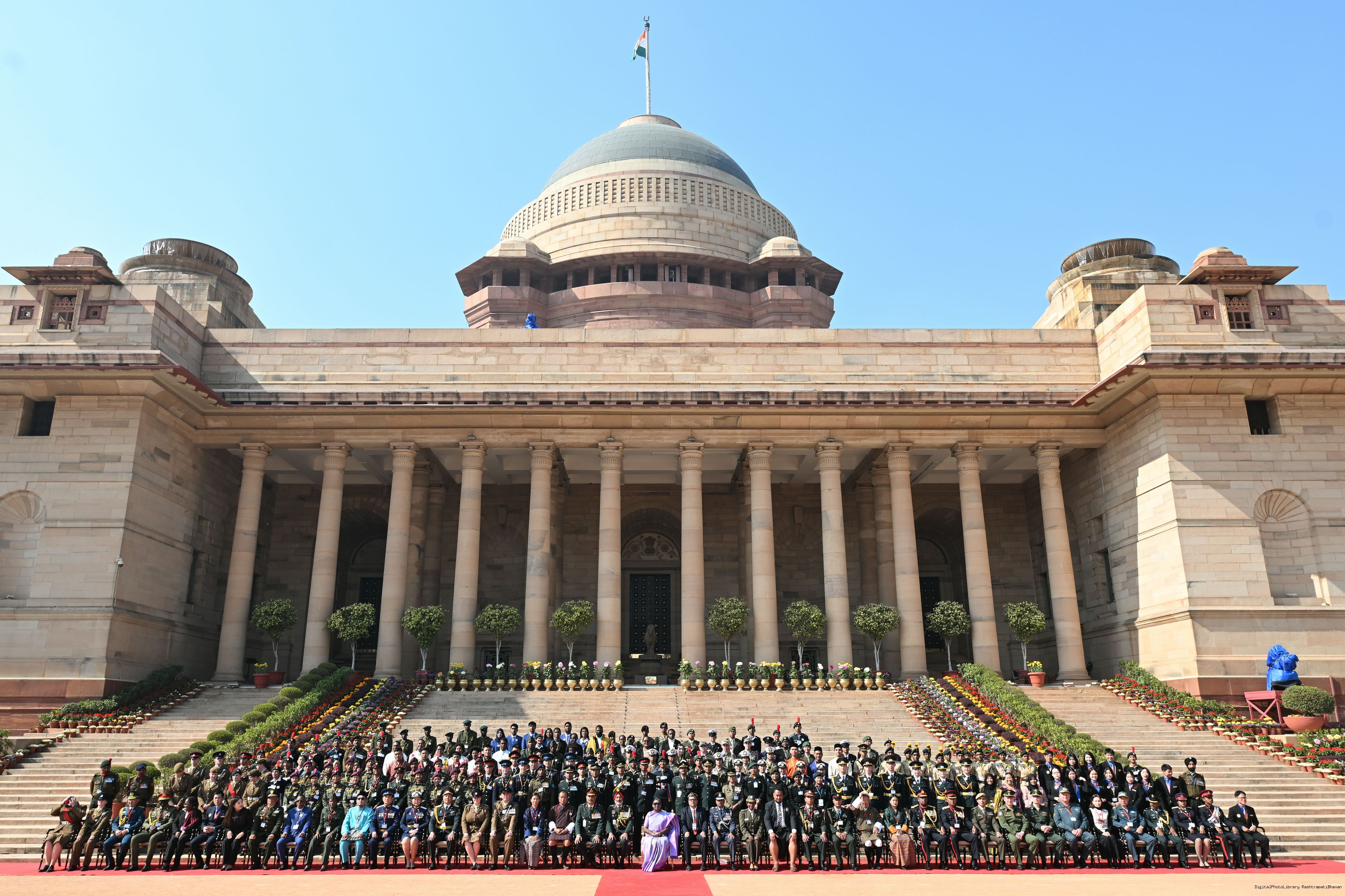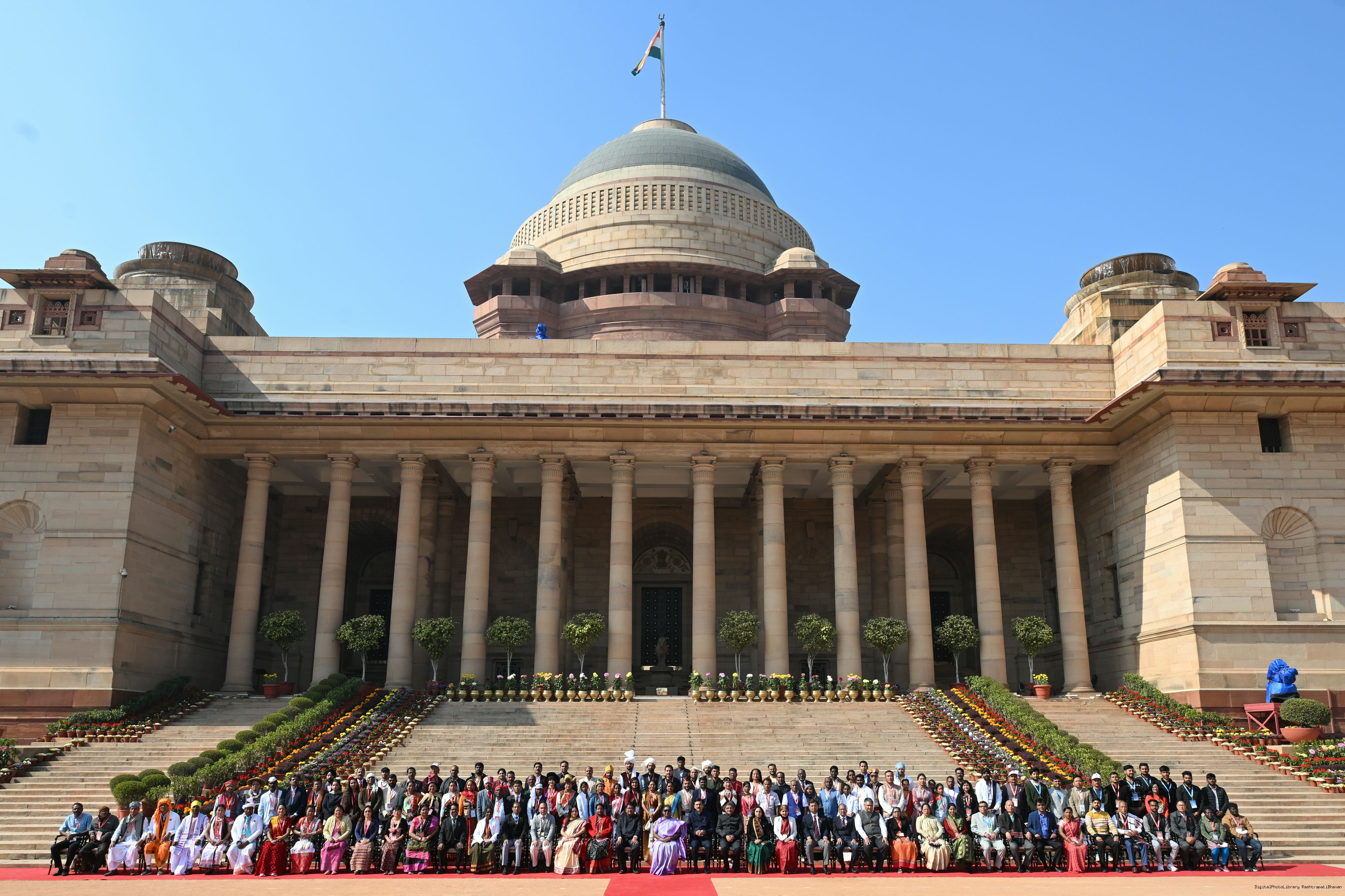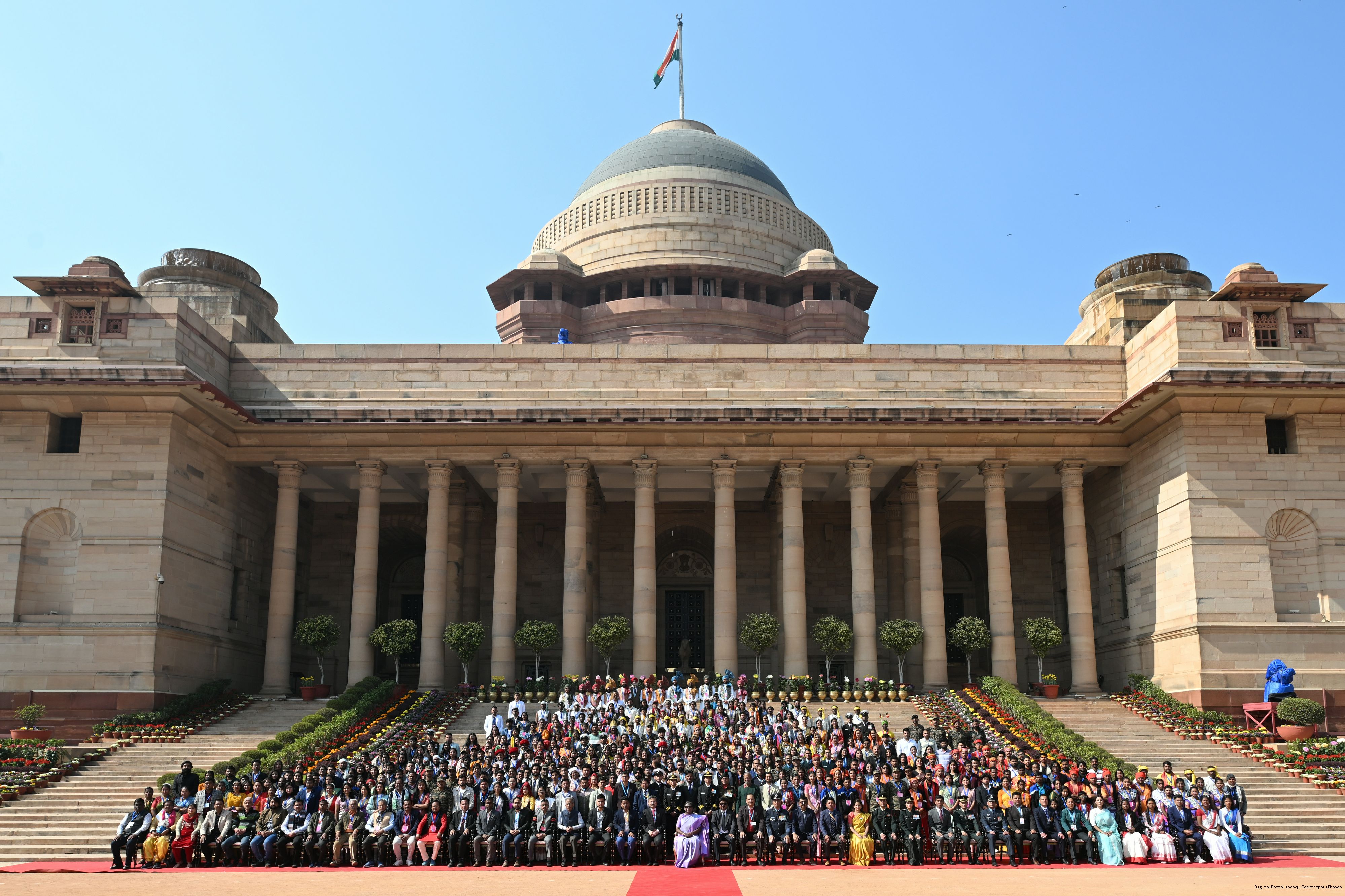 | Caption: | The President of India, Smt. Droupadi Murmu met and posing a group photographs with members of colloborating organizations pertaining to the theme of the At Home event held at Rashtrapati Bhavan on 26th January, 2025 viz State Bhavans, Sangeet Natak Akademi and NIFT at Rashtrapati Bhavan on January 28, 2025. |
