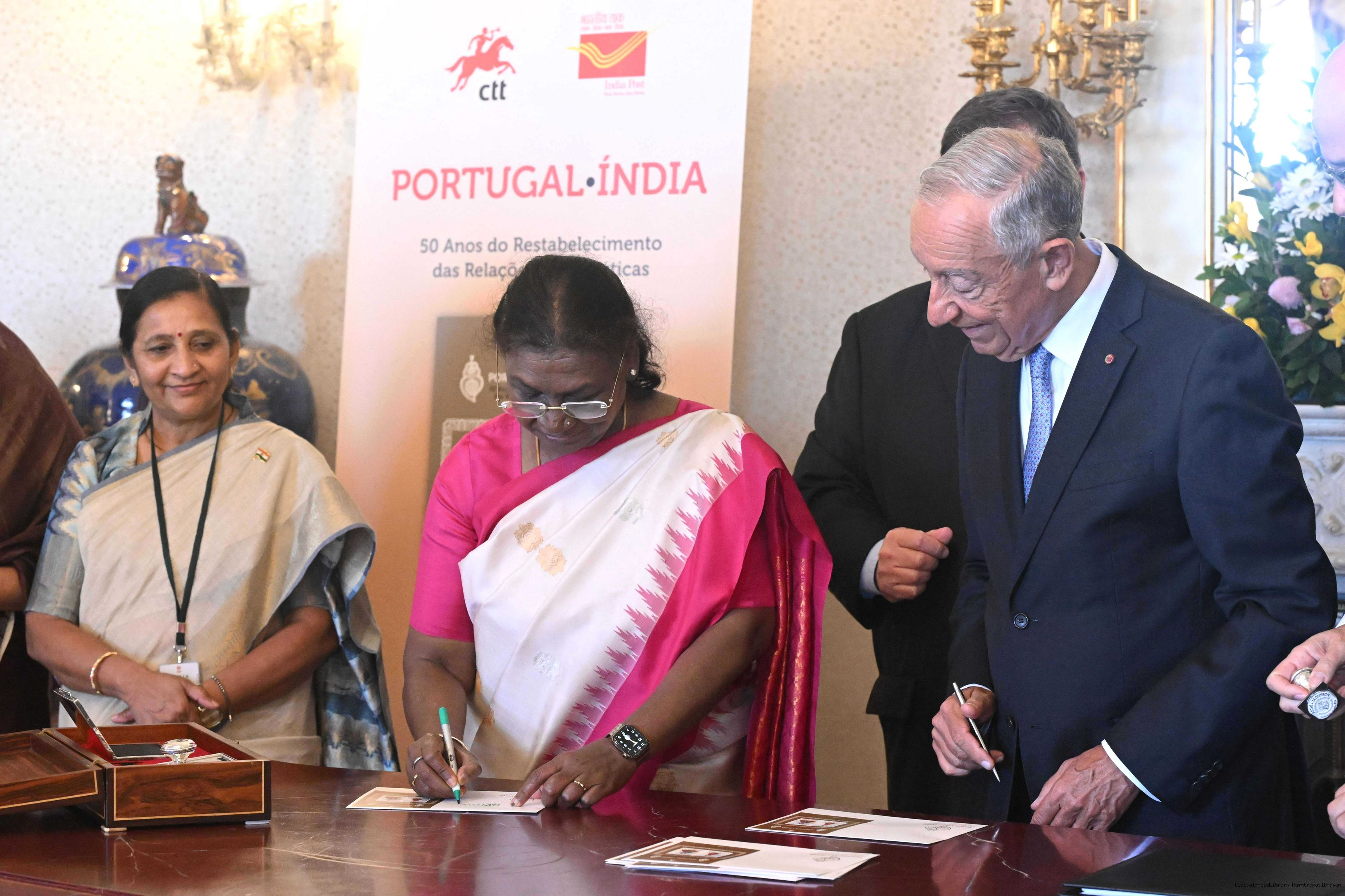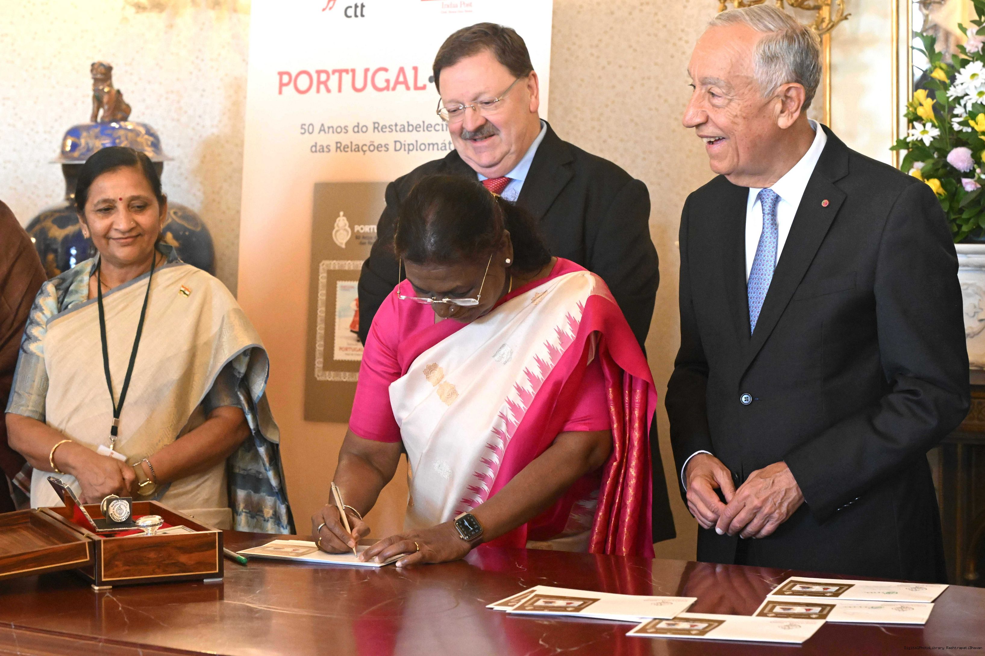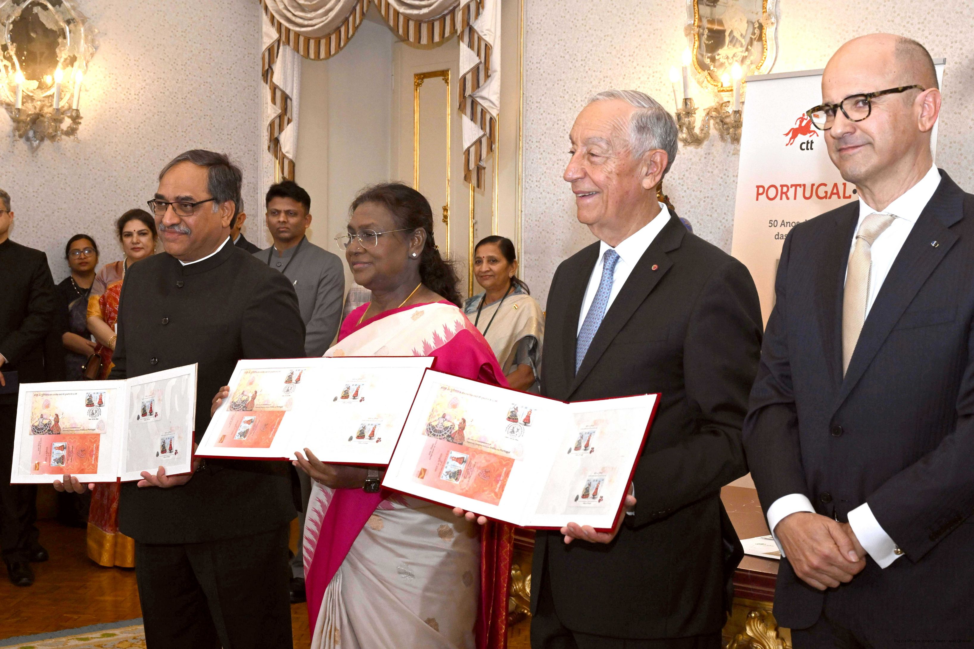 | Caption: | The President of India, Smt Droupadi Murmu and President Marcelo Rebelo de Sousa of Portugal graced the launch of postage stamps commemorating 50 years of diplomatic relations between the two countries in Portugal on April 7, 2025. |