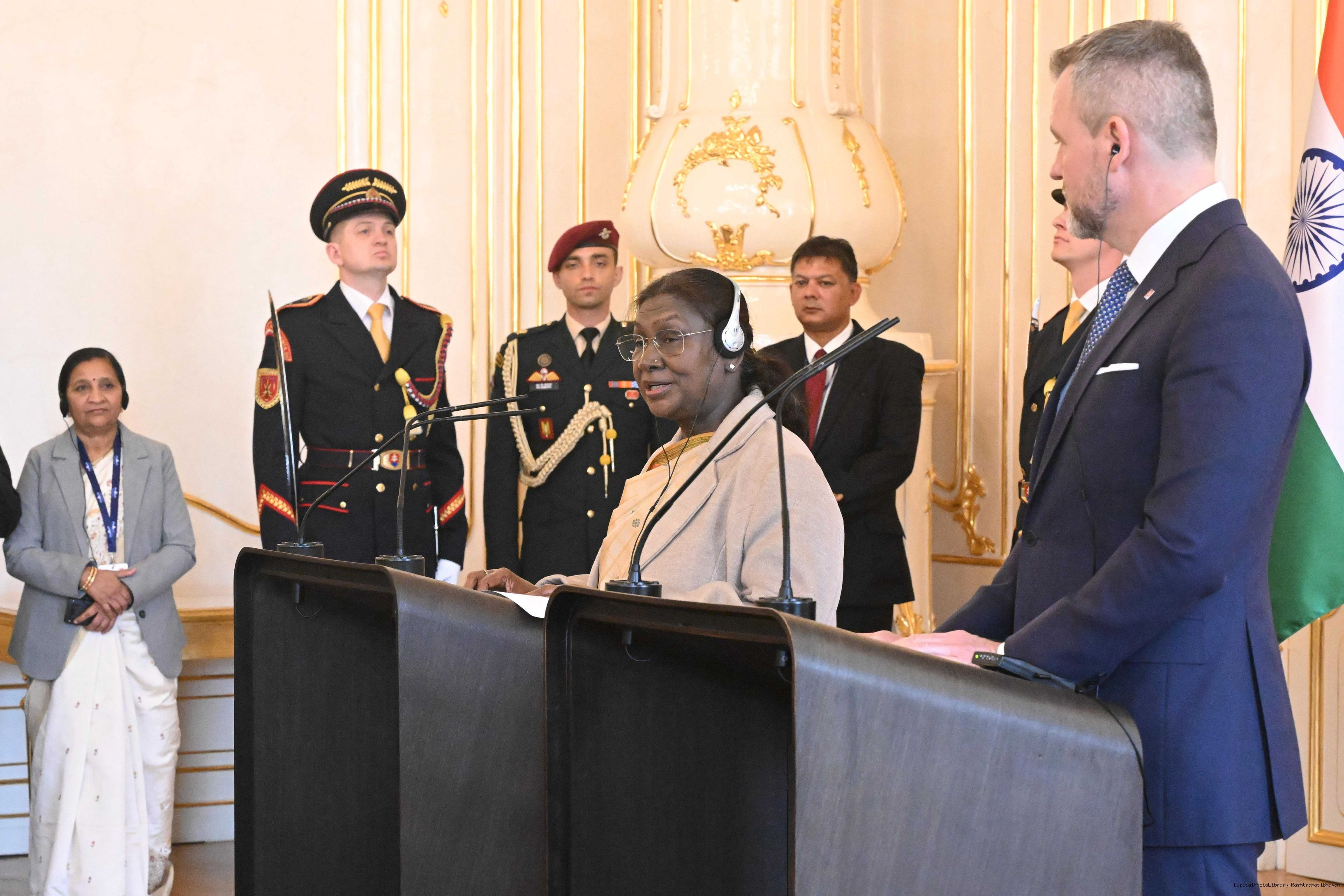 | Caption: | The President of India, Smt Droupadi Murmu Press Statements at Presidential Palace in Bratislava, Slovak on April 9, 2025. |