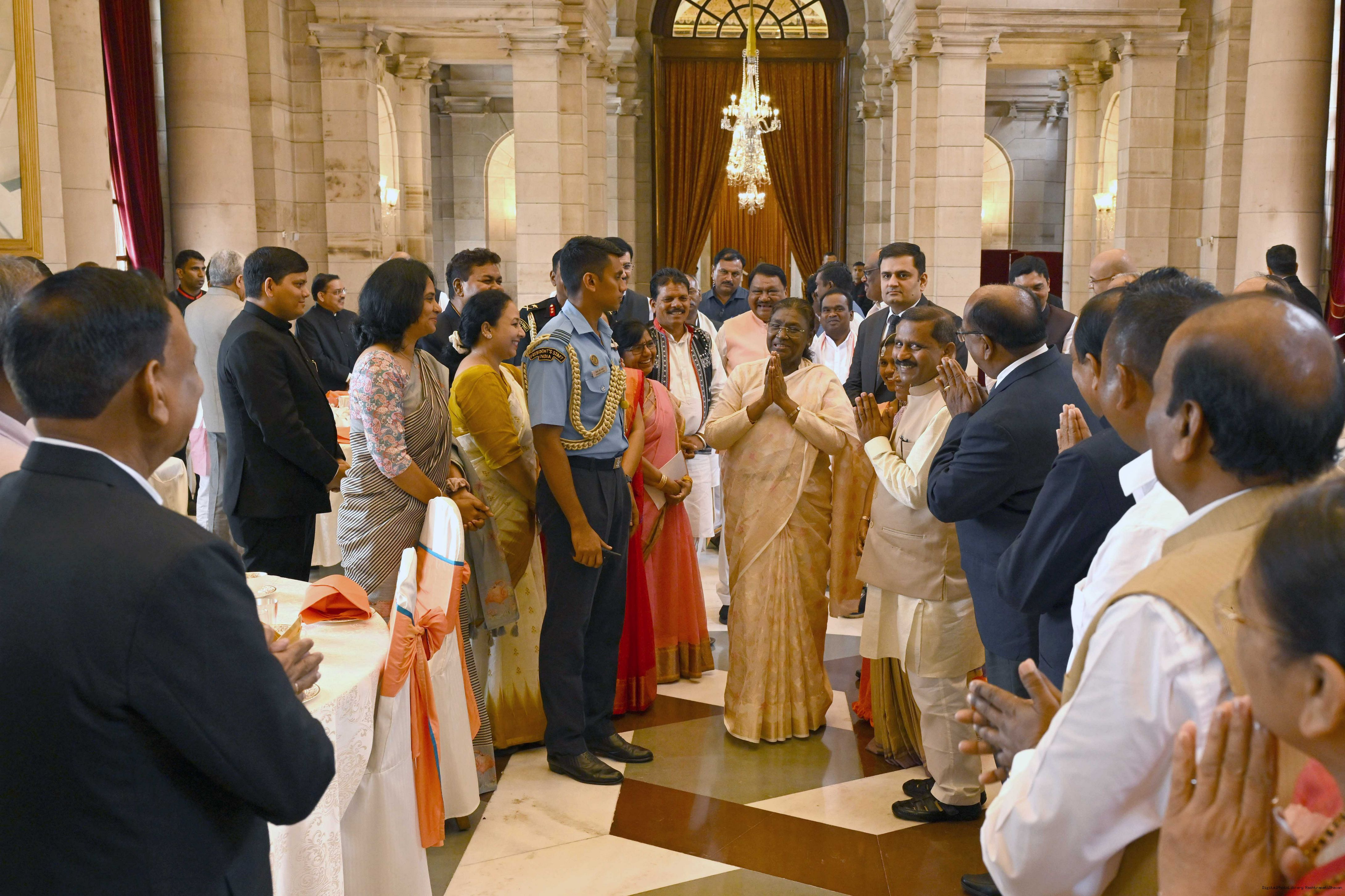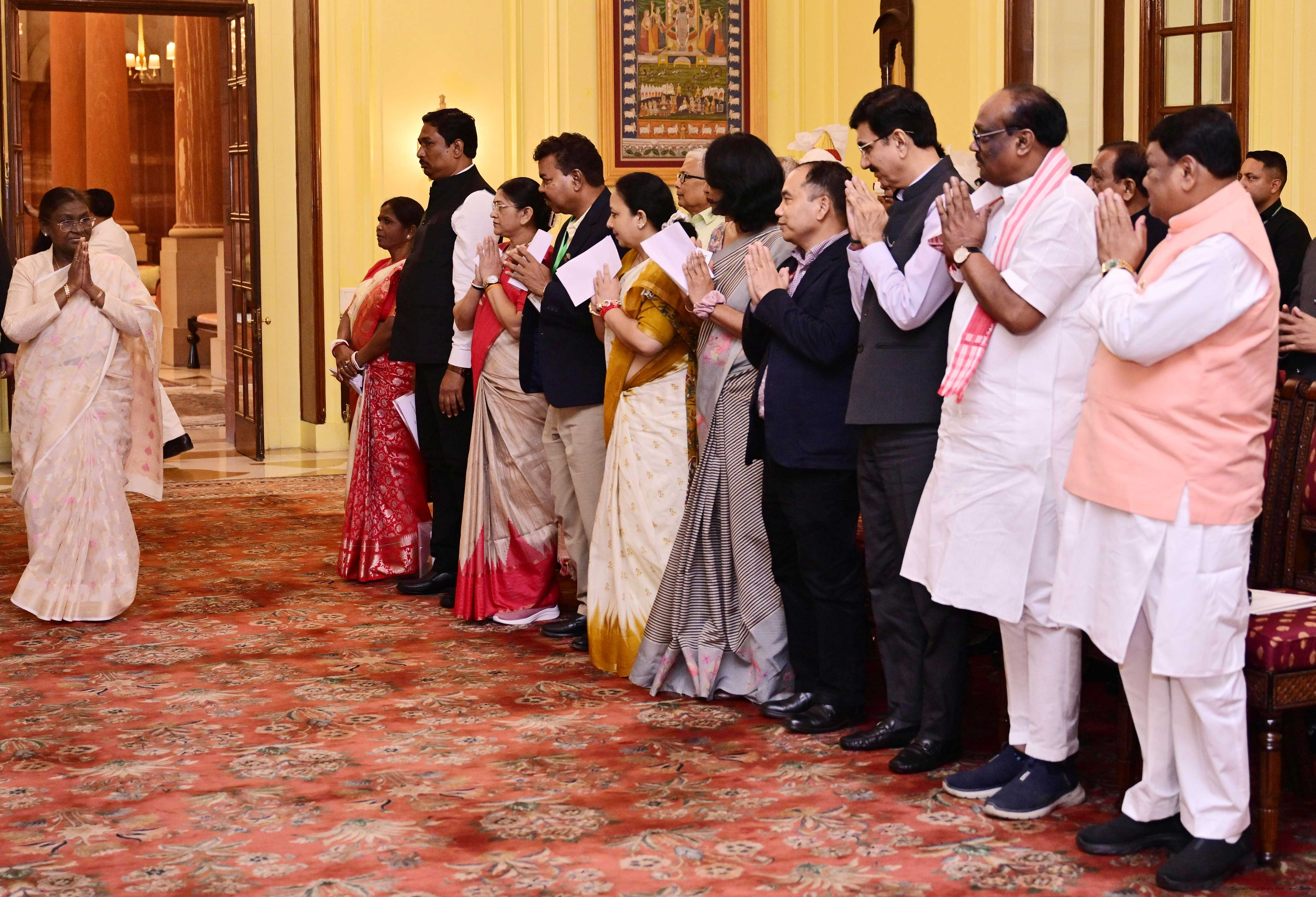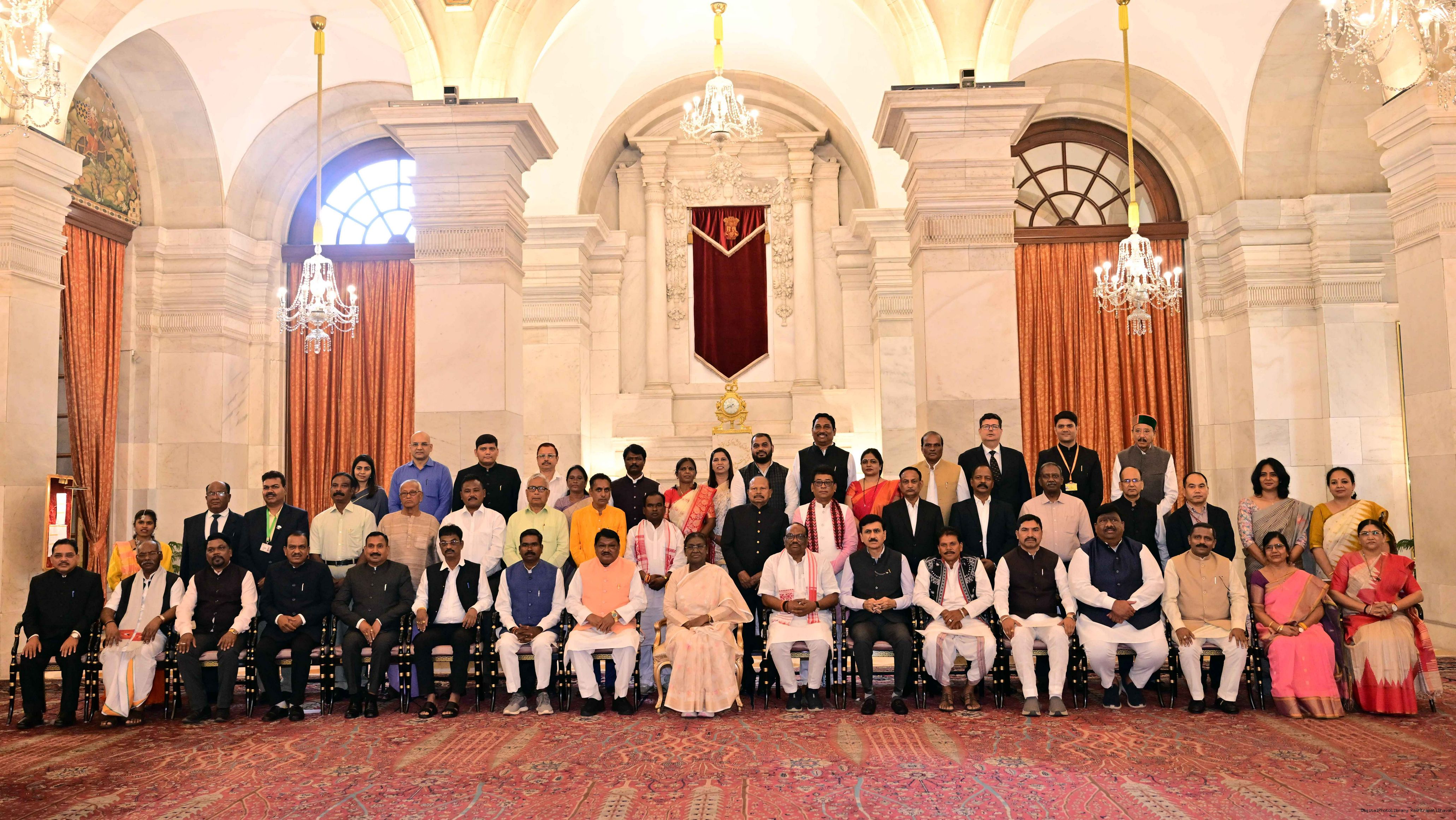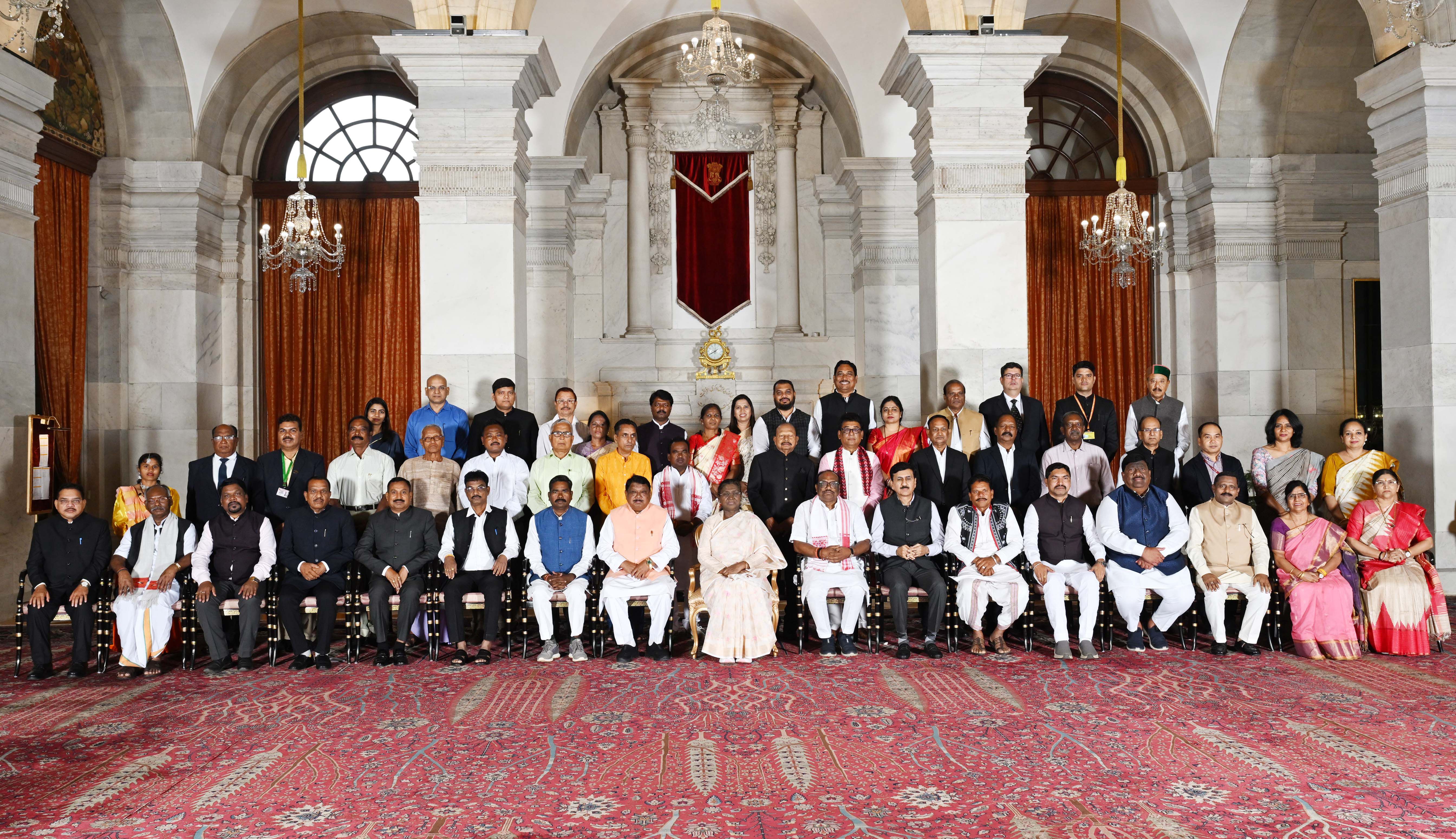 | Caption: | The President of India, Smt Droupadi Murmu met and posing a group photographs with Tribal Leaders Accompained by Ministers and Officials of Tribal Affairs followed by lunch at Rashtrapati Bhavan on July 21, 2025. |