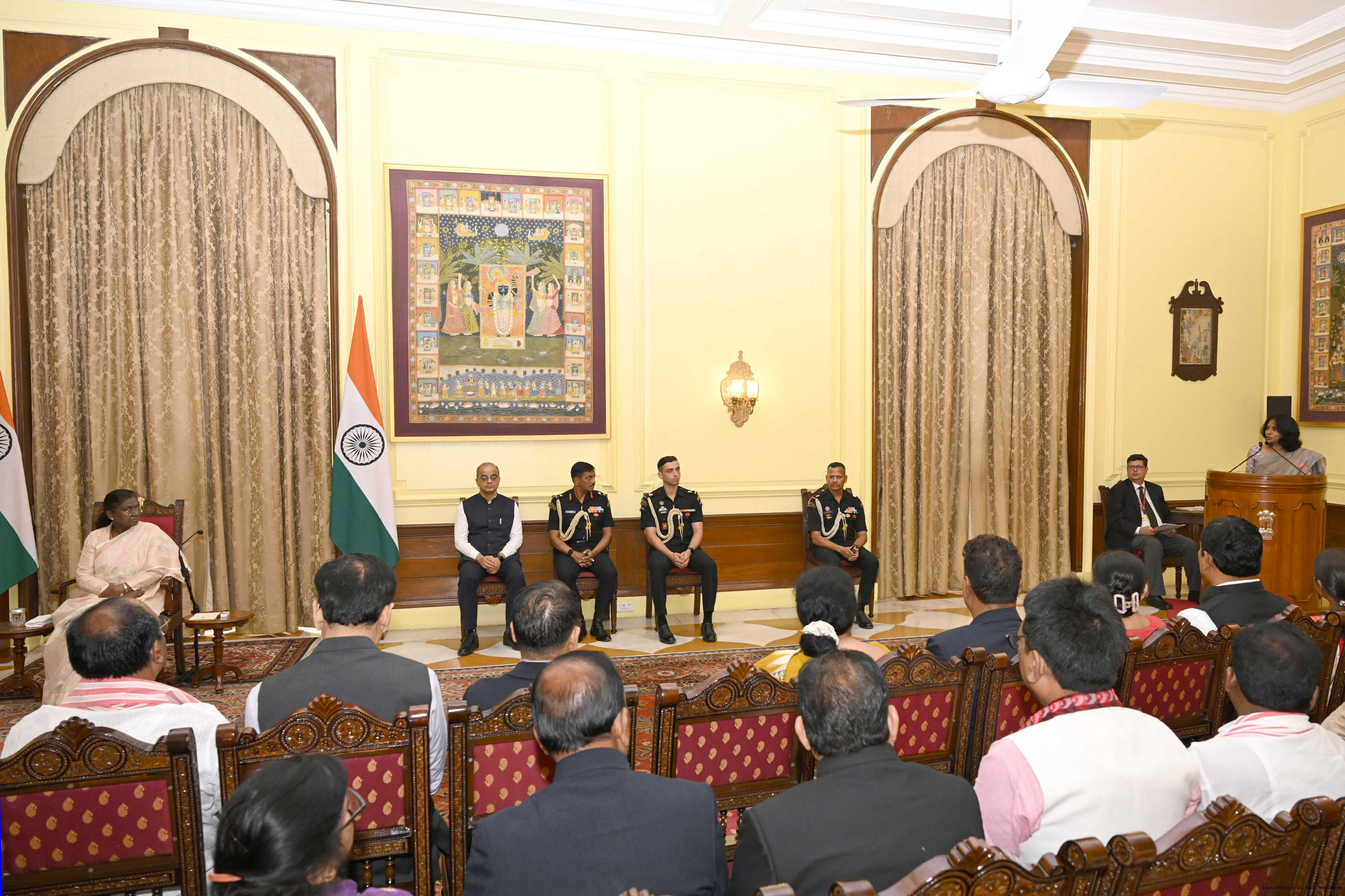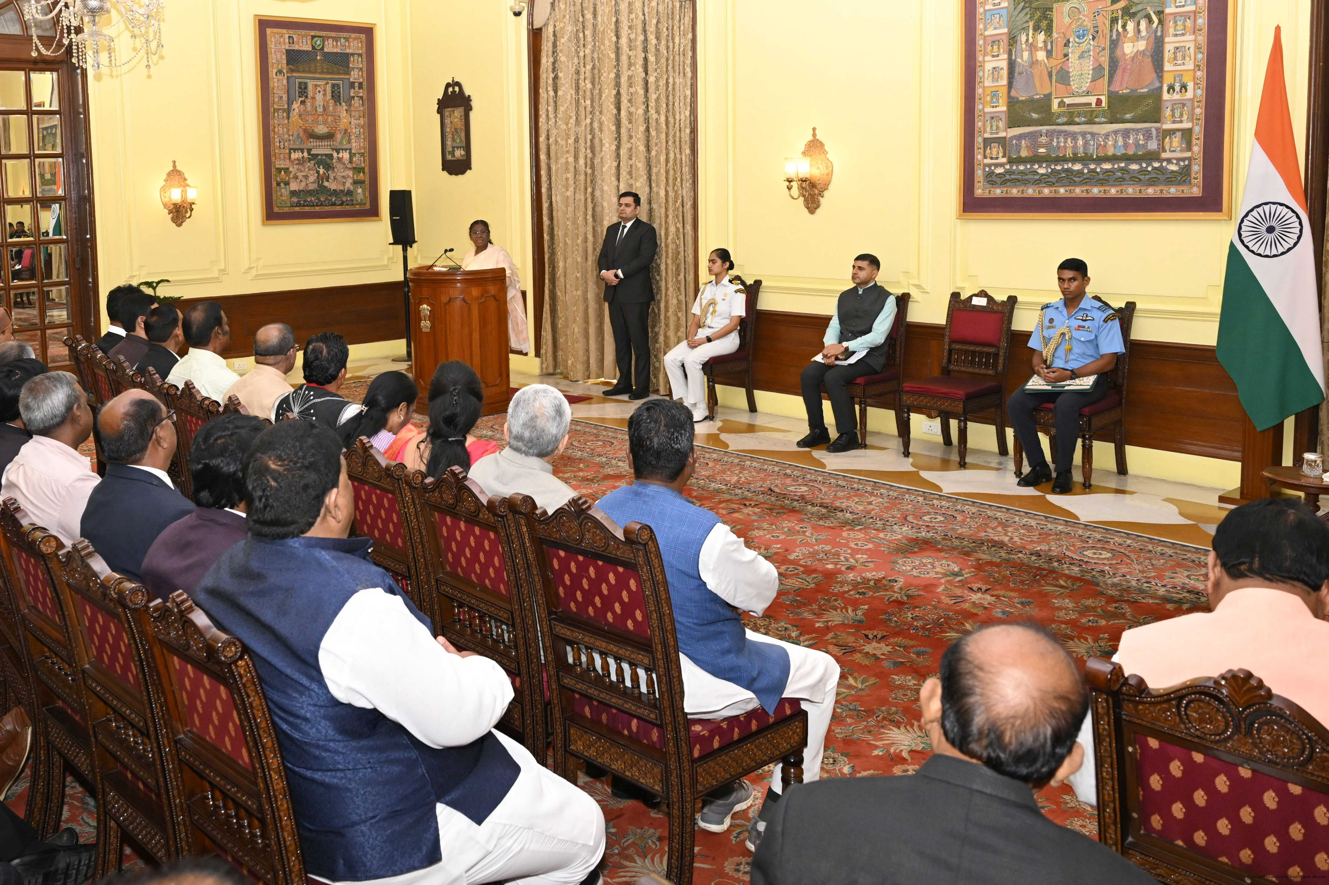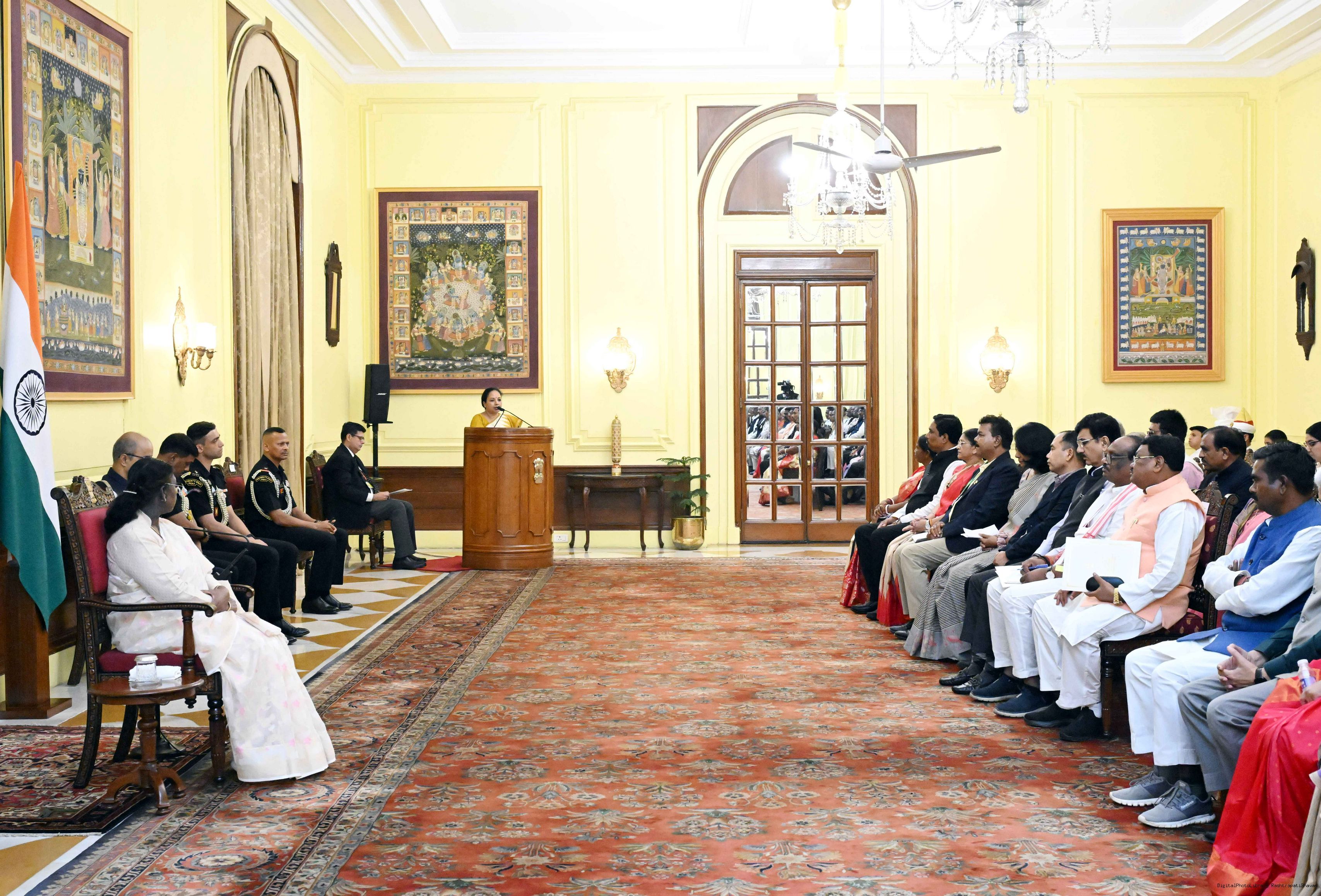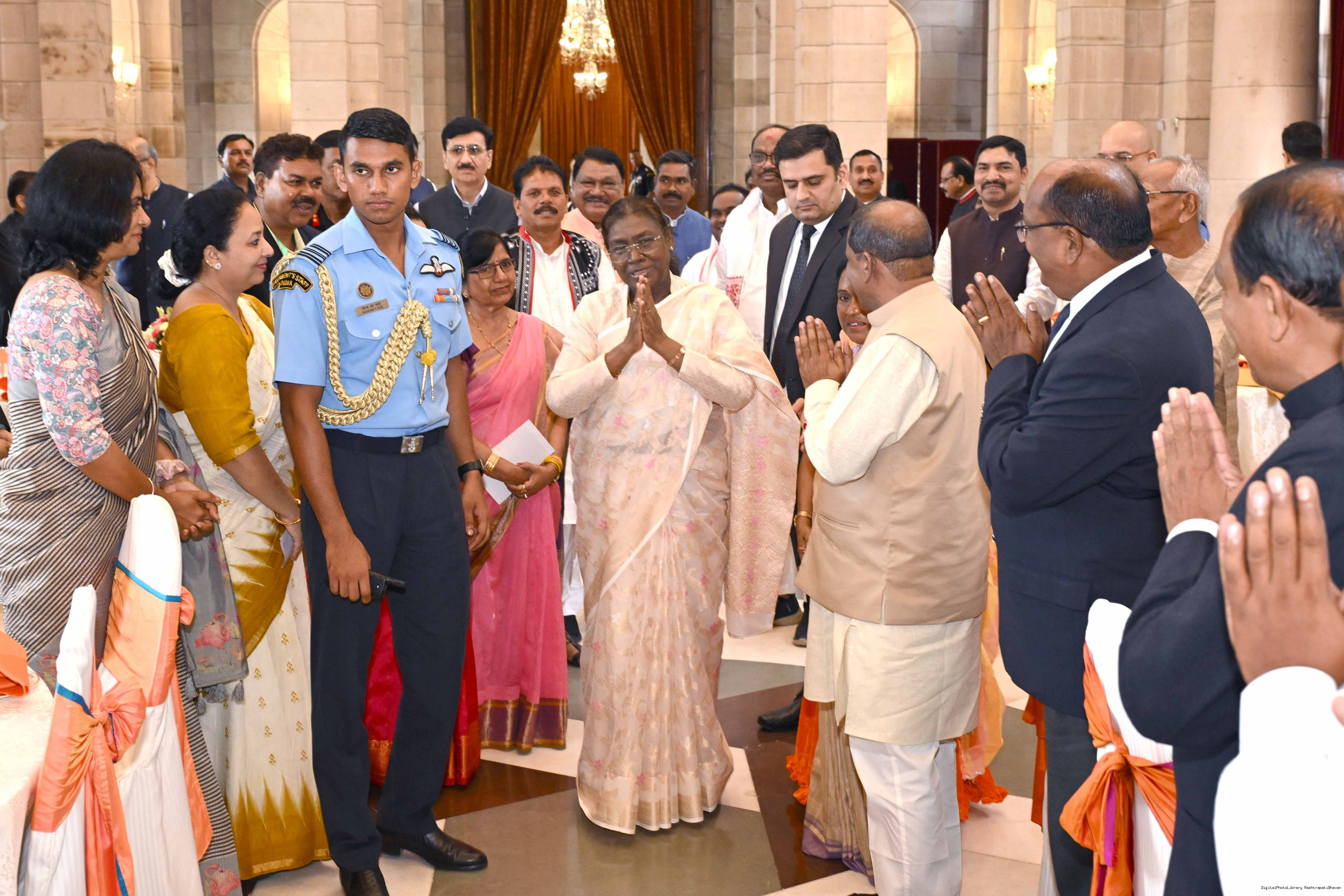 | Caption: | The President of India, Smt Droupadi Murmu met and posing a group photographs with Tribal Leaders Accompained by Ministers and Officials of Tribal Affairs followed by lunch at Rashtrapati Bhavan on July 21, 2025. |
