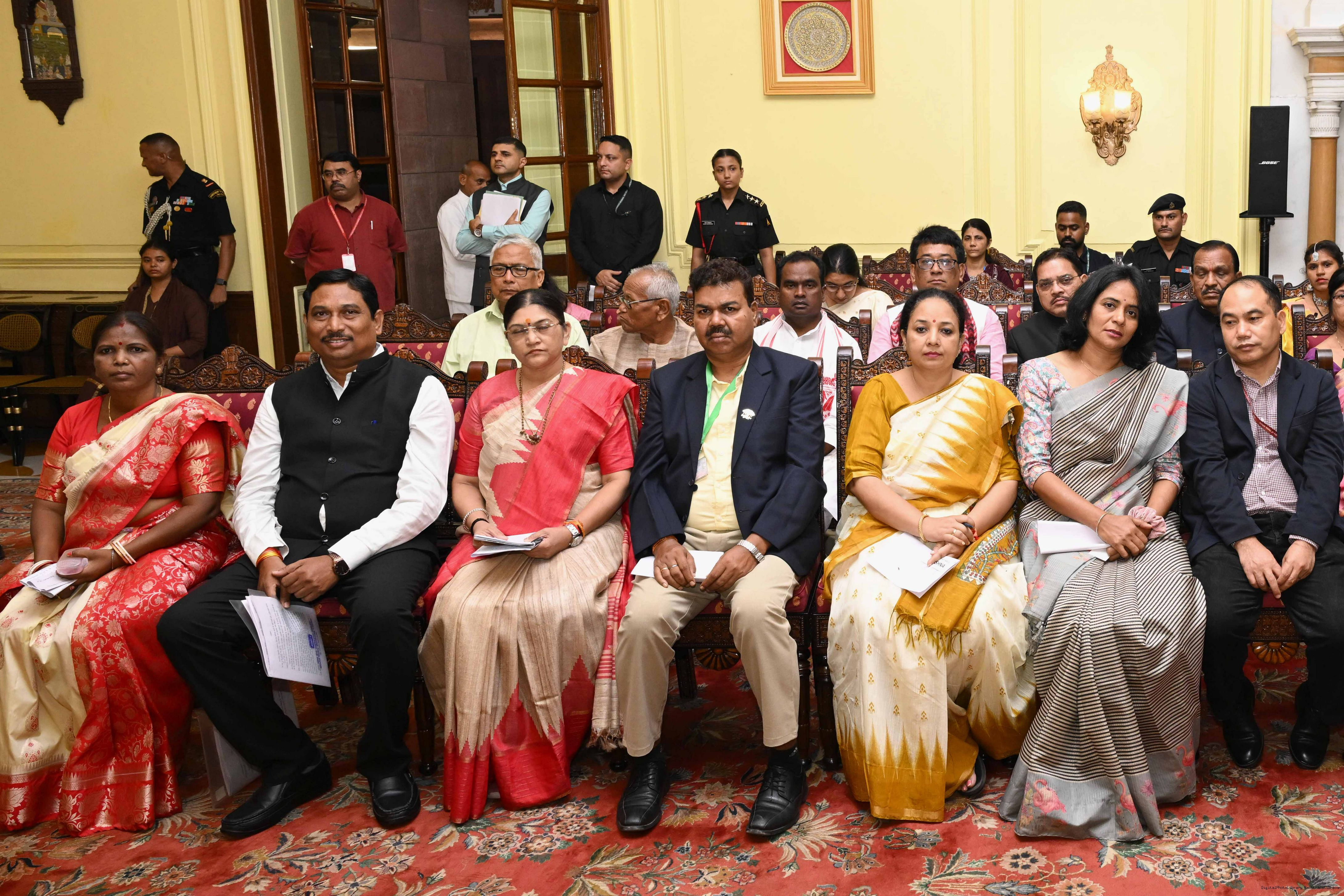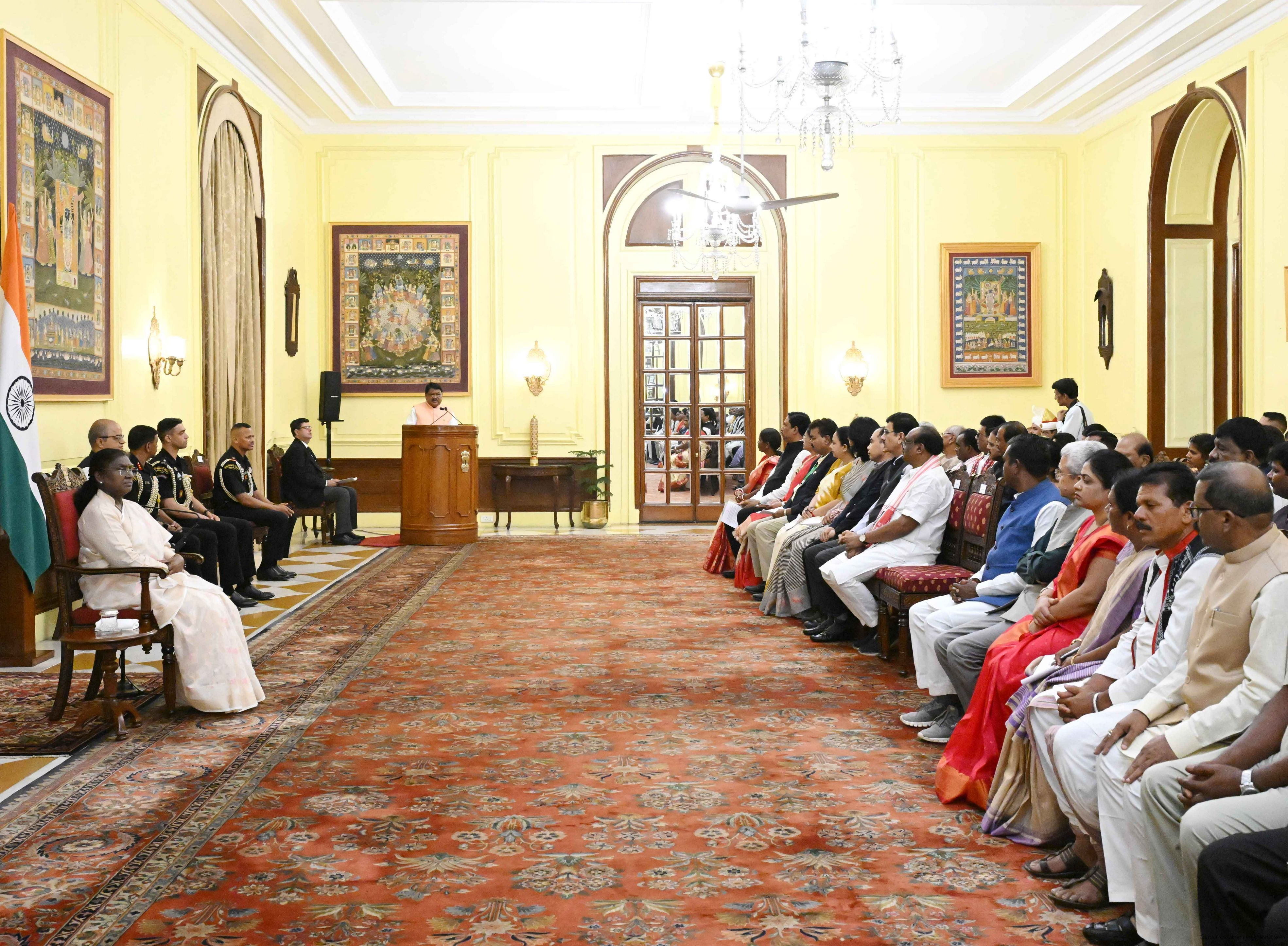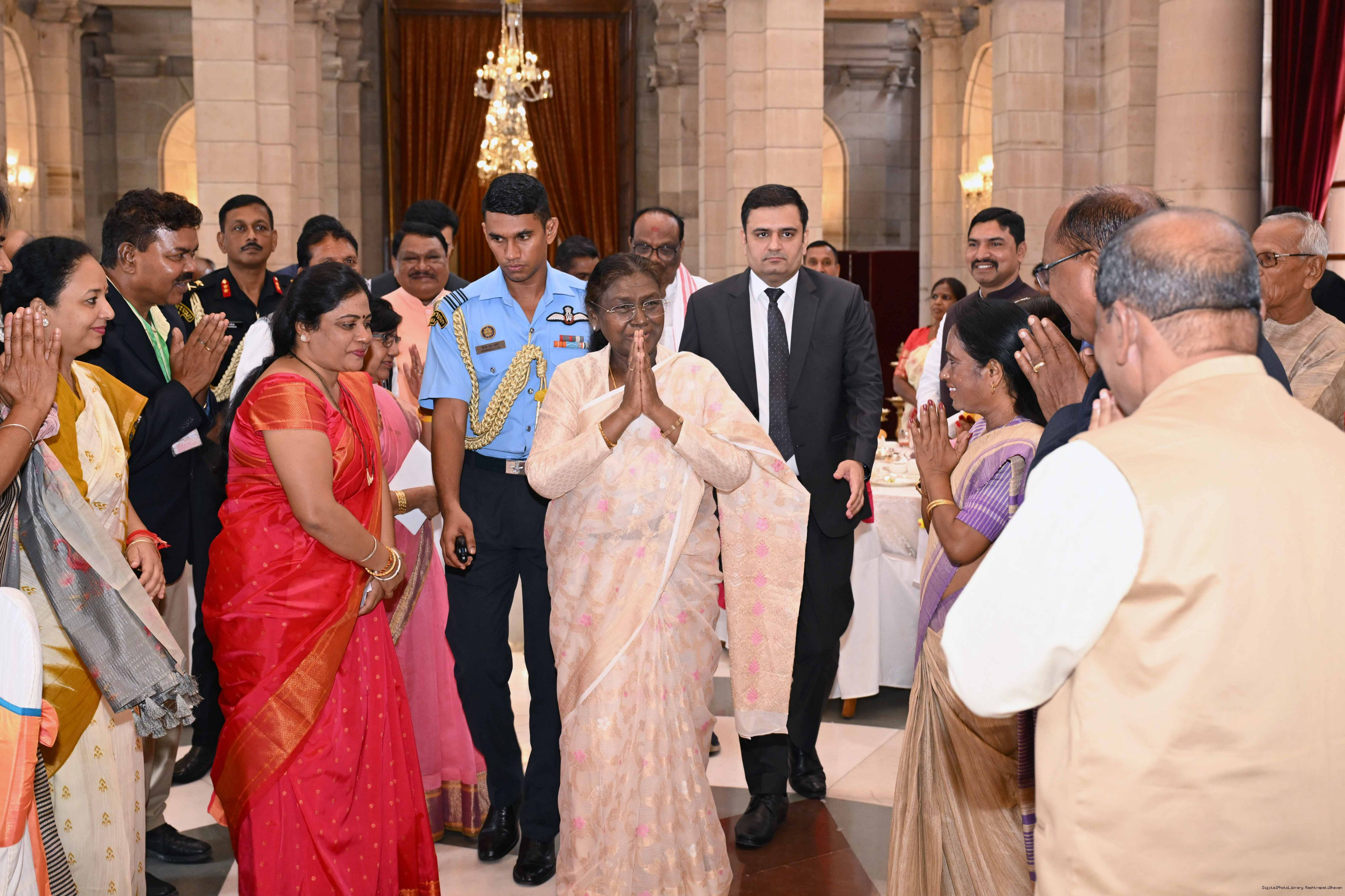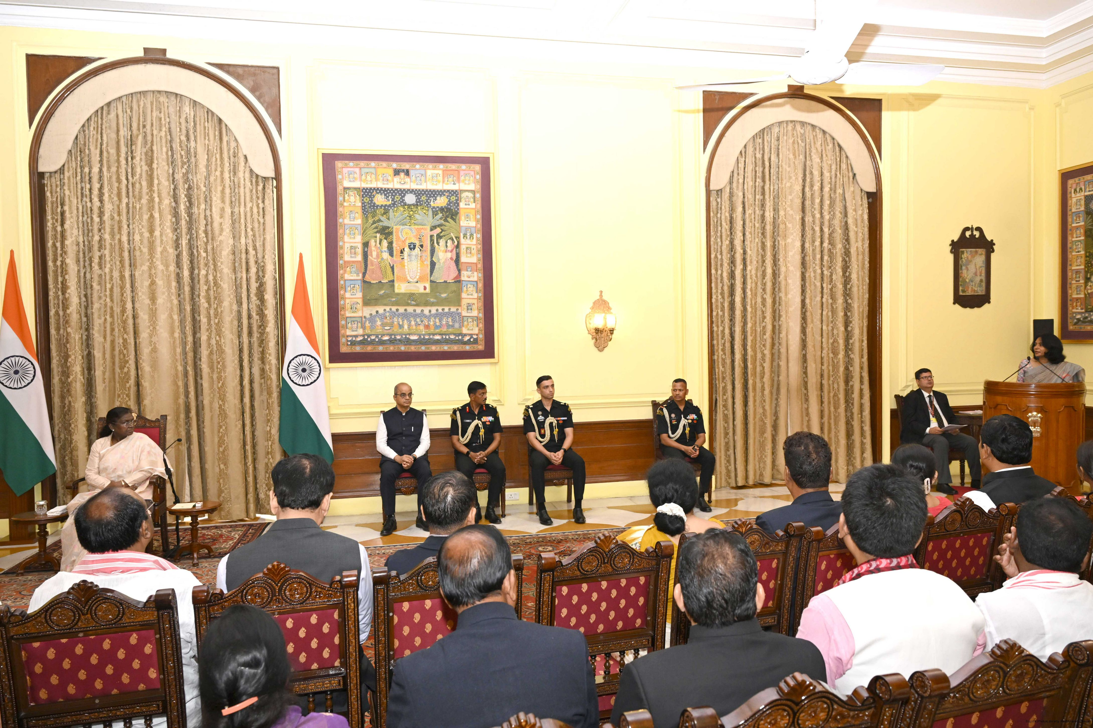 | Caption: | The President of India, Smt Droupadi Murmu met and posing a group photographs with Tribal Leaders Accompained by Ministers and Officials of Tribal Affairs followed by lunch at Rashtrapati Bhavan on July 21, 2025. |
