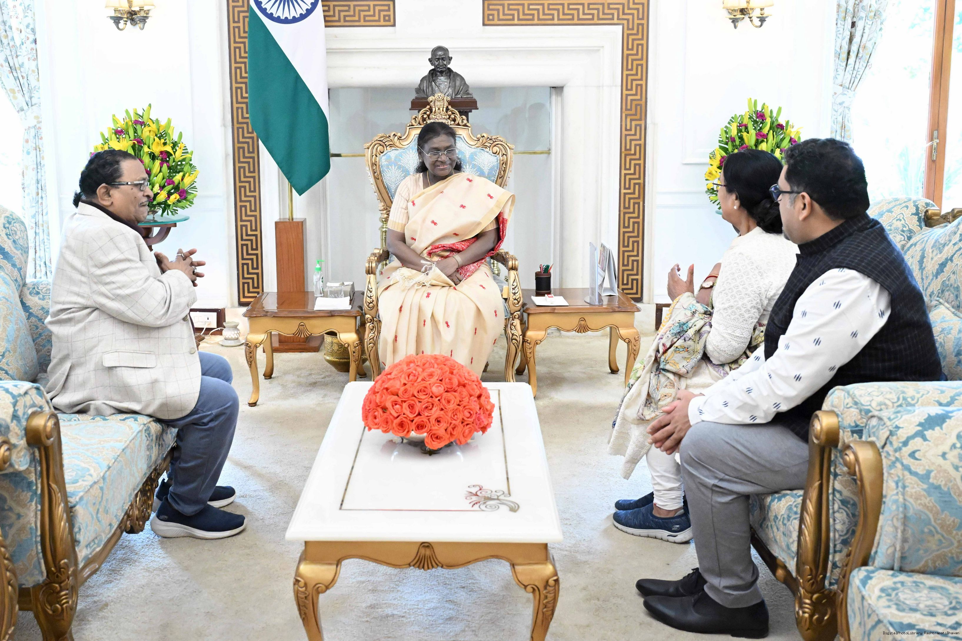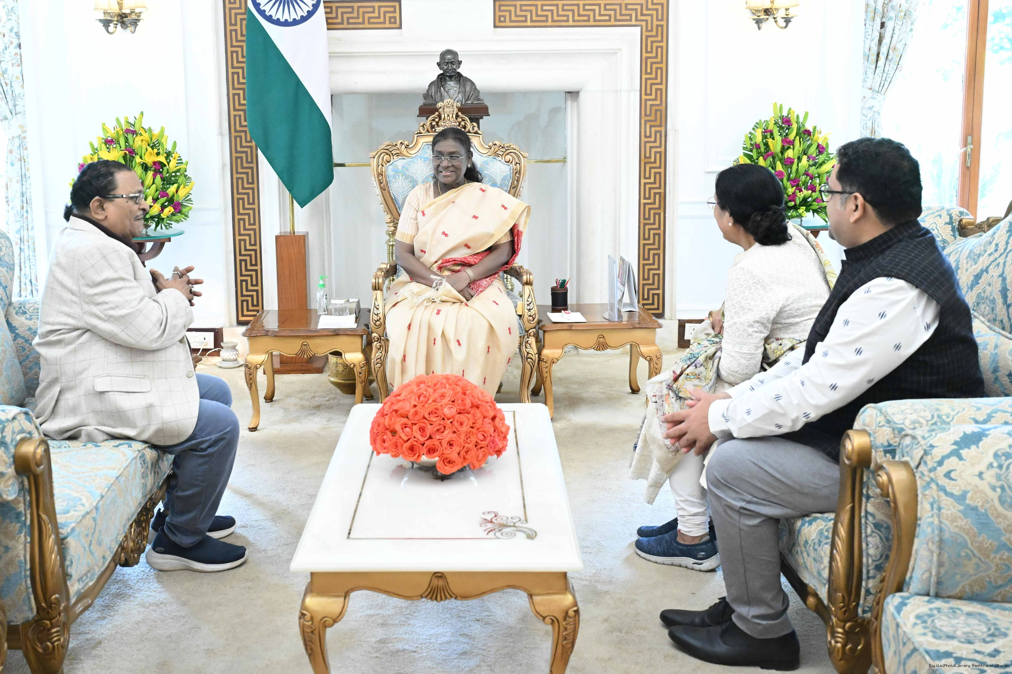 | Caption: | Shri Sissir P. Mishra, Padmashri Dada Saheb Phalke Academy Awardee along with Spouse and others meeting with the President of India, Smt Droupadi Murmu at Rashtrapati Bhavan on August 13, 2025. |