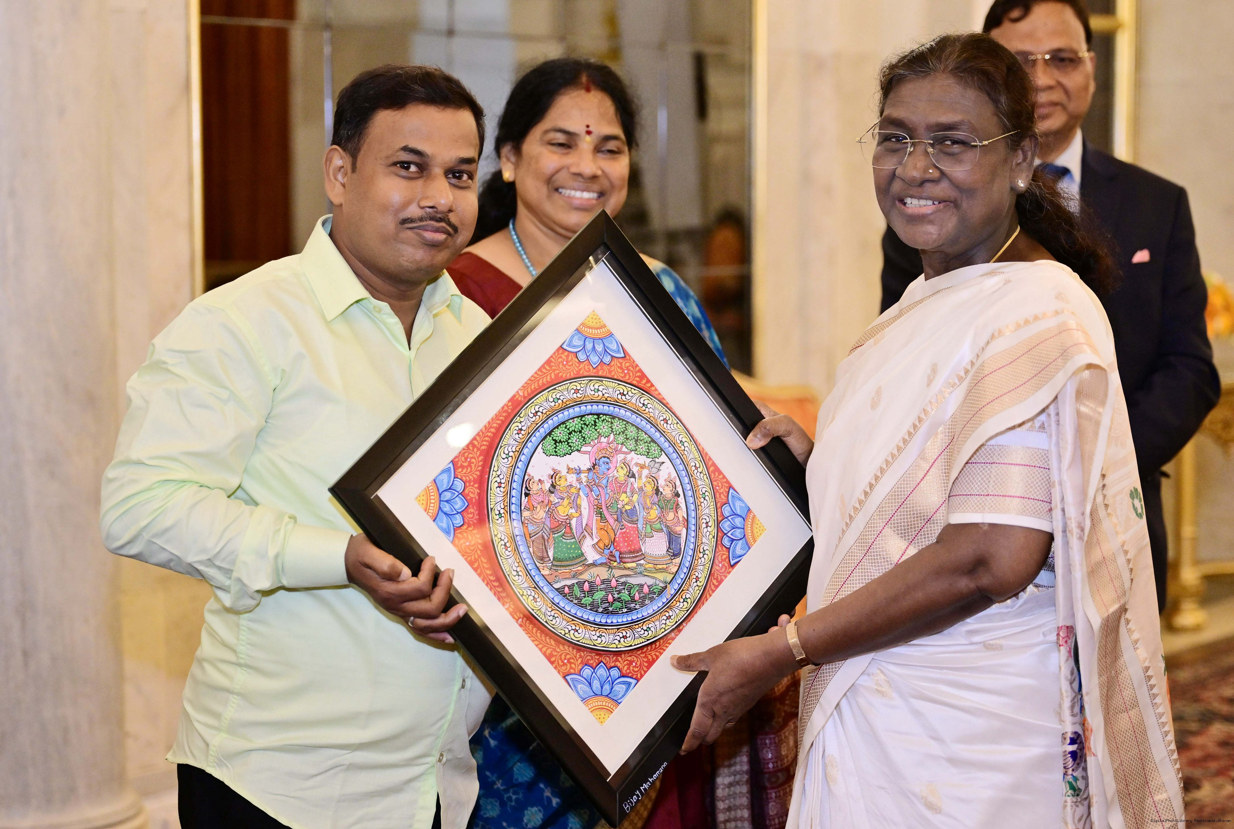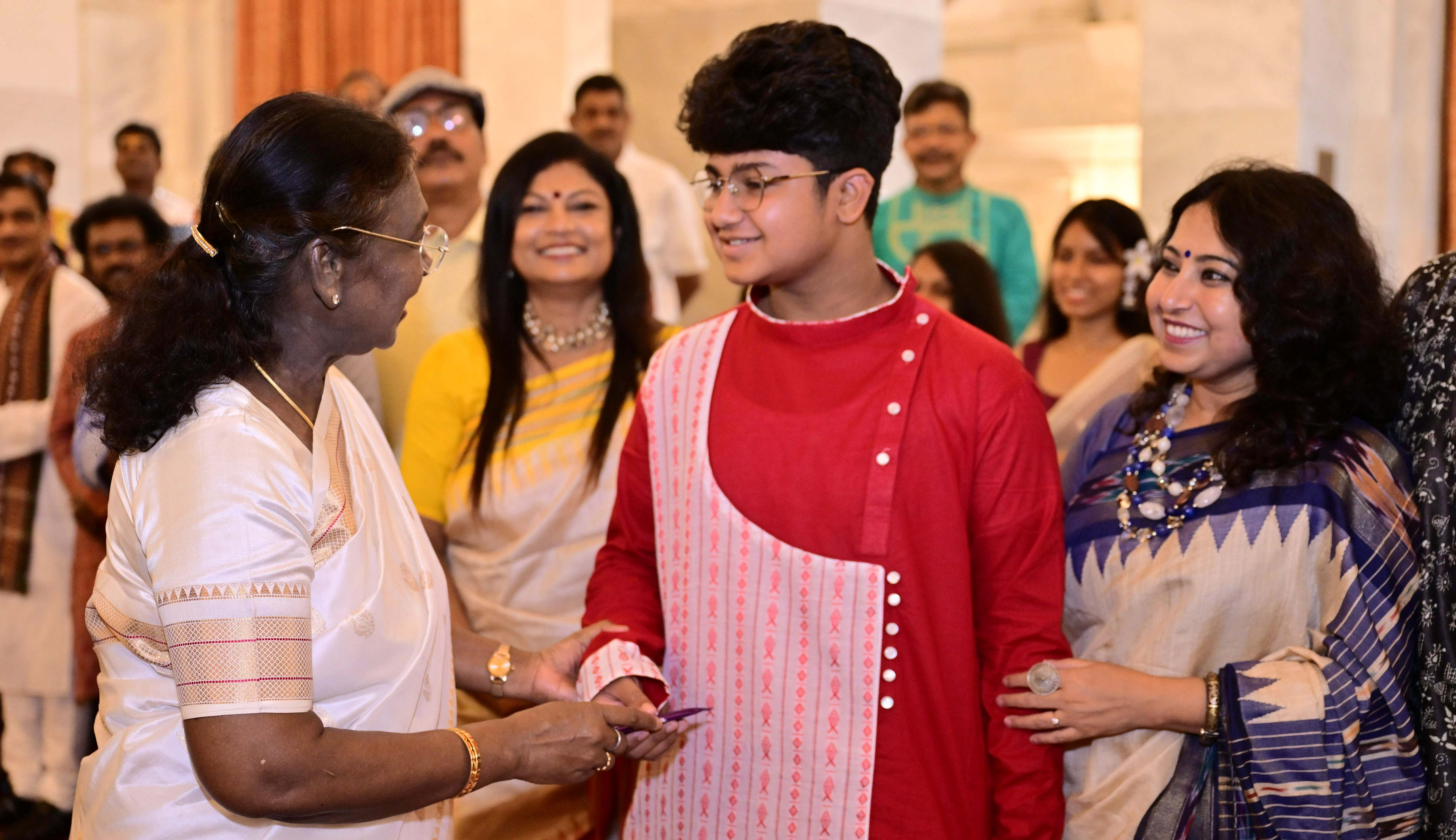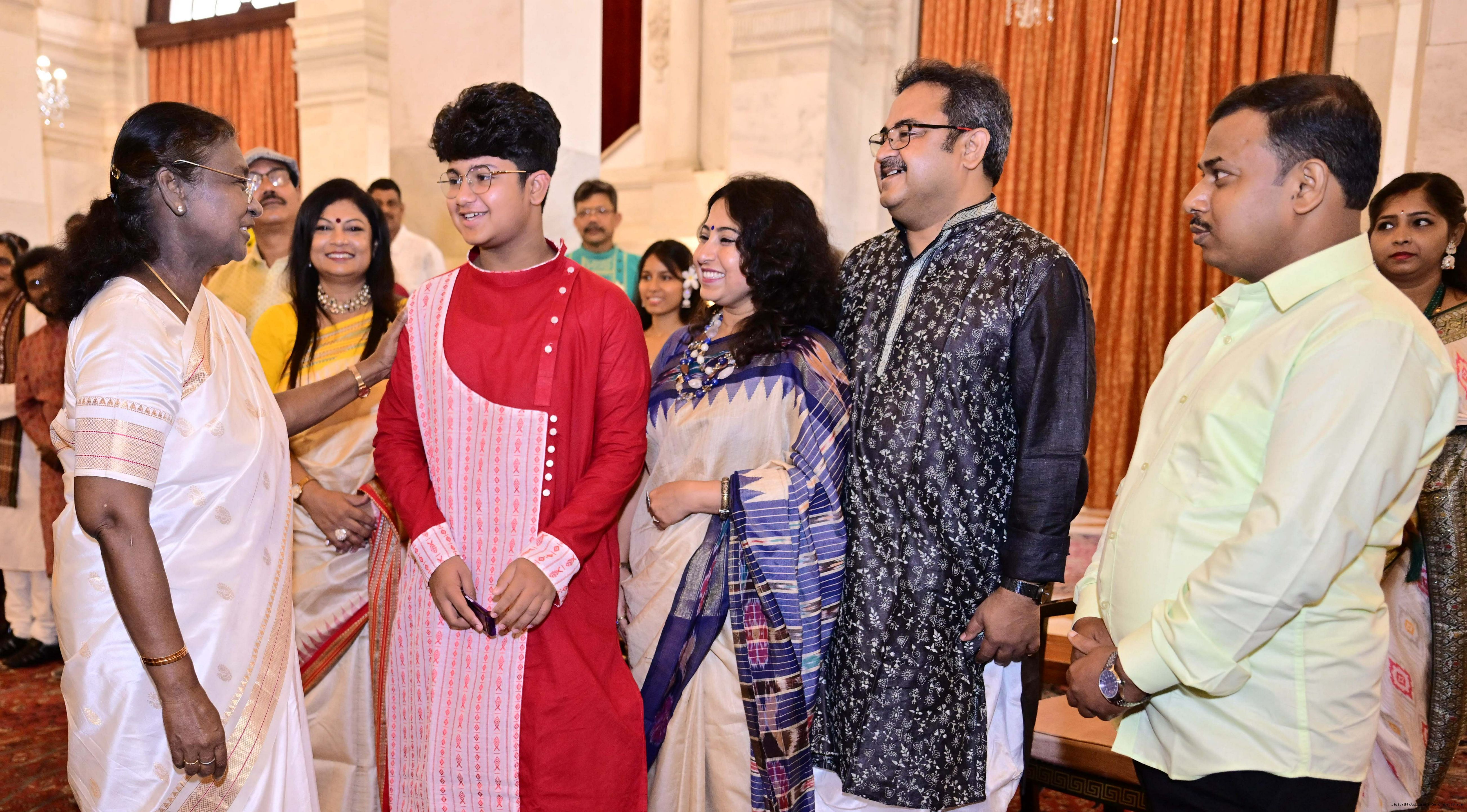 | Caption: | The President of India, Smt Droupadi Murmu met and posing a group photograph with members of collaborating institutions J(viz State Bhavans, SNA and EZCC etc.) contributing to the theme of the 'At Home' event being held at RBCC on the Occasion of Independence Day 25 Rashtrapati Bhavan on August 15, 2025. |
