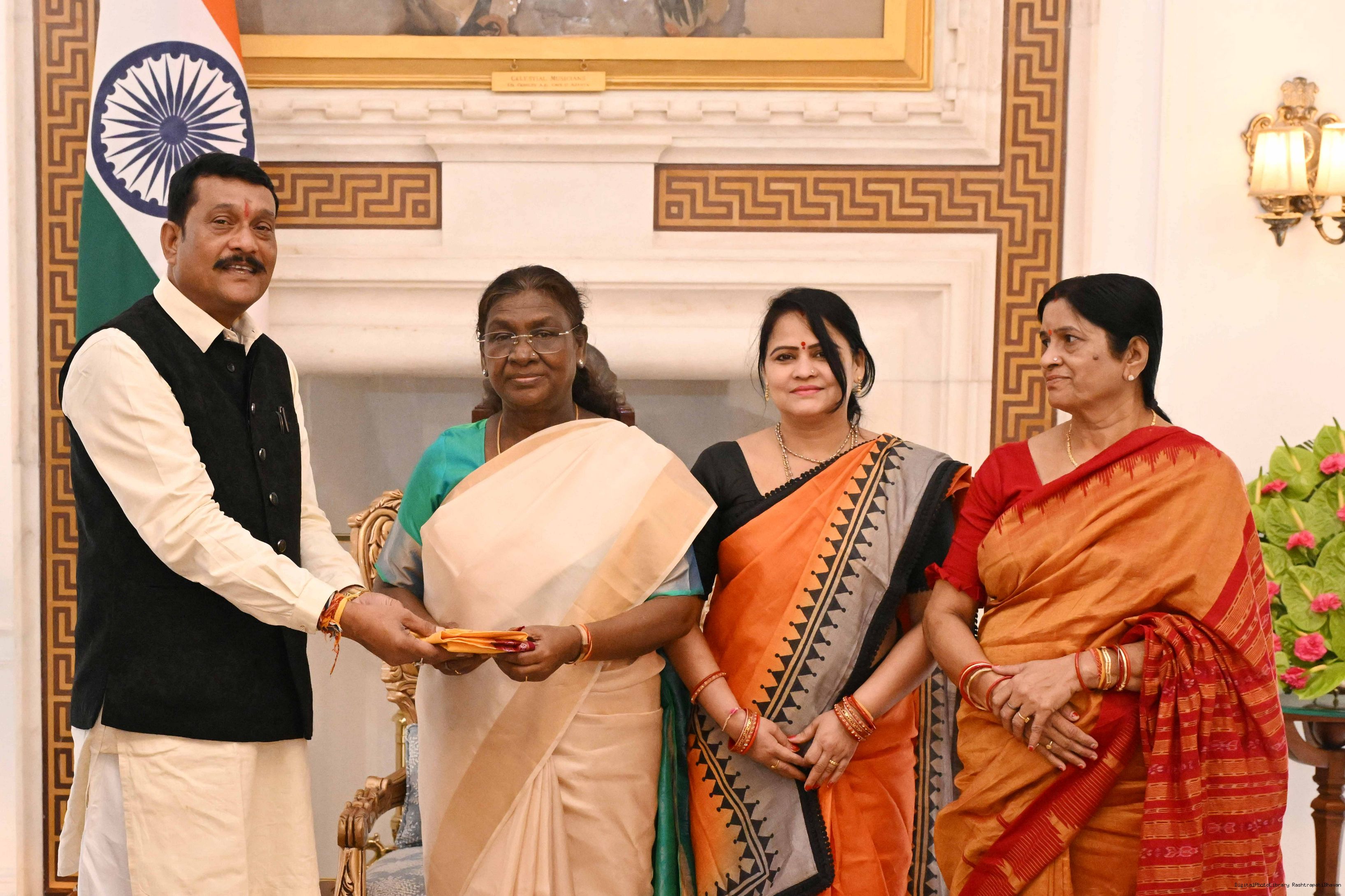 | Caption: | Shri Pradeep Purohit, MP (LS) from Bargarh, Odisha along with spouse and others meeting with the President of India, Smt Droupadi Murmu at Rashtrapati Bhavan on August 18, 2025. |