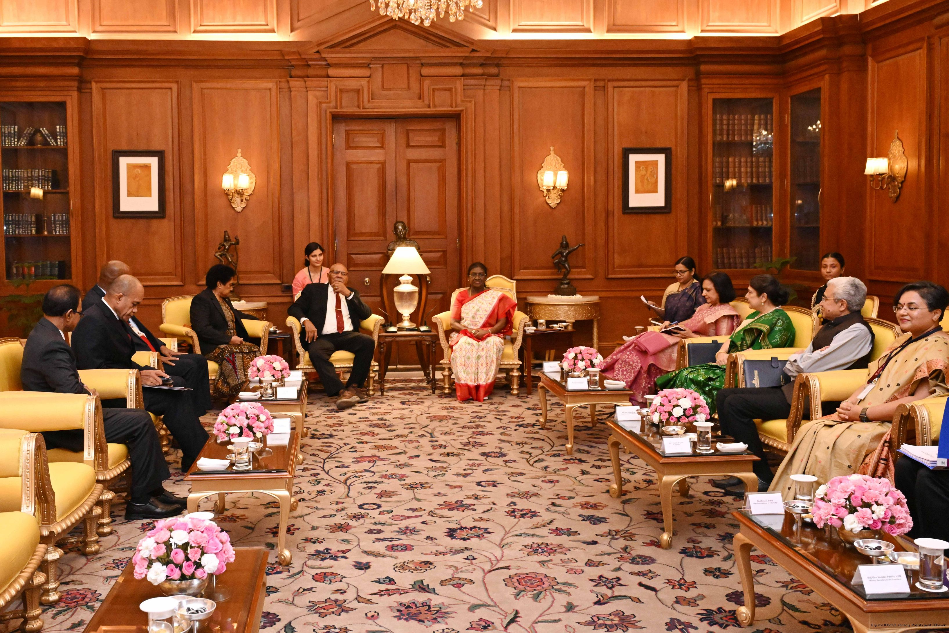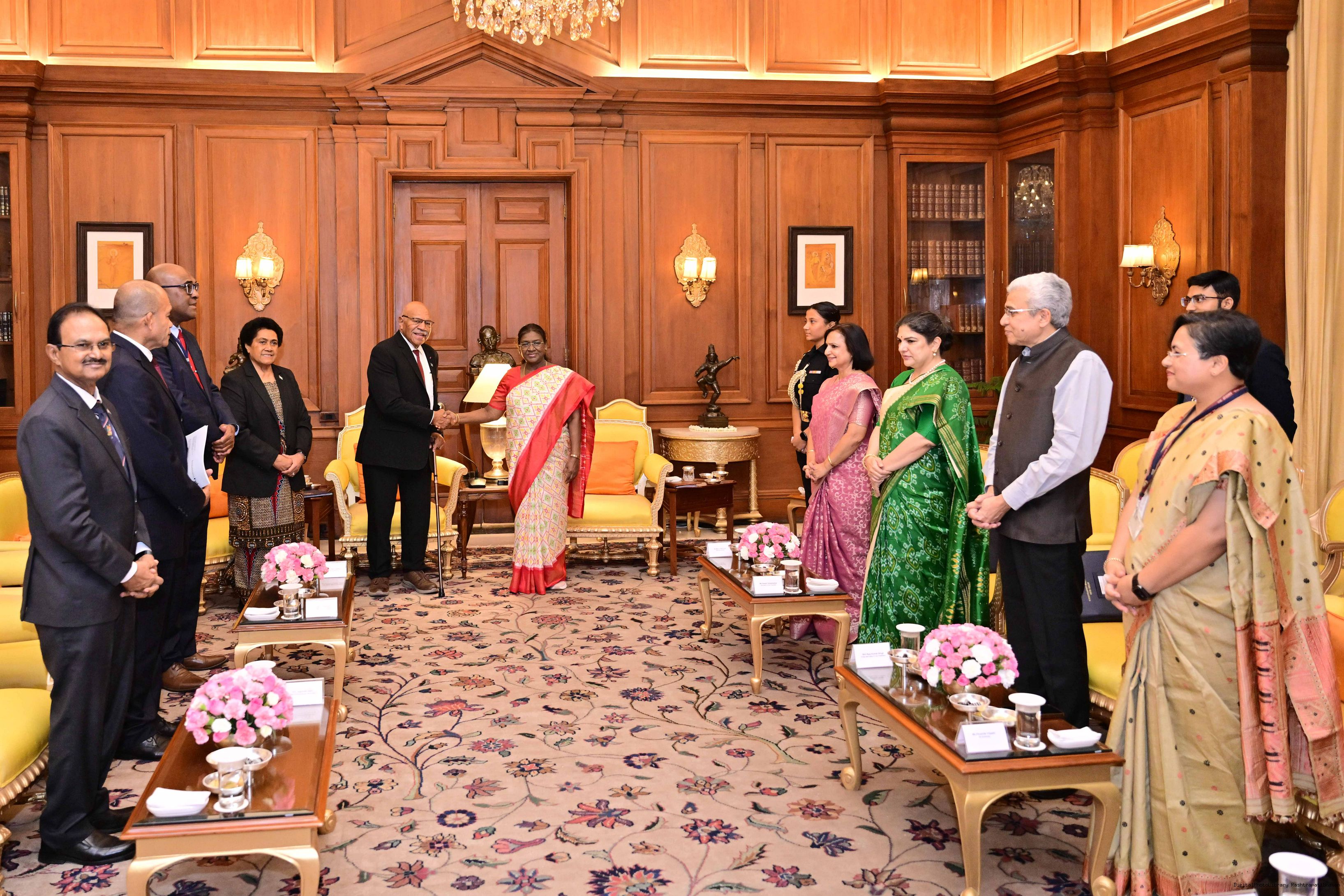 | Caption: | The Prime Minister of the Republic of Fiji, Hon’ble Shri Sitiveni Ligamamada Rabuka, called on the President of India, Smt. Droupadi Murmu at Rashtrapati Bhavan on August 25, 2025. |