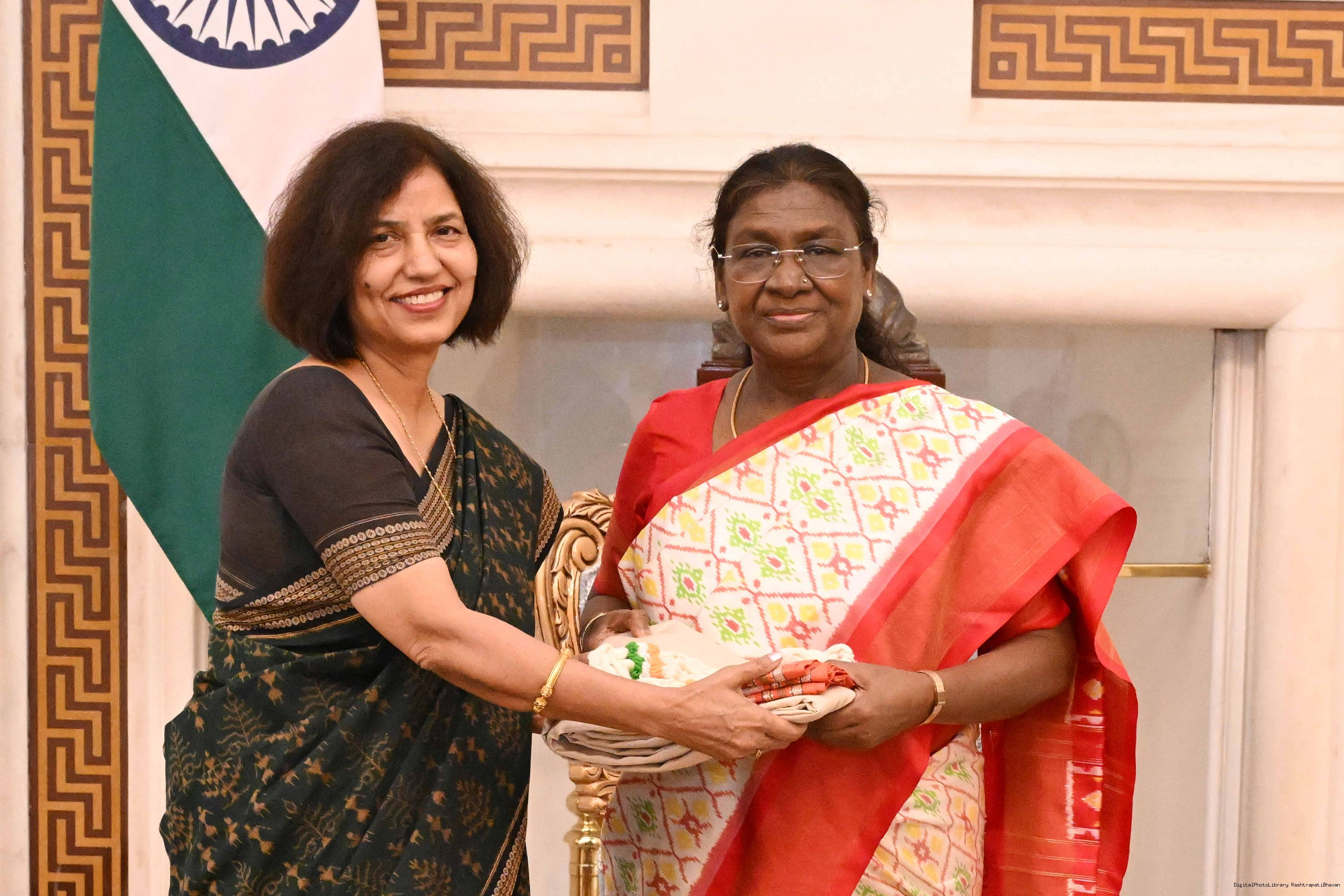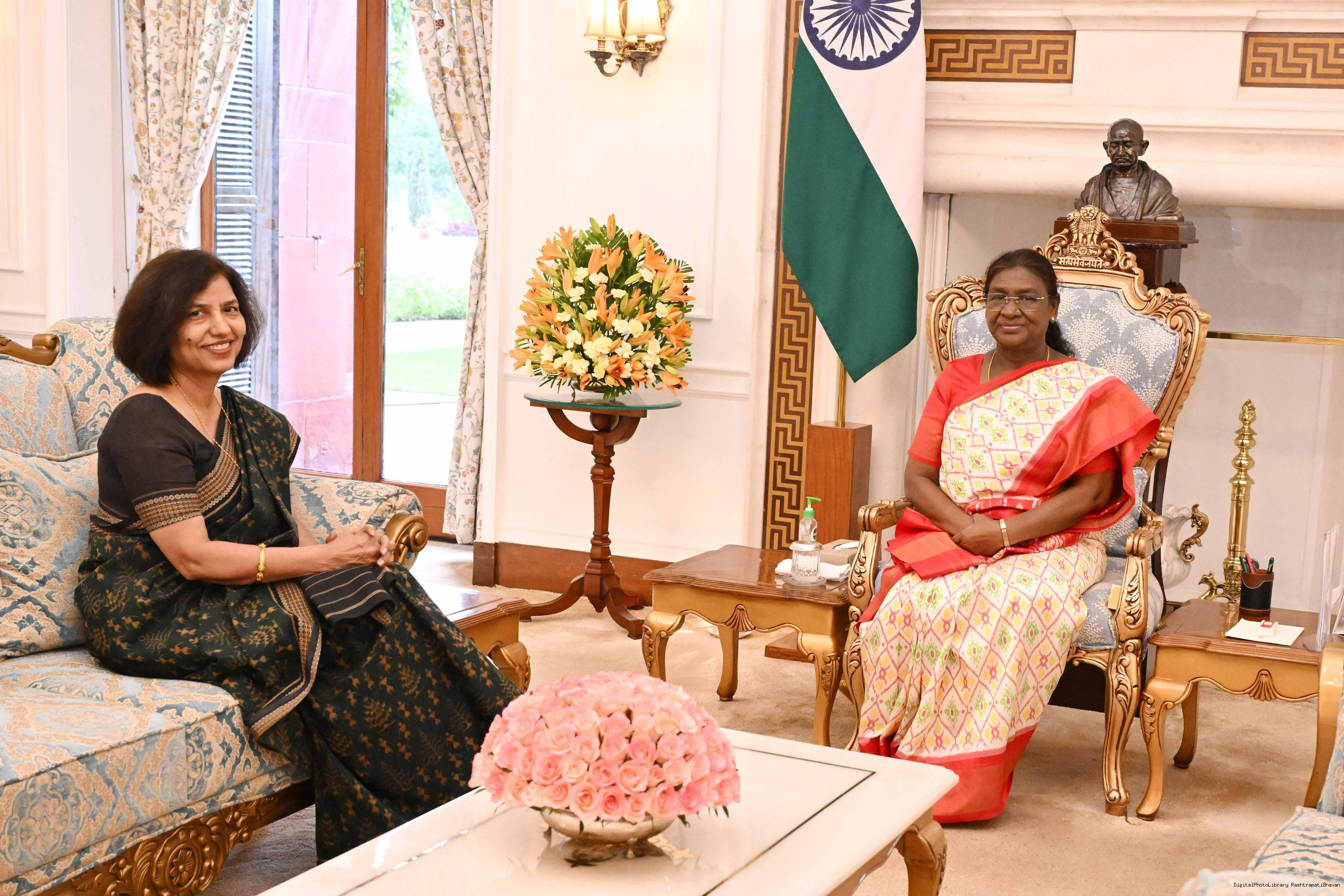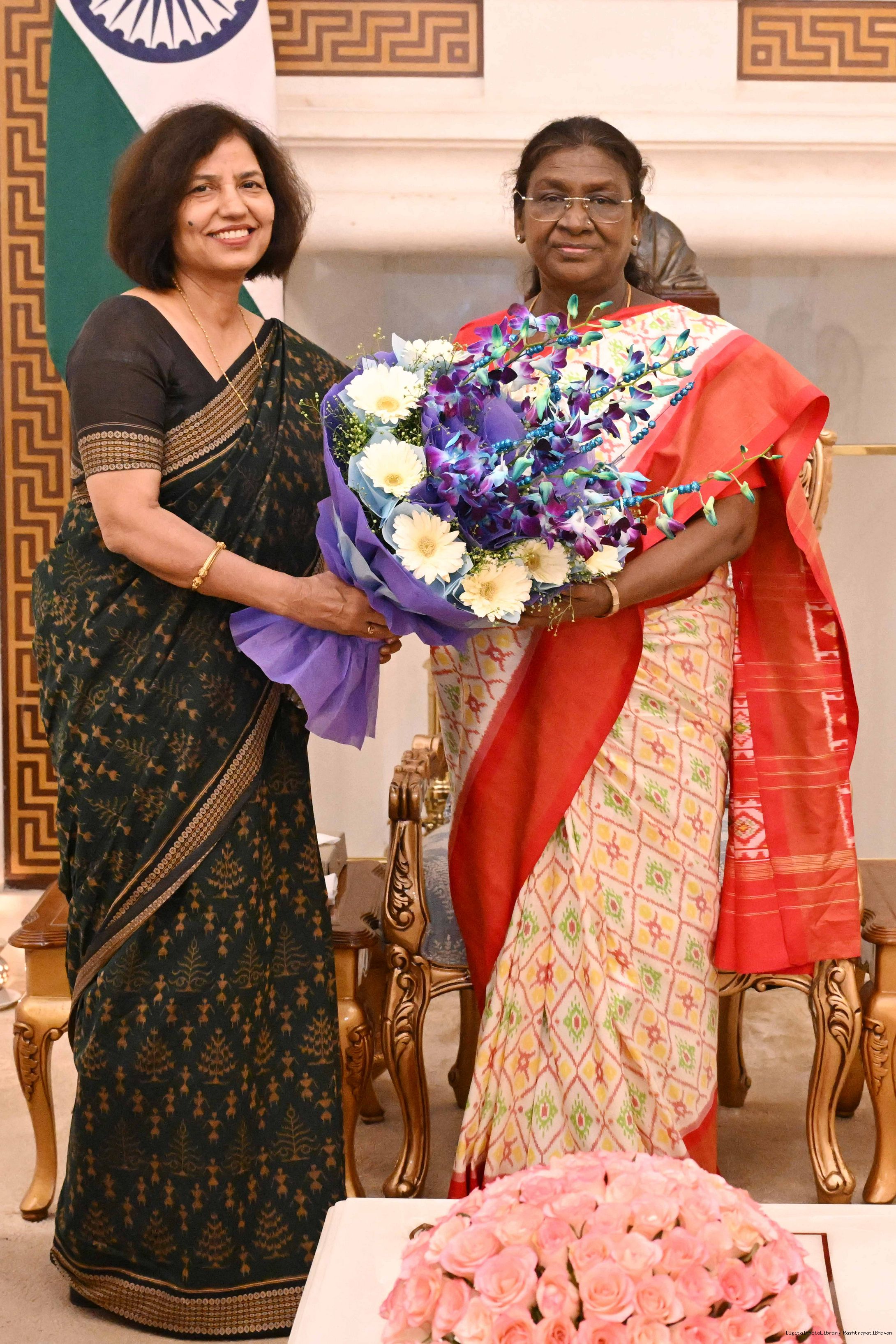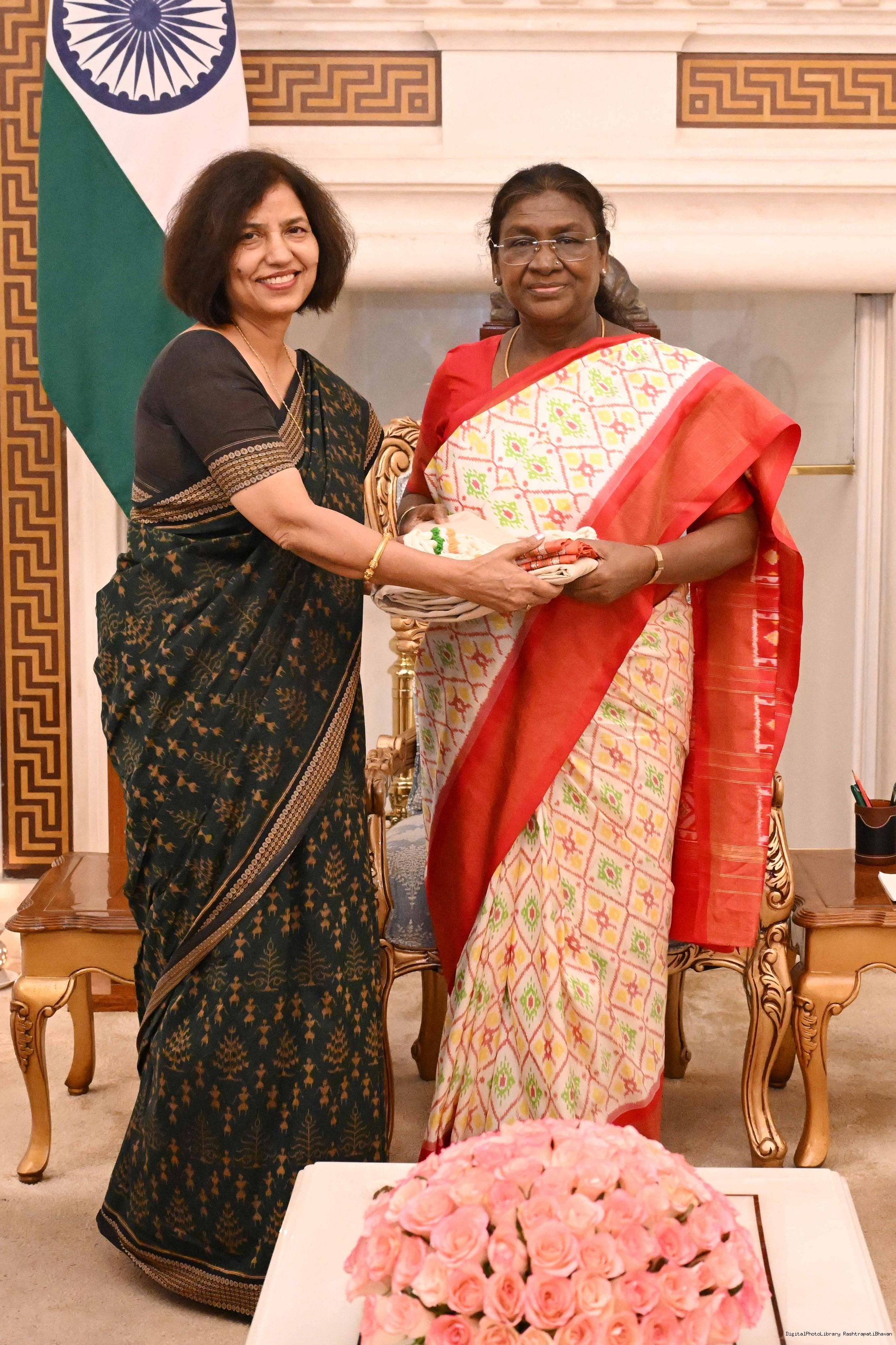 | Caption: | Prof. Kumud Sharma, VC Mahatma Gandhi Antarrashtriya Hindi Vishwavidyalaya, Wardha, Maharashtra meeting the President of India, Smt Droupadi Murmu at Rashtrapati Bhavan on August 25, 2025. |