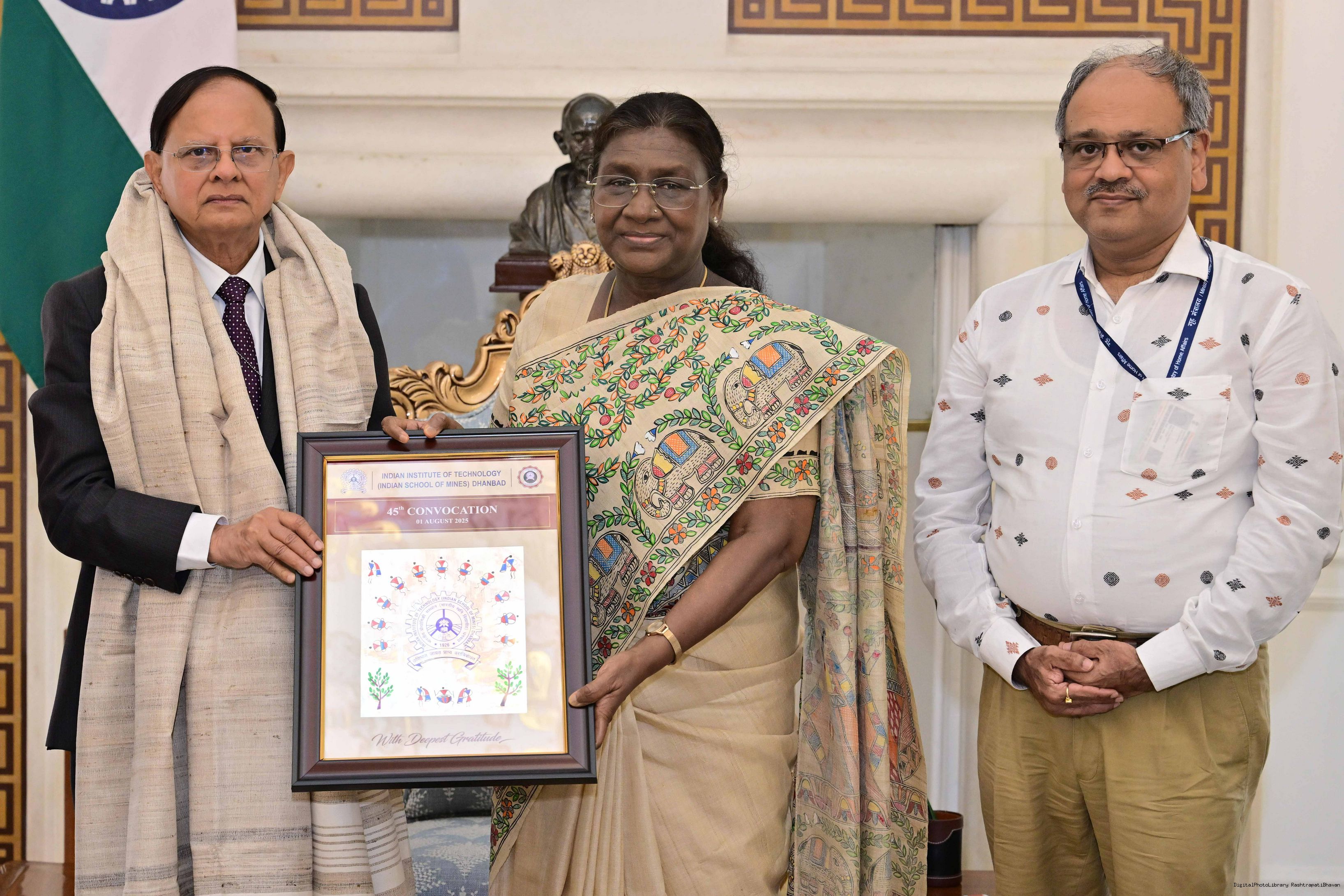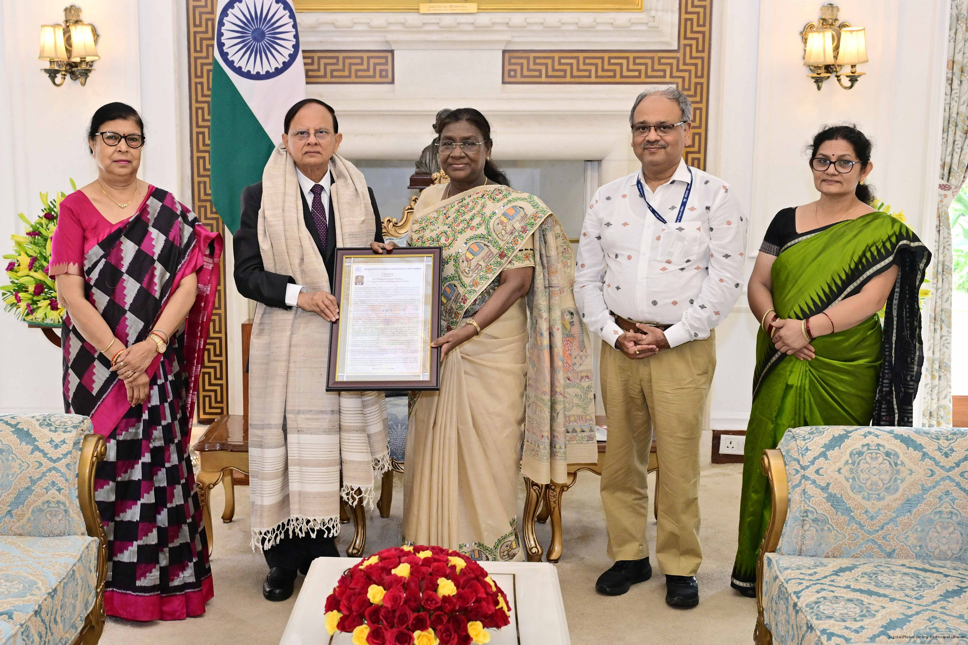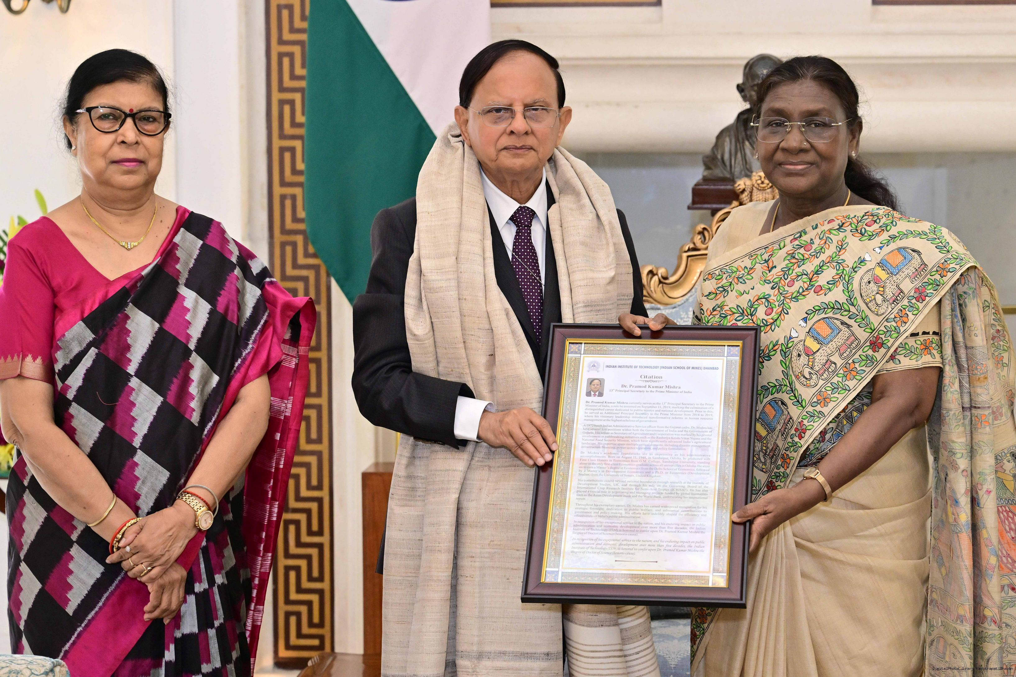 | Caption: | The President, as Visitor of IIT (ISM) Dhanbad, conferring Honorary Doctorate- Doctor of Science (Honoris Causa) on Dr P. K. Mishra, Principal Secretary to the Prime Minister, on 26th Aug, 2025. He is accompanied by his spouse Smt. Madhuchhanda Mishra and Prof. Sukumar Mishra, Director IIT (ISM) Dhanbad along with spouse. |