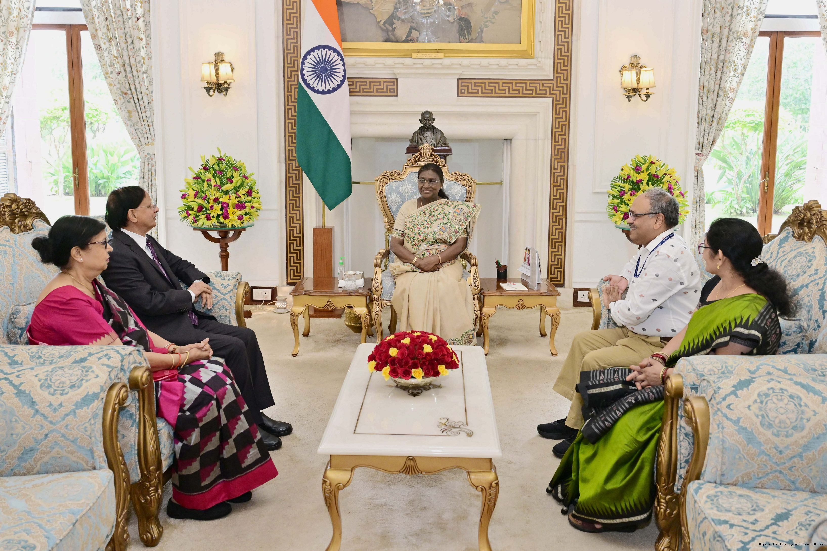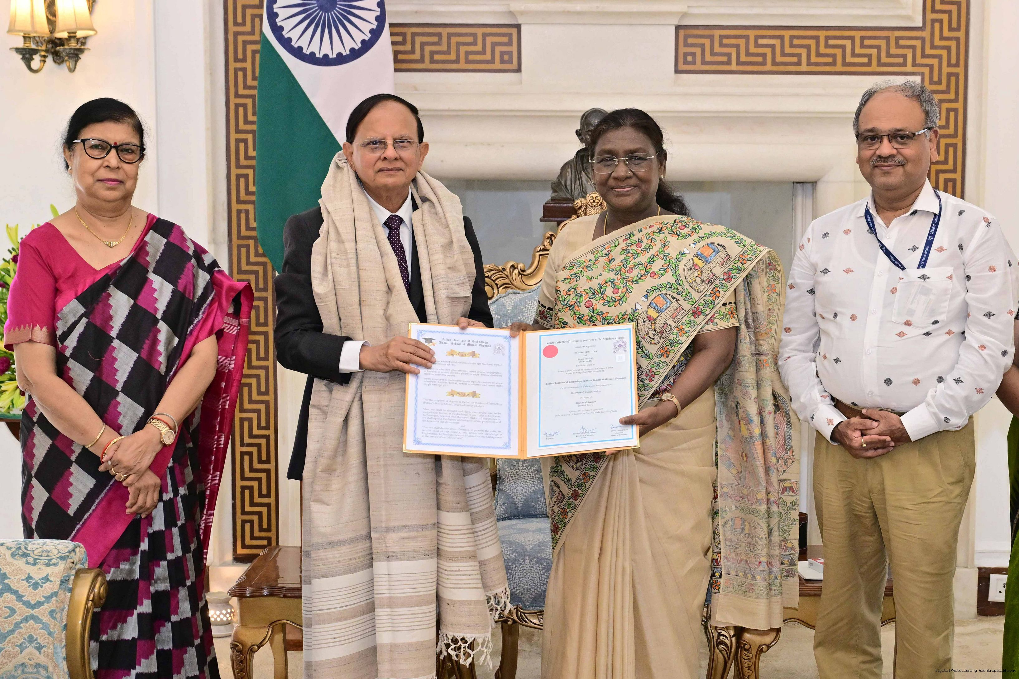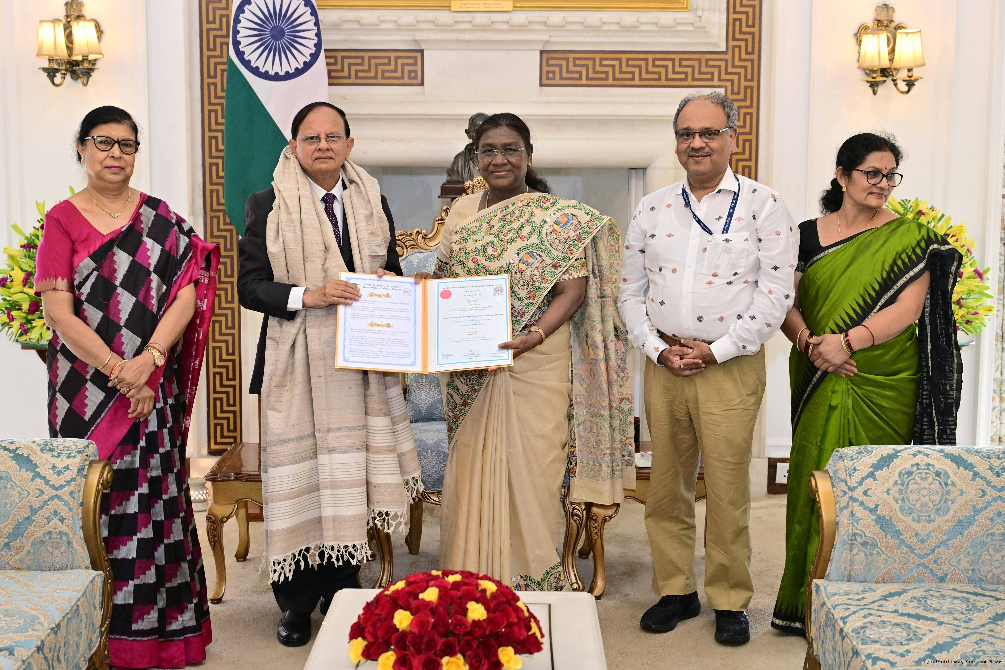 | Caption: | The President, as Visitor of IIT (ISM) Dhanbad, conferring Honorary Doctorate- Doctor of Science (Honoris Causa) on Dr P. K. Mishra, Principal Secretary to the Prime Minister, on 26th Aug, 2025. He is accompanied by his spouse Smt. Madhuchhanda Mishra and Prof. Sukumar Mishra, Director IIT (ISM) Dhanbad along with spouse. |