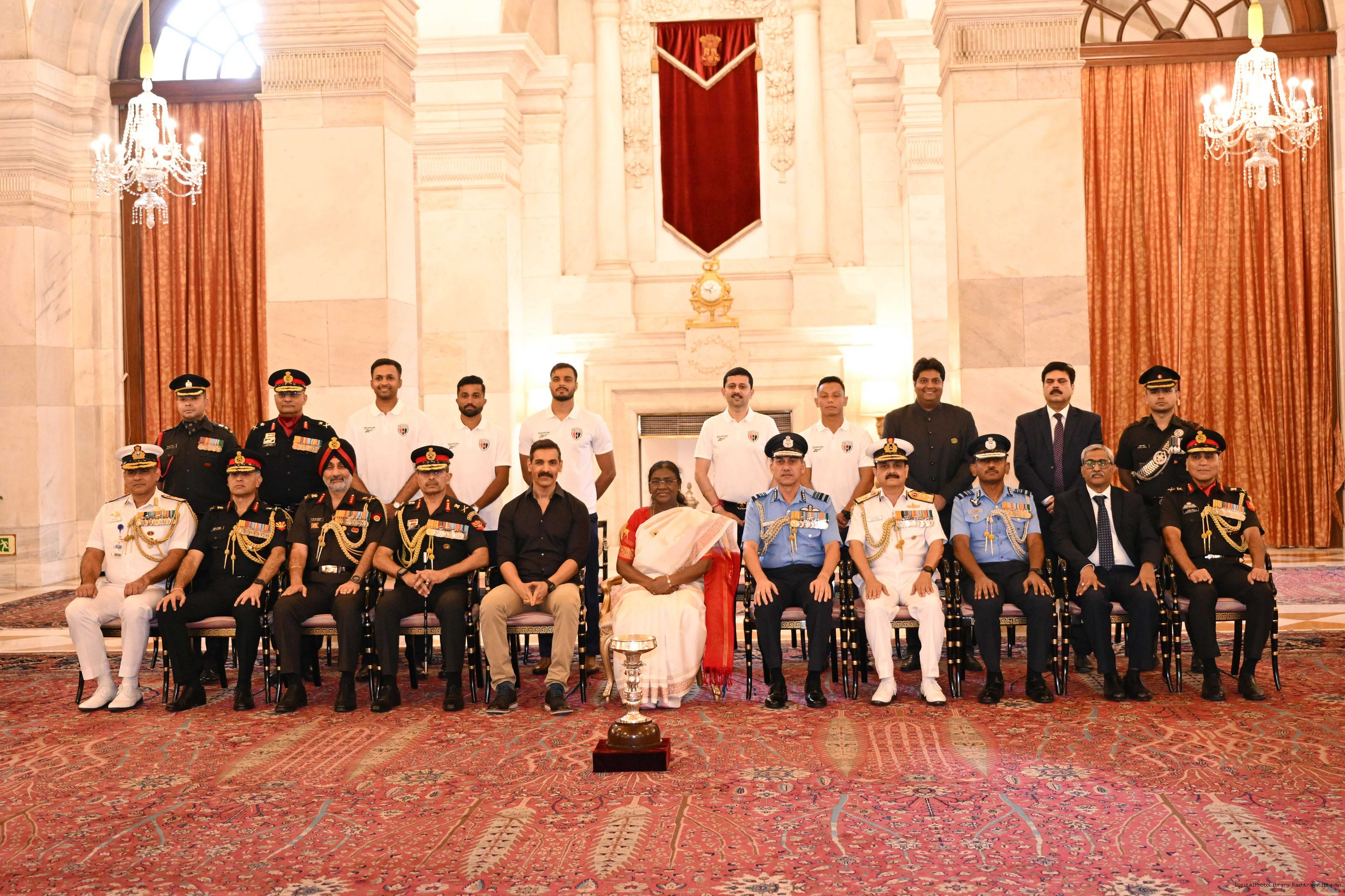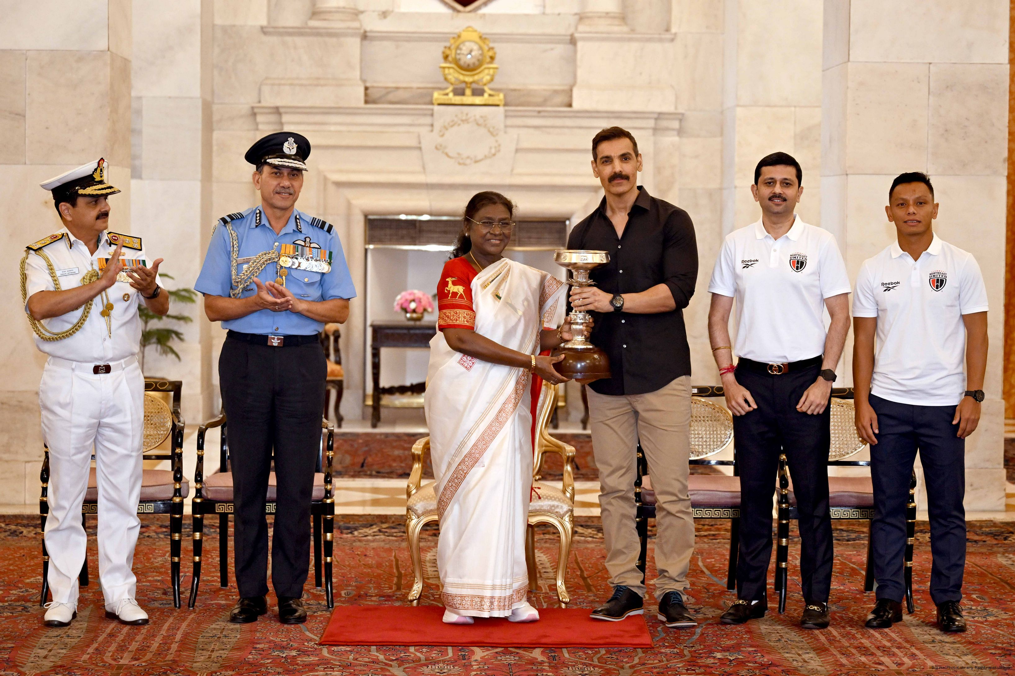 | Caption: | Members of the North East United Football Club, who won the President’s Cup of the Durand Cup Tournament, 2025, called on the President Droupadi Murmu at Rashtrapati Bhavan on August 27, 2025. |