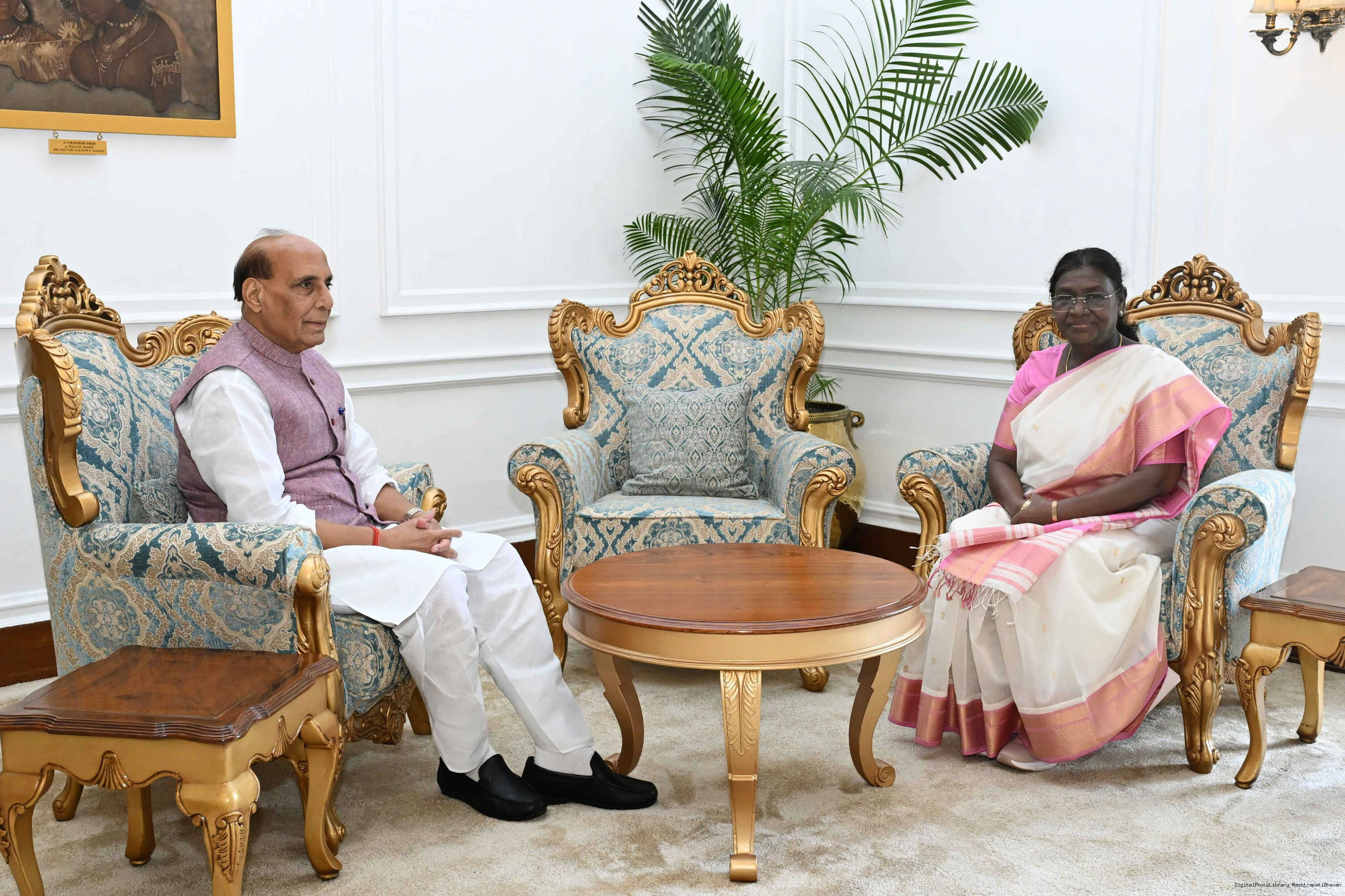 | Caption: | The Union Minister for Defence, Shri Rajnath Singh, called on the President of India, Smt. Droupadi Murmu at Rashtrapati Bhavan on September 4, 2025. |