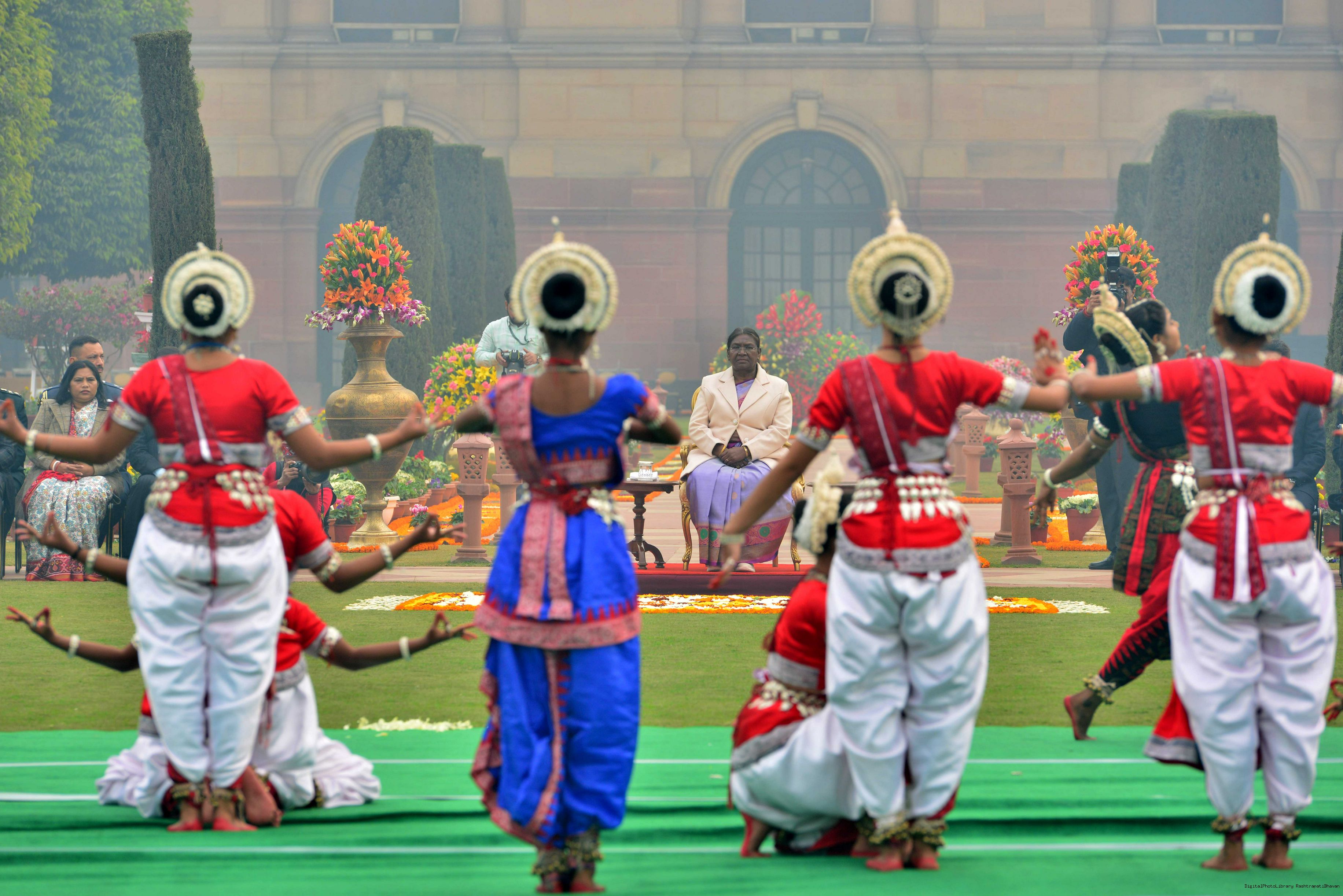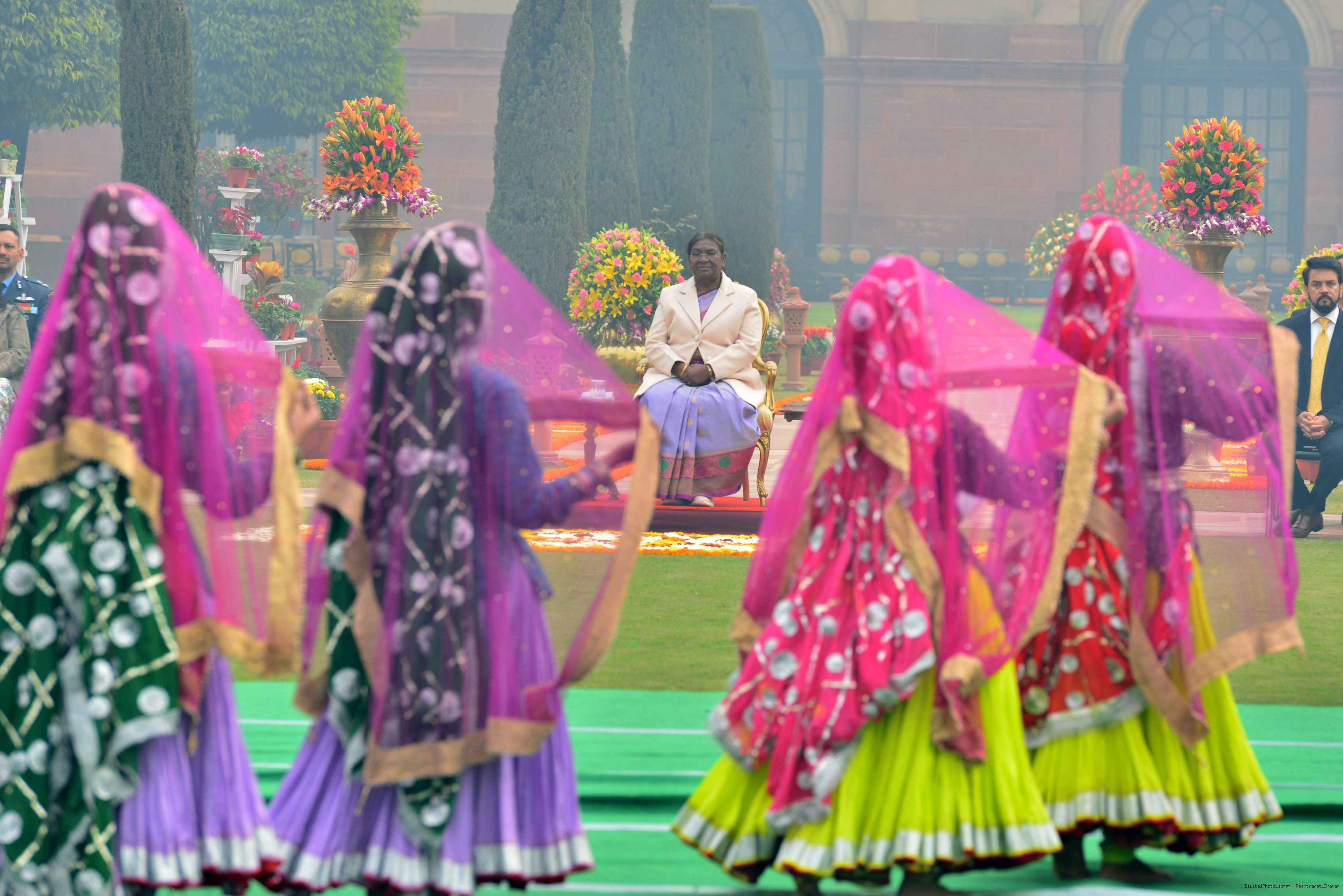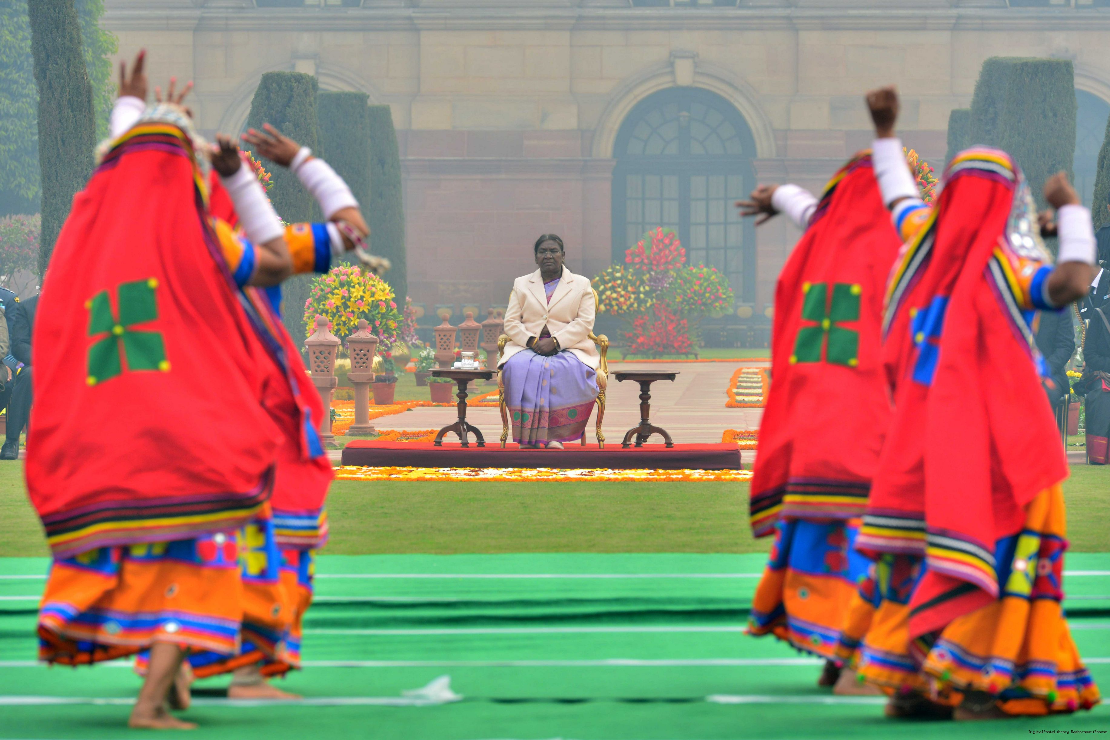 Caption: The President of India, Smt. Droupadi Murmu met tribal guests, tableaux artistes and tractor drivers, NSS volunteers and NCC cadets, officials and other participants of the Republic Day Parade 2024, at Rashtrapati Bhavan on January 28, 2024.