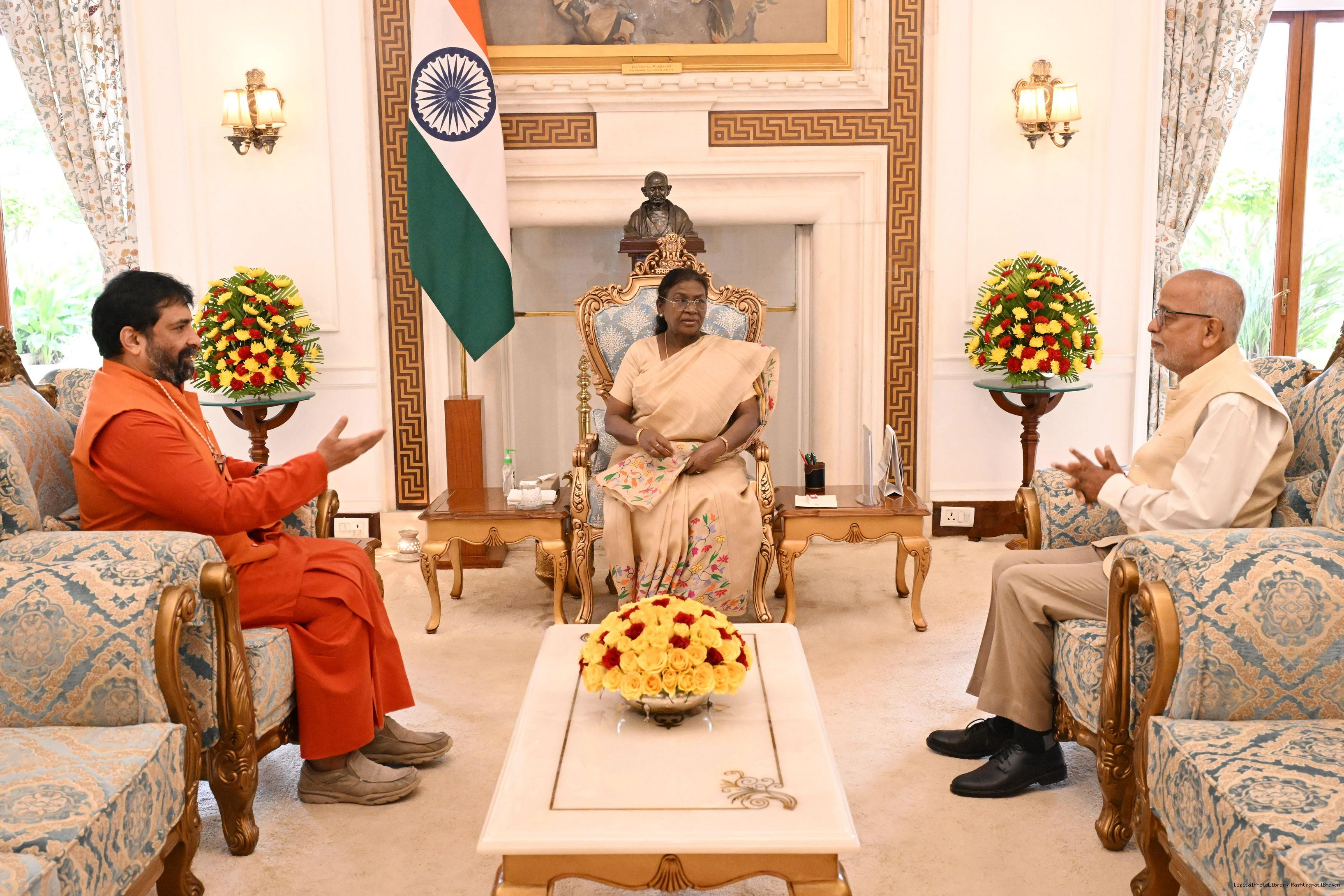 | Caption: | Swami Nijamritananda Puri, Head, Delhi Ashram of Mata Amritanandamayi Math along with Shri Satyananda Mishra meeting with the President of India, Smt. Droupadi Murmu at Rashtrapati Bhavan on September 9, 2025. |