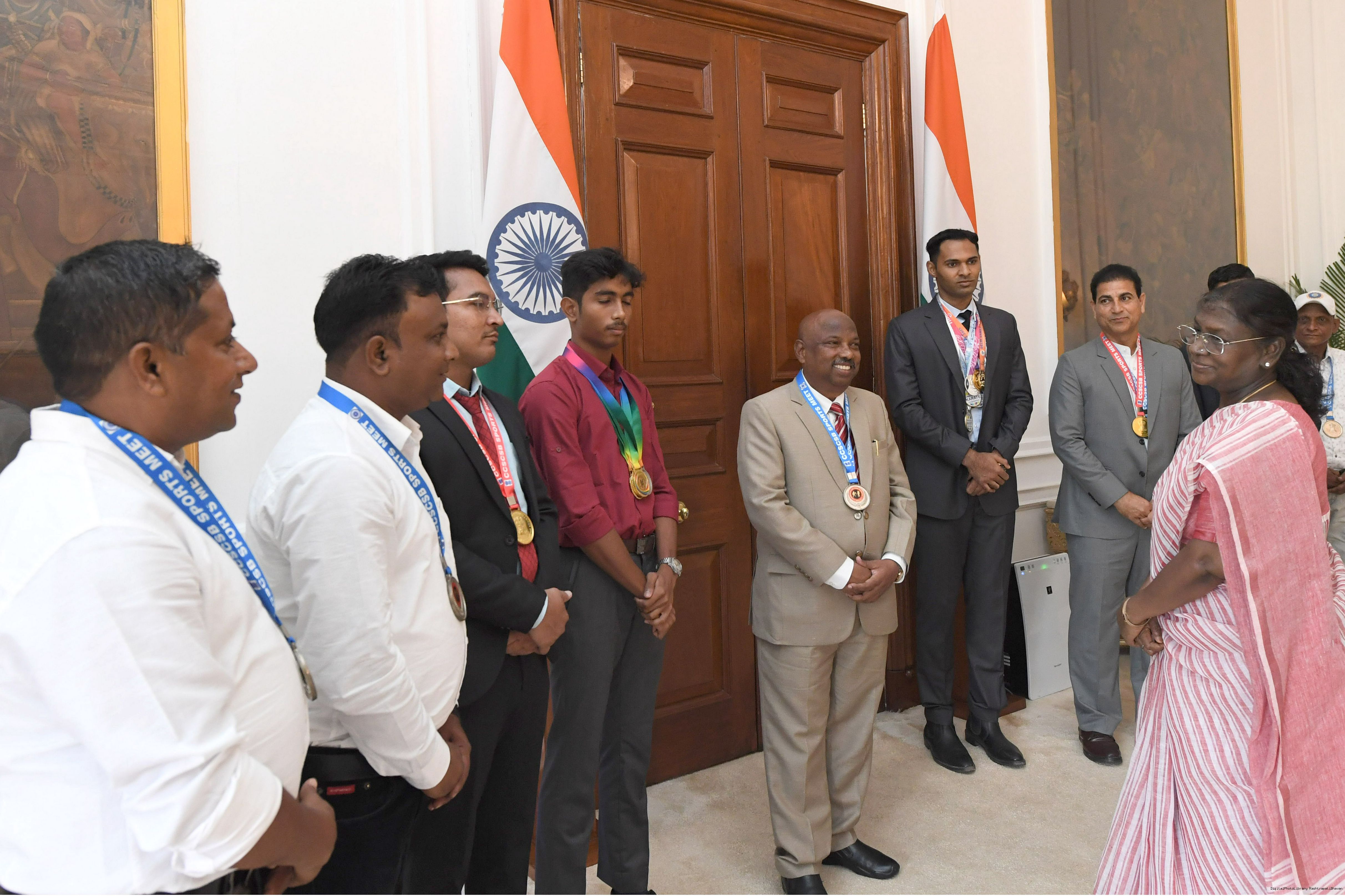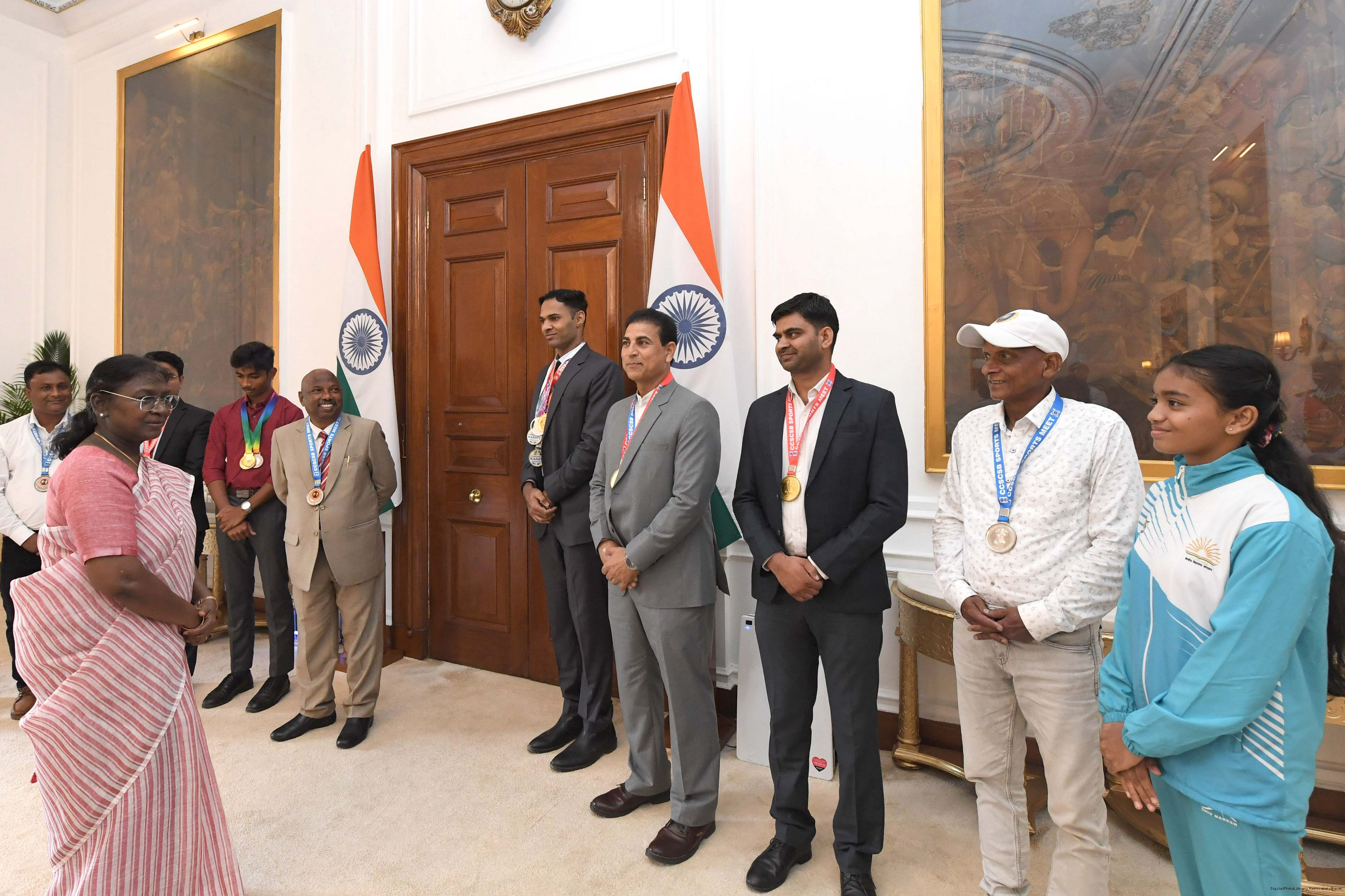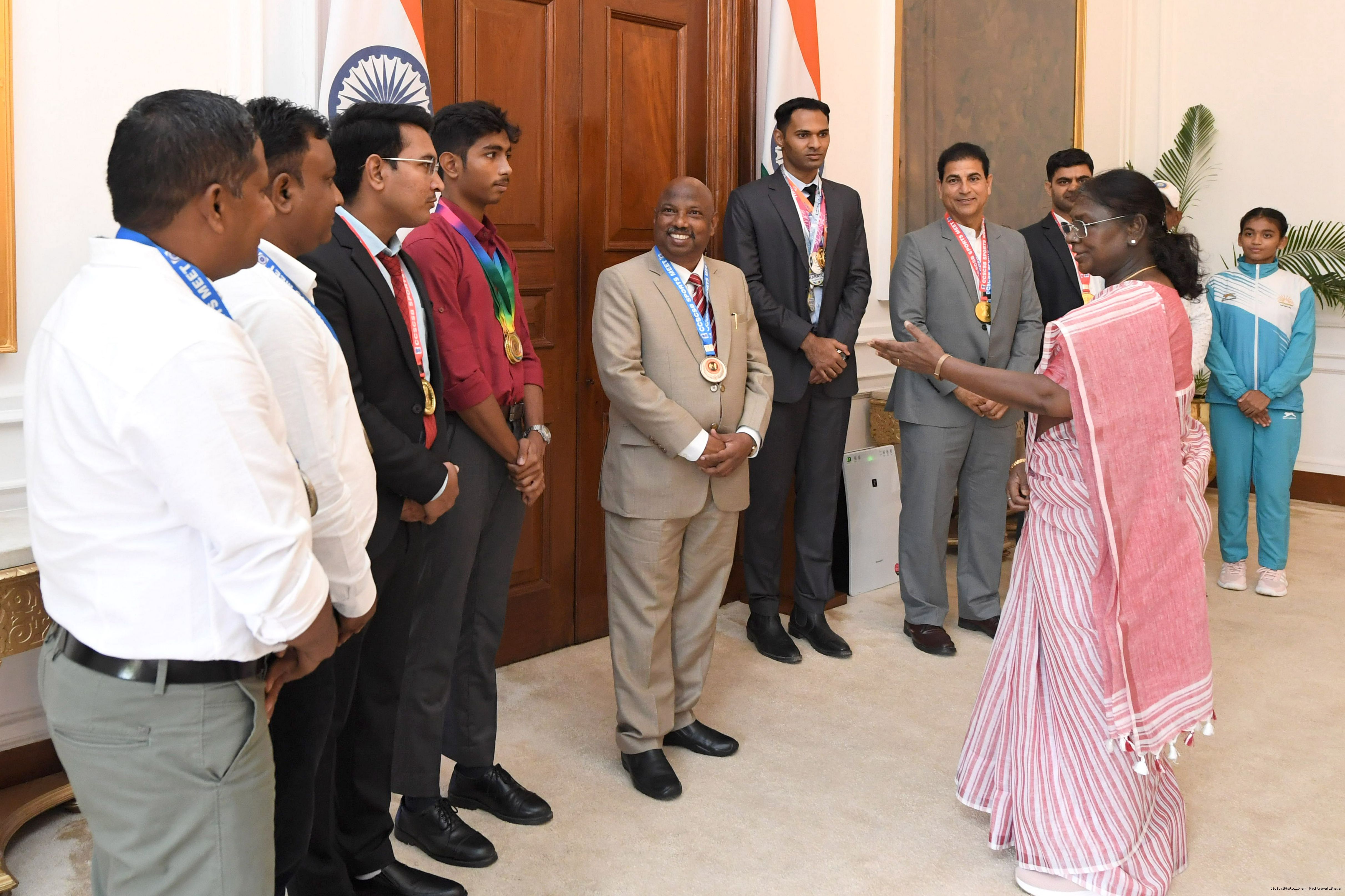 | Caption: | Shri Gautam Kumar, US along with others, sports achievers meeting with the President of India, Smt. Droupadi Murmu at Rashtrapati Bhavan on September 11, 2025. |