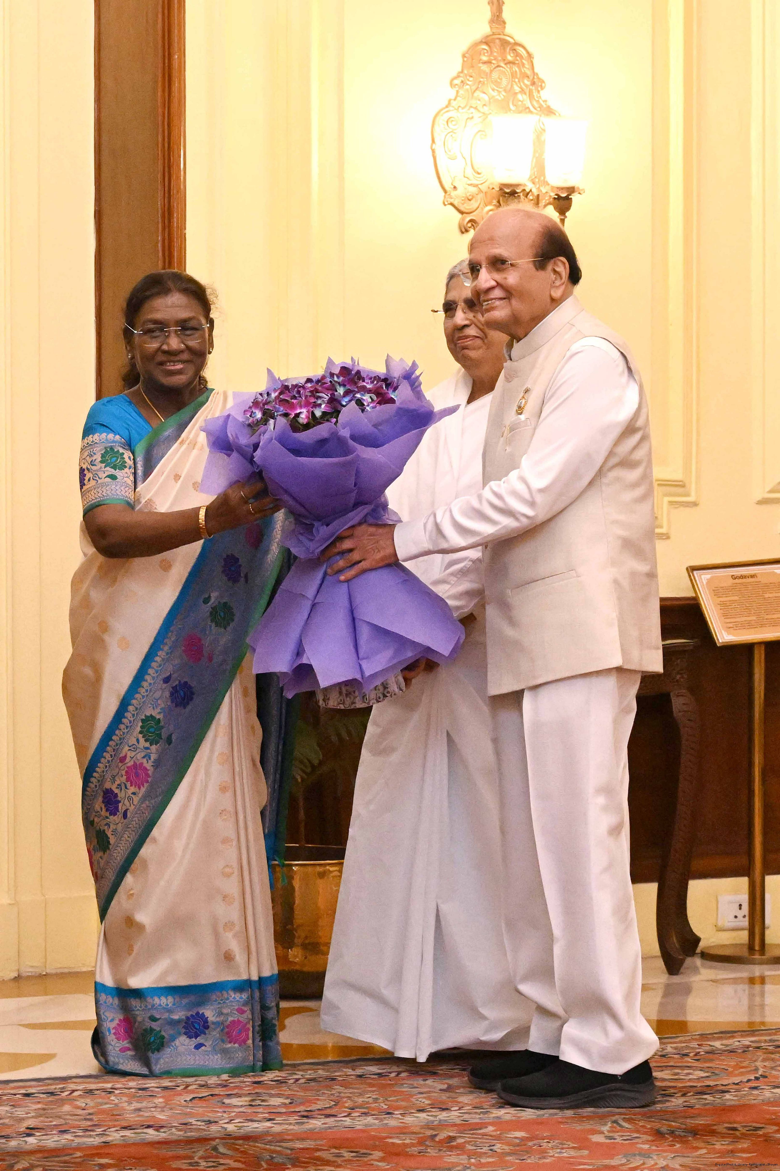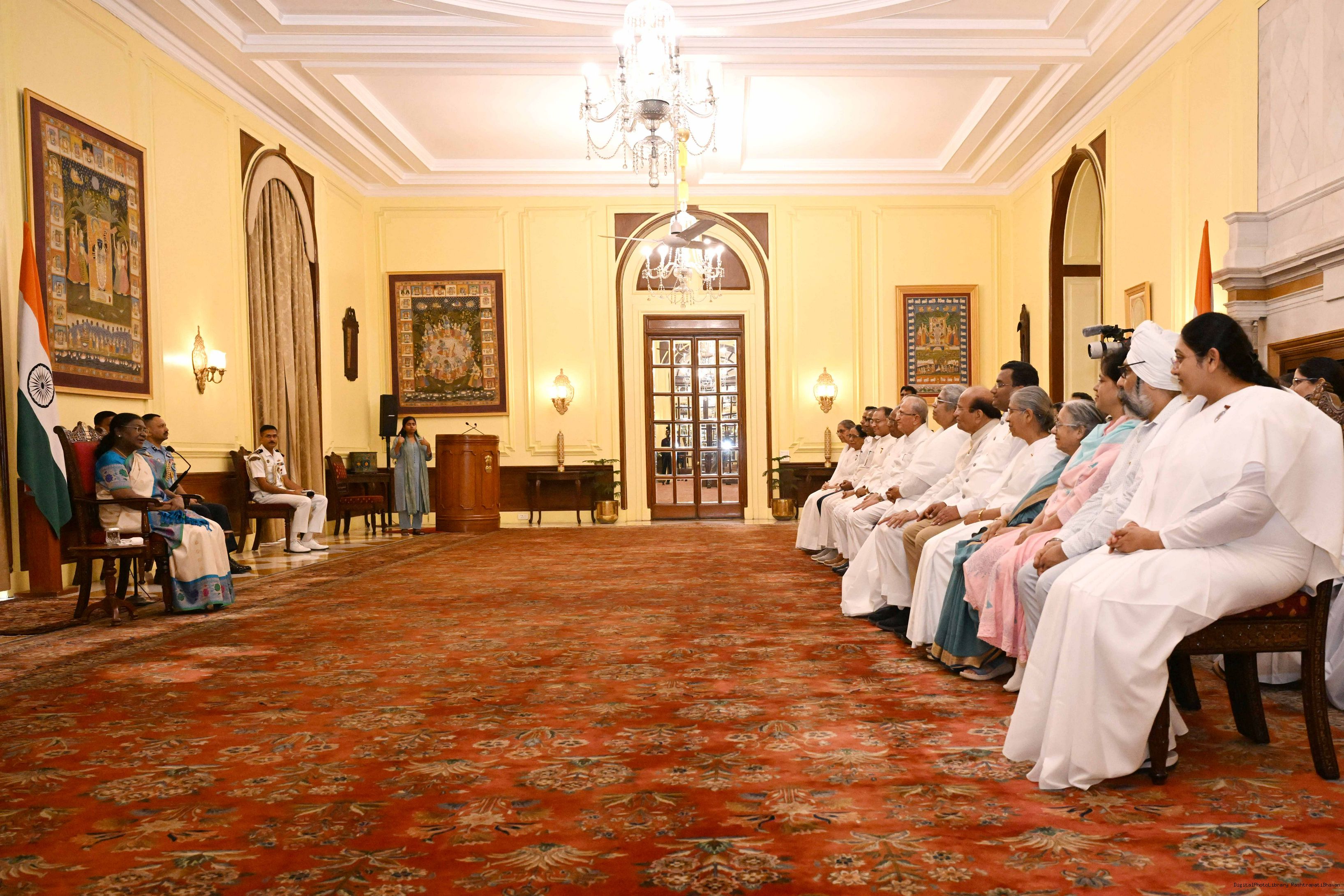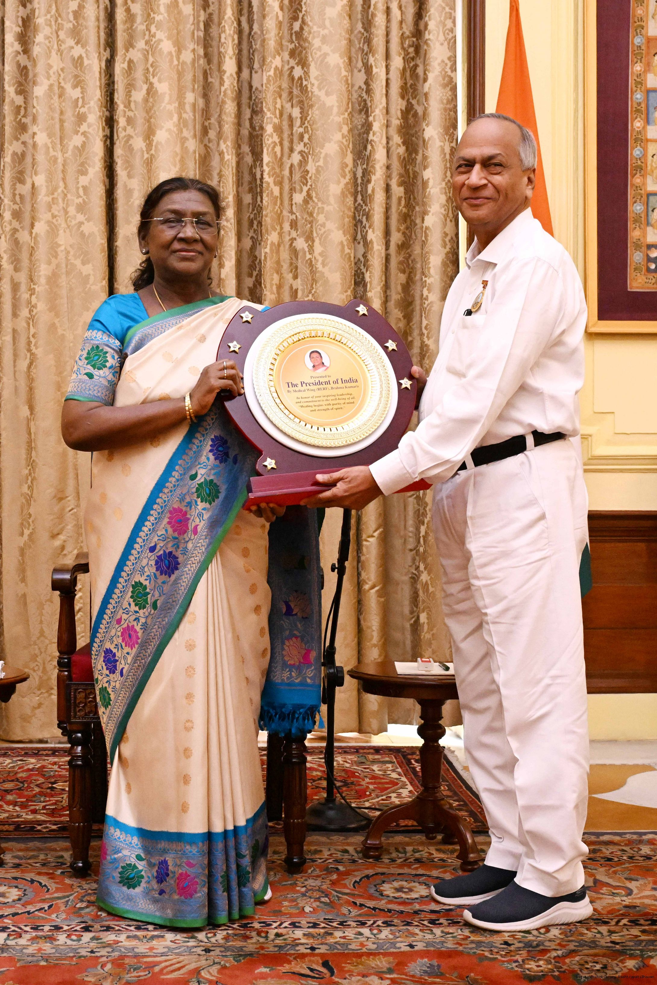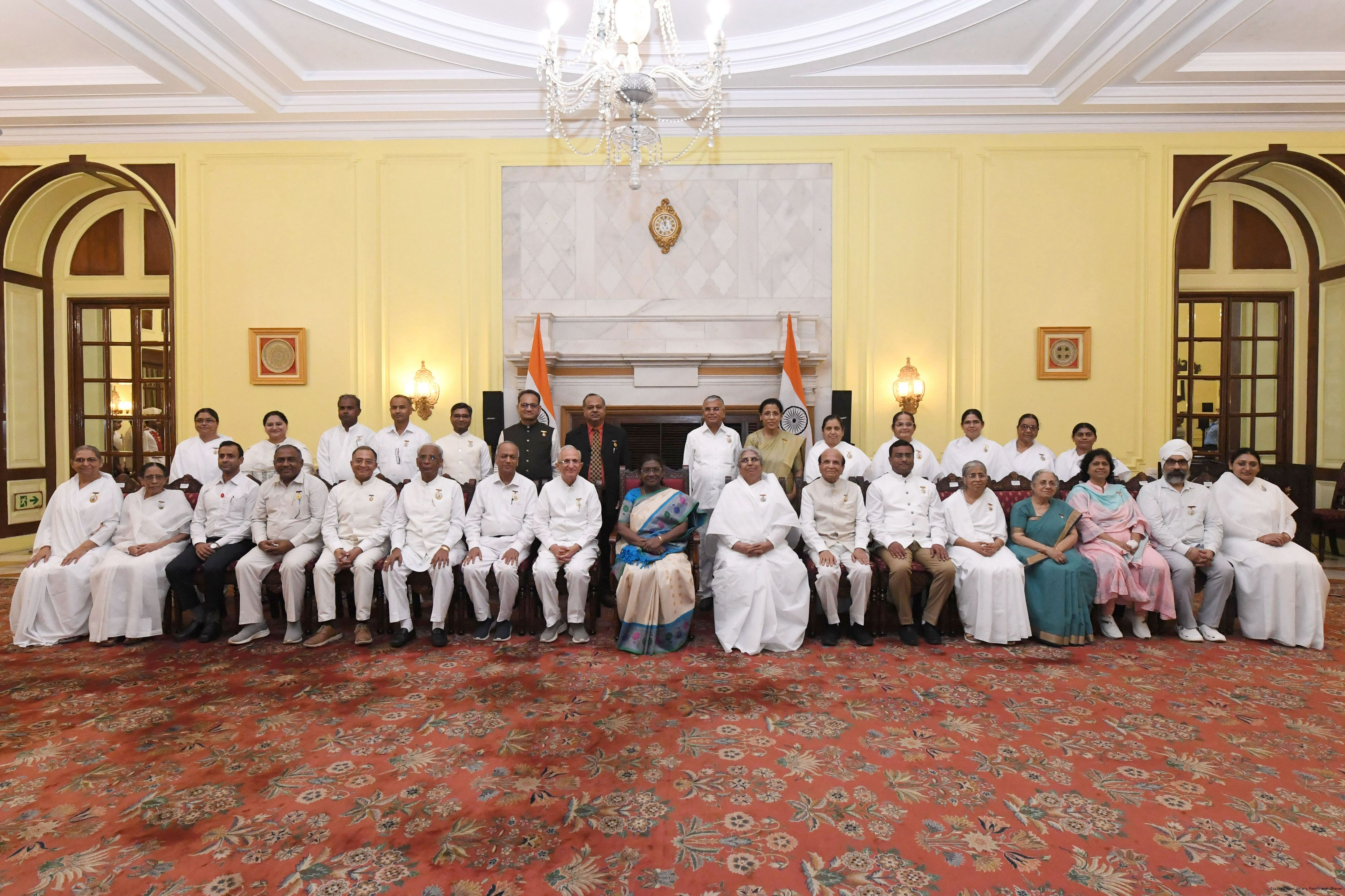 | Caption: | The President of India, Smt. Droupadi Murmu interaction with a group of 37 persons consisting of BK Asha, Member, Management Committee of Brahma Kumaris, Mount Abu and Direcotr of BK Centers at Rashtrapati Bhavan on September 18, 2025. |