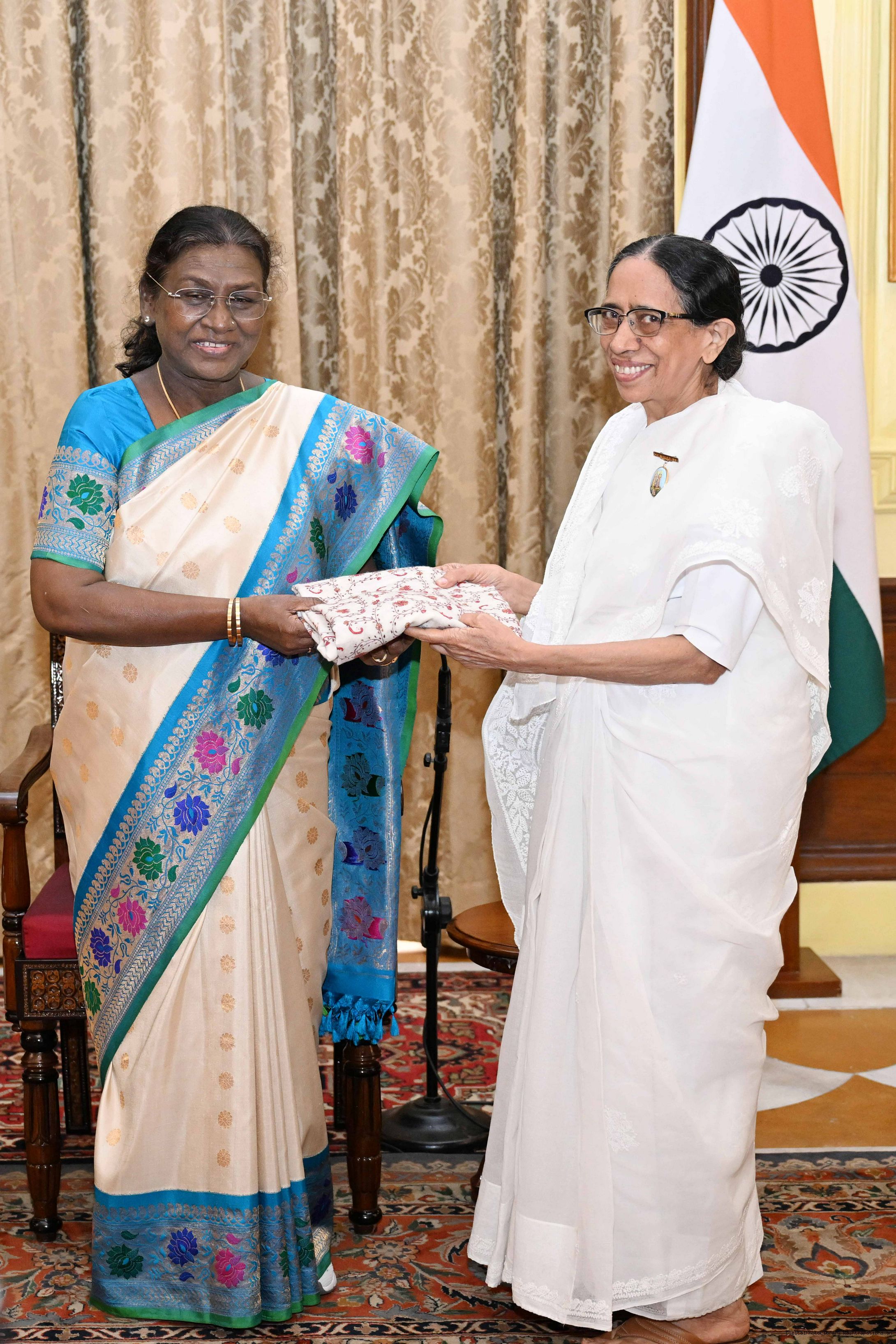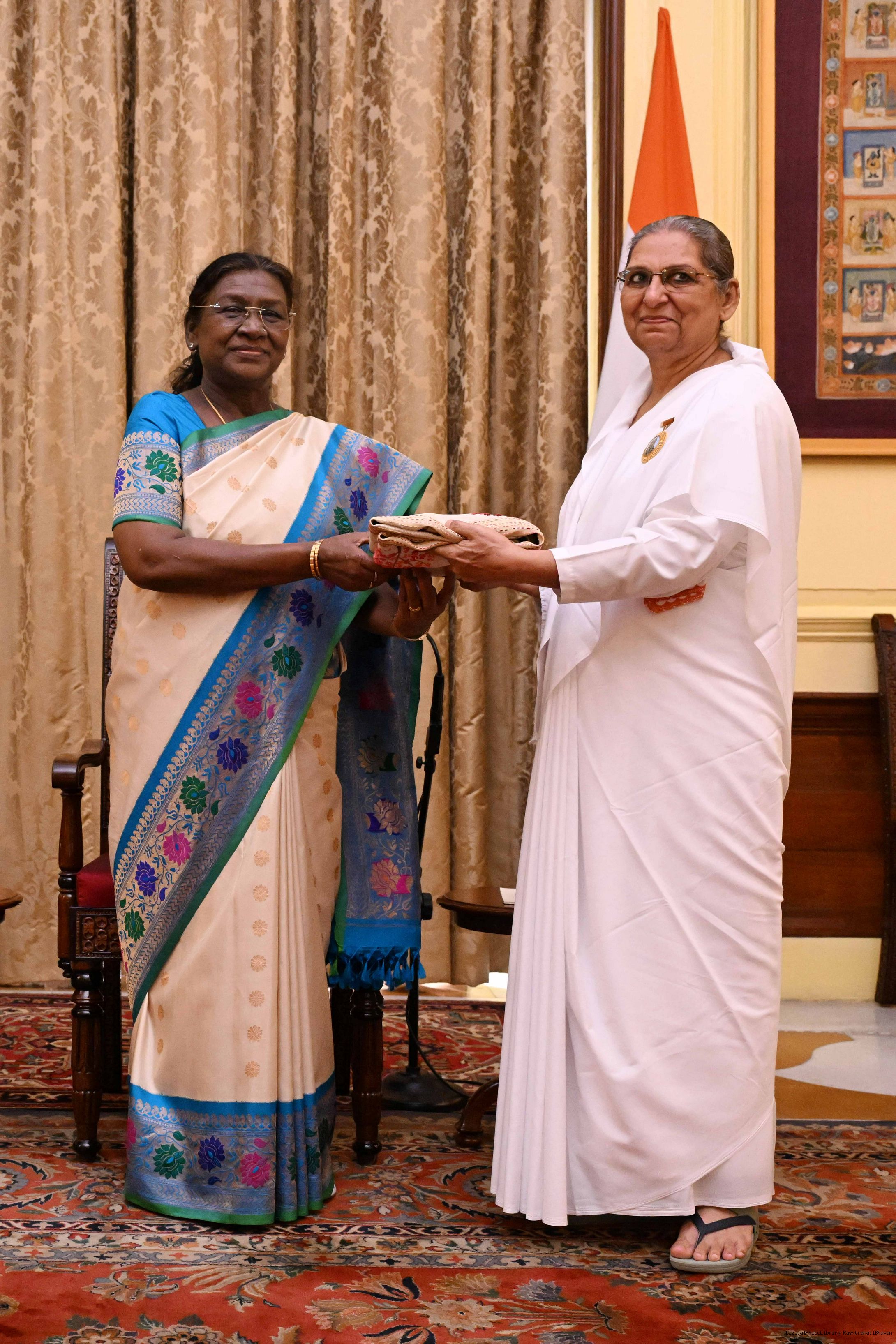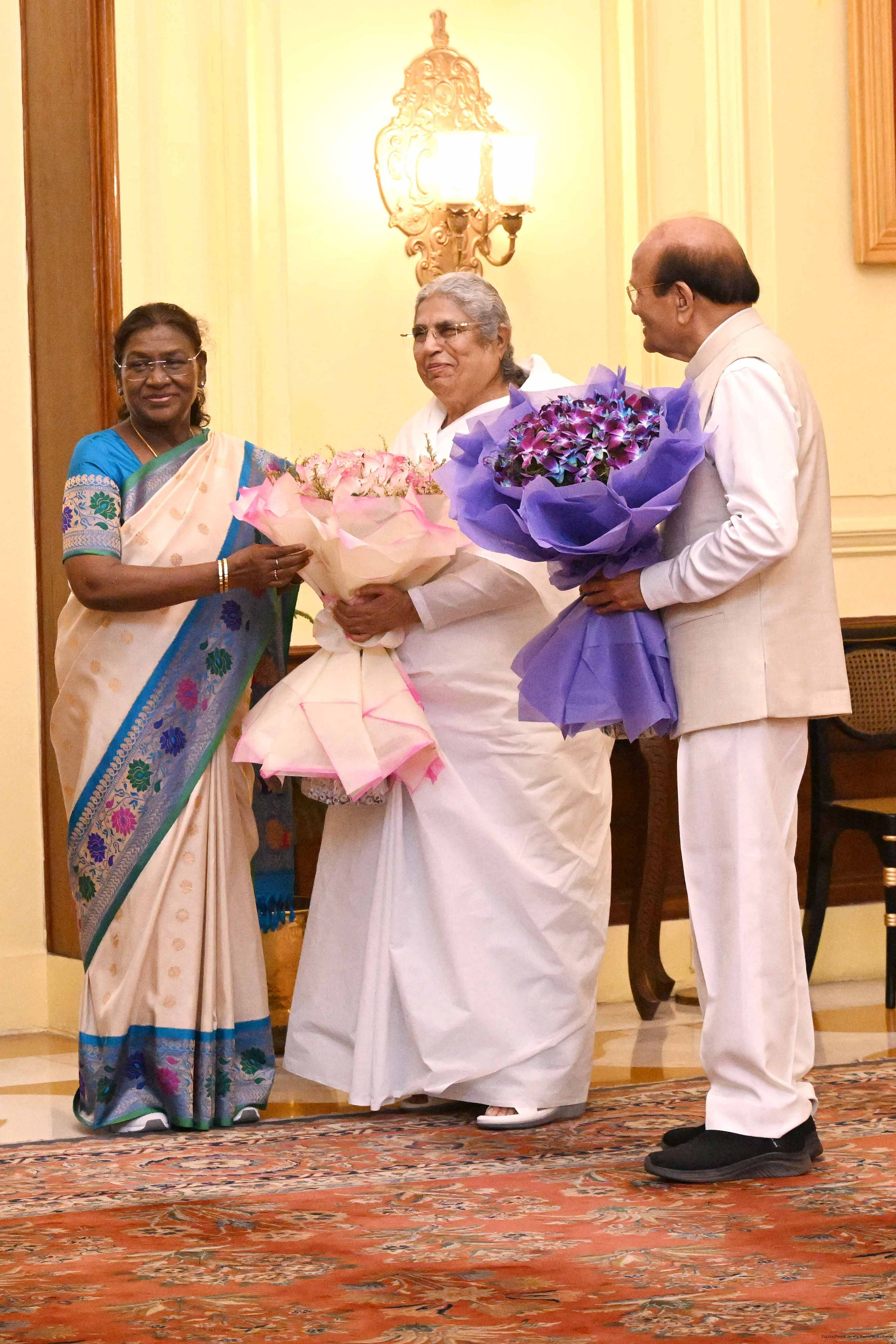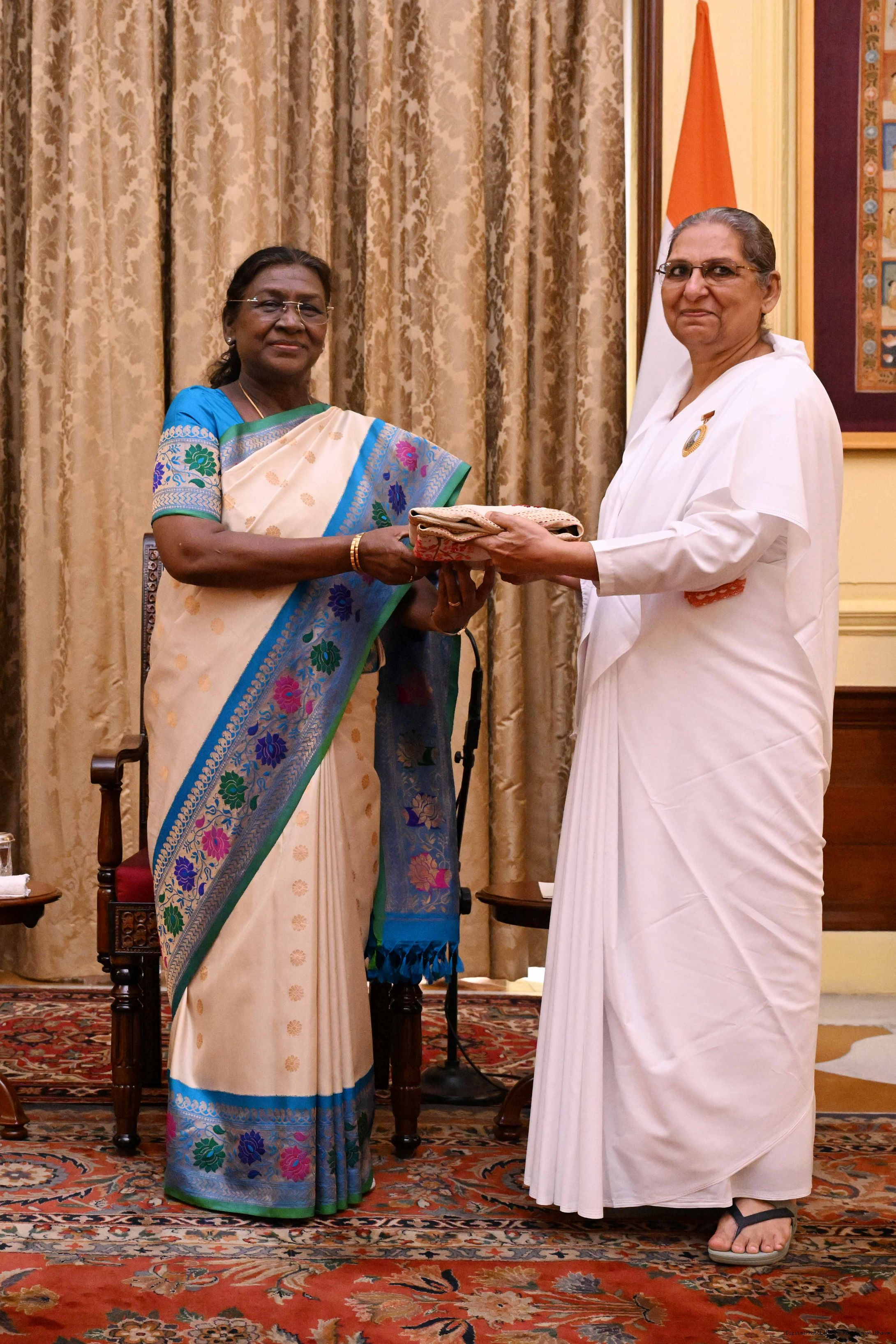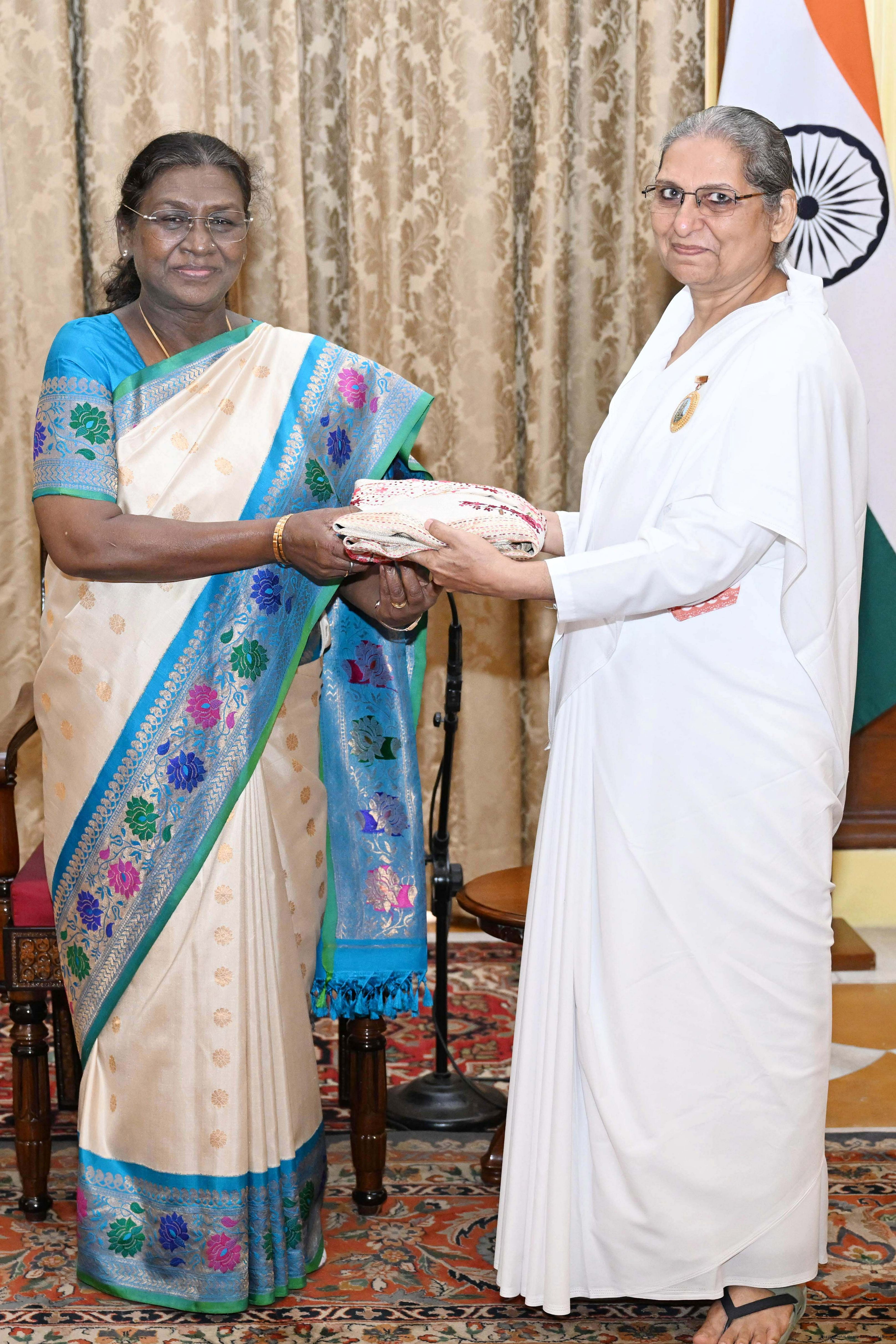 | Caption: | The President of India, Smt. Droupadi Murmu interaction with a group of 37 persons consisting of BK Asha, Member, Management Committee of Brahma Kumaris, Mount Abu and Direcotr of BK Centers at Rashtrapati Bhavan on September 18, 2025. |