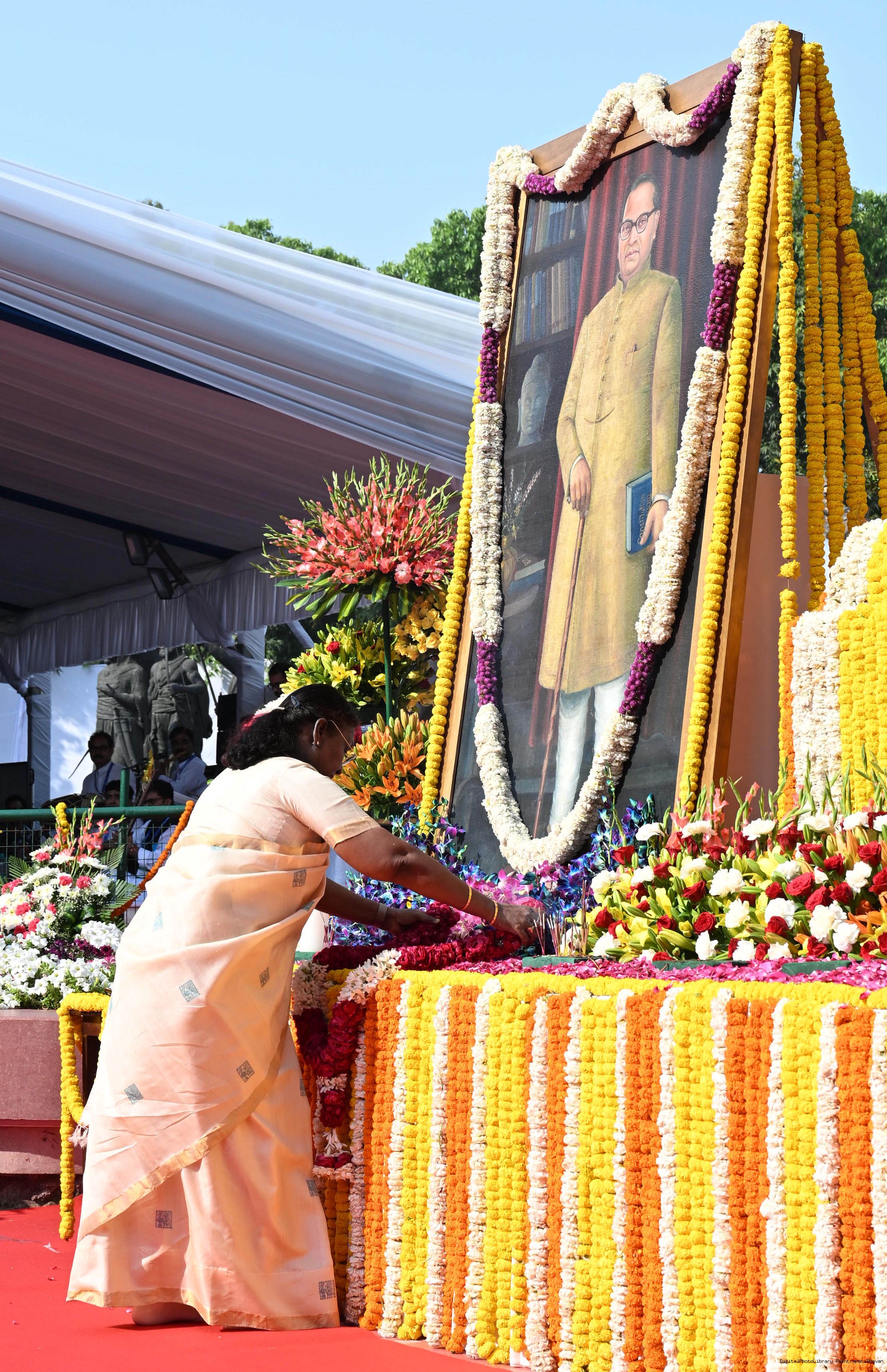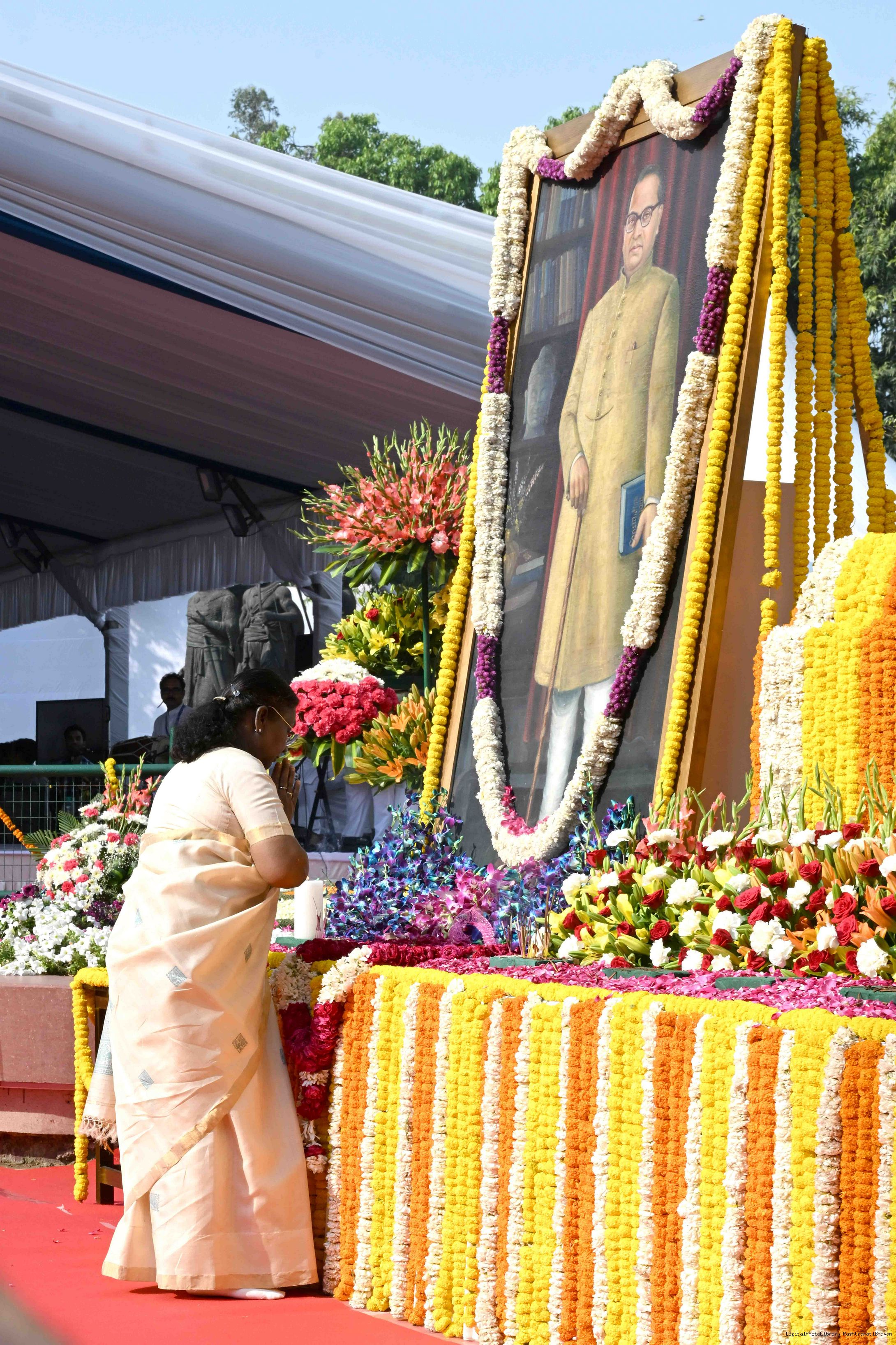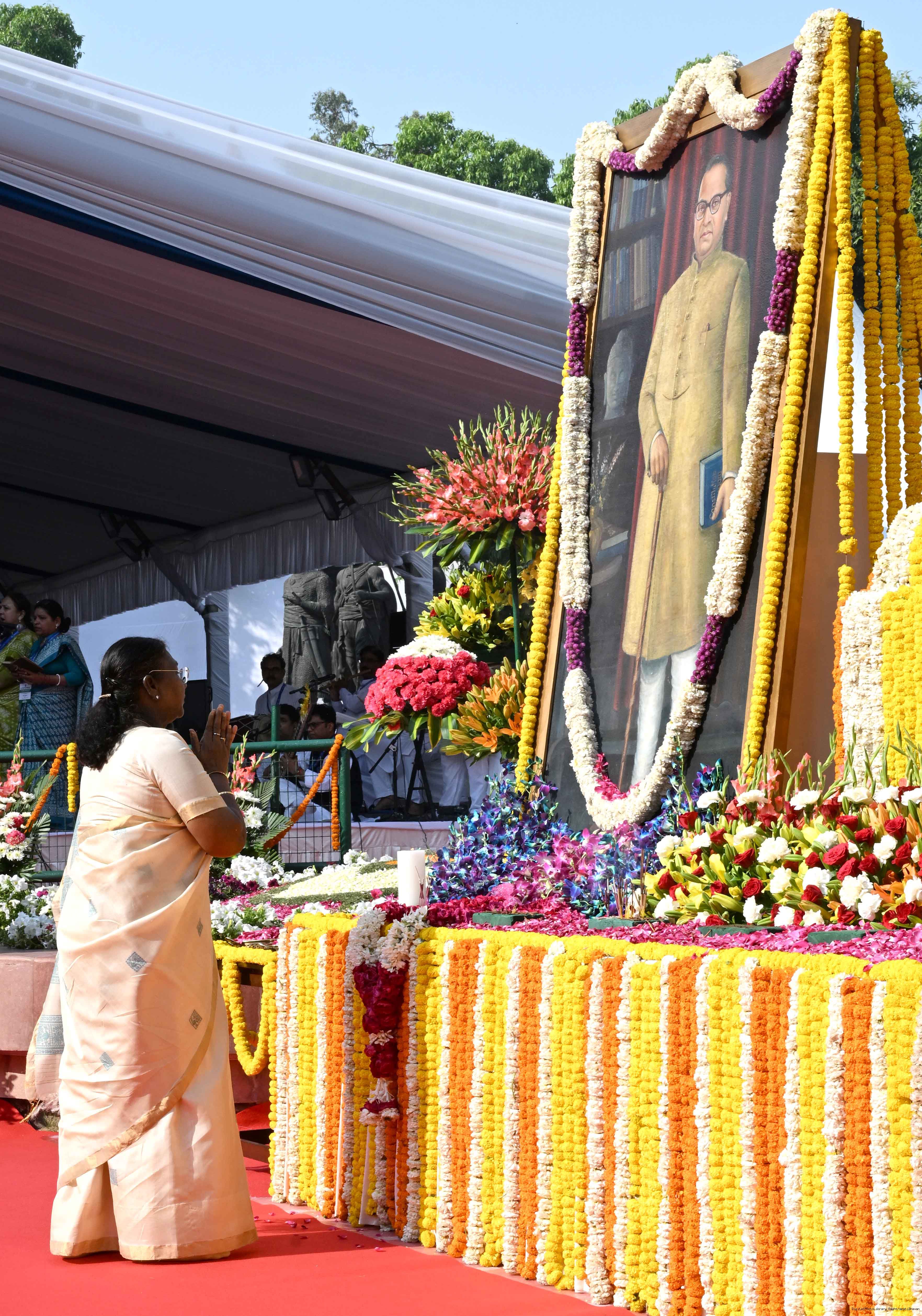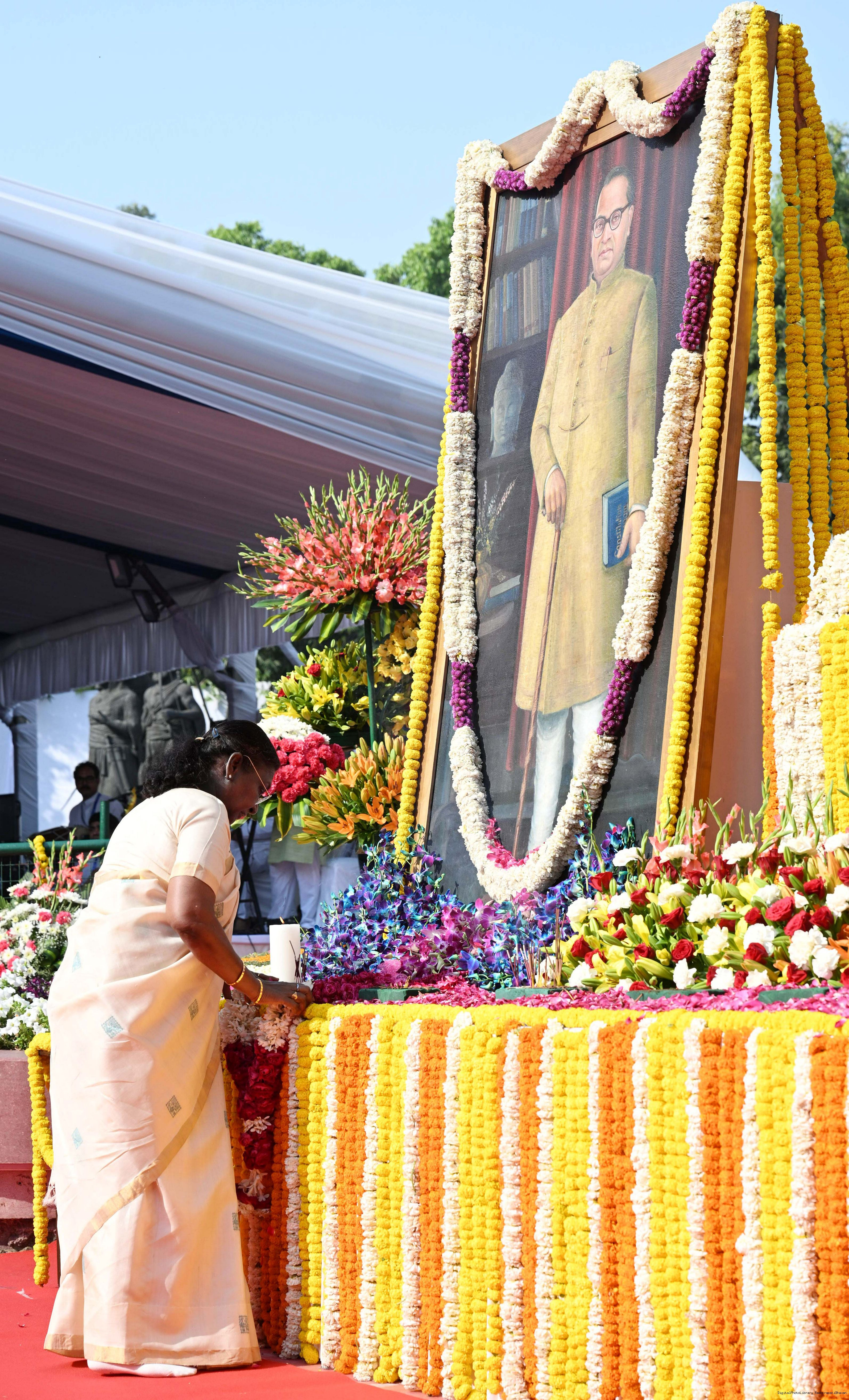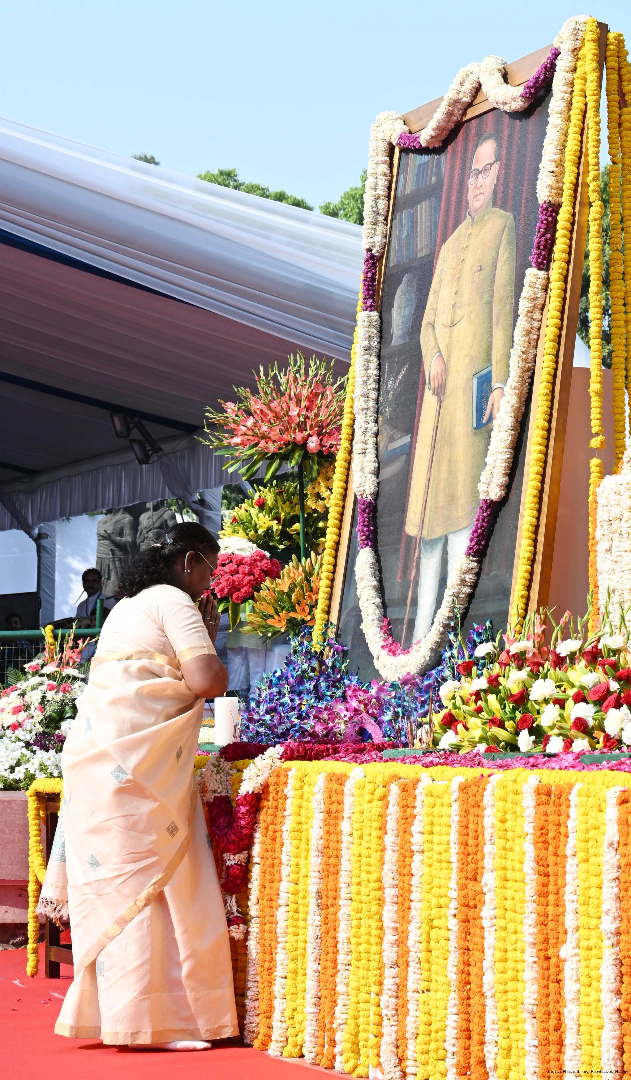 | Caption: | The President of India, Smt. Droupadi Murmu paid floral tributes to Babasaheb Dr B.R. Ambedkar on his birth anniversary at Prerna Sthal, Samvidhan Sadan in New Delhi on April 14, 2025. |