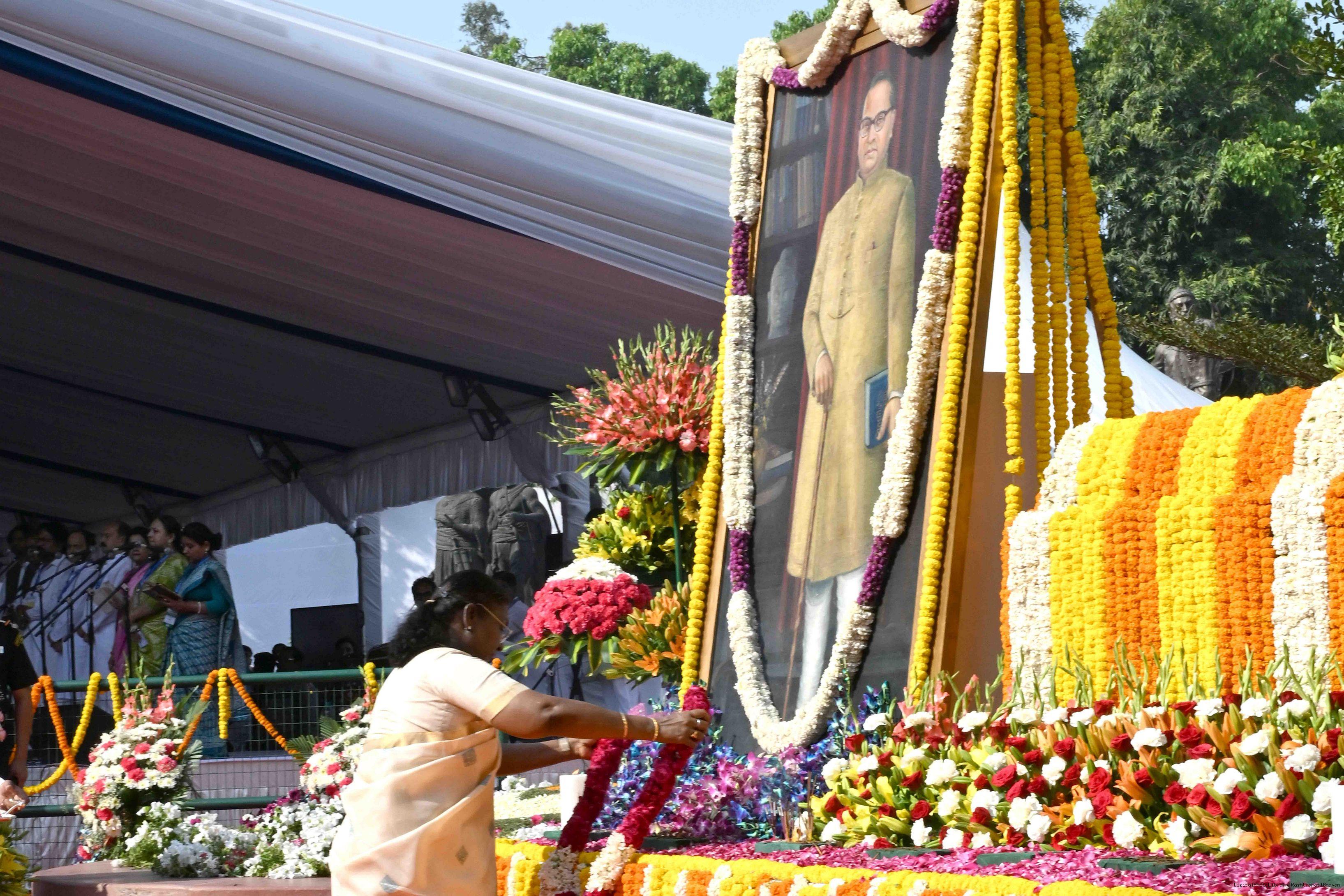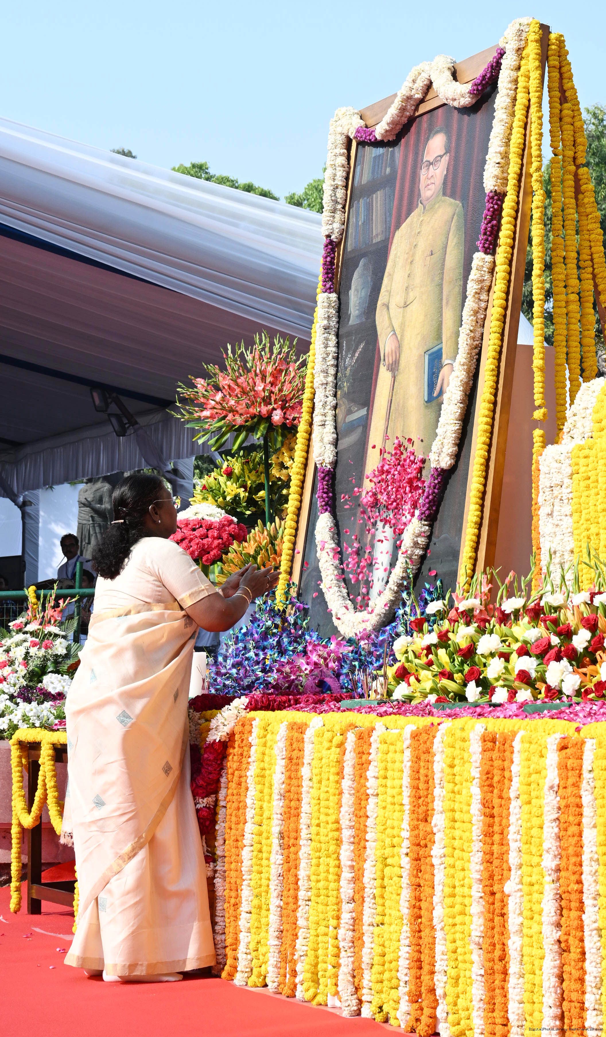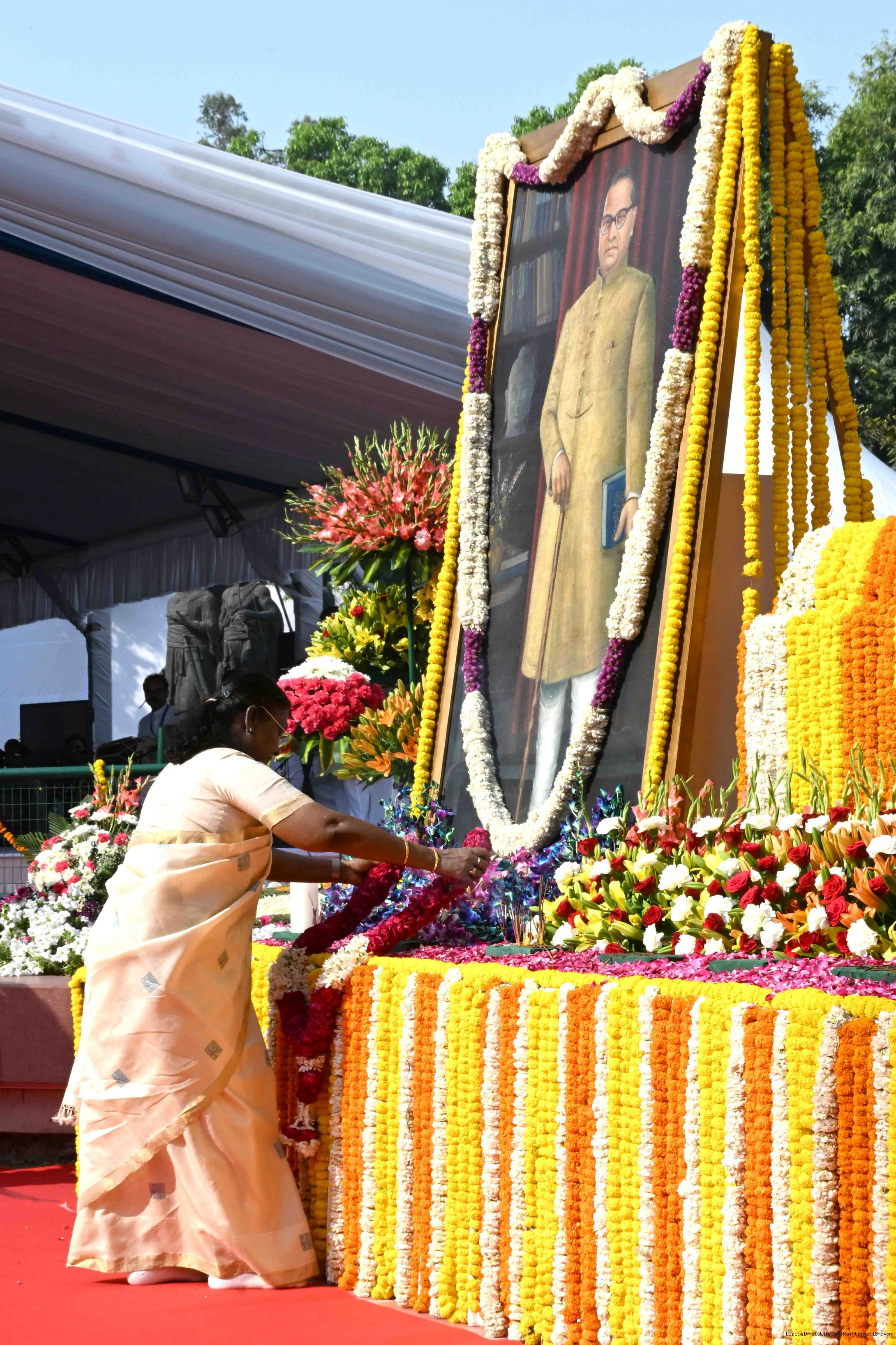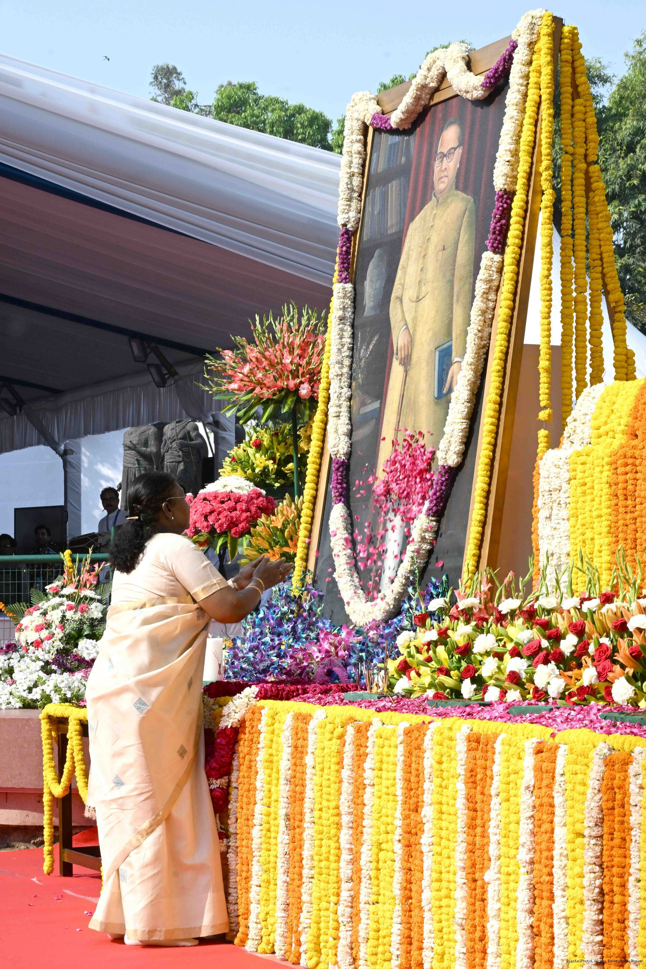 | Caption: | The President of India, Smt. Droupadi Murmu paid floral tributes to Babasaheb Dr B.R. Ambedkar on his birth anniversary at Prerna Sthal, Samvidhan Sadan in New Delhi on April 14, 2025. |
