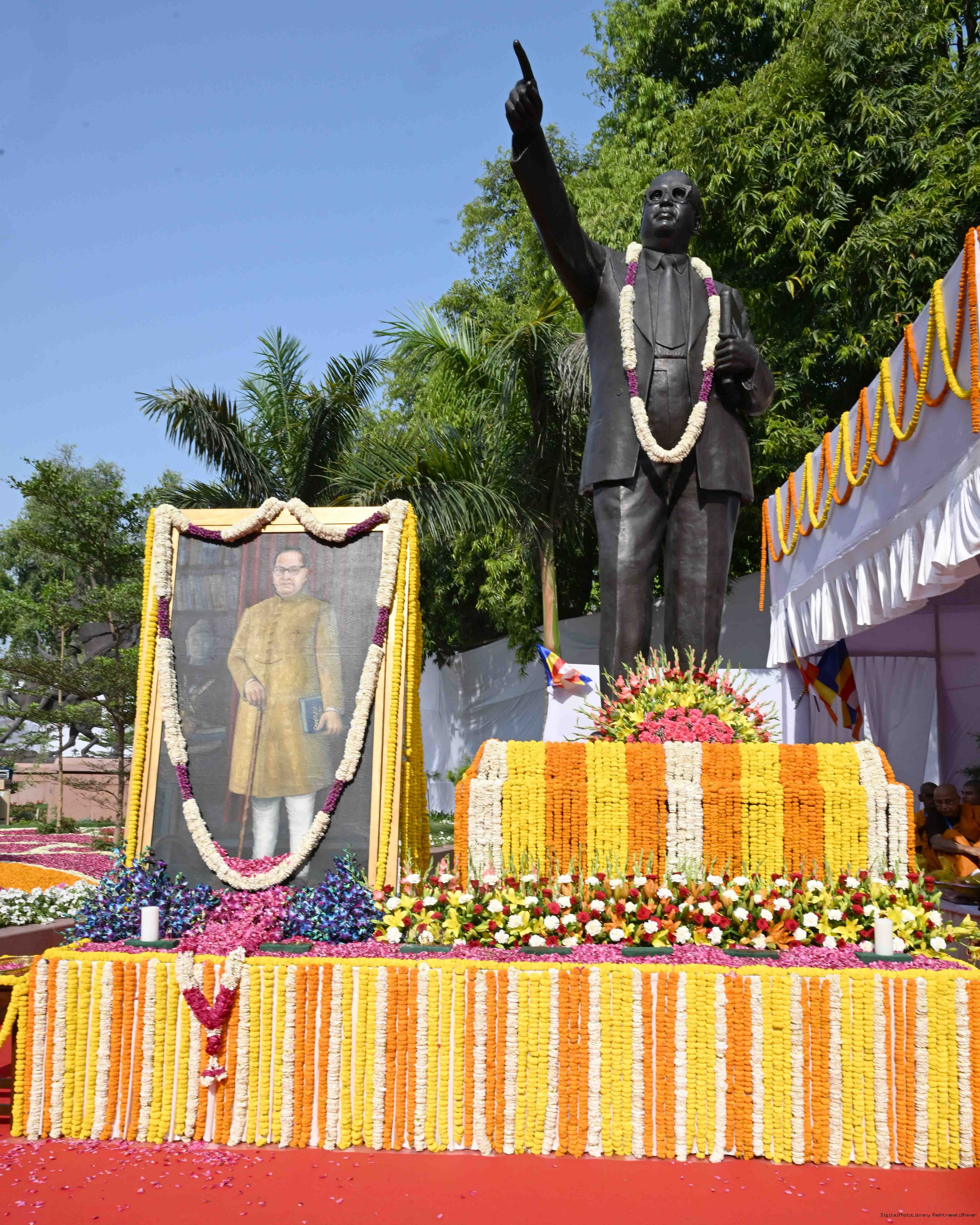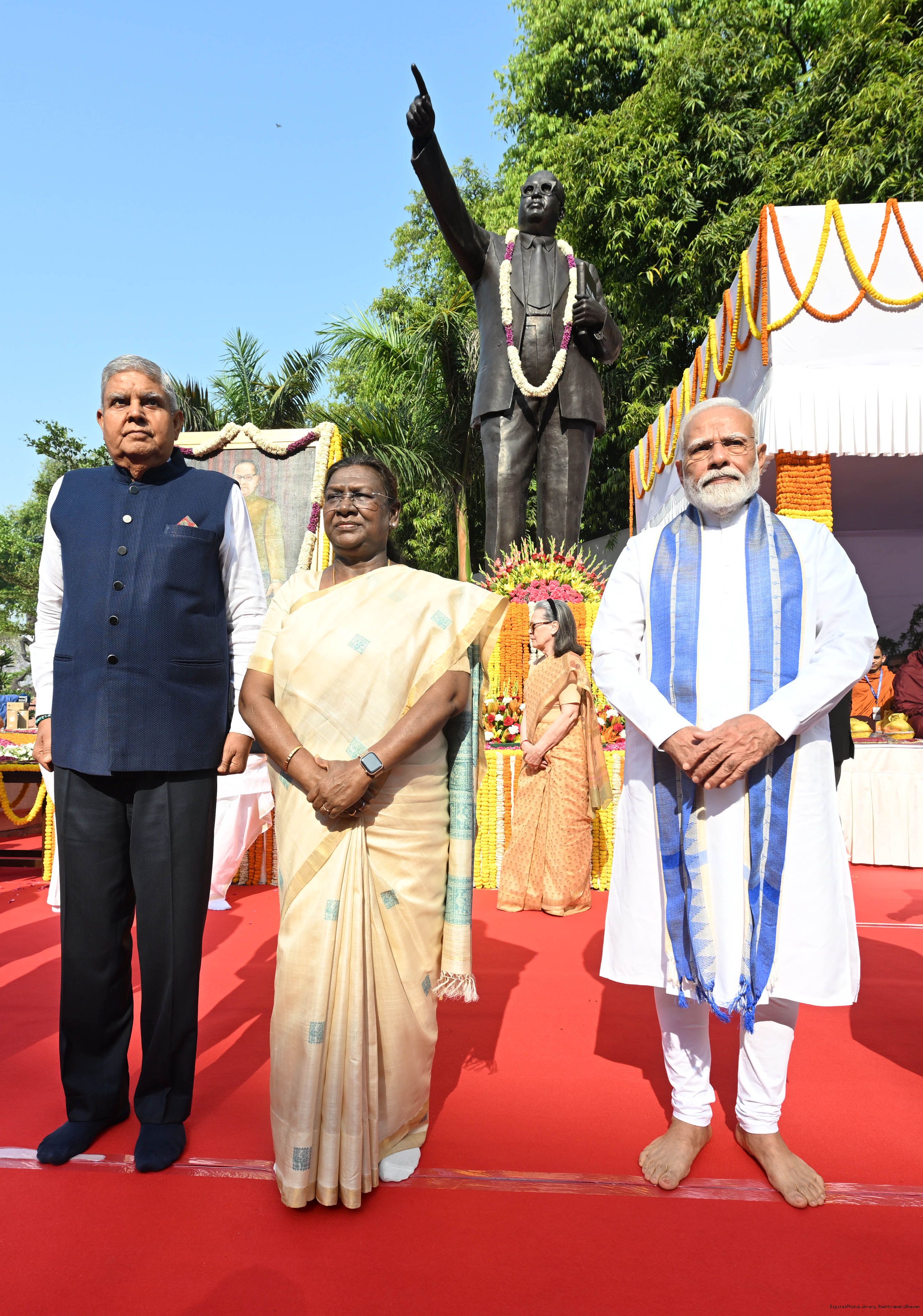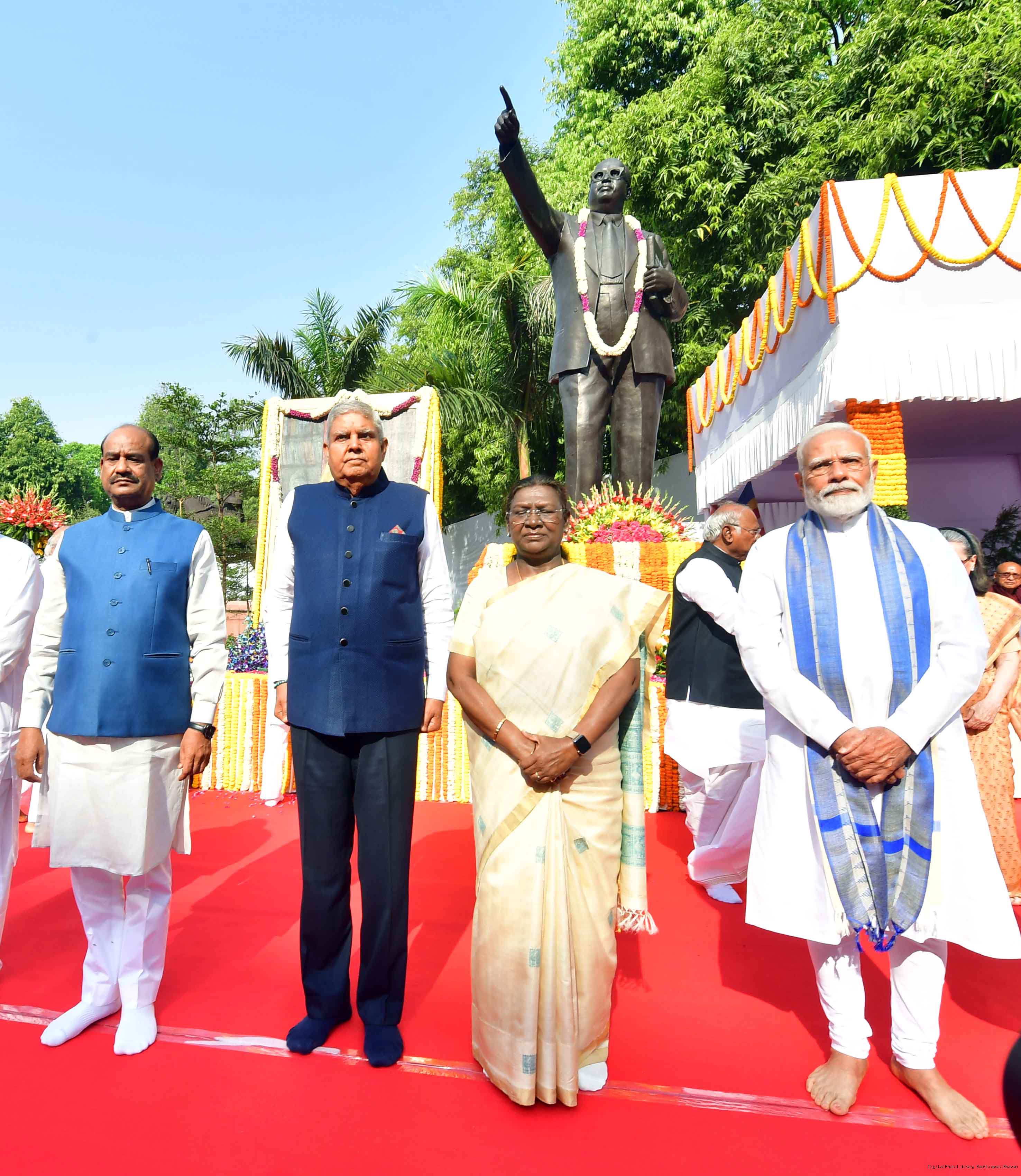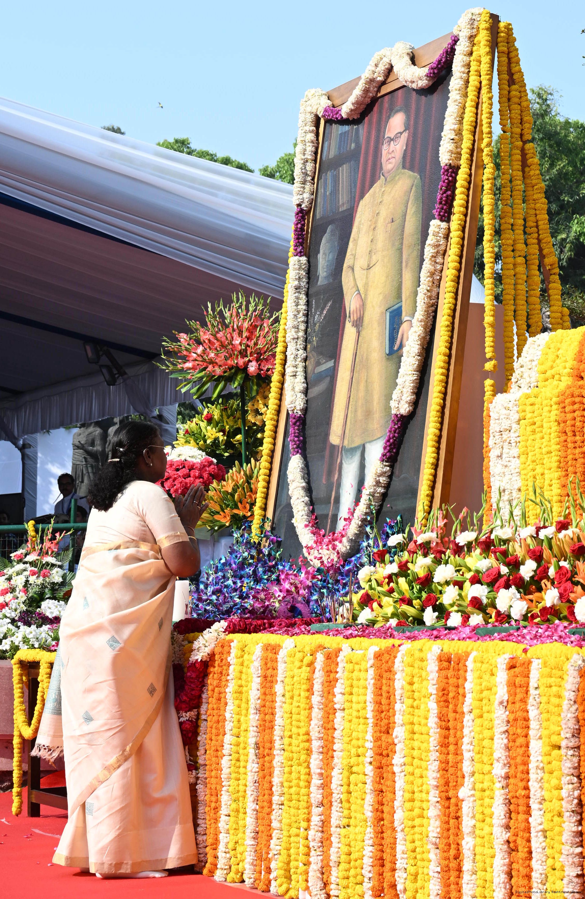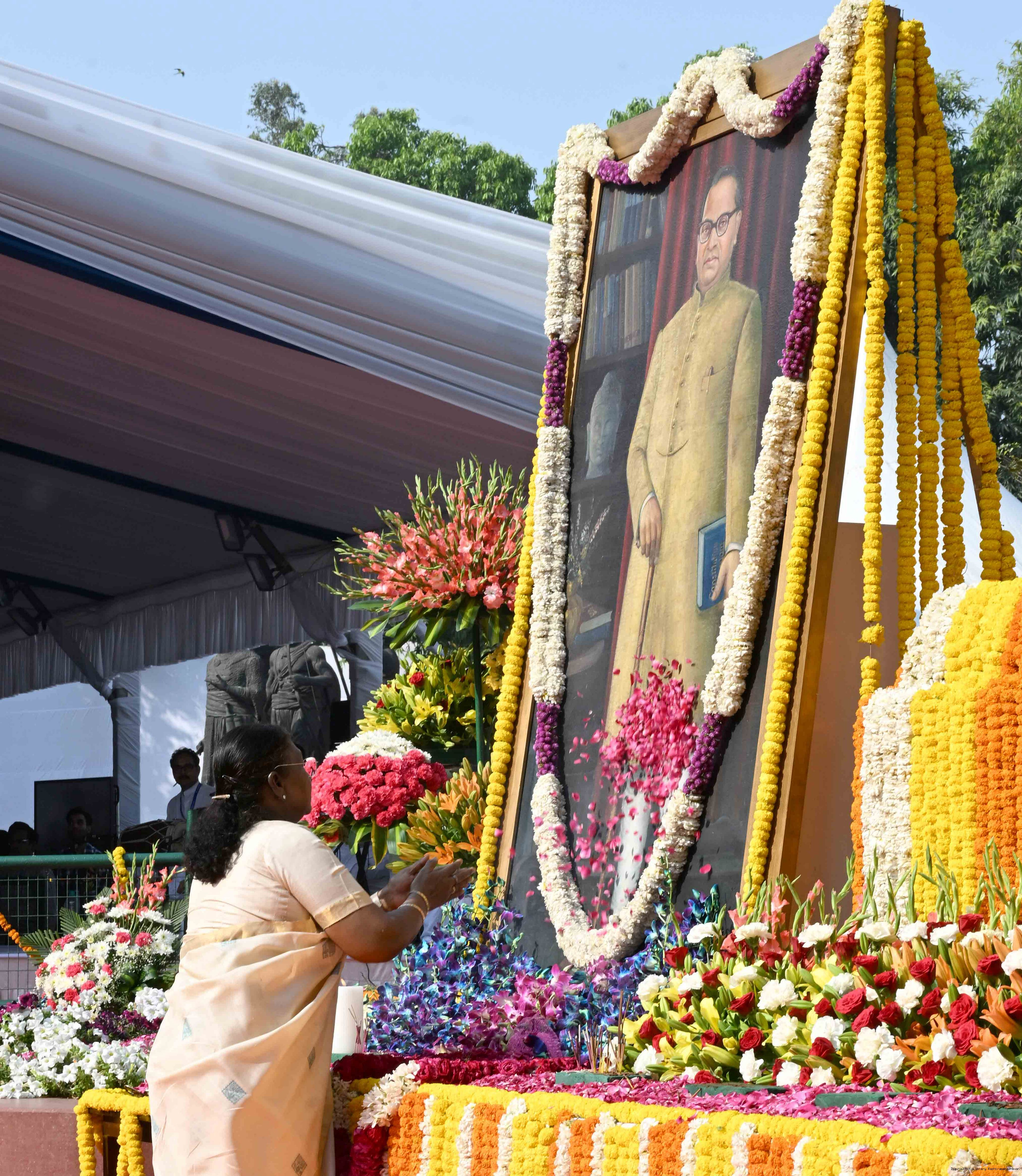 | Caption: | The President of India, Smt. Droupadi Murmu paid floral tributes to Babasaheb Dr B.R. Ambedkar on his birth anniversary at Prerna Sthal, Samvidhan Sadan in New Delhi on April 14, 2025. |