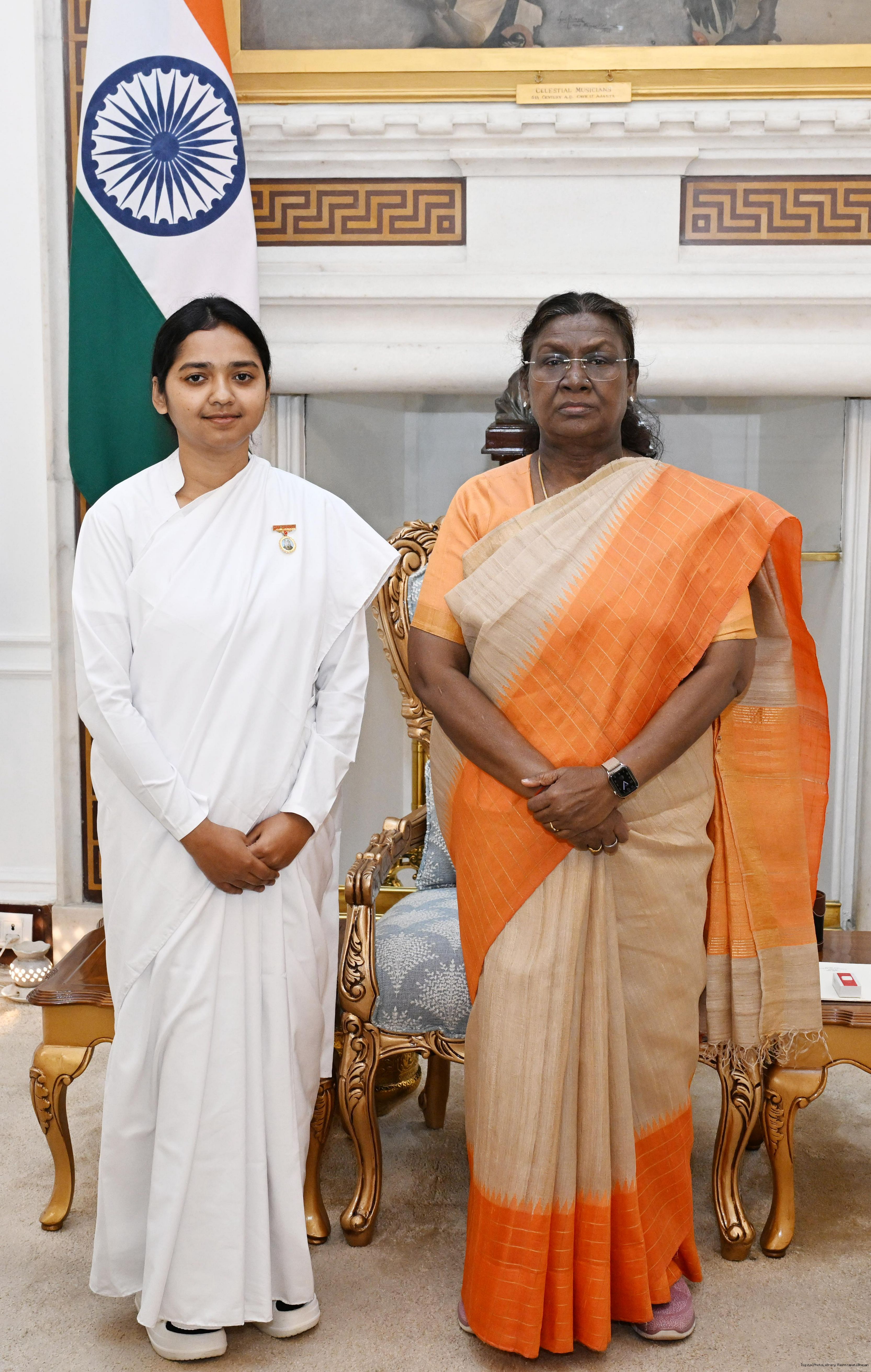 | Caption: | BK Salma Hansdah from Badampahar, Rairangpur, Odisha meeting with the President of India, Smt. Droupadi Murmu at Rashtrapati Bhavan on April 21, 2025. |