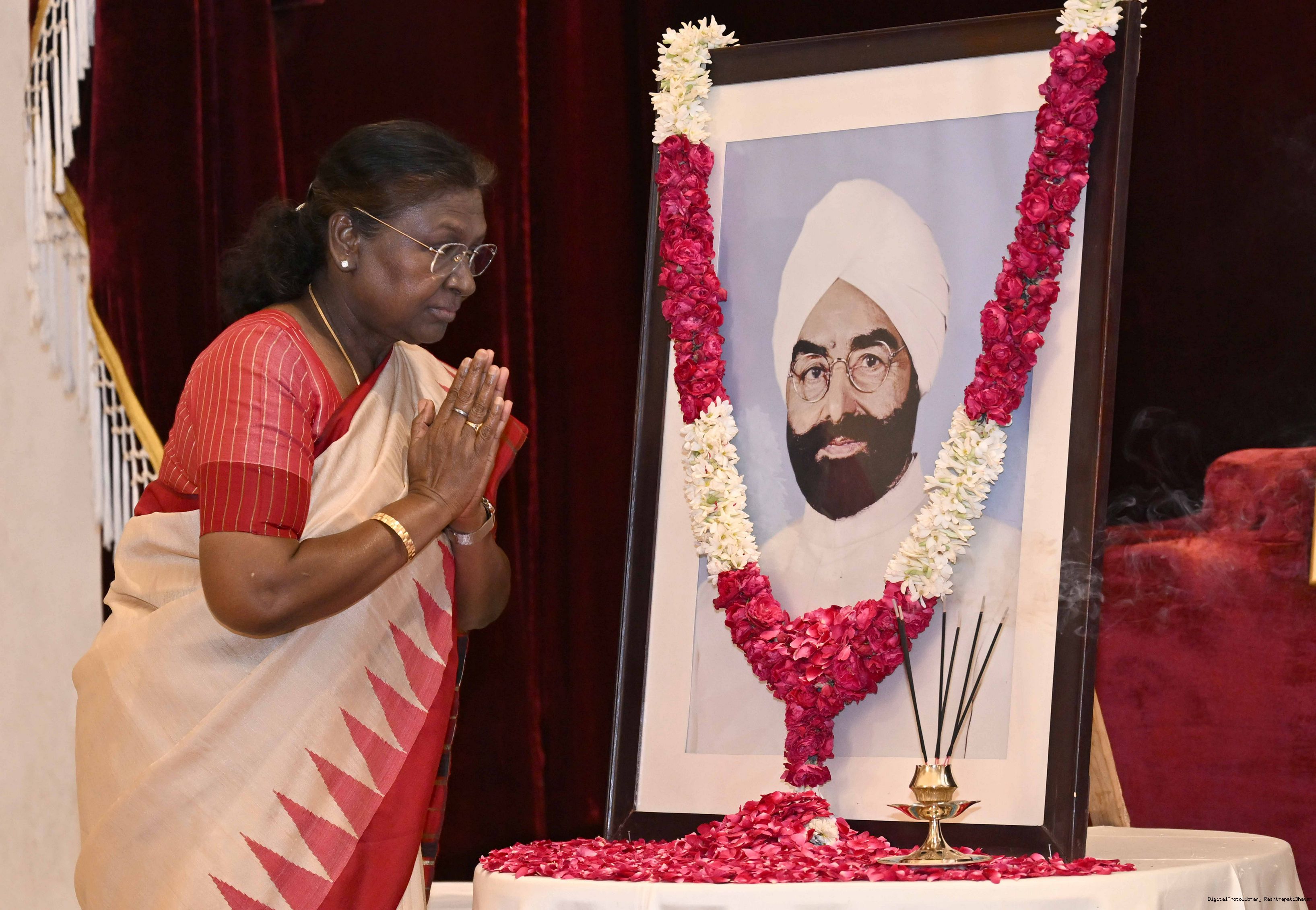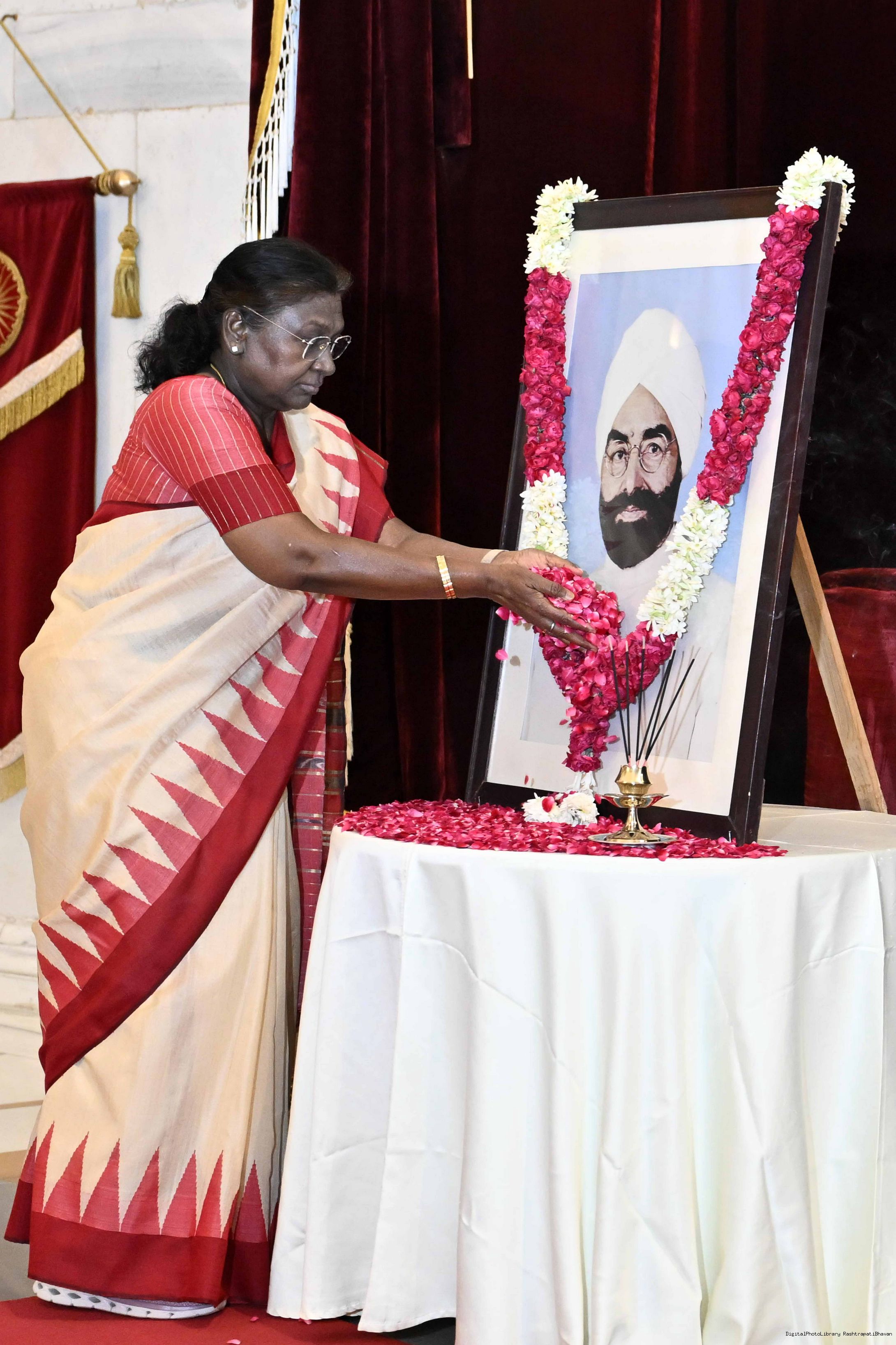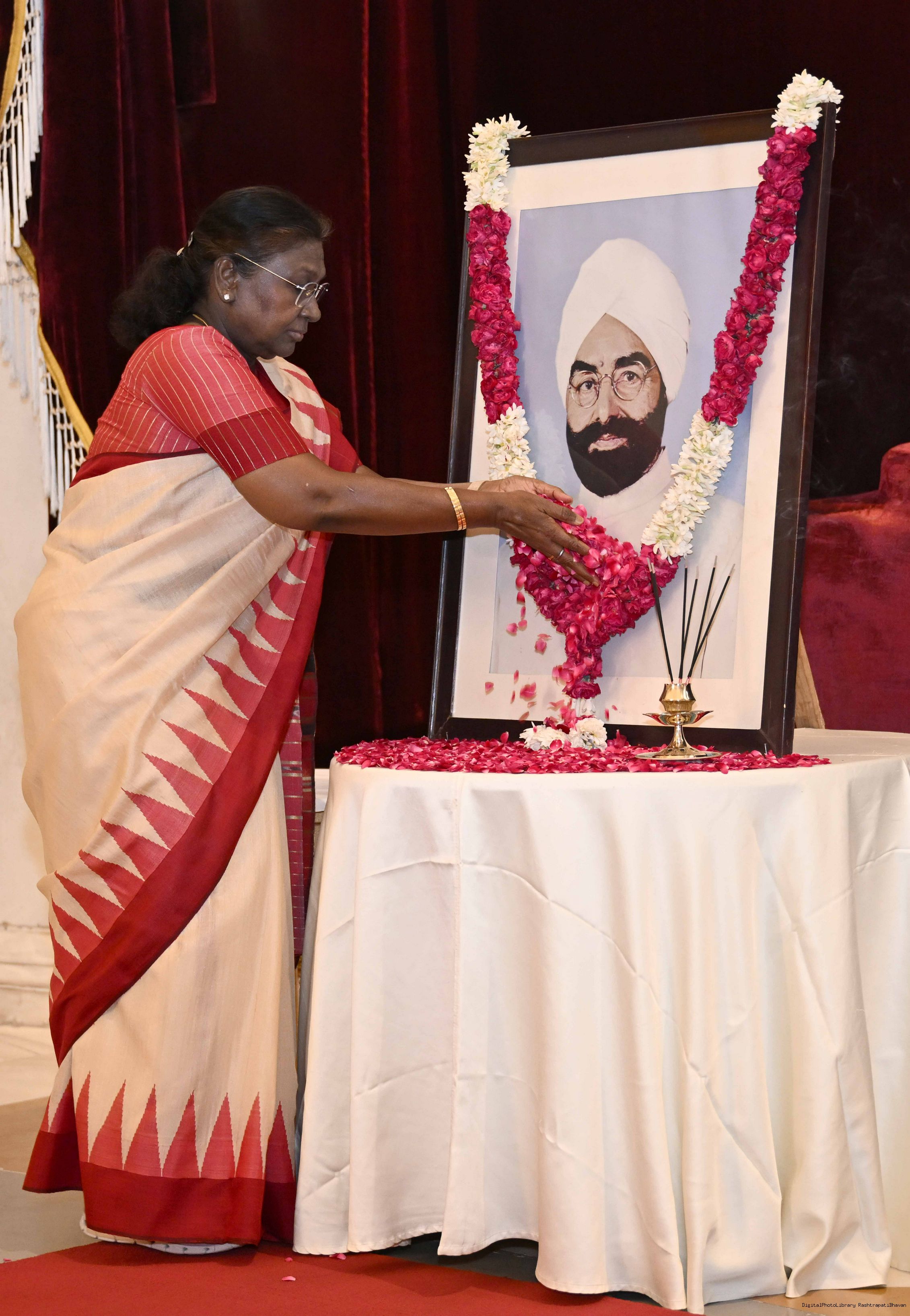 | Caption: | The President of India, Smt. Droupadi Murmu paid floral tributes to Giani Zail Singh, former President of India on his birth anniversary at Rashtrapati Bhavan on May 5, 2025. |