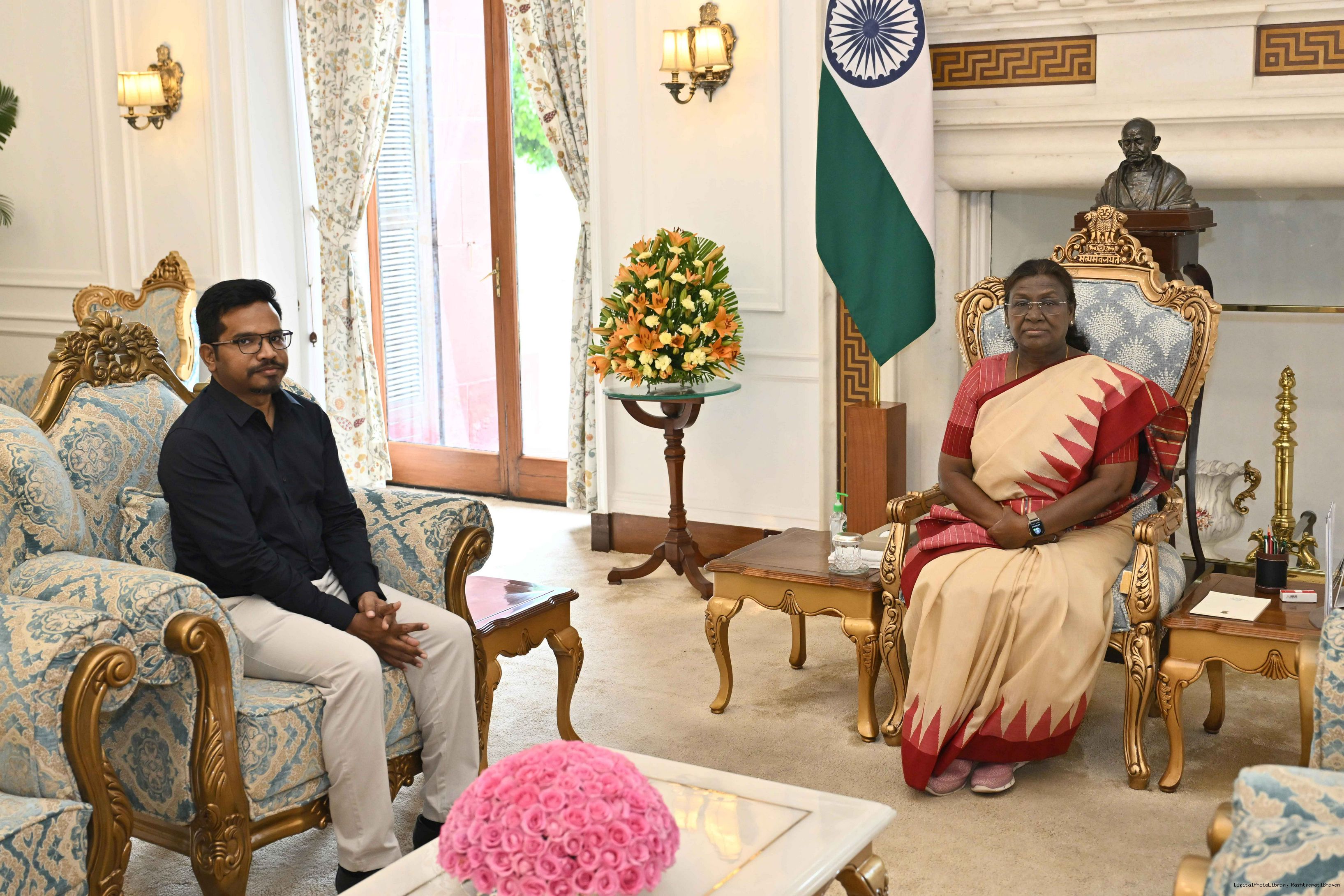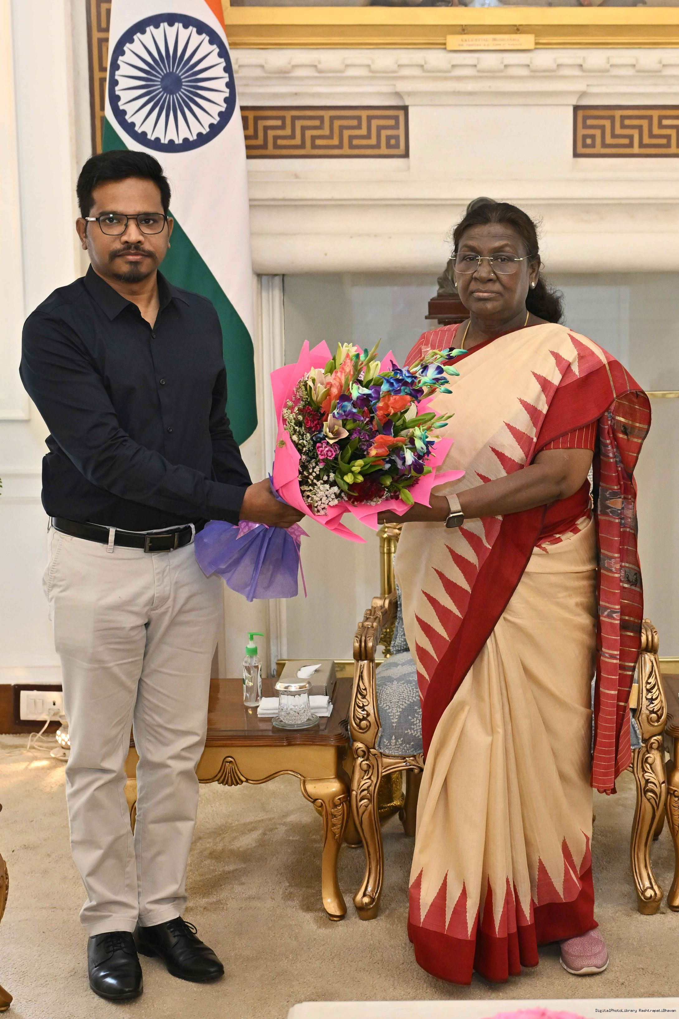 | Caption: | Dr. Anant Lal Murmu, Assistant Professor, Department of Civil Engineering, Netaji Subhas University of Technology, West Campus, New Delhi meeting with the President of India, Smt. Droupadi Murmu at Rashtrapati Bhavan on May May 5, 2025. |