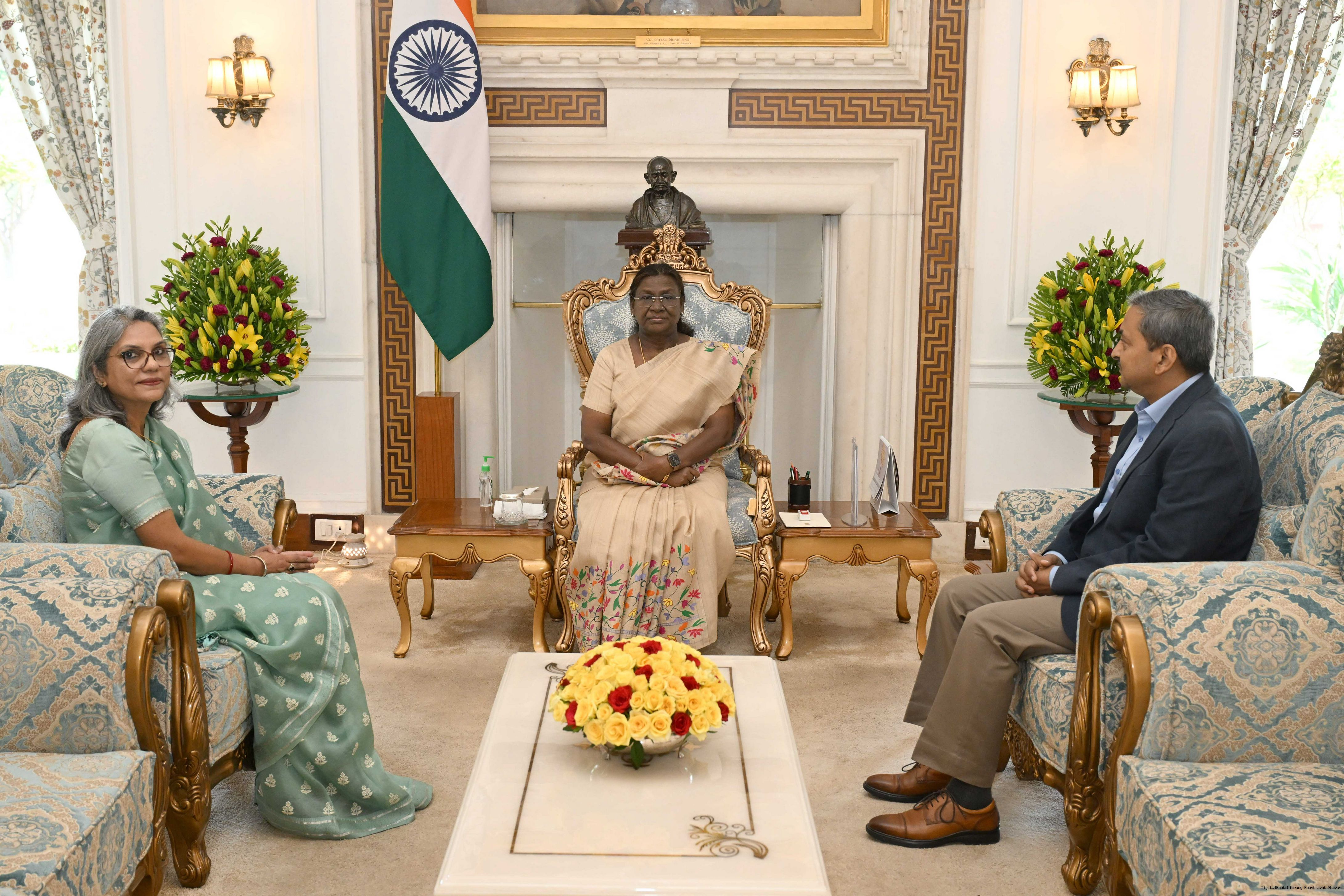 | Caption: | Ms. Anuradha Prasad, Member, Union Public Service Commission along with spouse Shri Sanjay Kumar meeting with the President of India, Smt. Droupadi Murmu at Rashtrapati Bhavan on May 9, 2025. |