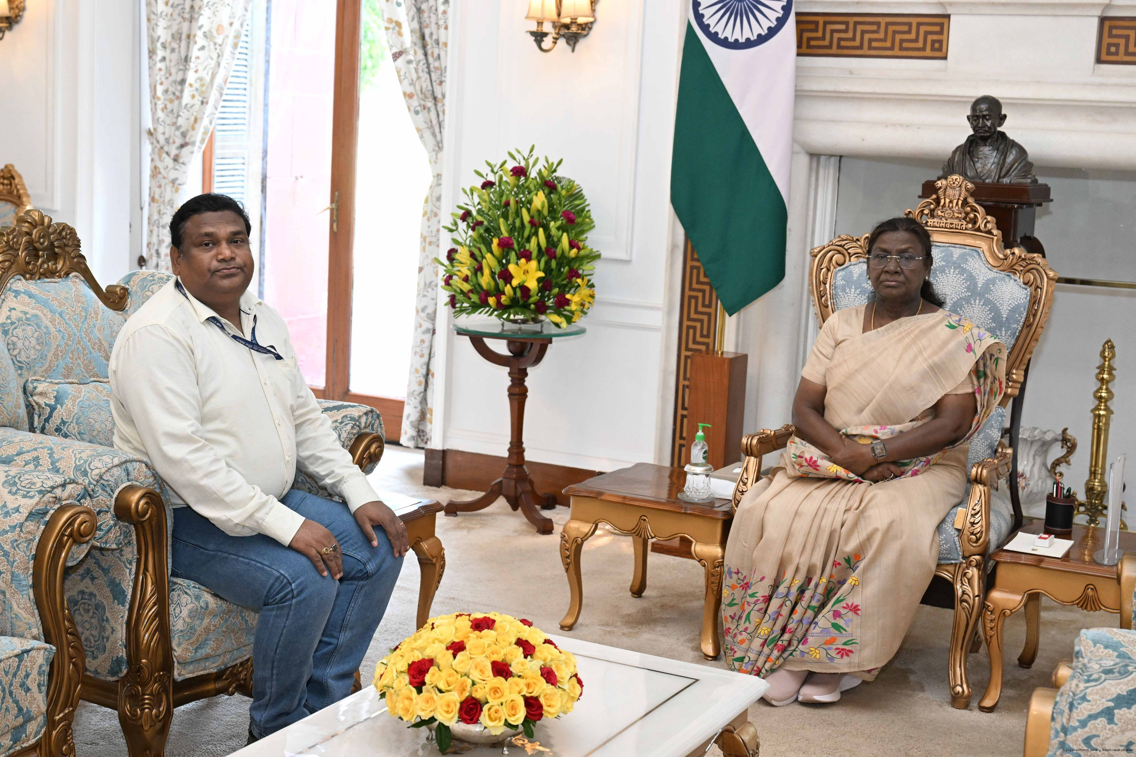 | Caption: | Shri Mahendra Nath Tudu from Kulaibera, Mayurbhanj, Odisha meeting with the President of India, Smt. Droupadi Murmu at Rashtrapati Bhavan on May 9, 2025. |