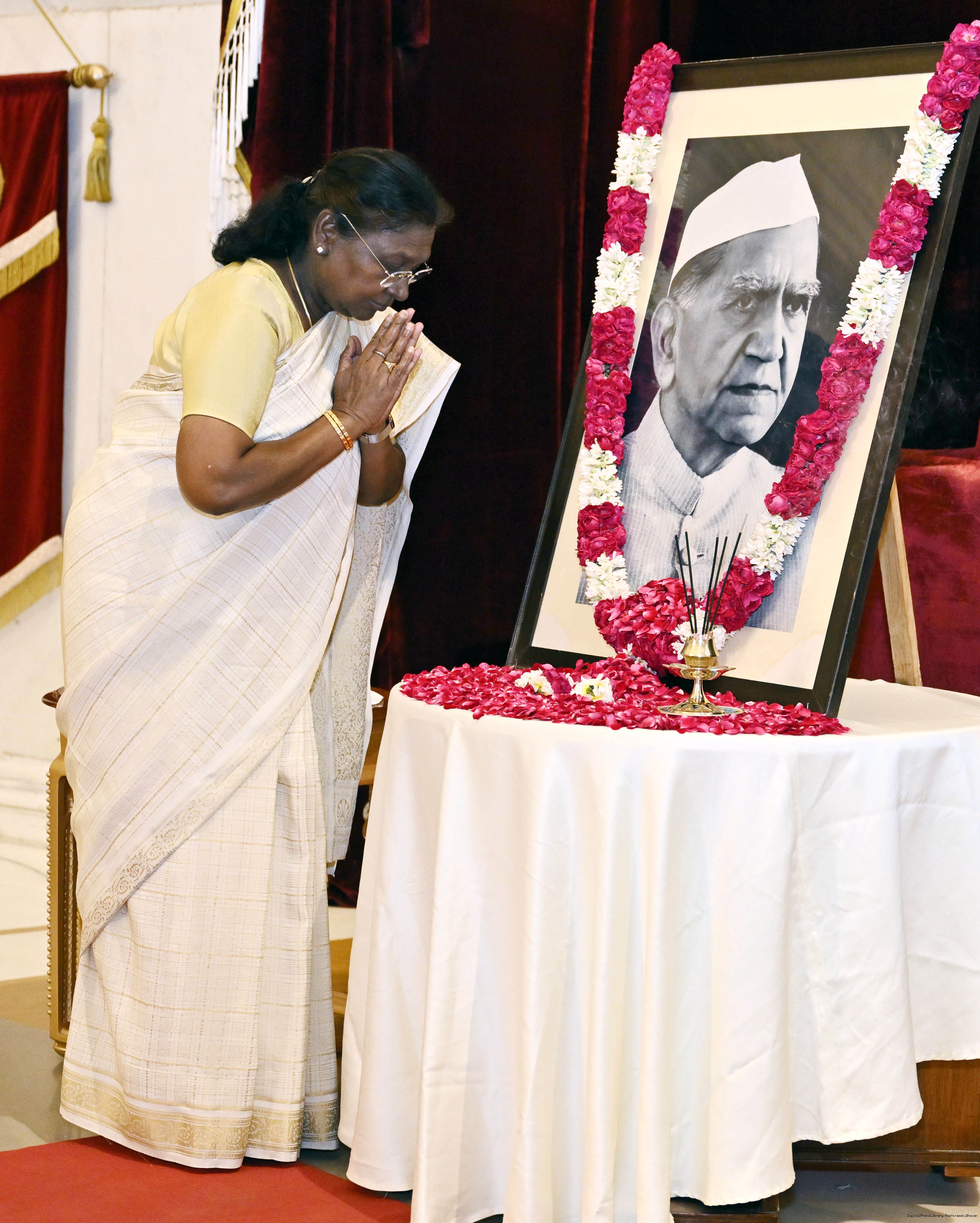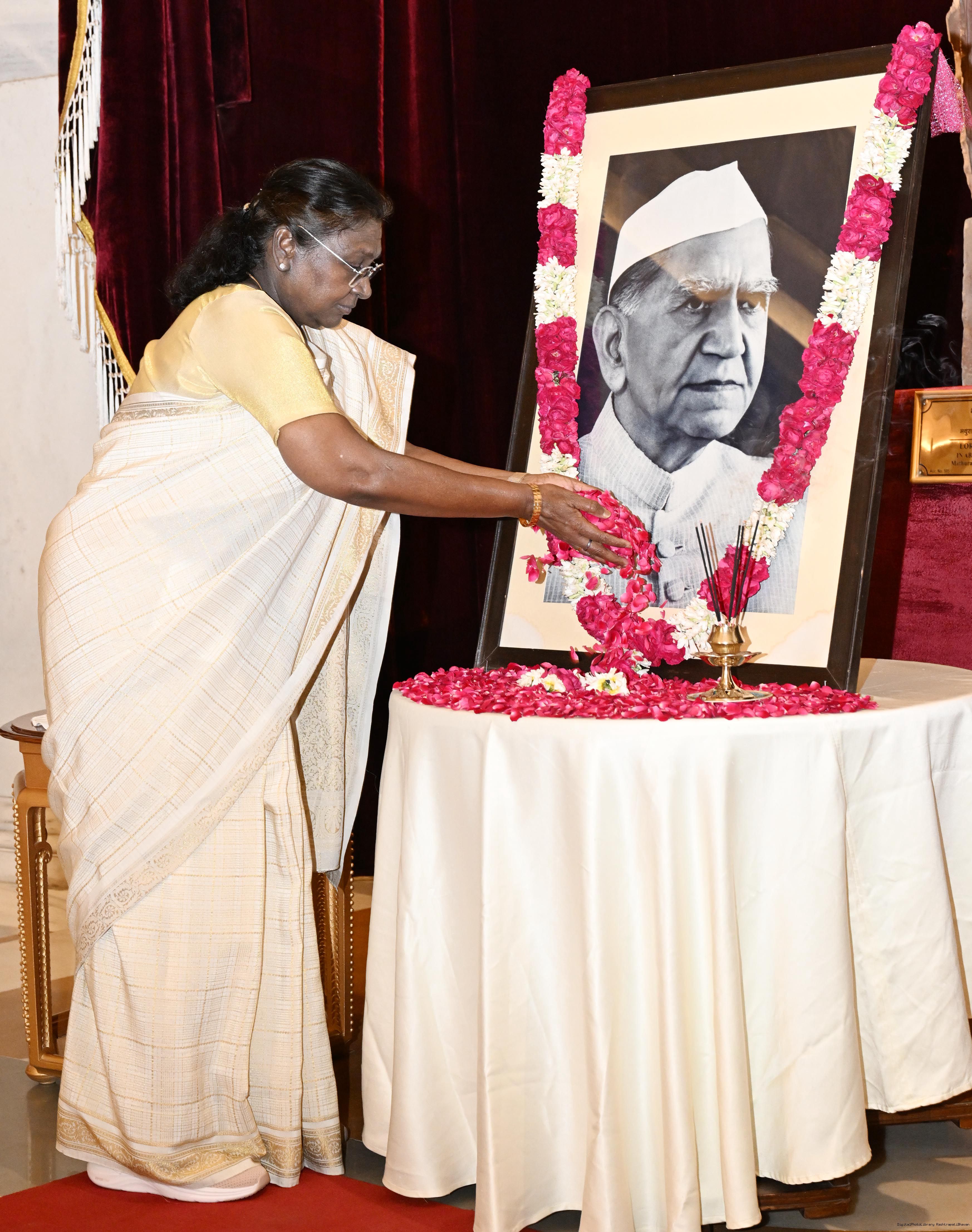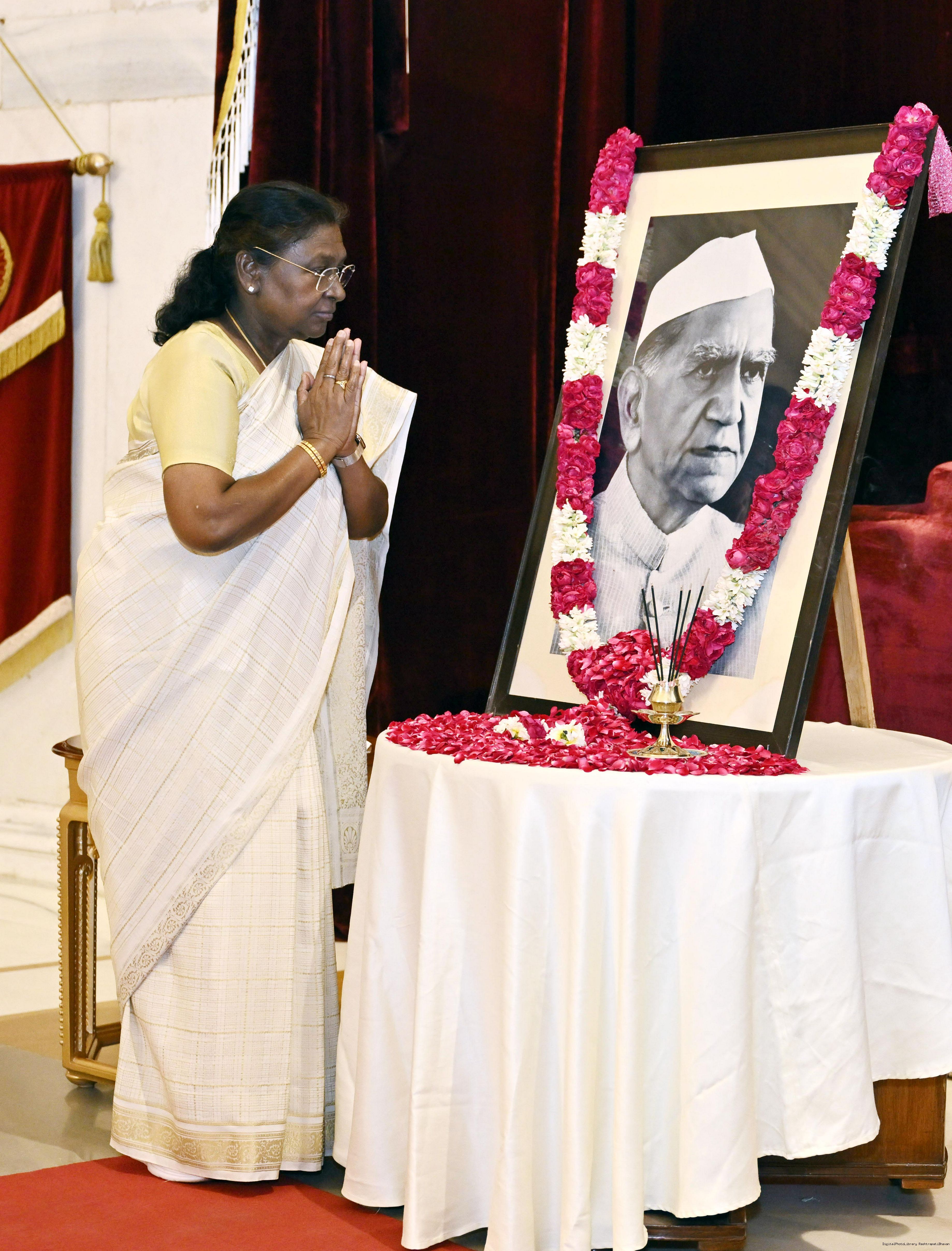 | Caption: | The President of India, Smt Droupadi Murmu paid floral tributes to Shri Fakhruddin Ali Ahmed, former President of India on his birth anniversary at Rashtrapati Bhavan on May 13, 2025. |