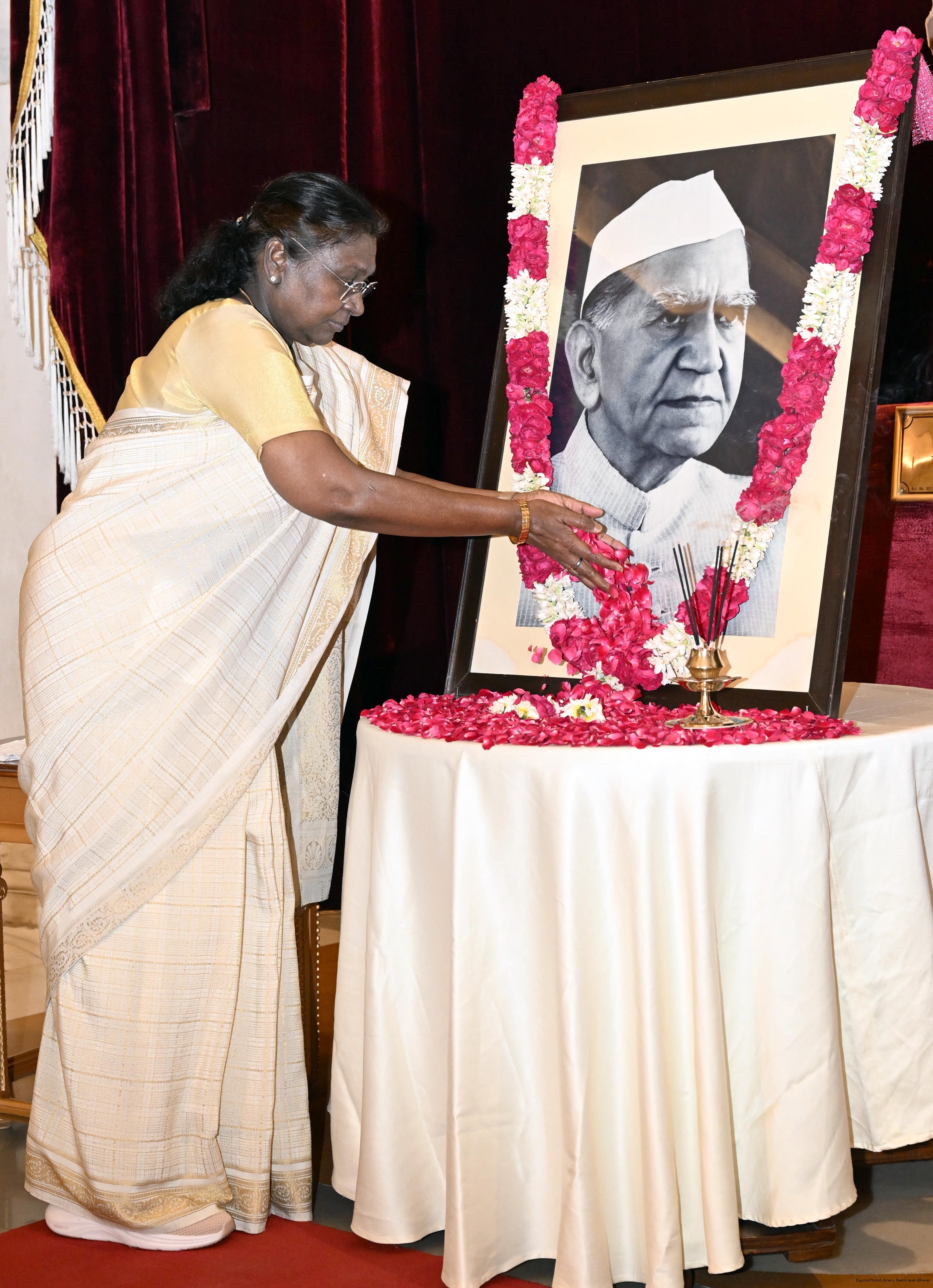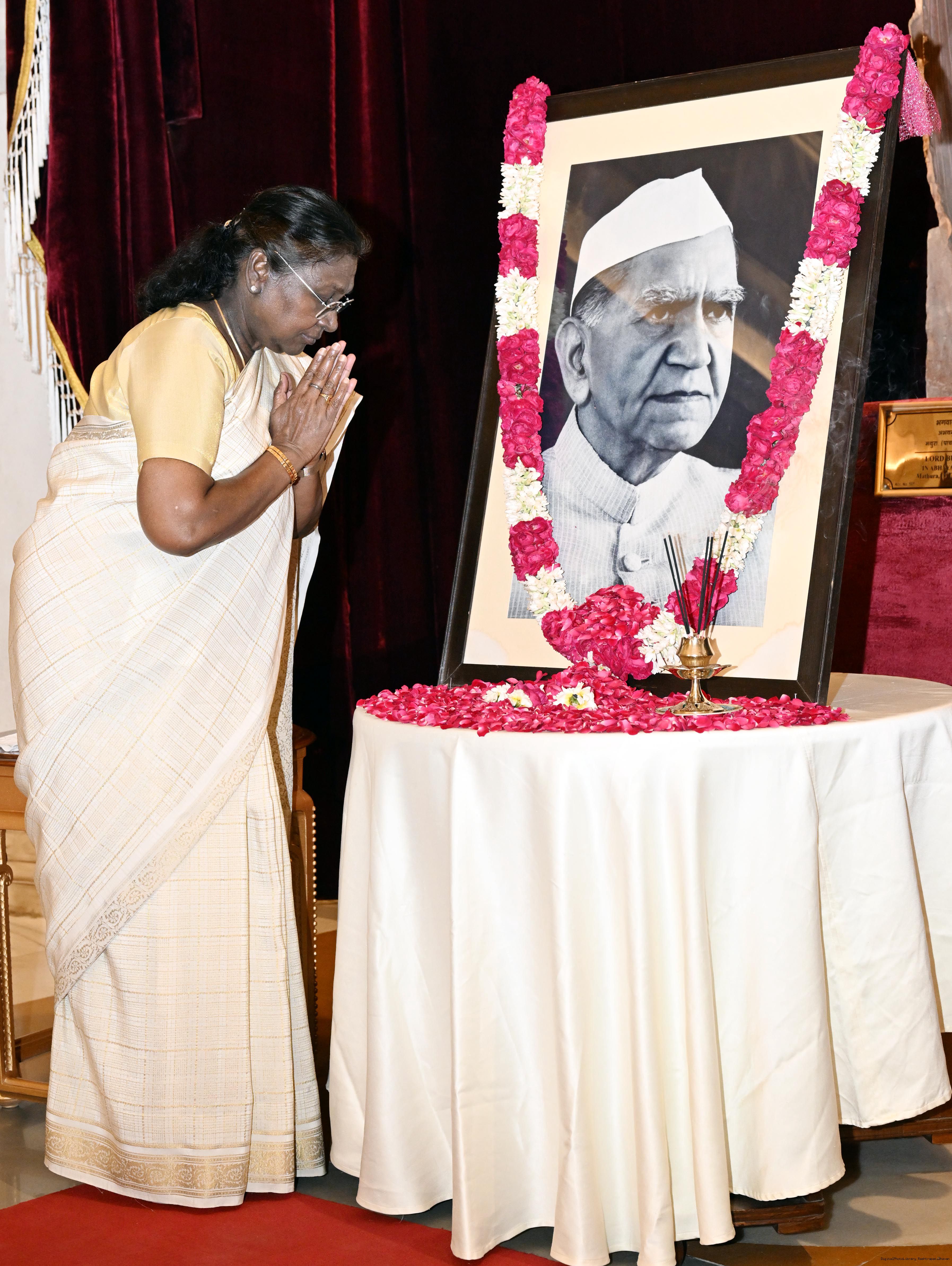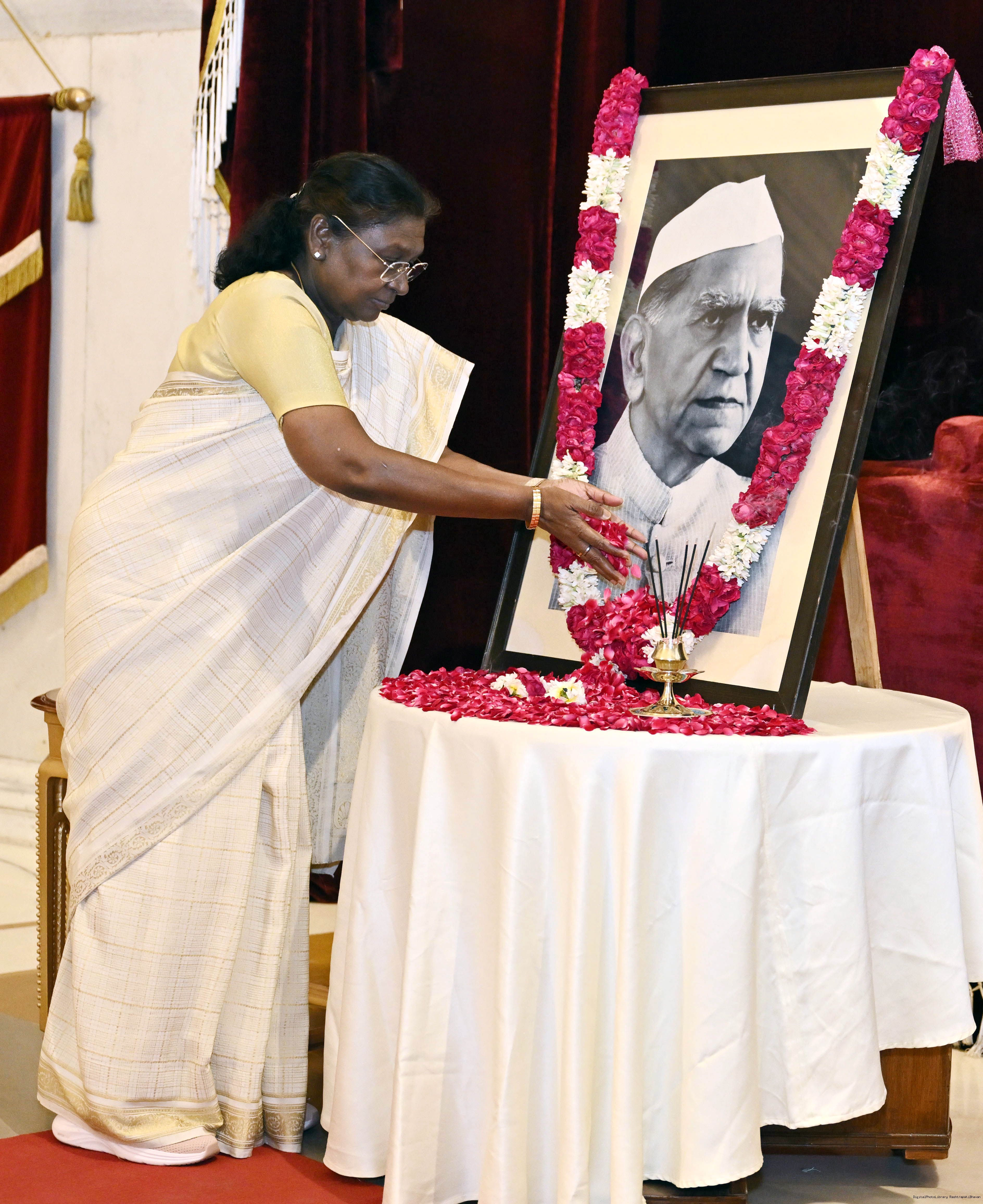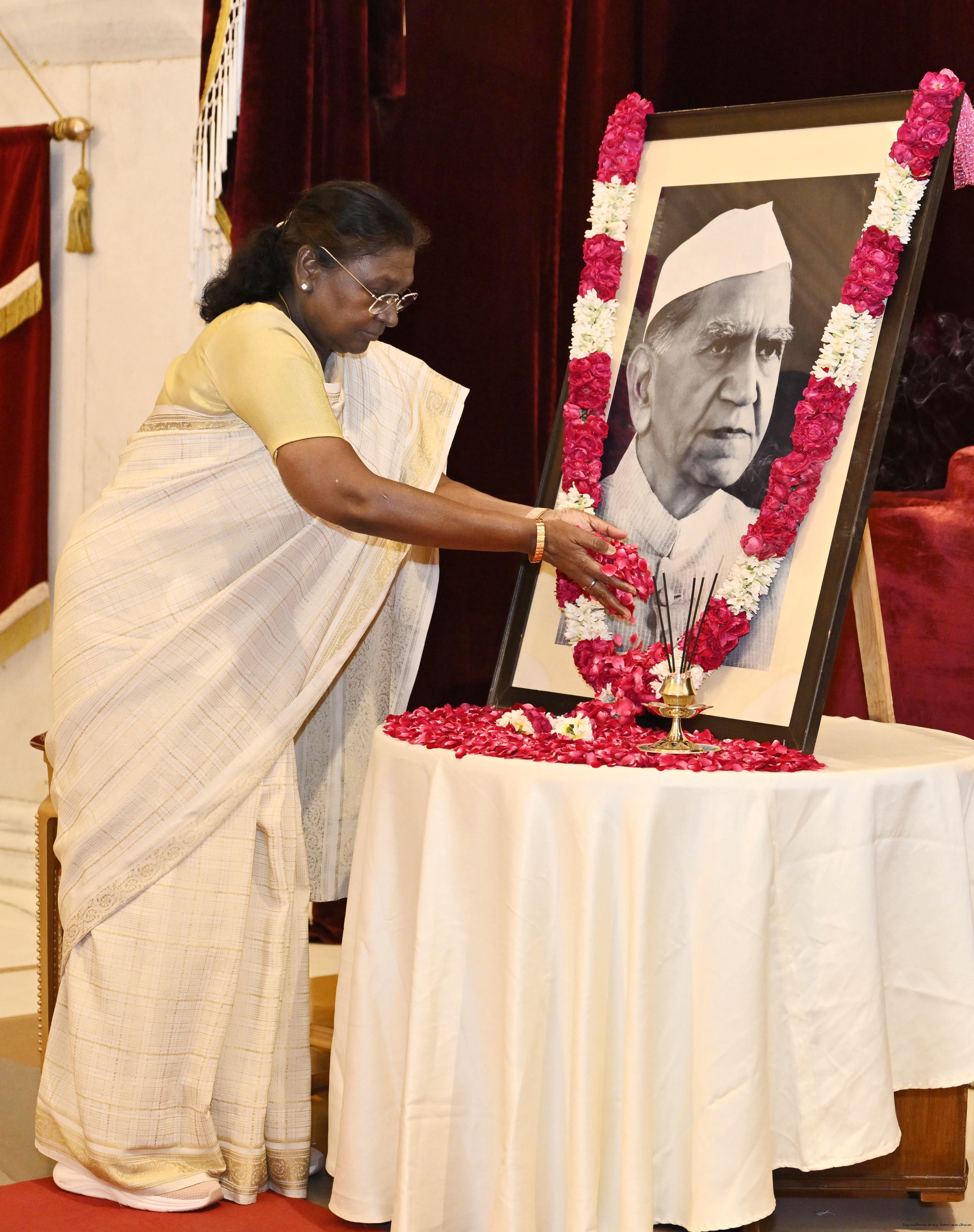 | Caption: | The President of India, Smt Droupadi Murmu paid floral tributes to Shri Fakhruddin Ali Ahmed, former President of India on his birth anniversary at Rashtrapati Bhavan on May 13, 2025. |