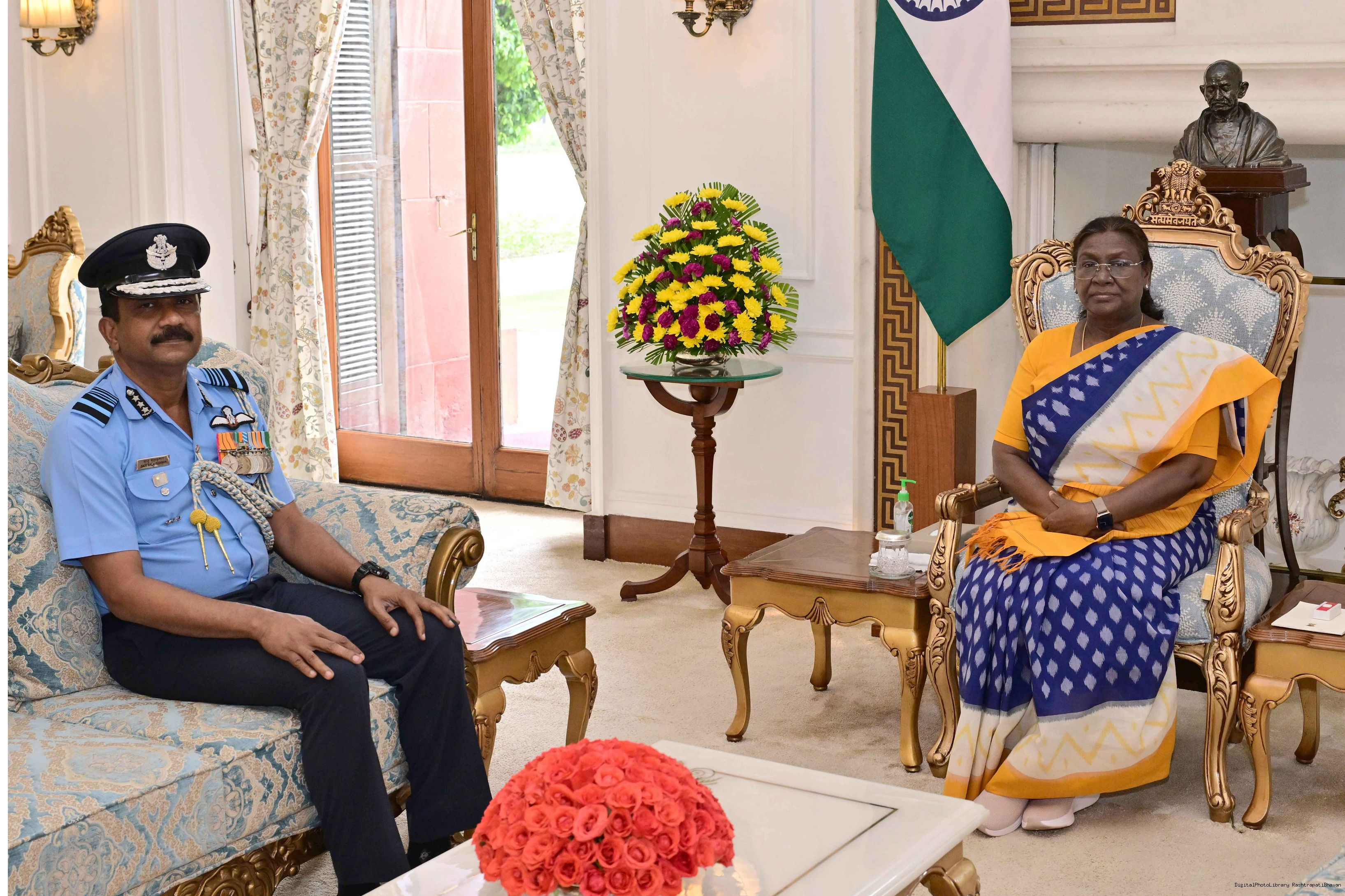 | Caption: | Air Marshal Saju Balakrishnan, PVSM, AVSM, VM, CINCAN meeting with the President of India, Smt. Droupadi Murmu at Rashtrapati Bhavan on May 26, 2025. |