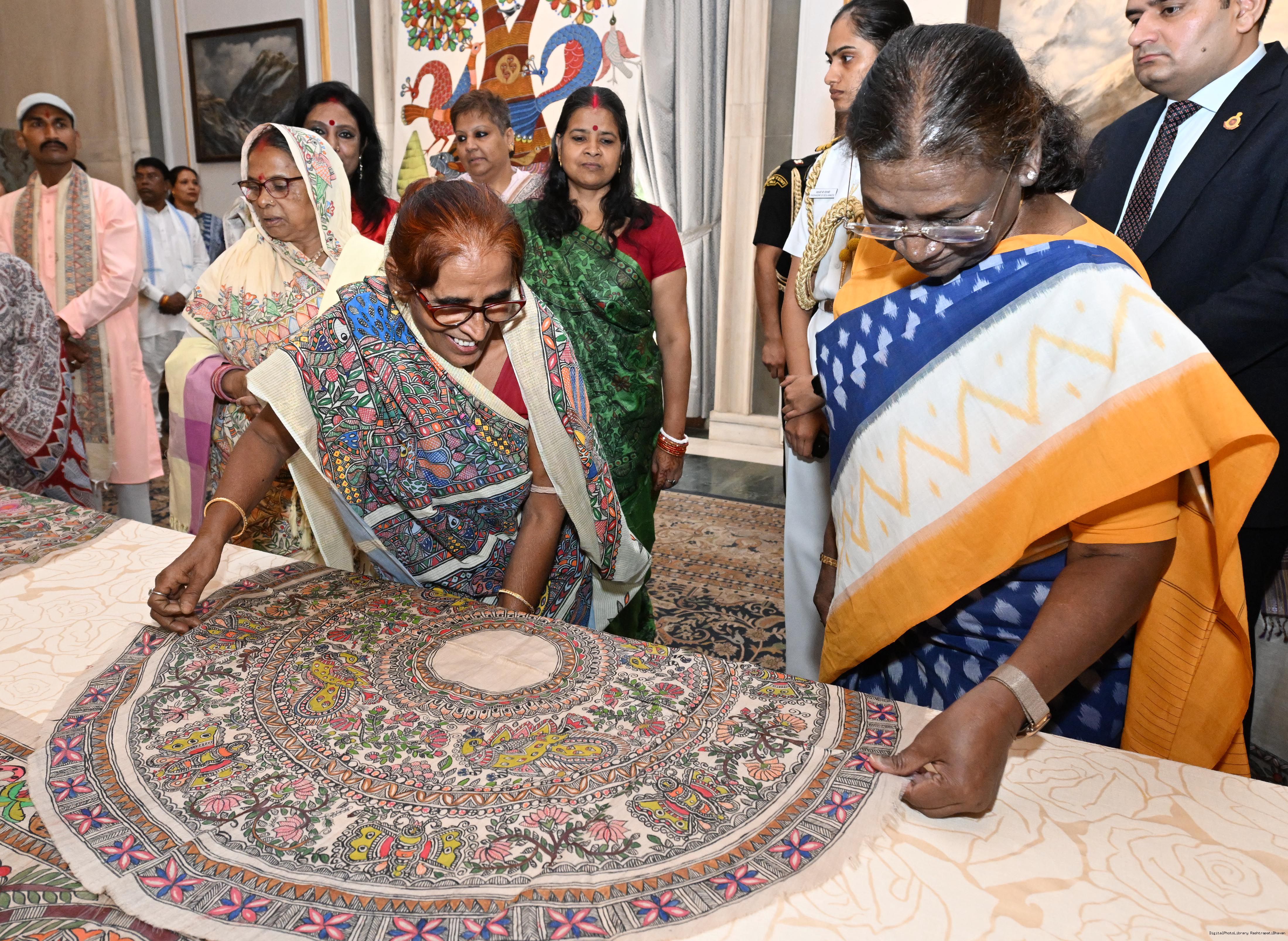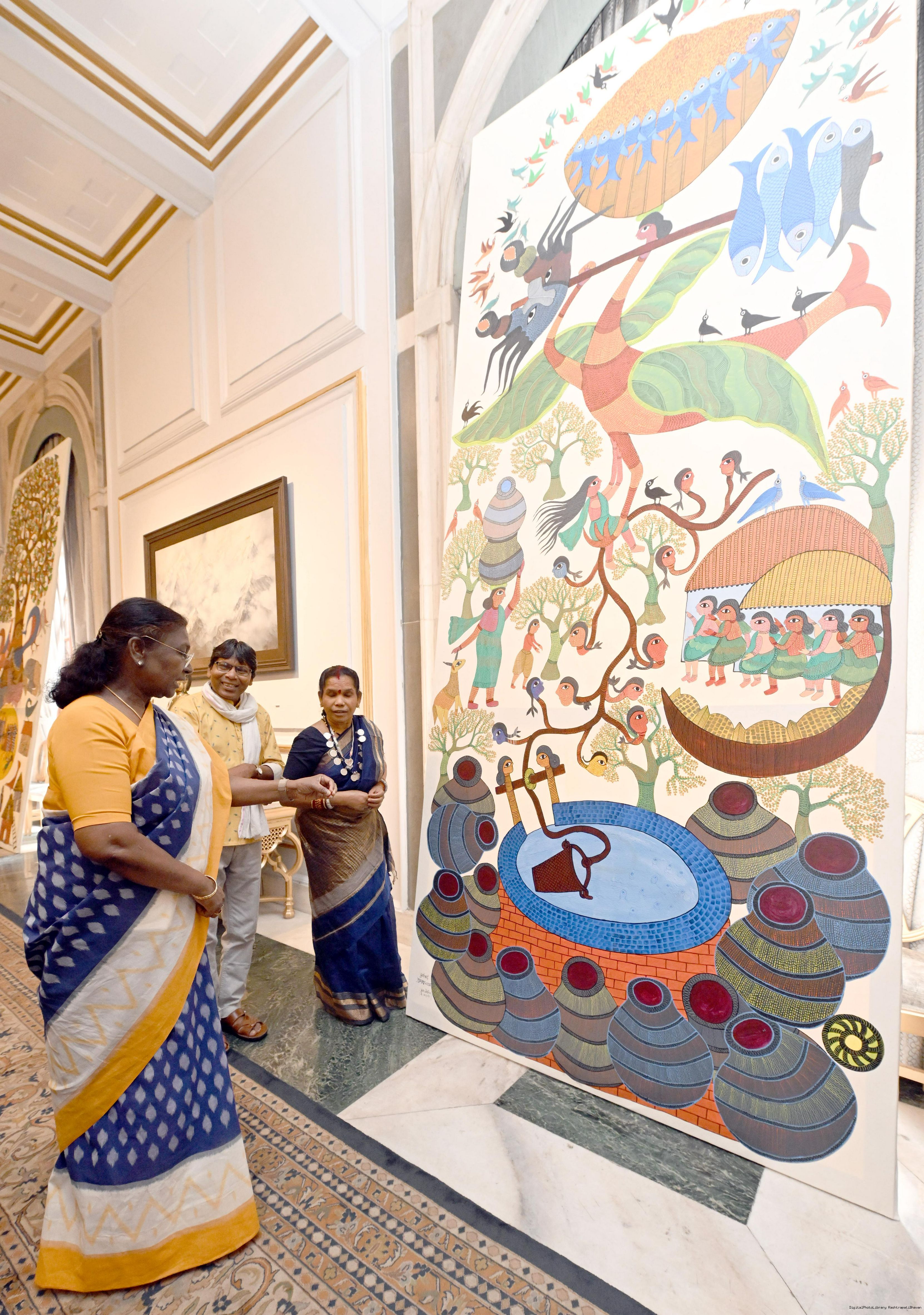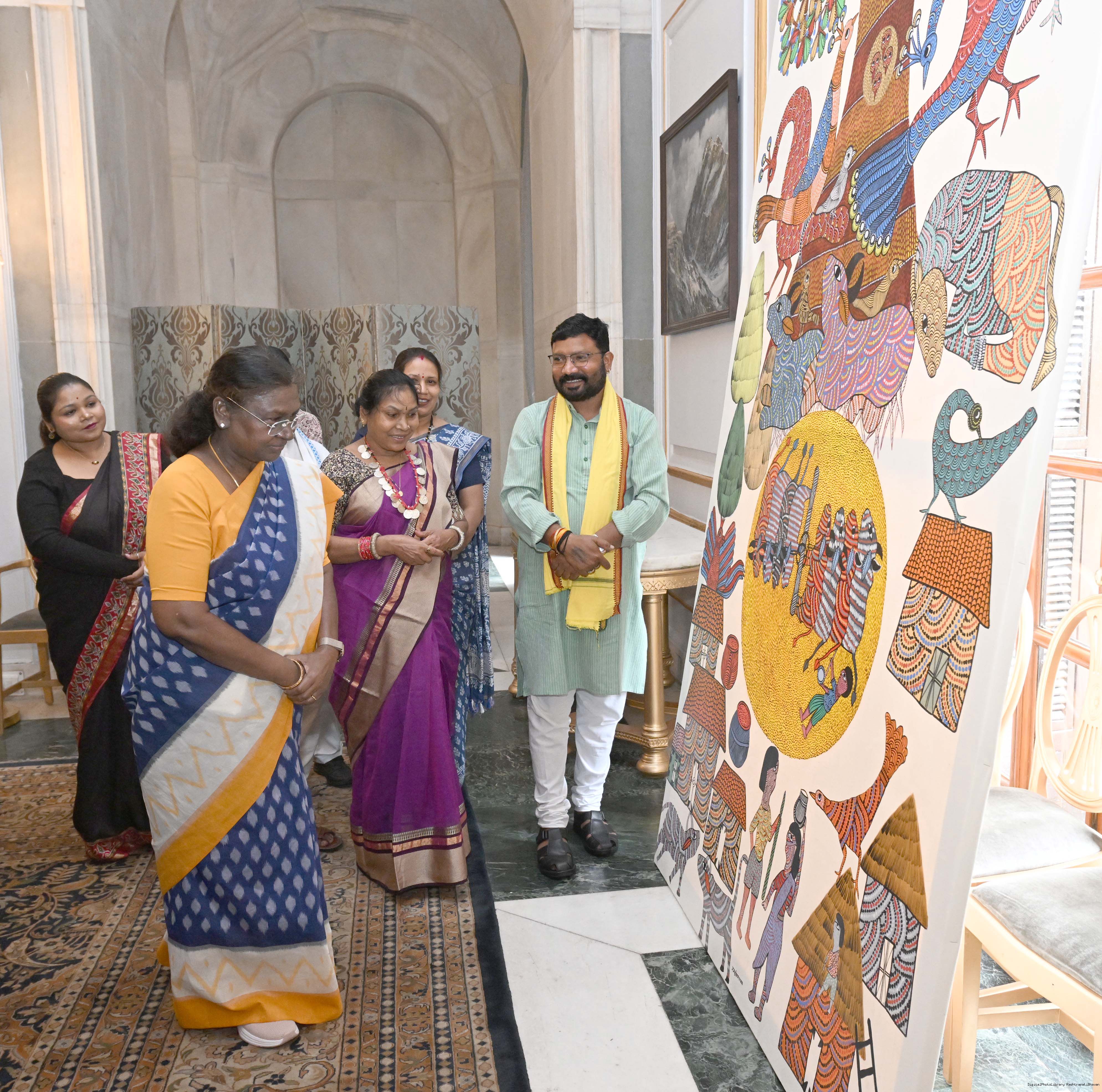 Caption: A group of artists of Gond Art and Madhubani Art called on the President of India, Smt. Droupadi Murmu at Rashtrapati Bhavan on May 26, 2025.