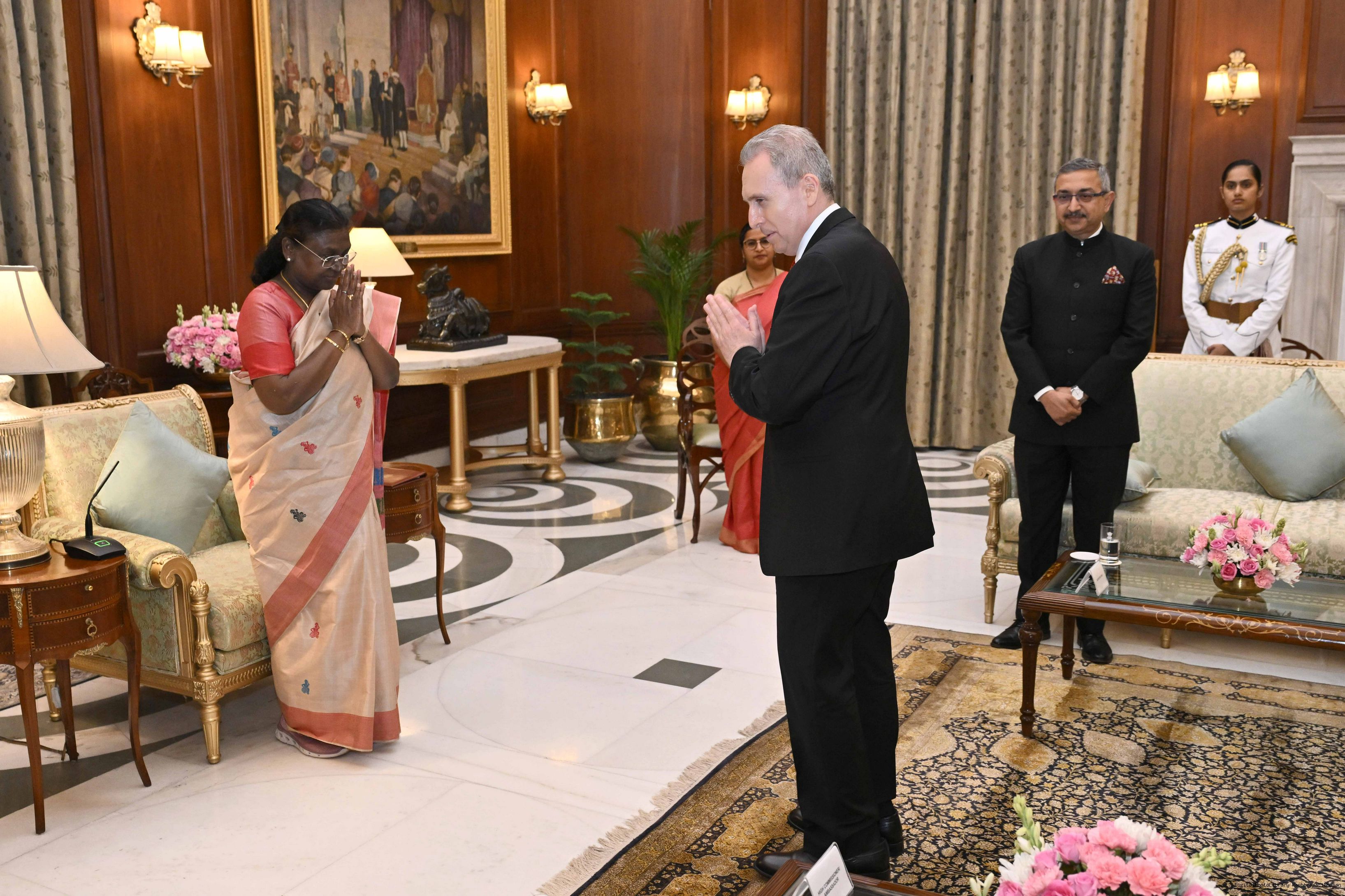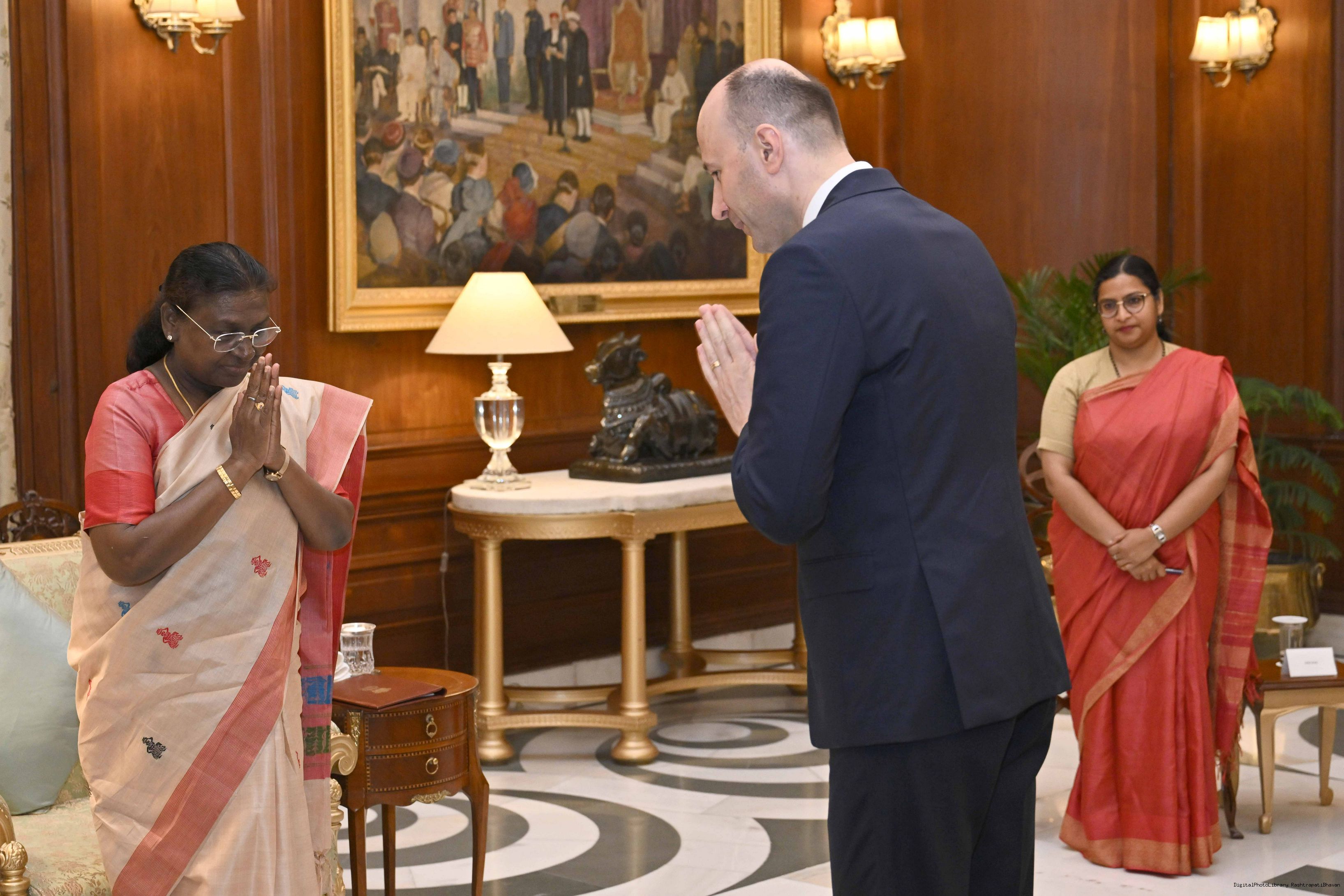 | Caption: | The Ambassador-designate of the Republic of Turkiye, H.E. Mr. Ali Murat Ersoy presenting his credentials to the President of India, Smt Droupadi Murmu at Ashok Hall of Rashtrapati Bhavan in New Delhi on May 29, 2025. |