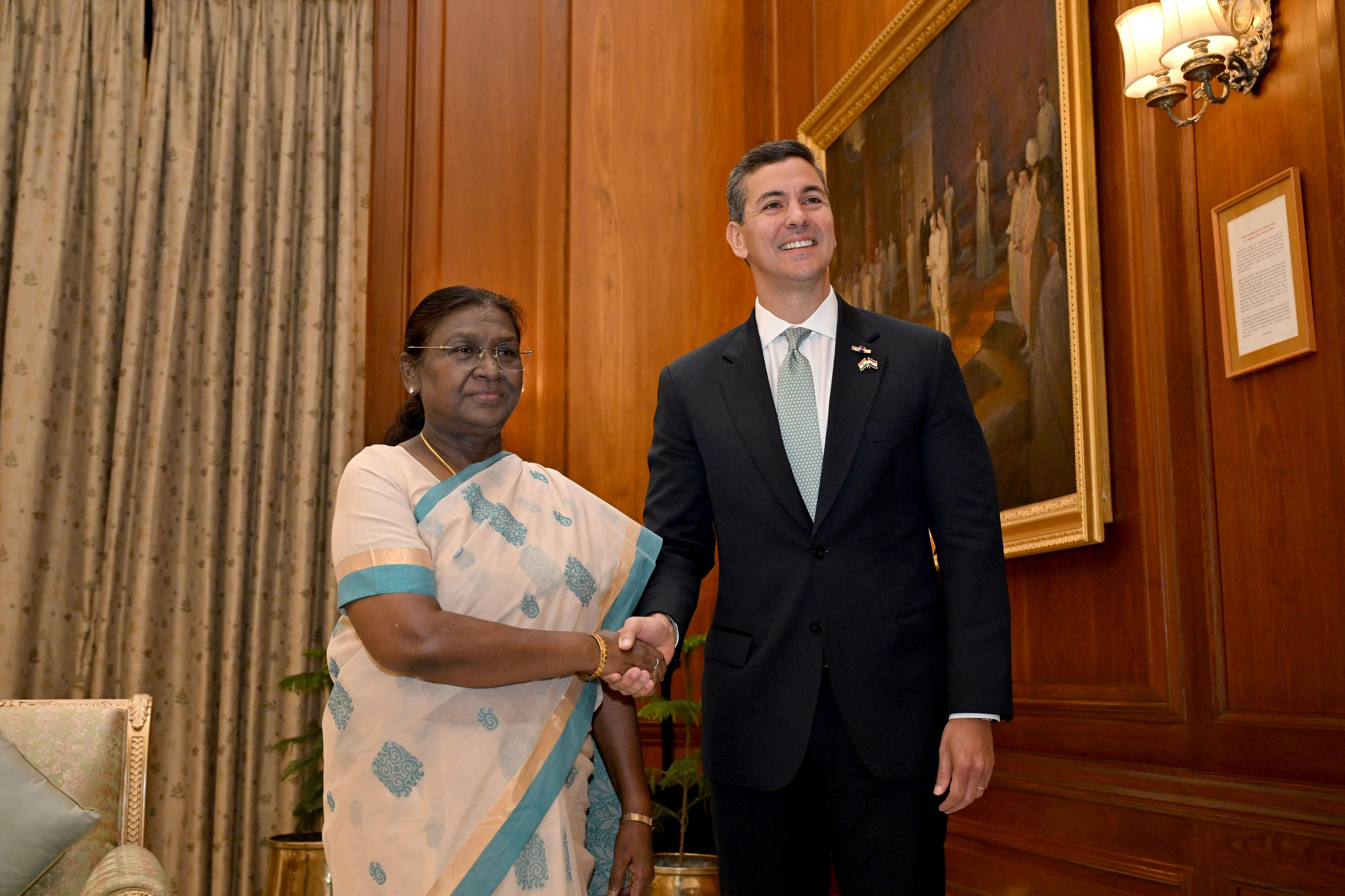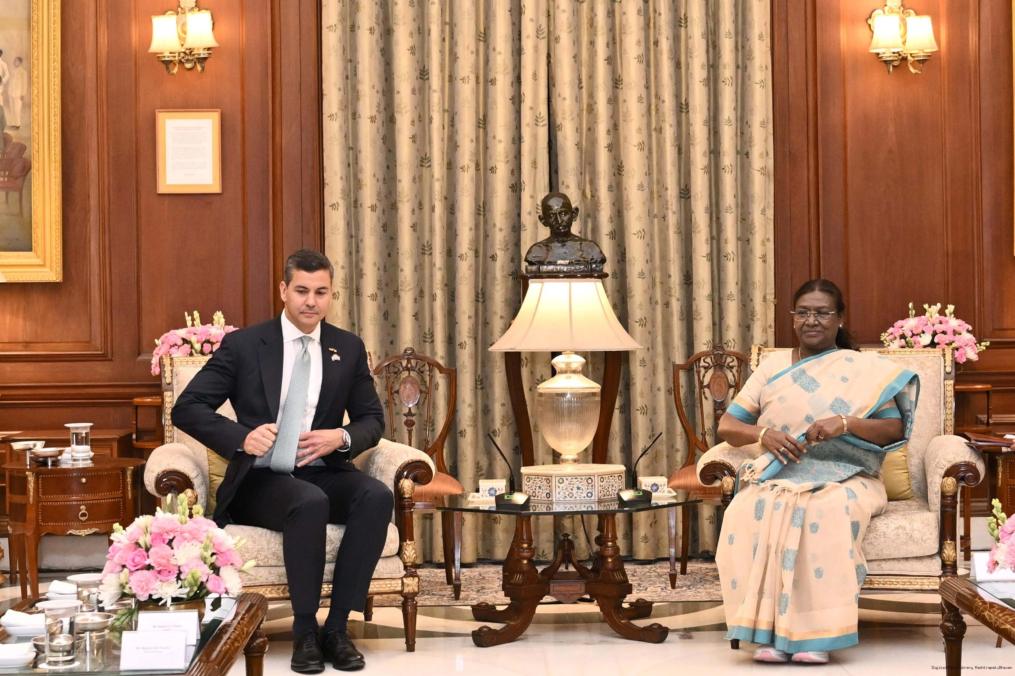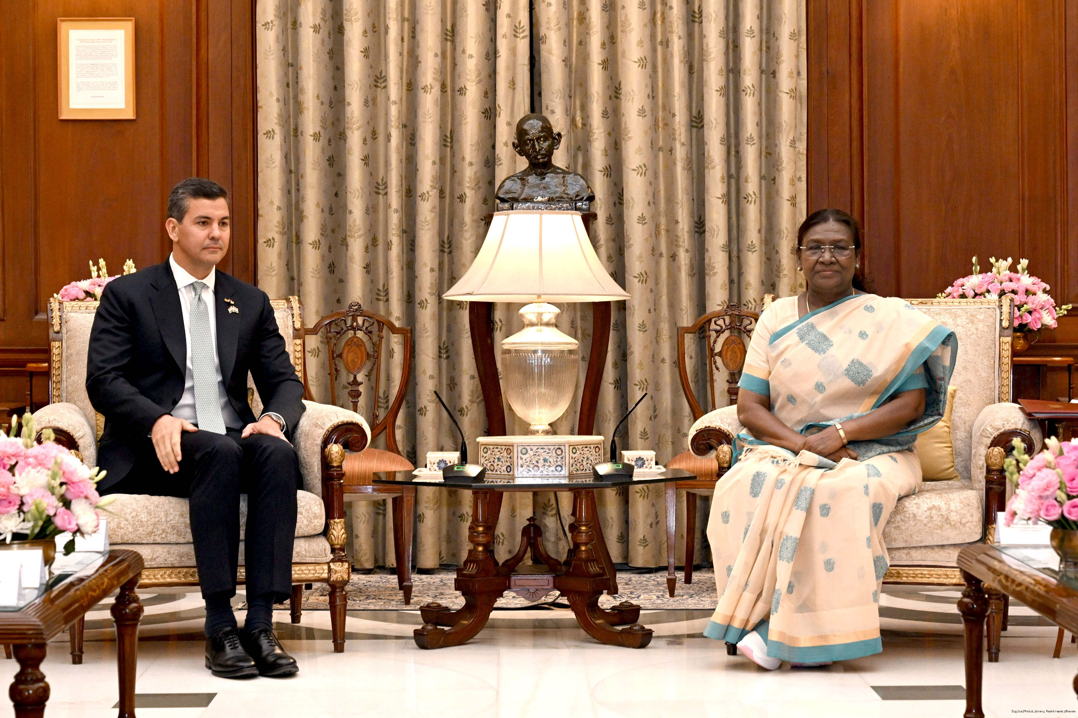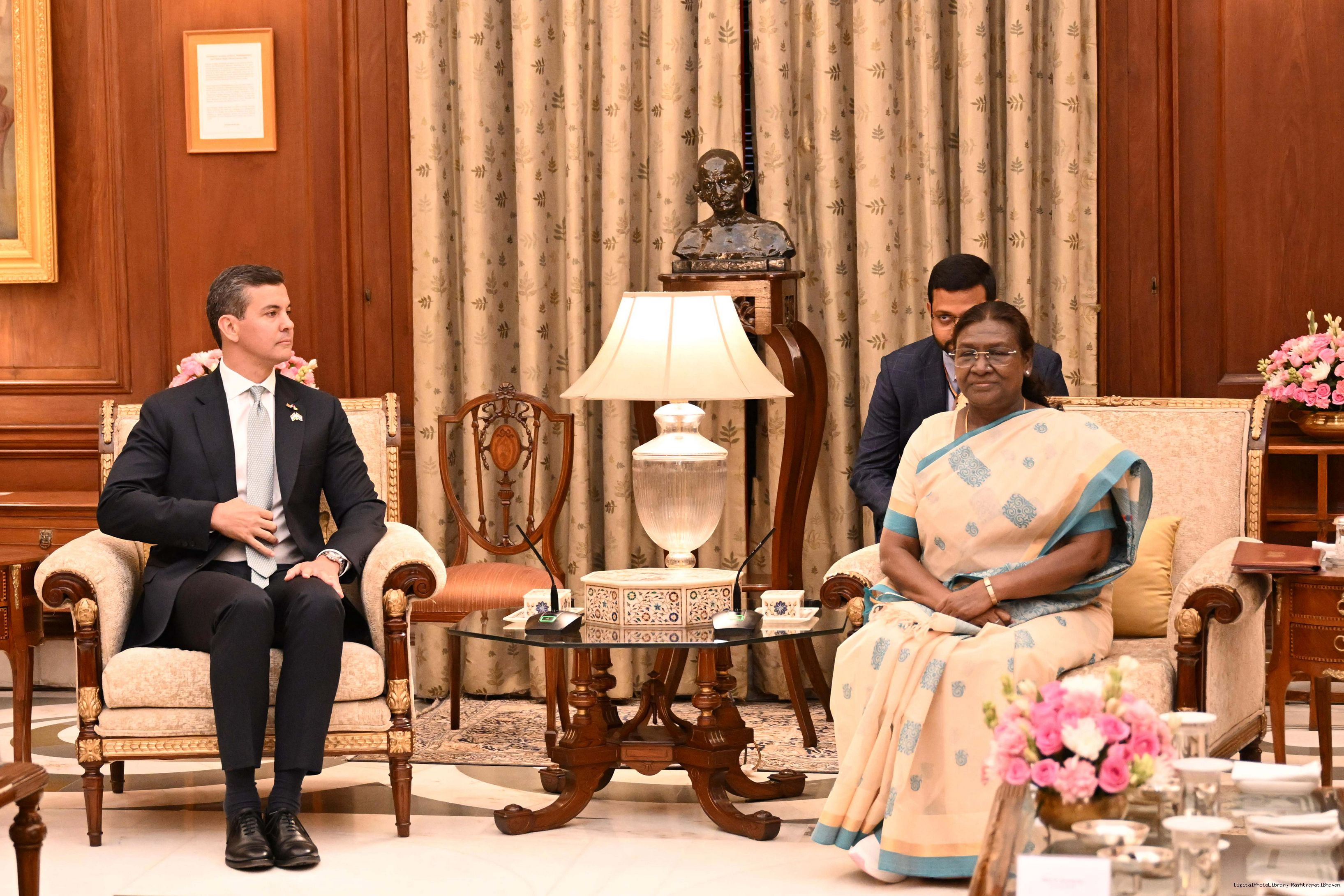 | Caption: | The President of India, Smt Droupadi Murmu received H.E. Mr Santiago Peña Palacios, President of the Republic of Paraguay at Rashtrapati Bhavan on June 2, 2025. |