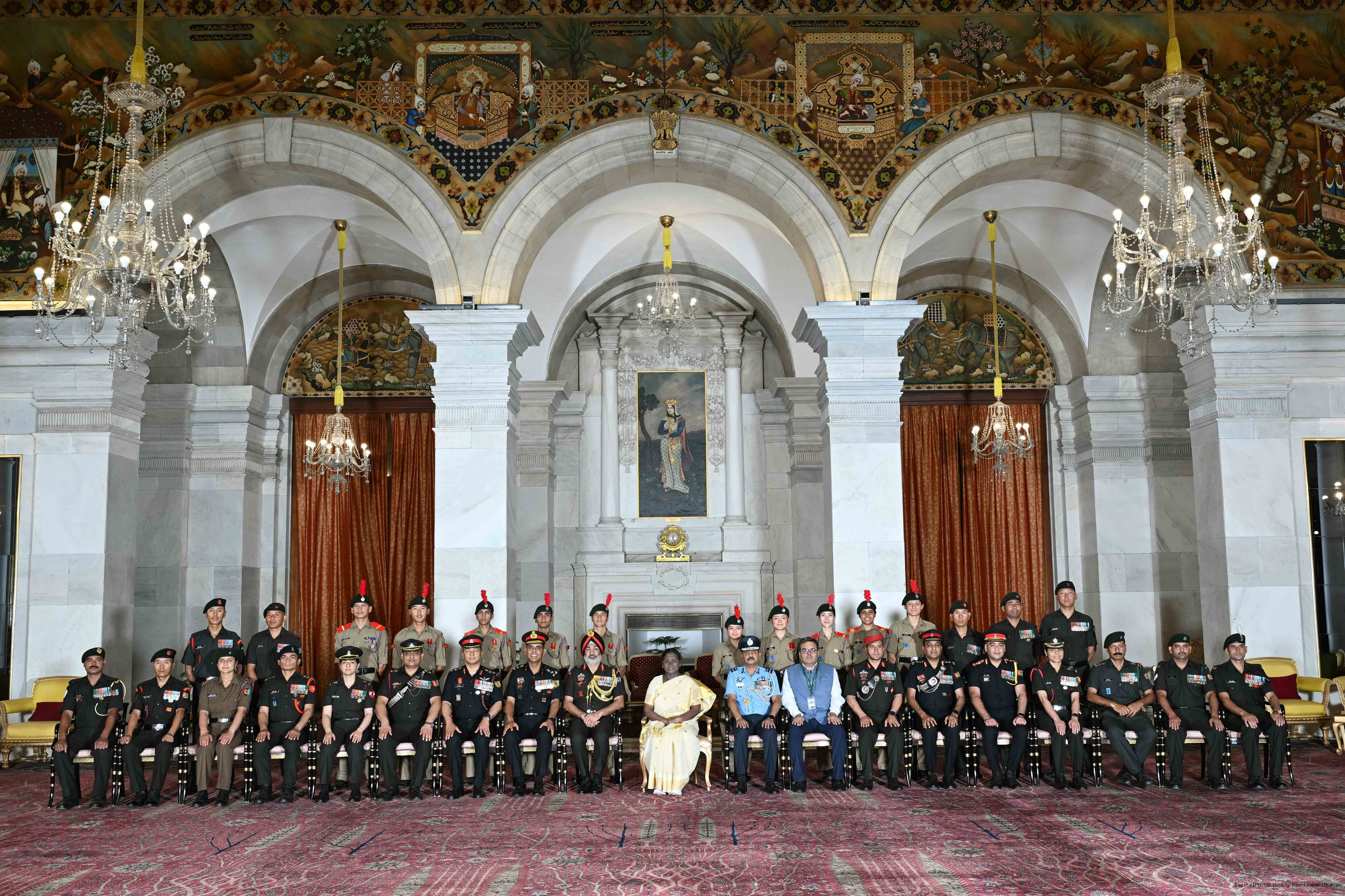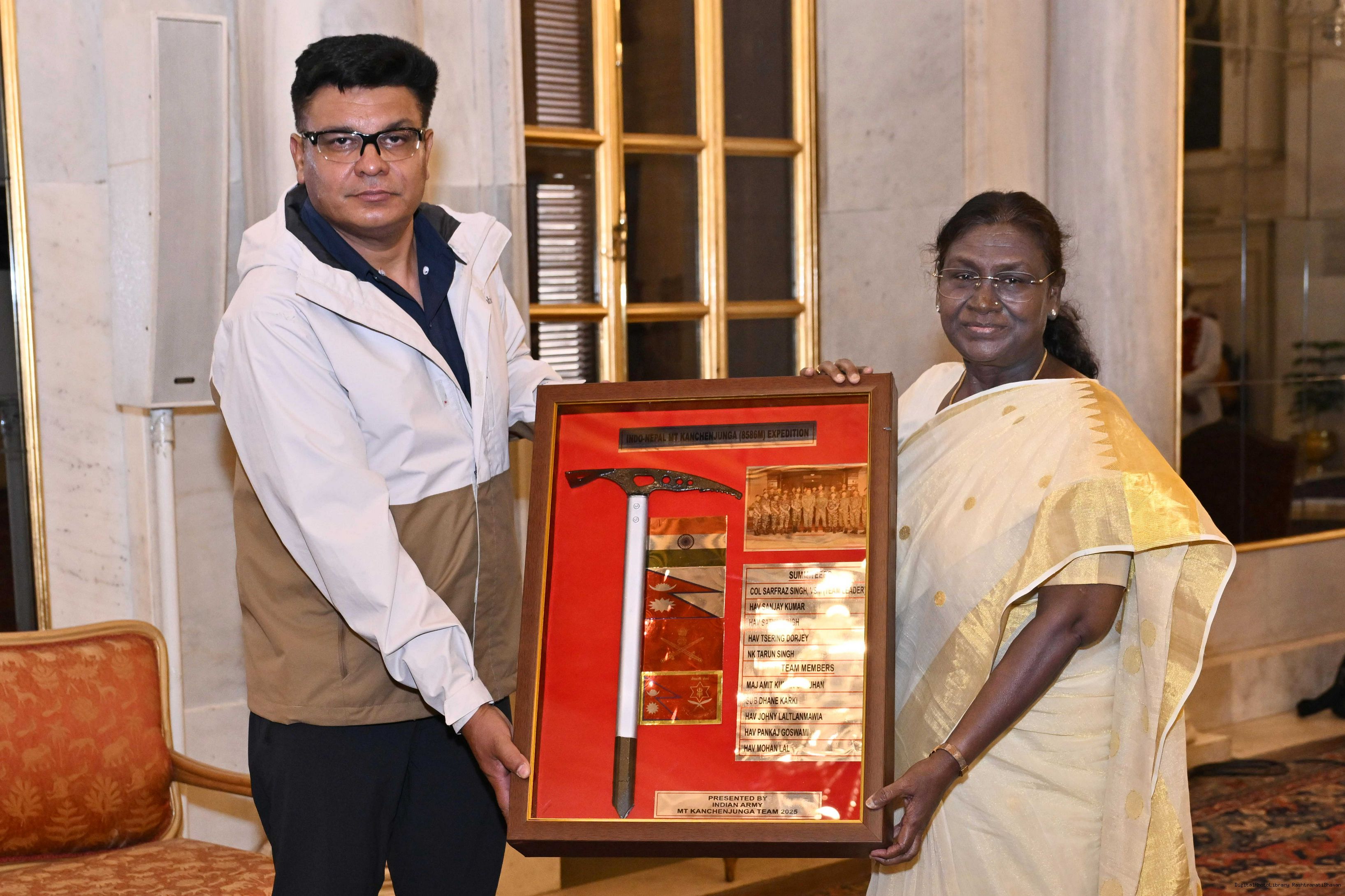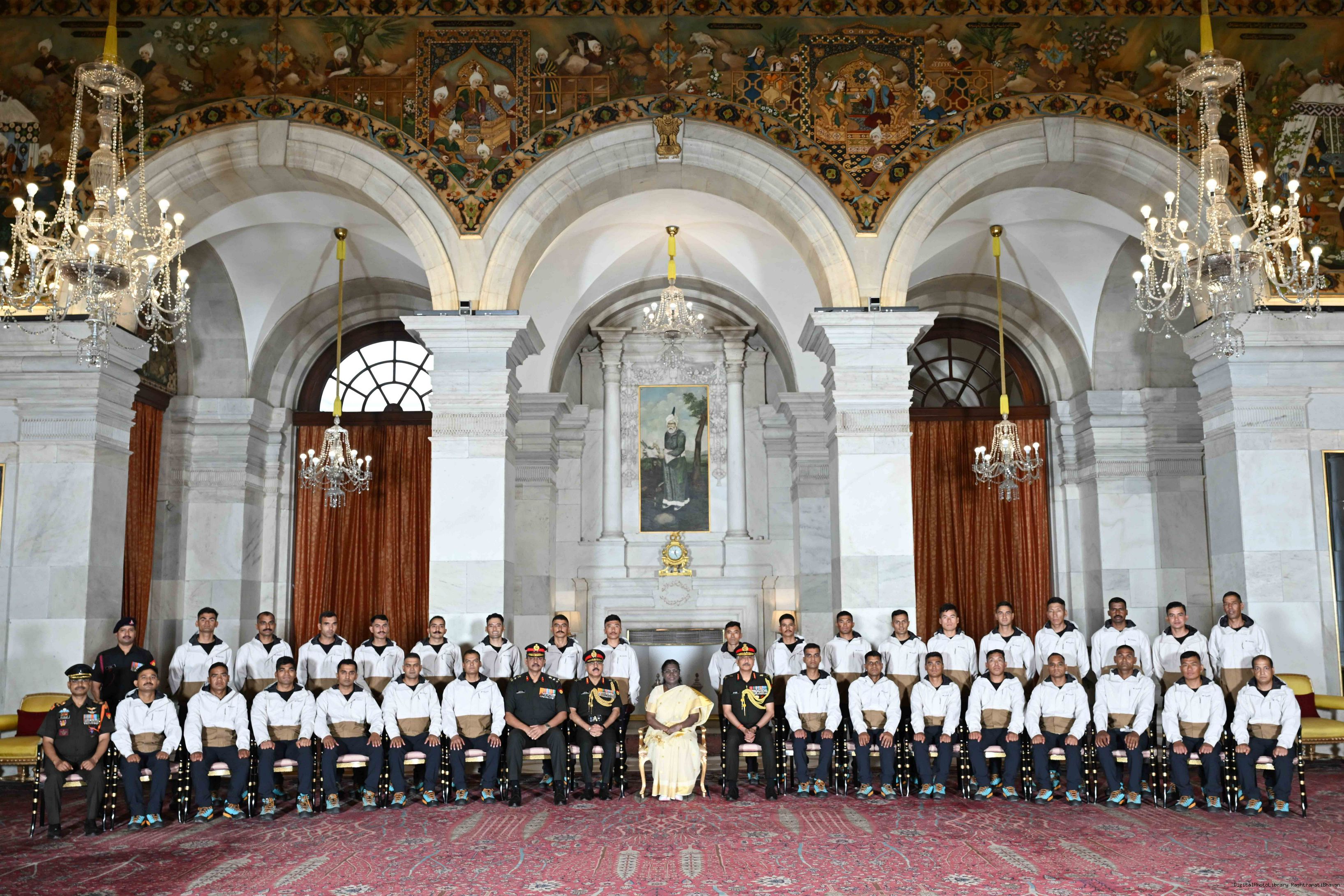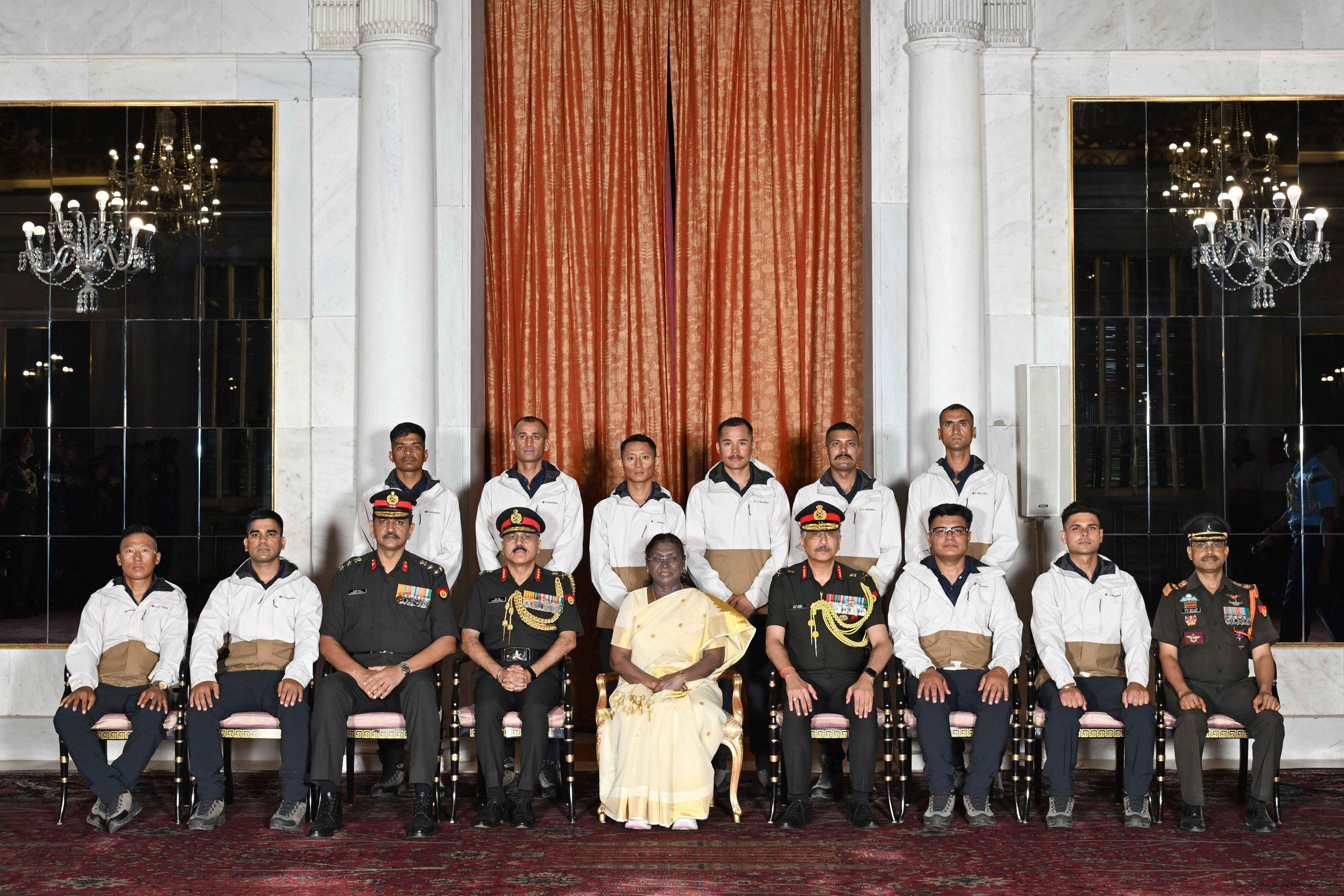 | Caption: | The President of India, Smt Droupadi Murmu posing a group photograph with Silver Jubilee Indian Army Mountaineering Expedition, NCC Mt Everest Expedition andJOint Indo-Nepal Army Mountaineering Expedition to Mt. Kanchenjunga at Rashtrapati Bhavan on June 16, 2025. |