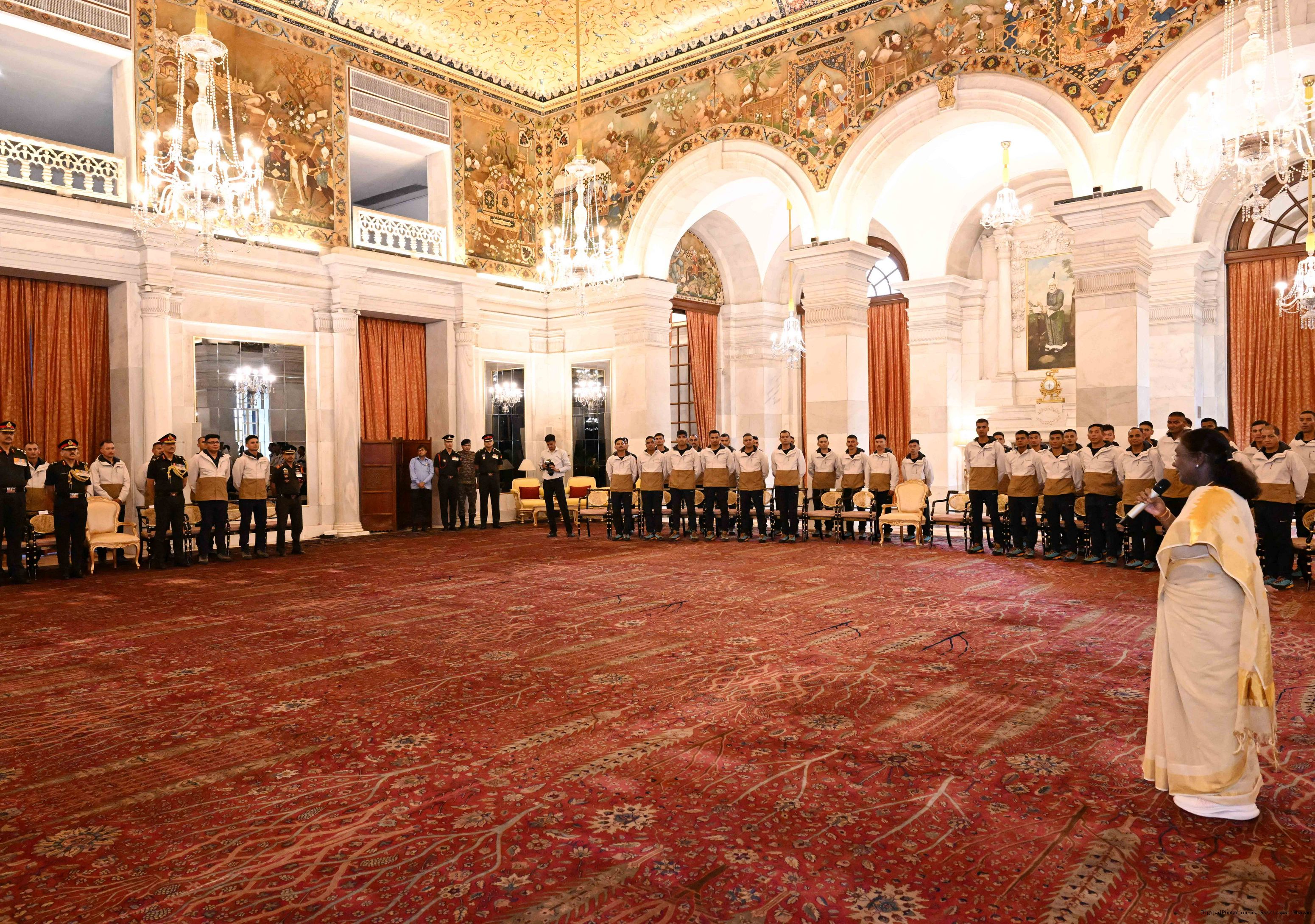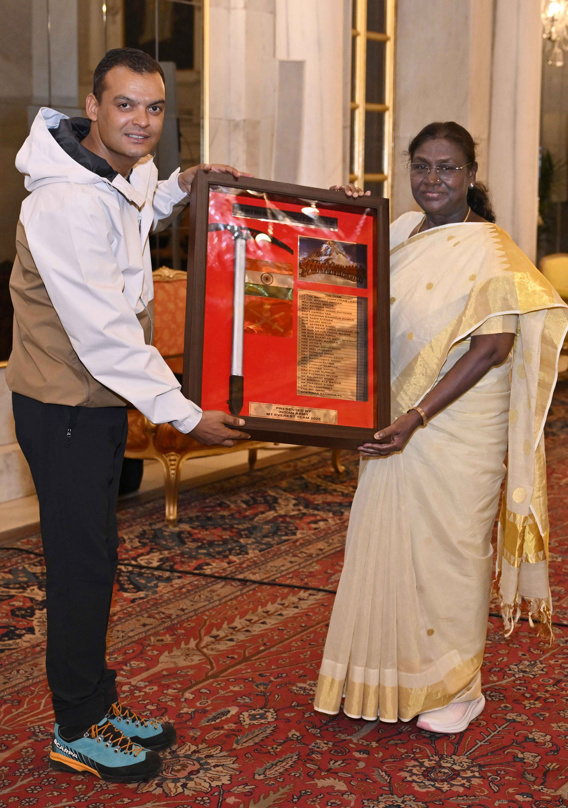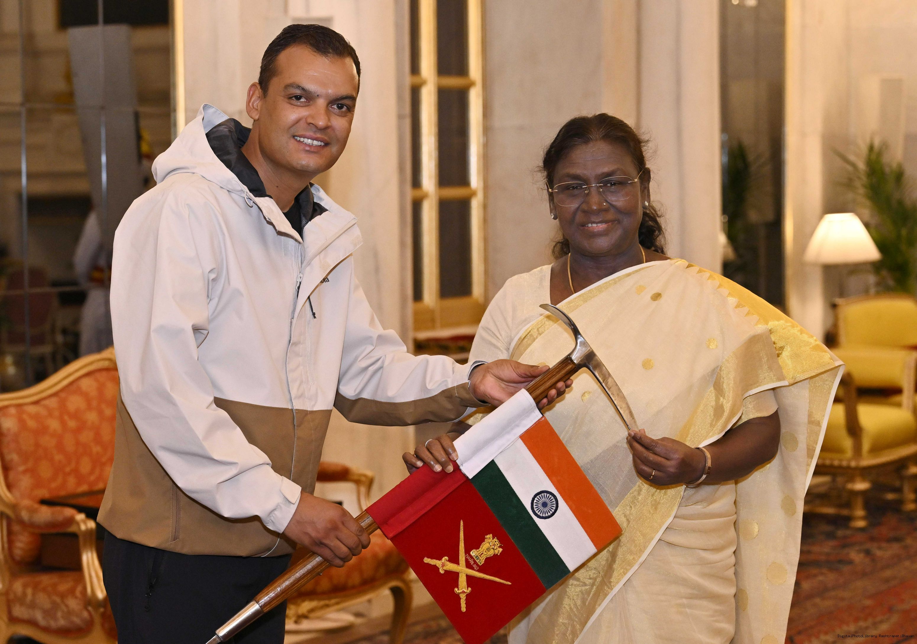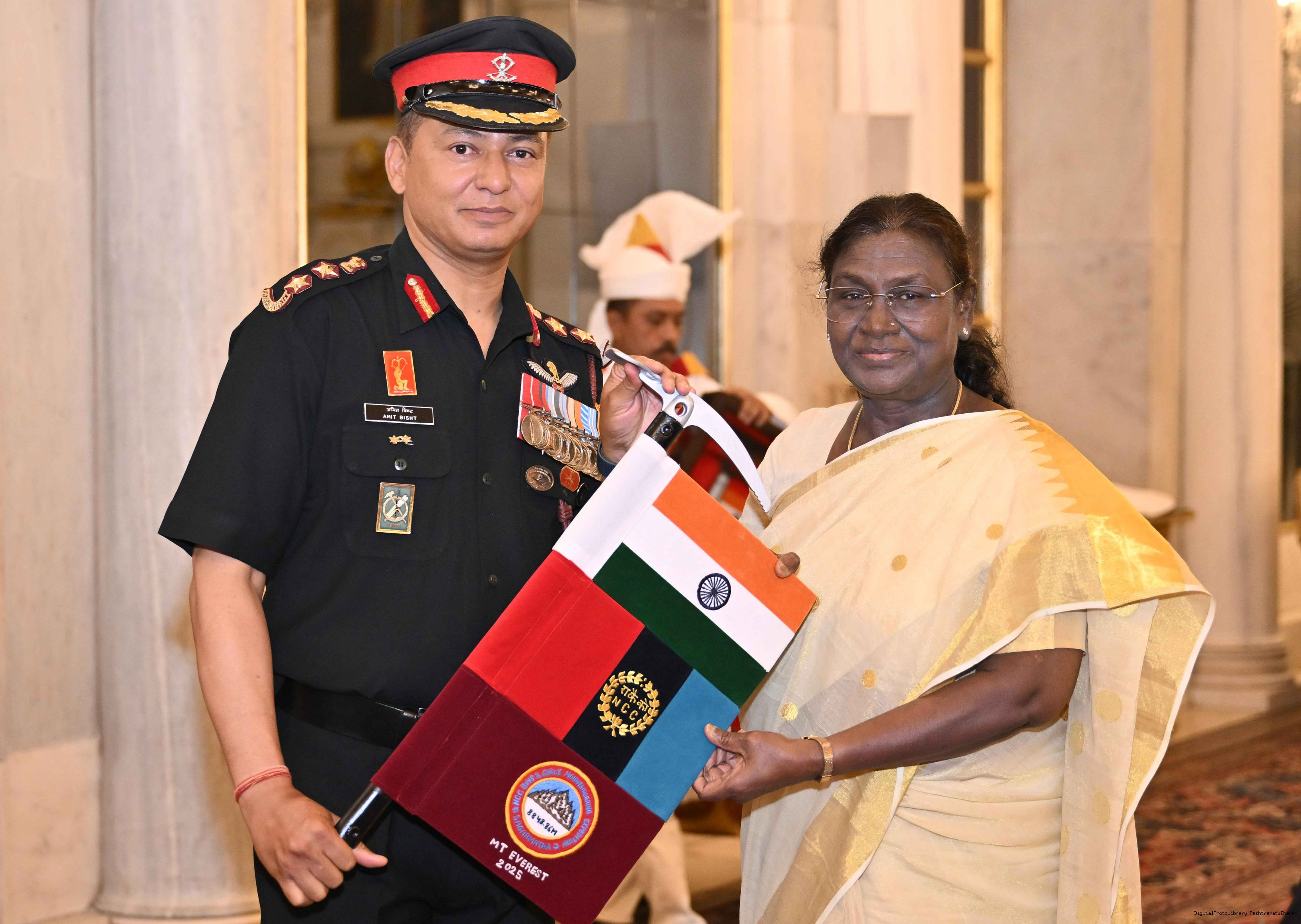 | Caption: | The President of India, Smt Droupadi Murmu posing a group photograph with Silver Jubilee Indian Army Mountaineering Expedition, NCC Mt Everest Expedition andJOint Indo-Nepal Army Mountaineering Expedition to Mt. Kanchenjunga at Rashtrapati Bhavan on June 16, 2025. |