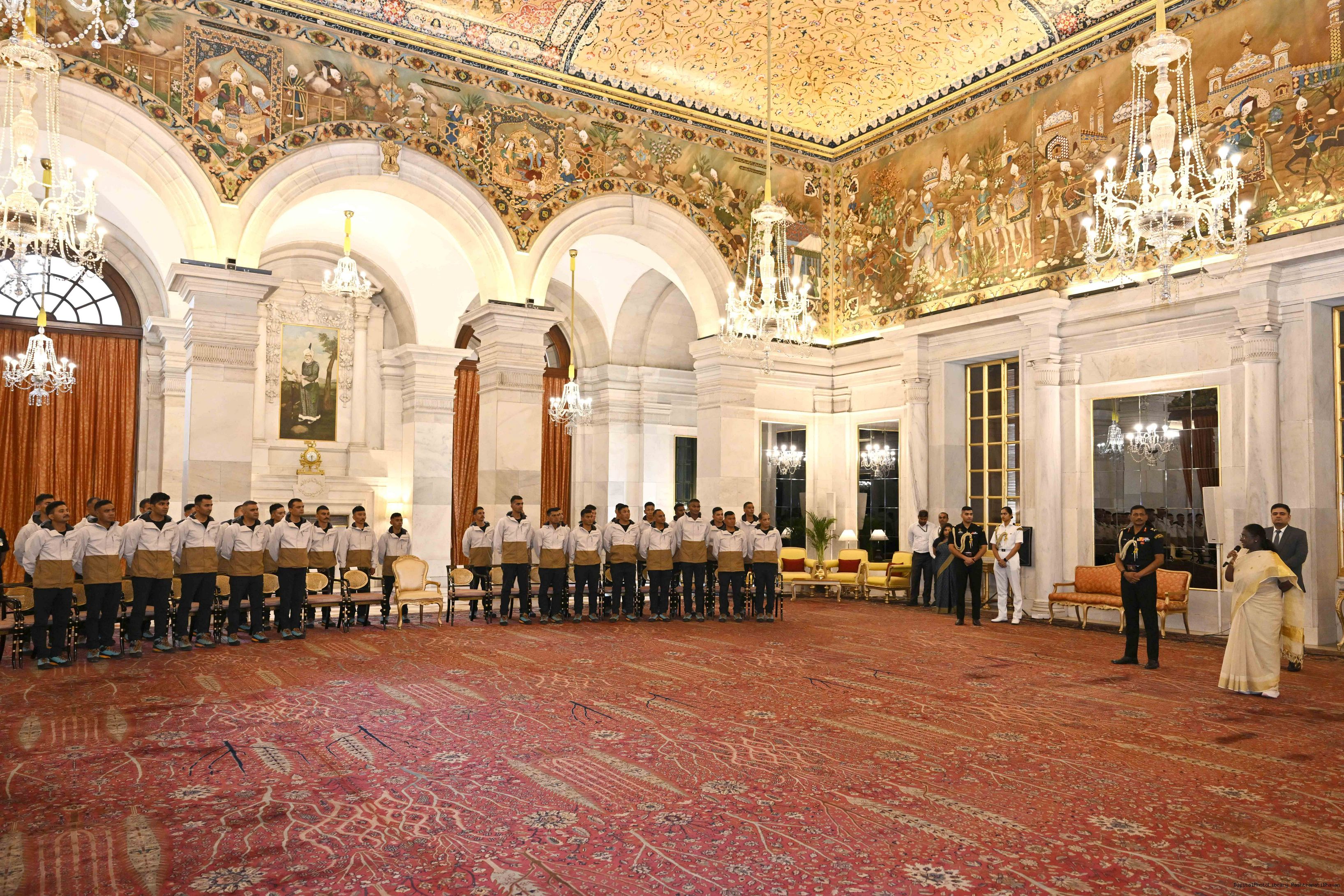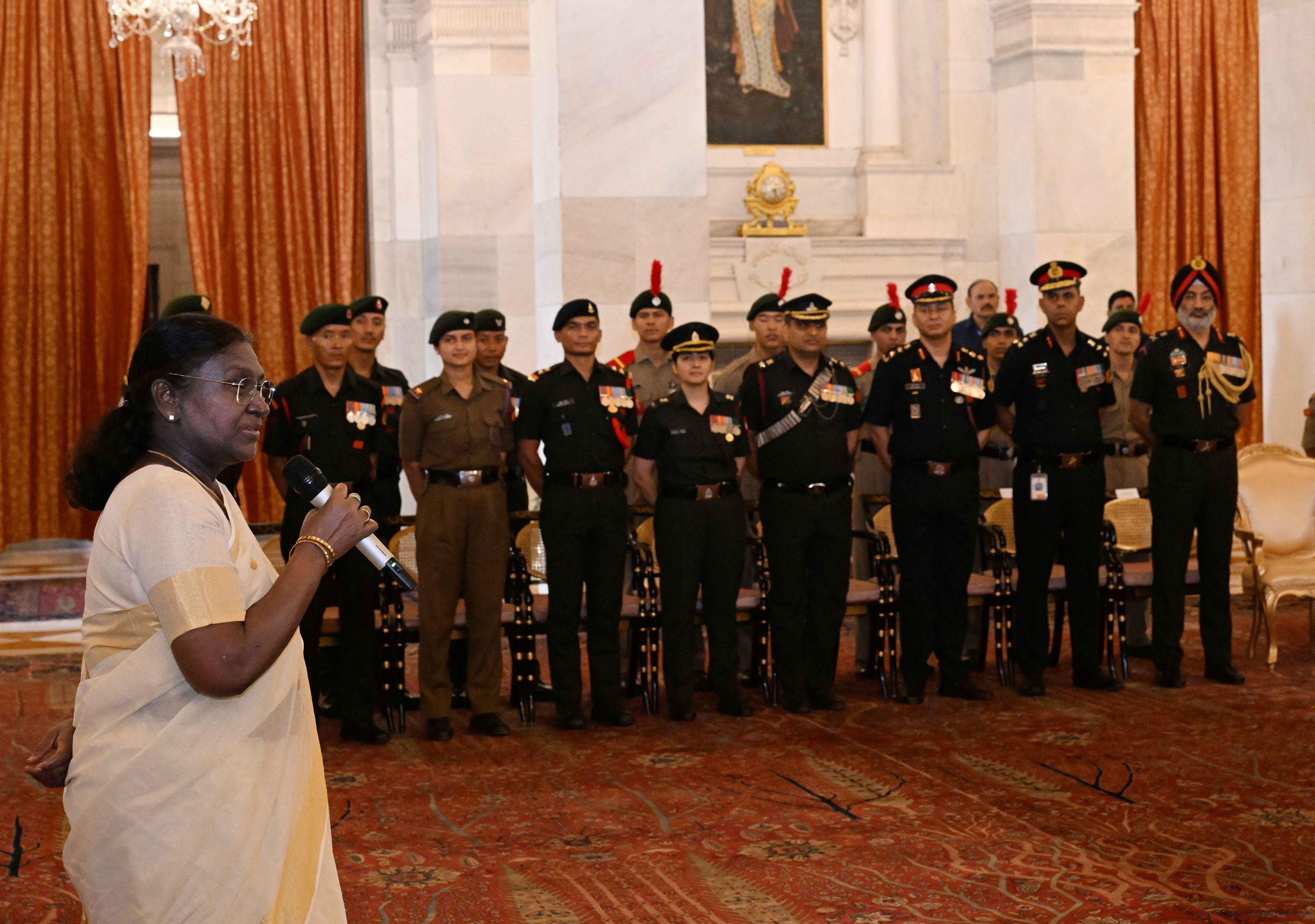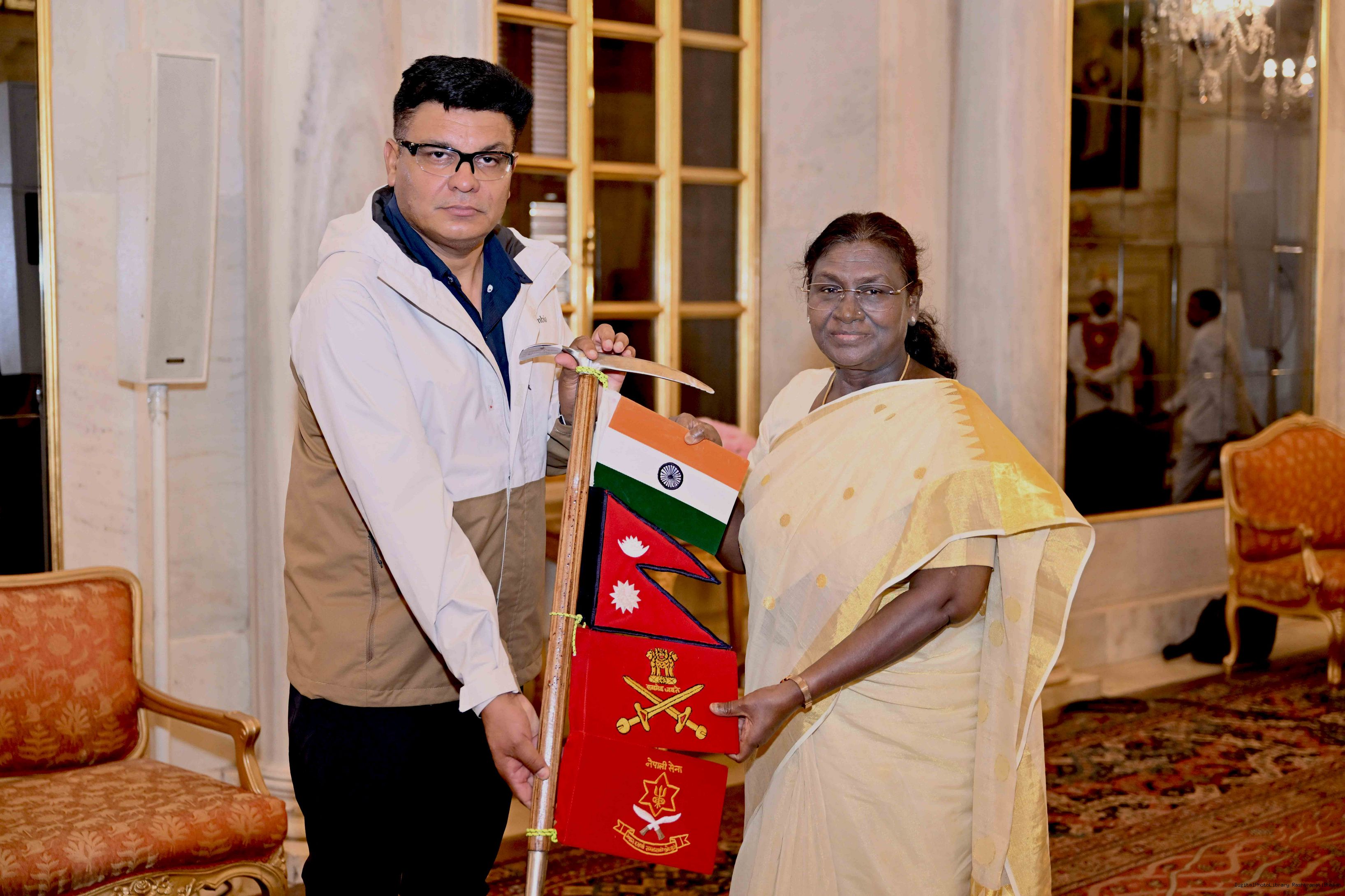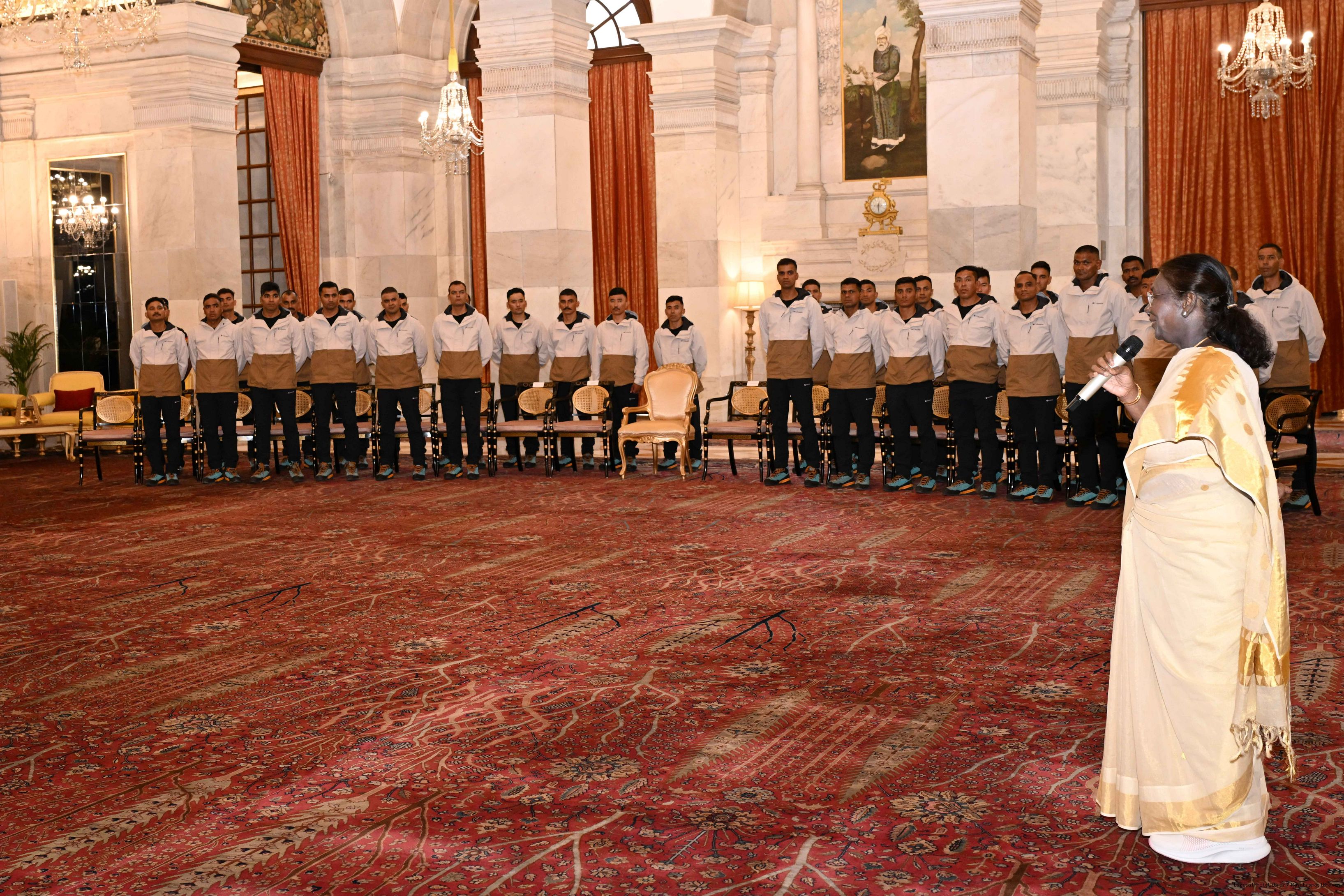 | Caption: | The President of India, Smt Droupadi Murmu posing a group photograph with Silver Jubilee Indian Army Mountaineering Expedition, NCC Mt Everest Expedition andJOint Indo-Nepal Army Mountaineering Expedition to Mt. Kanchenjunga at Rashtrapati Bhavan on June 16, 2025. |