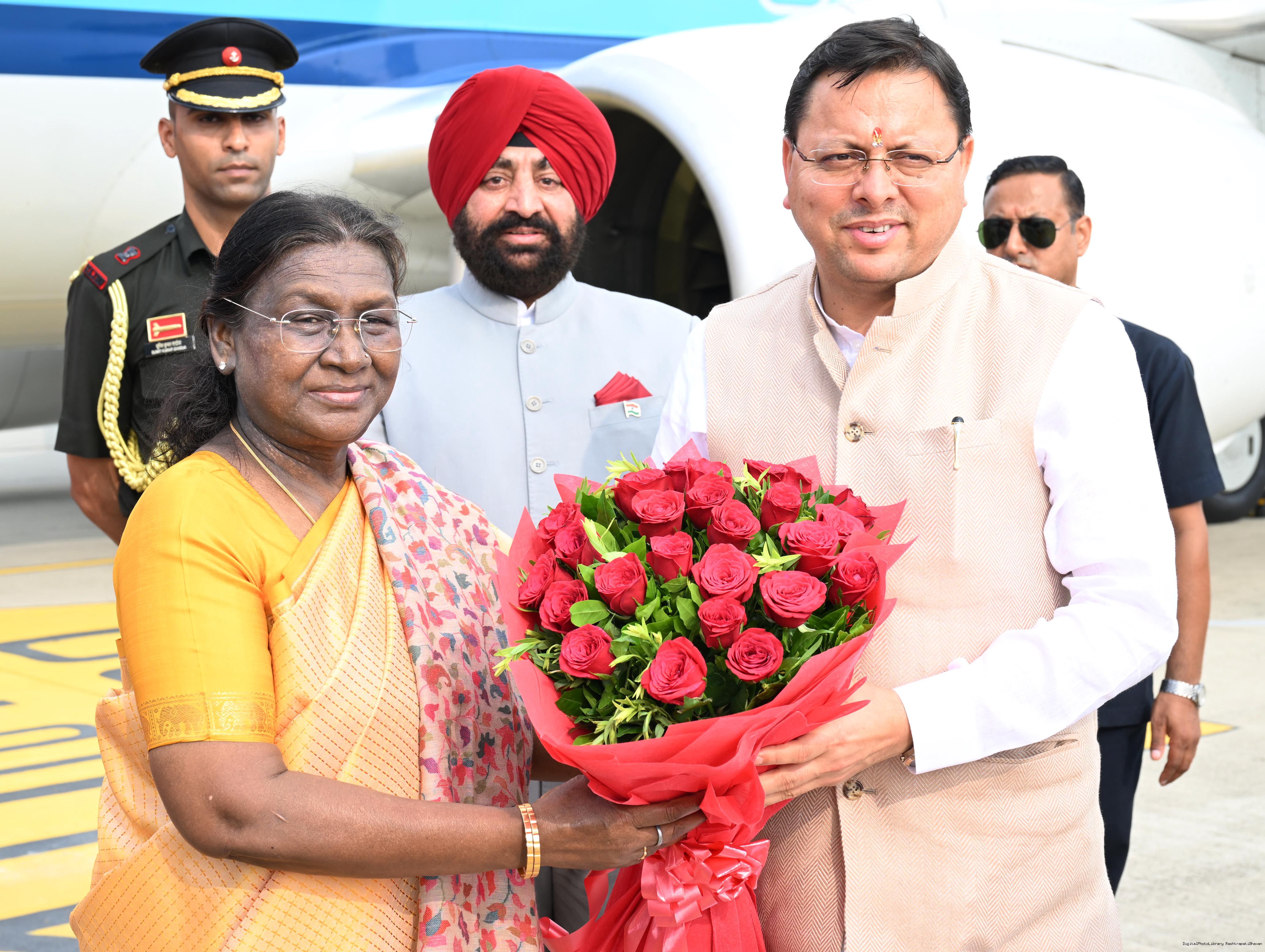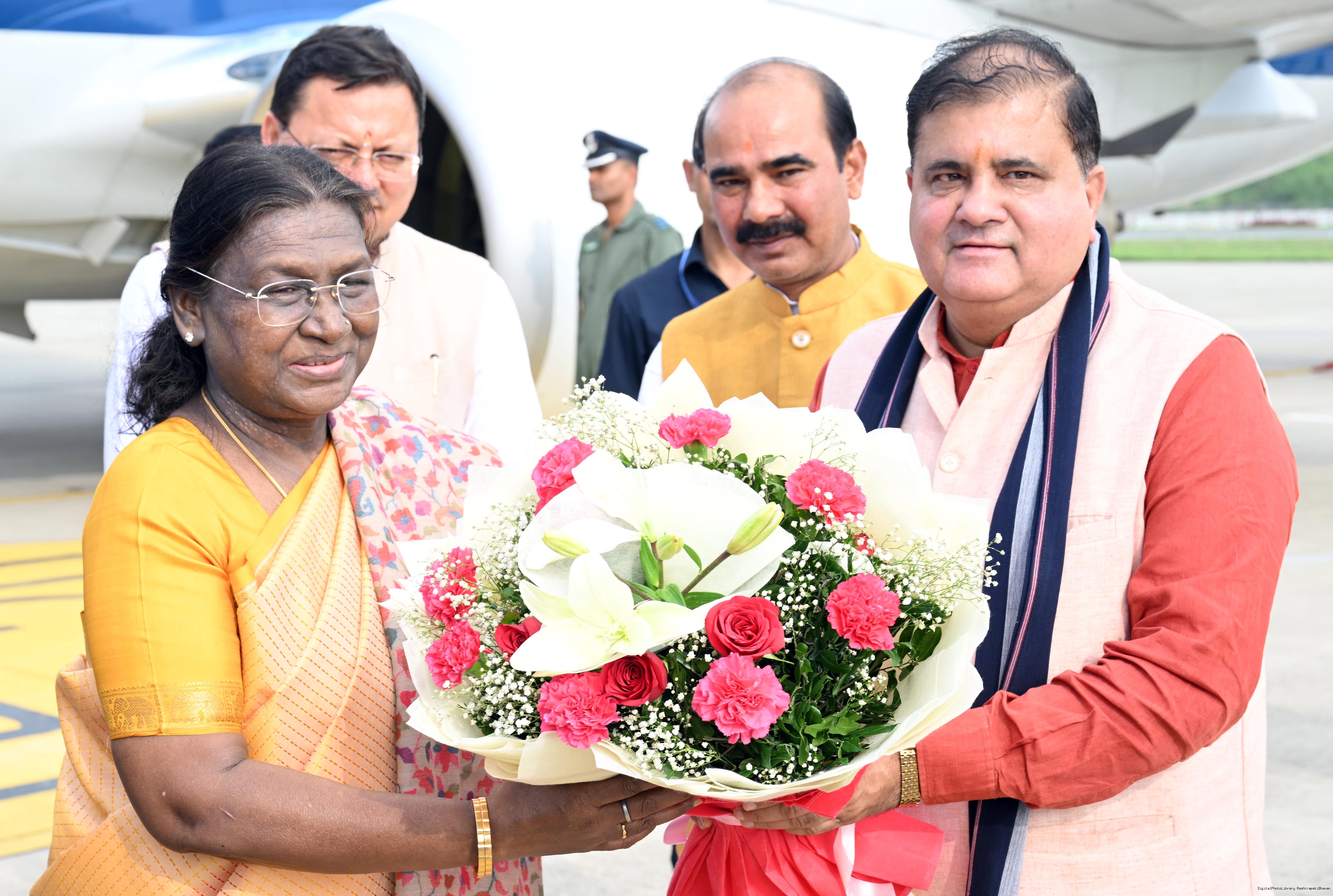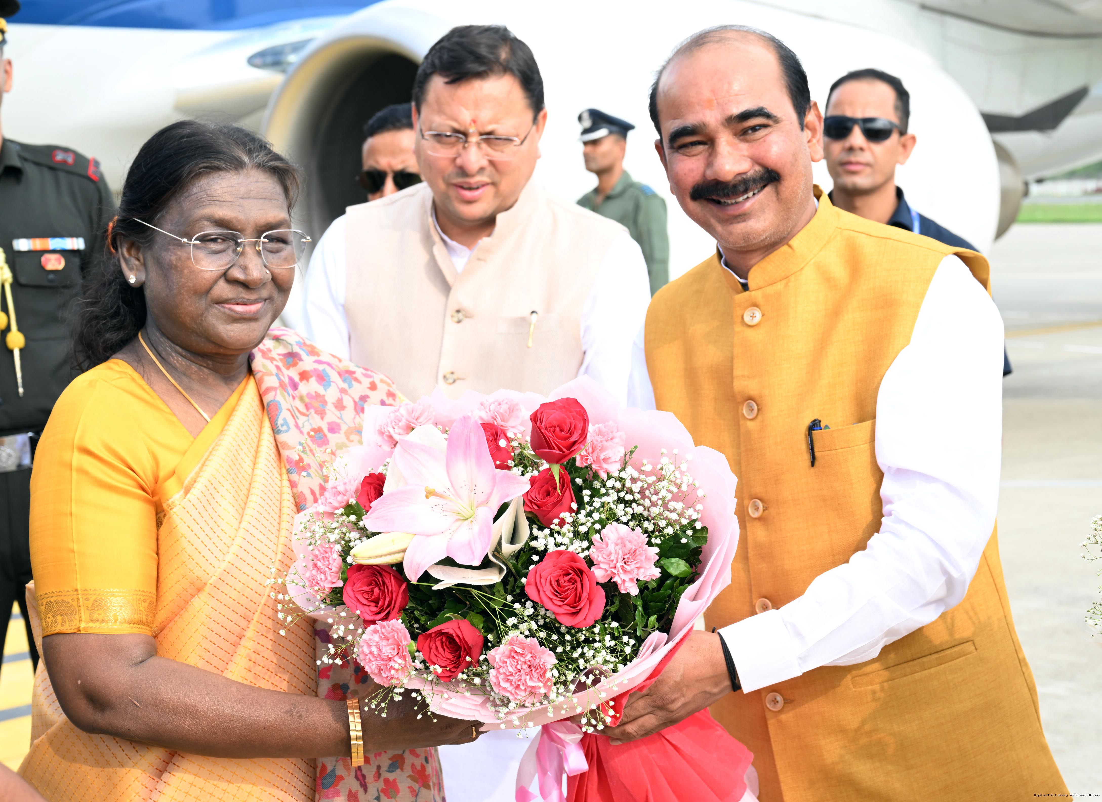 | Caption: | The Governor of Uttarakhand, Lt Gen Gurmit Singh (Retd.) and Chief Minister, Shri Pushkar Singh Dhami received the President of India, Smt Droupadi Murmu on her arrival at Dehradun on June 19, 2025. |