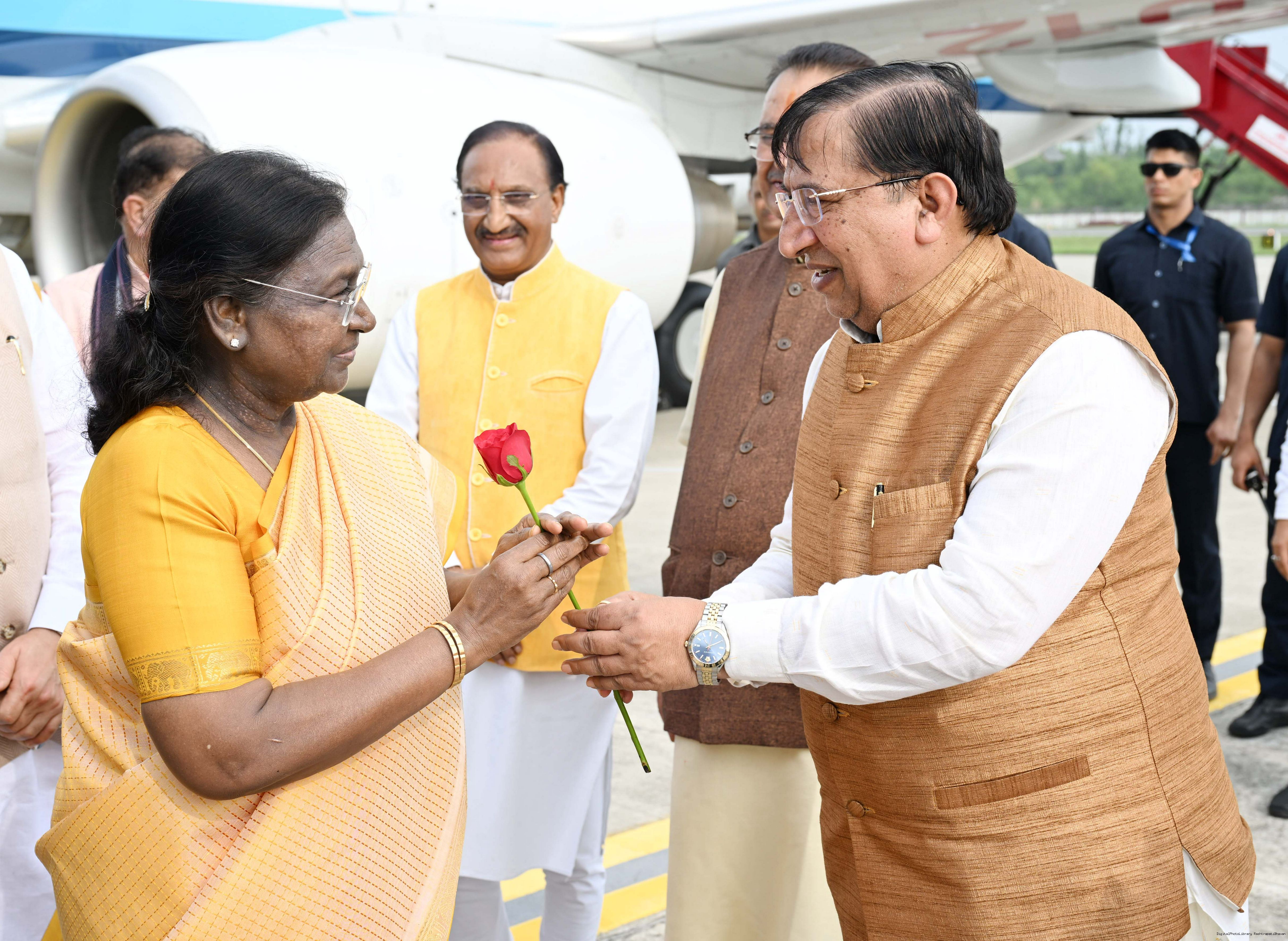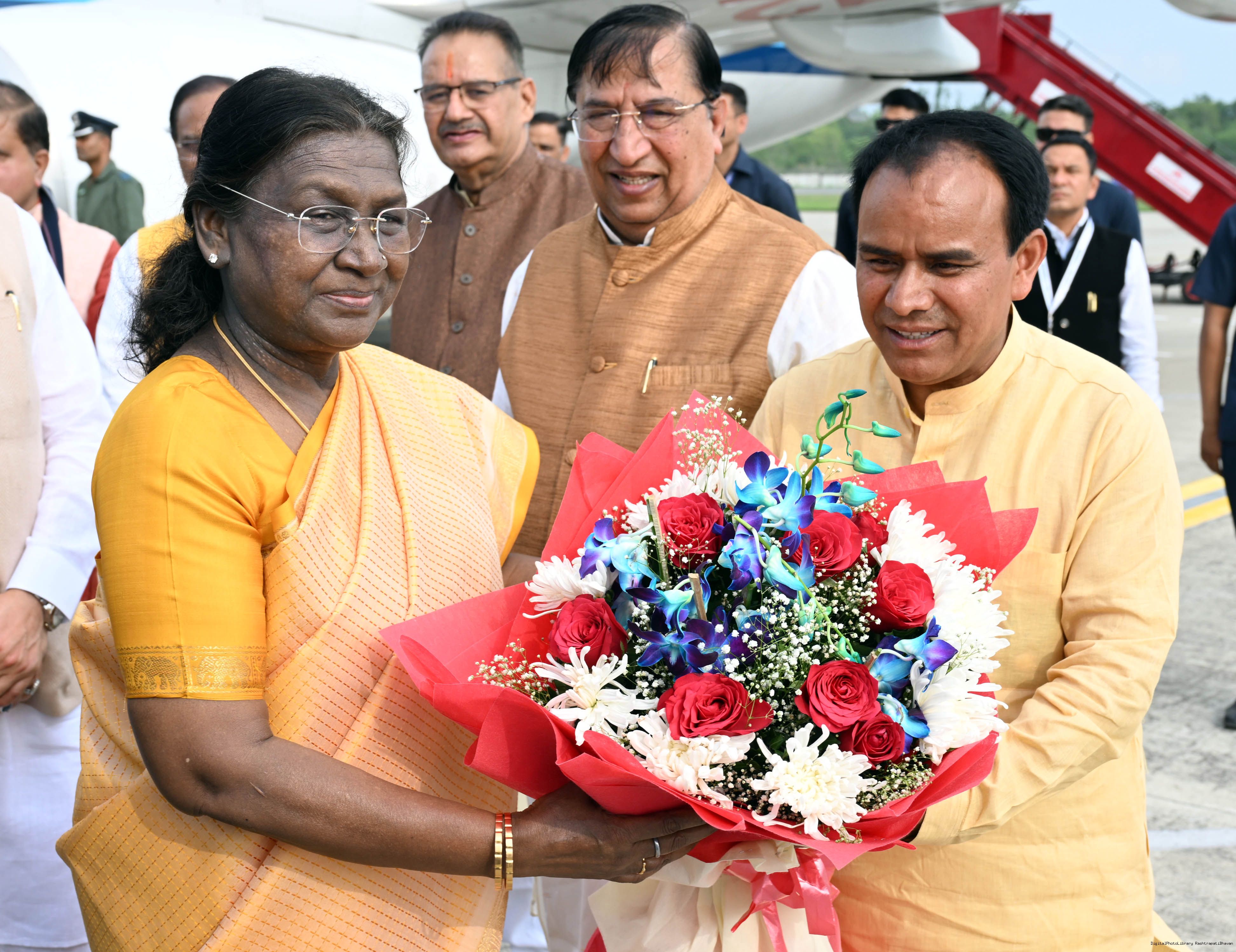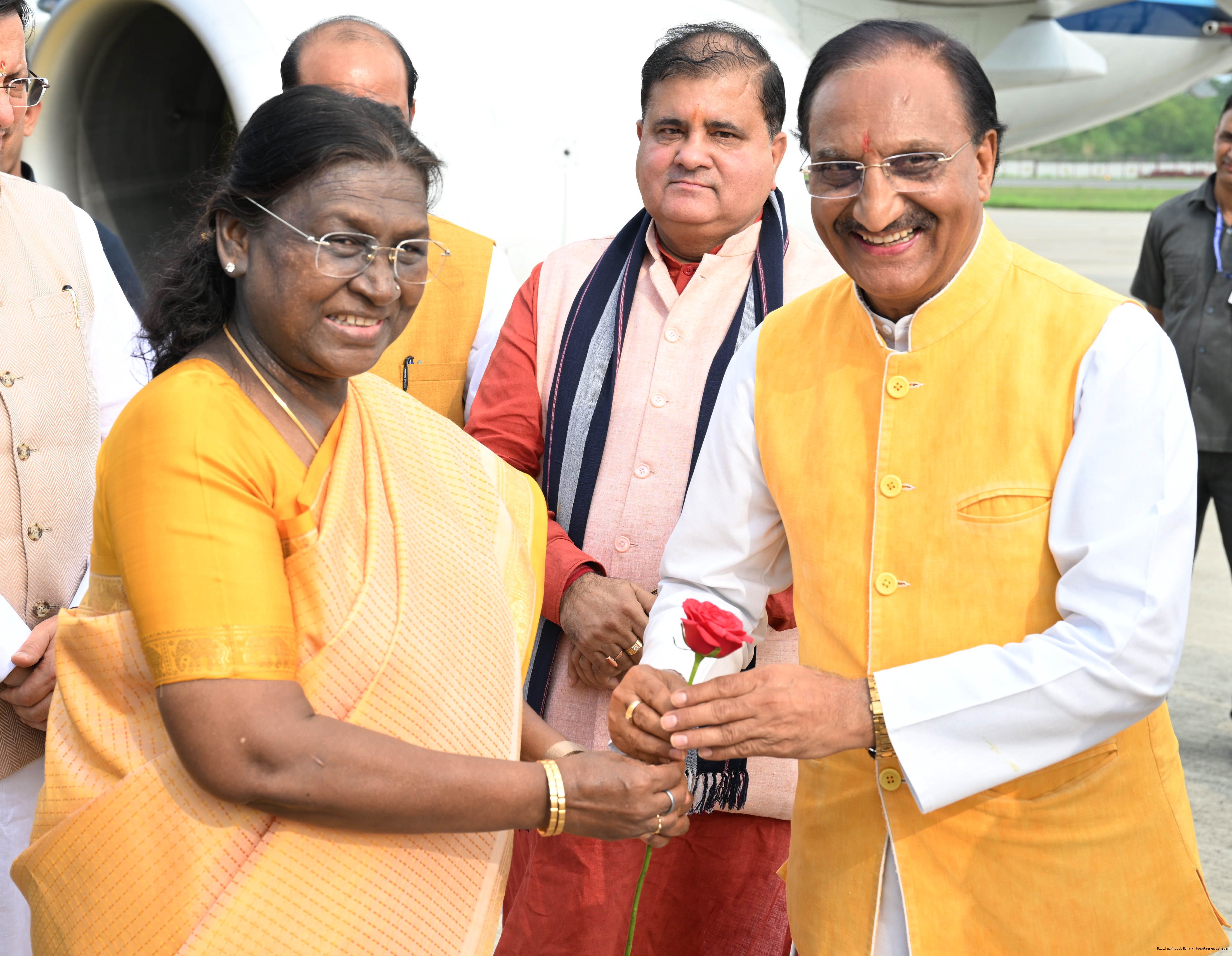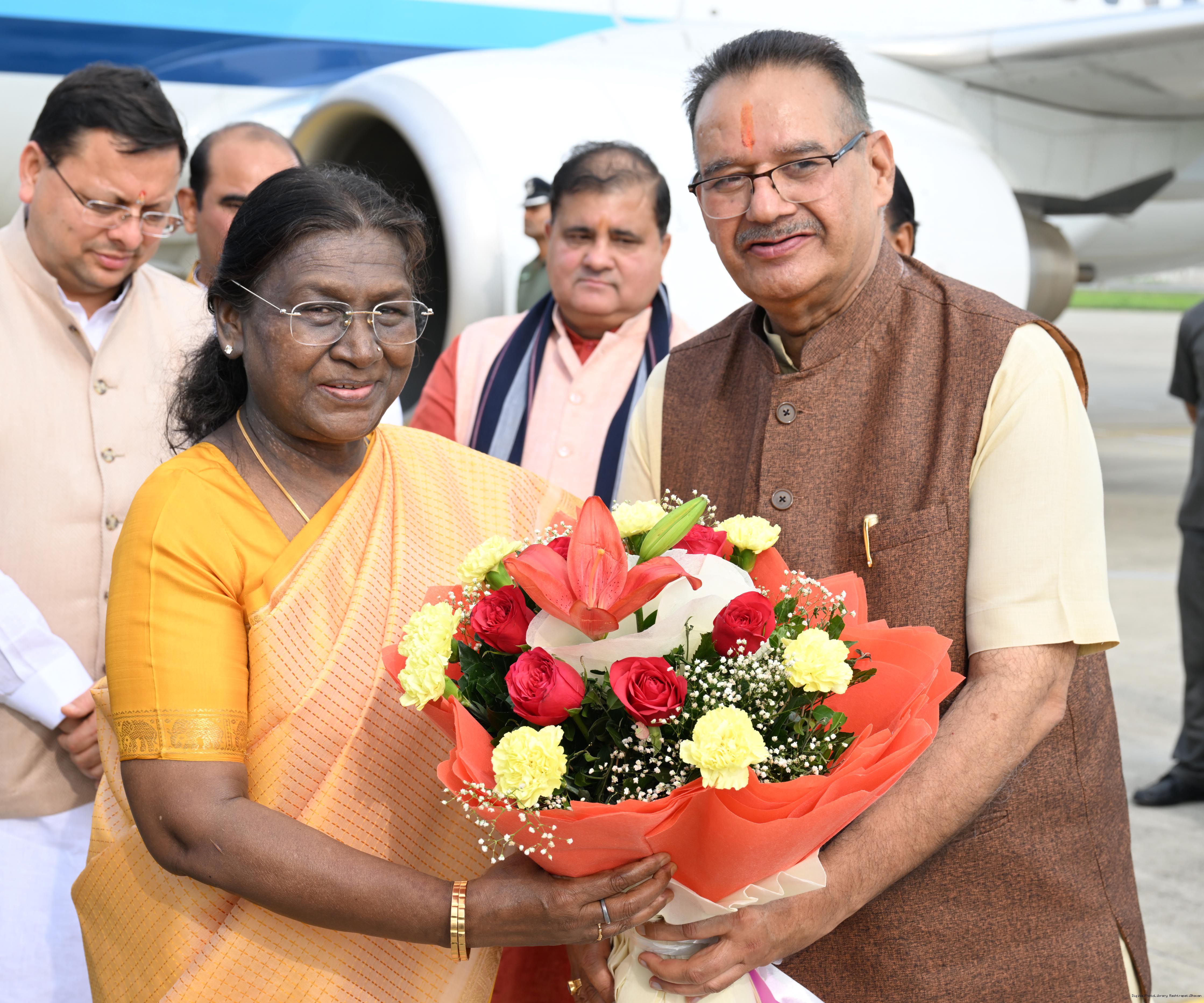 | Caption: | The Governor of Uttarakhand, Lt Gen Gurmit Singh (Retd.) and Chief Minister, Shri Pushkar Singh Dhami received the President of India, Smt Droupadi Murmu on her arrival at Dehradun on June 19, 2025. |