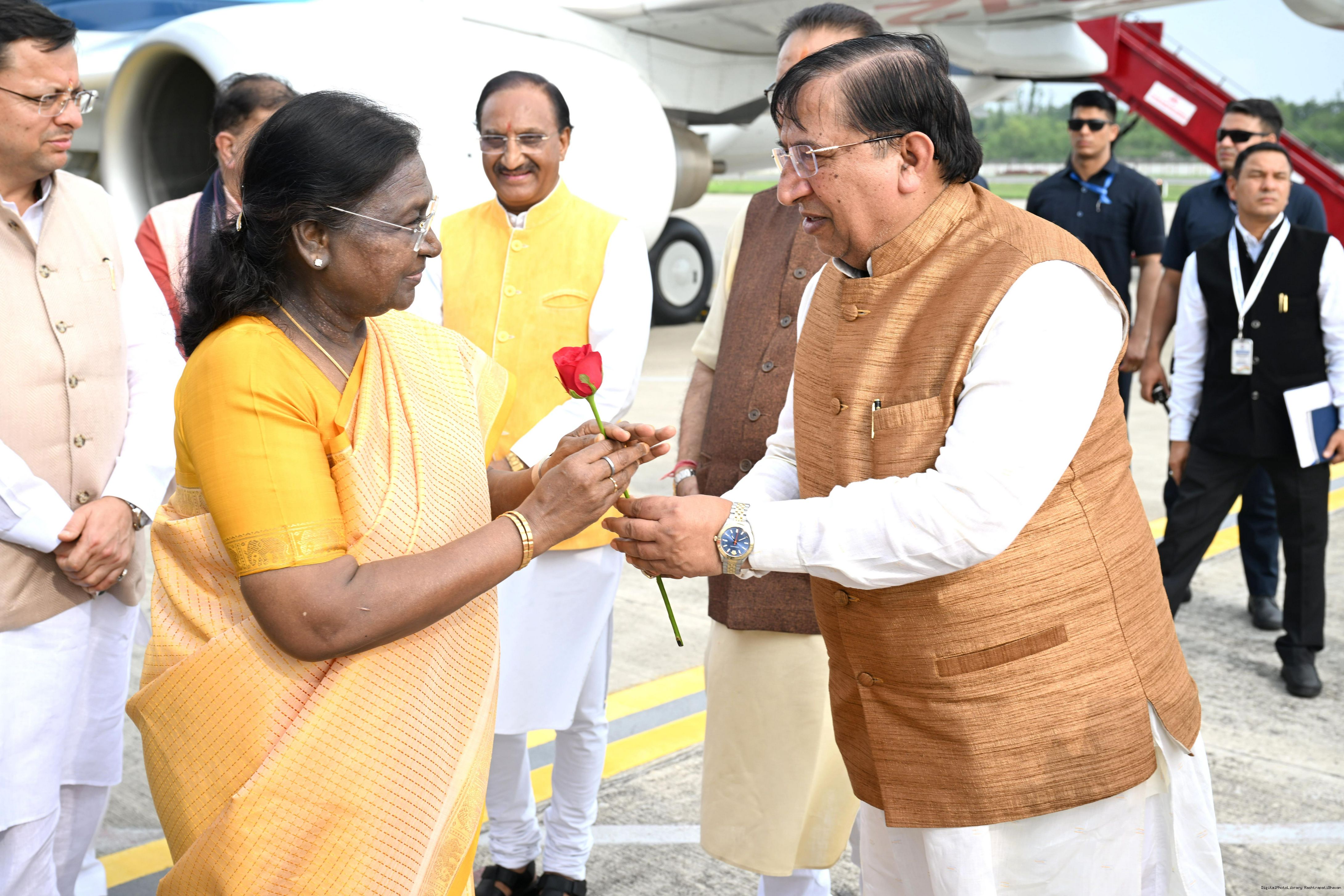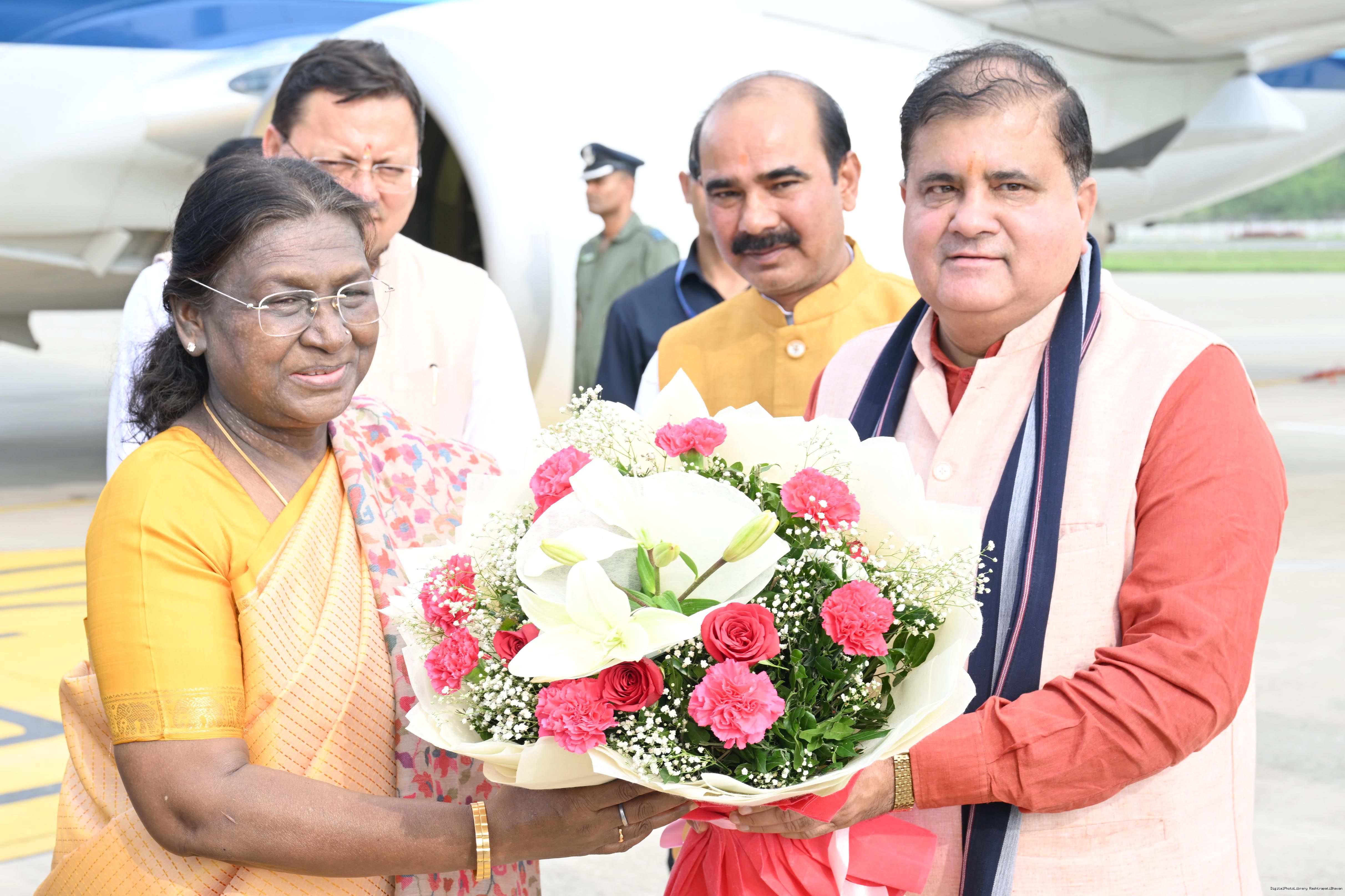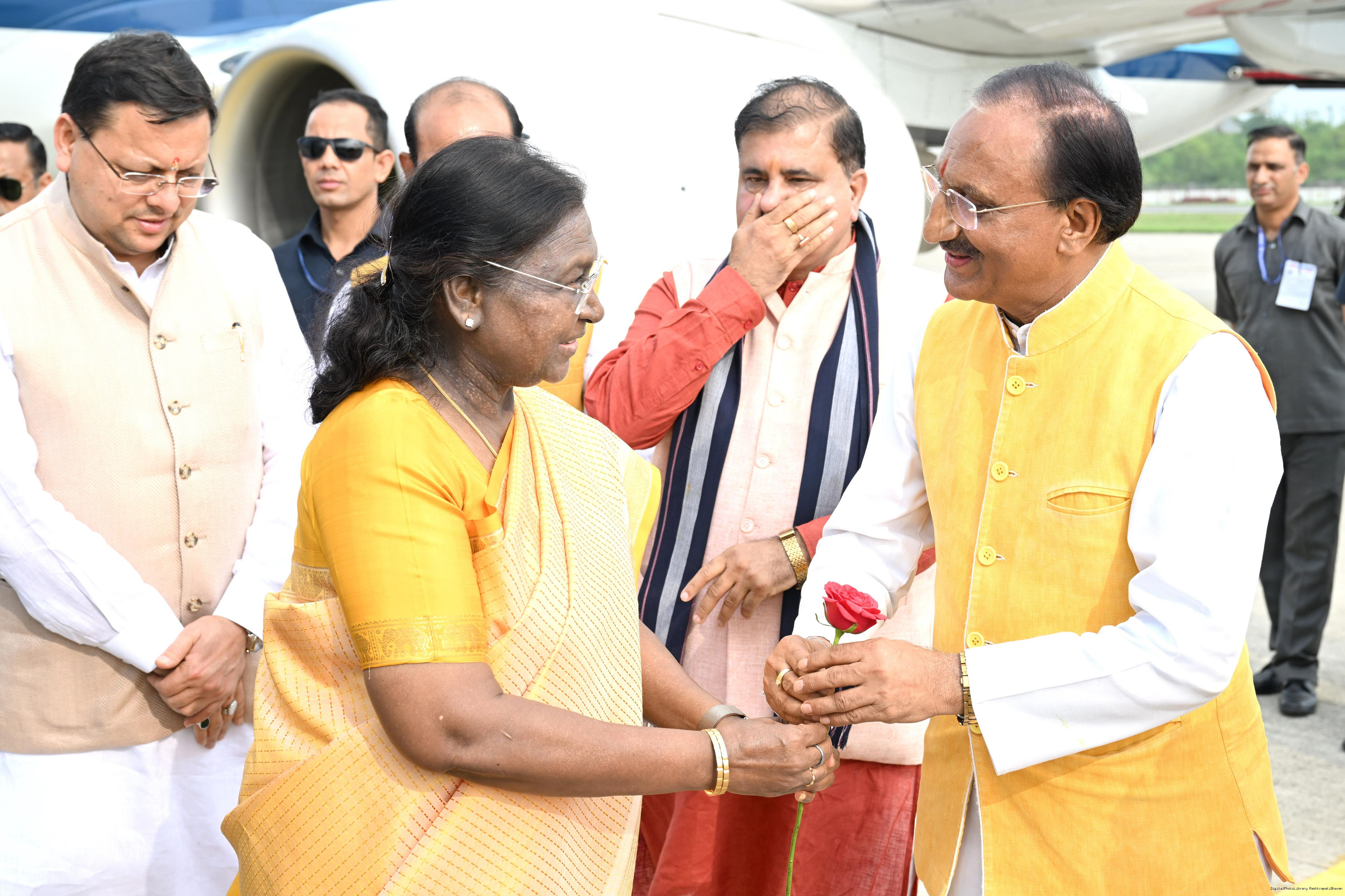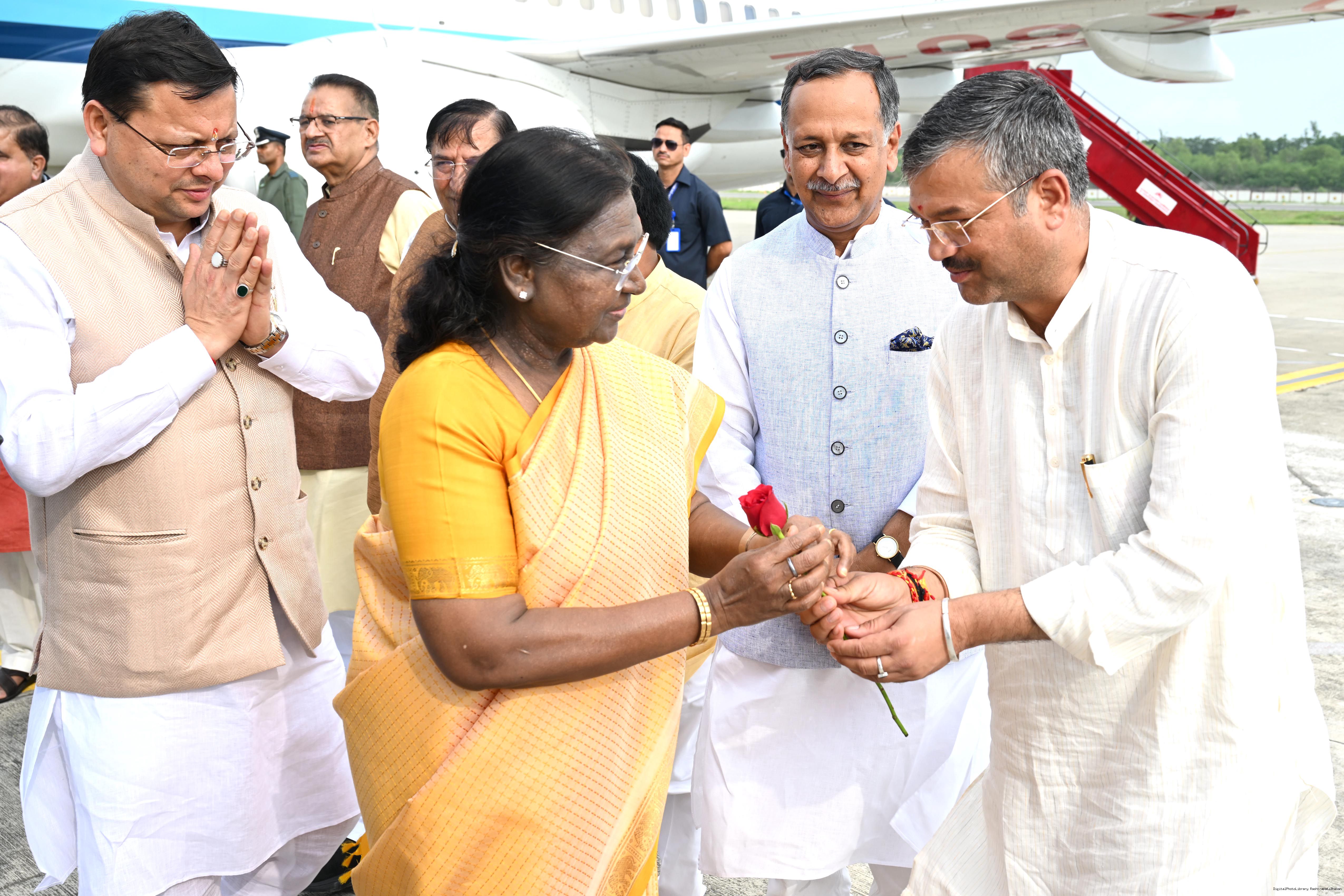 | Caption: | The Governor of Uttarakhand, Lt Gen Gurmit Singh (Retd.) and Chief Minister, Shri Pushkar Singh Dhami received the President of India, Smt Droupadi Murmu on her arrival at Dehradun on June 19, 2025. |