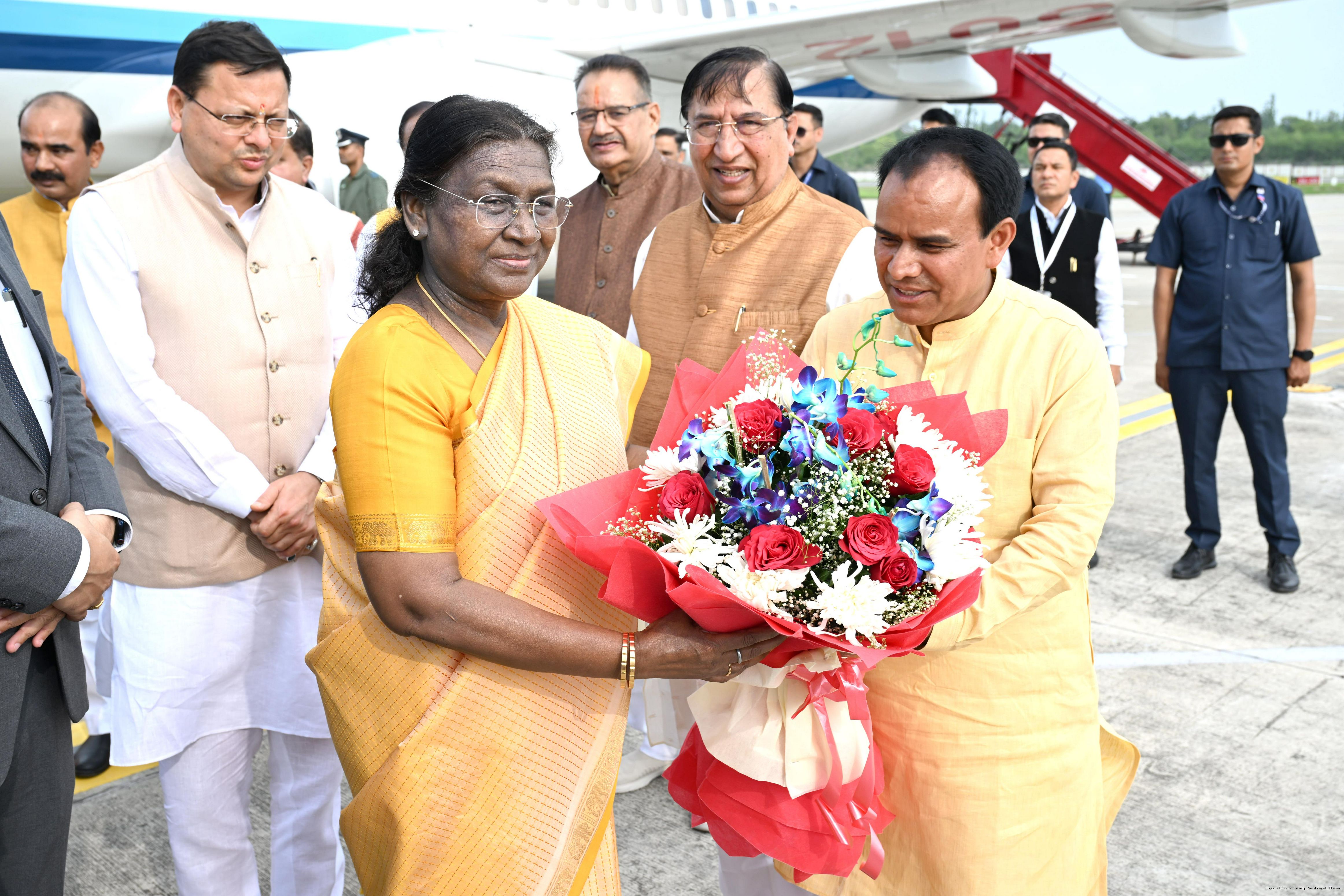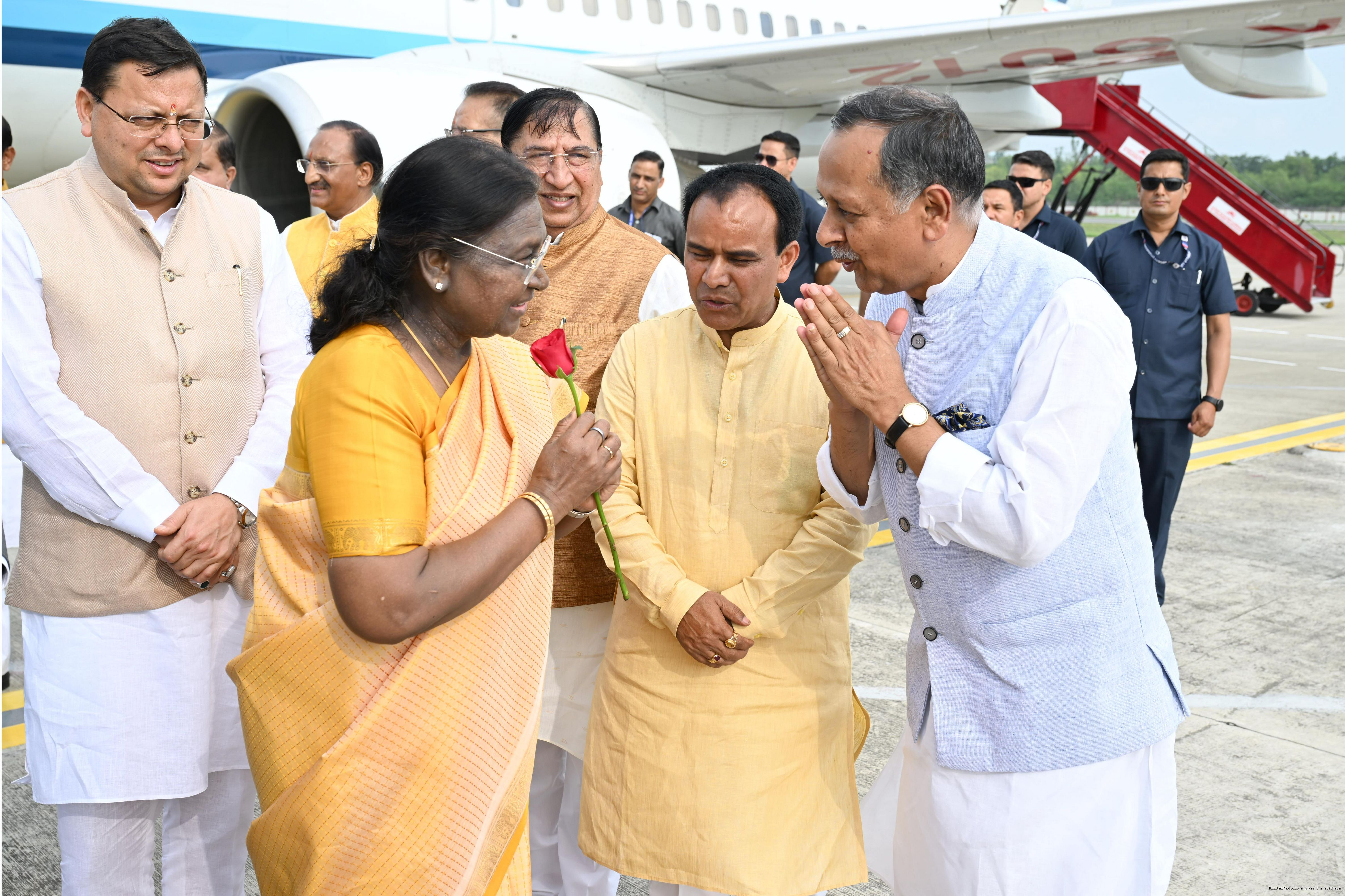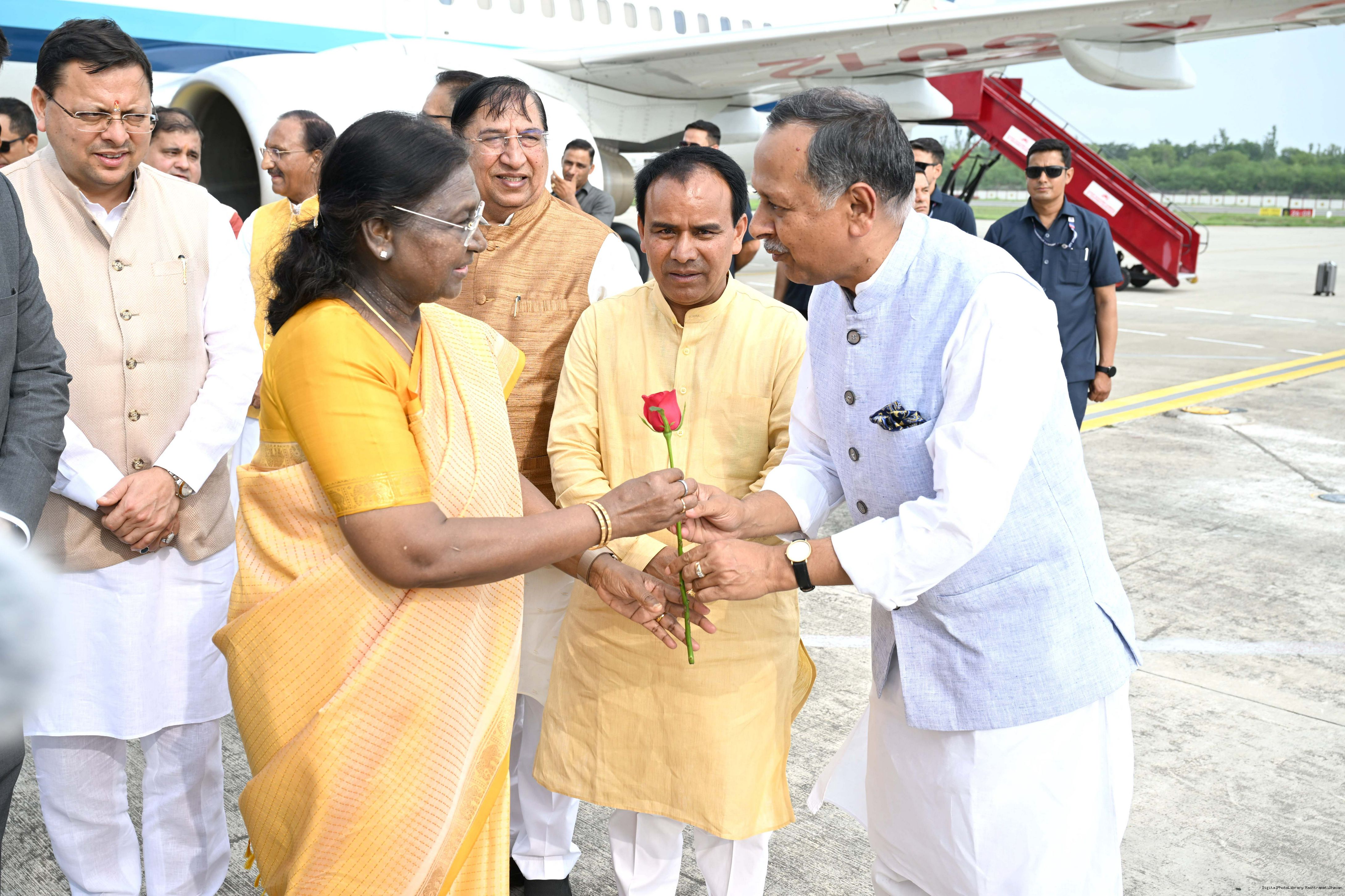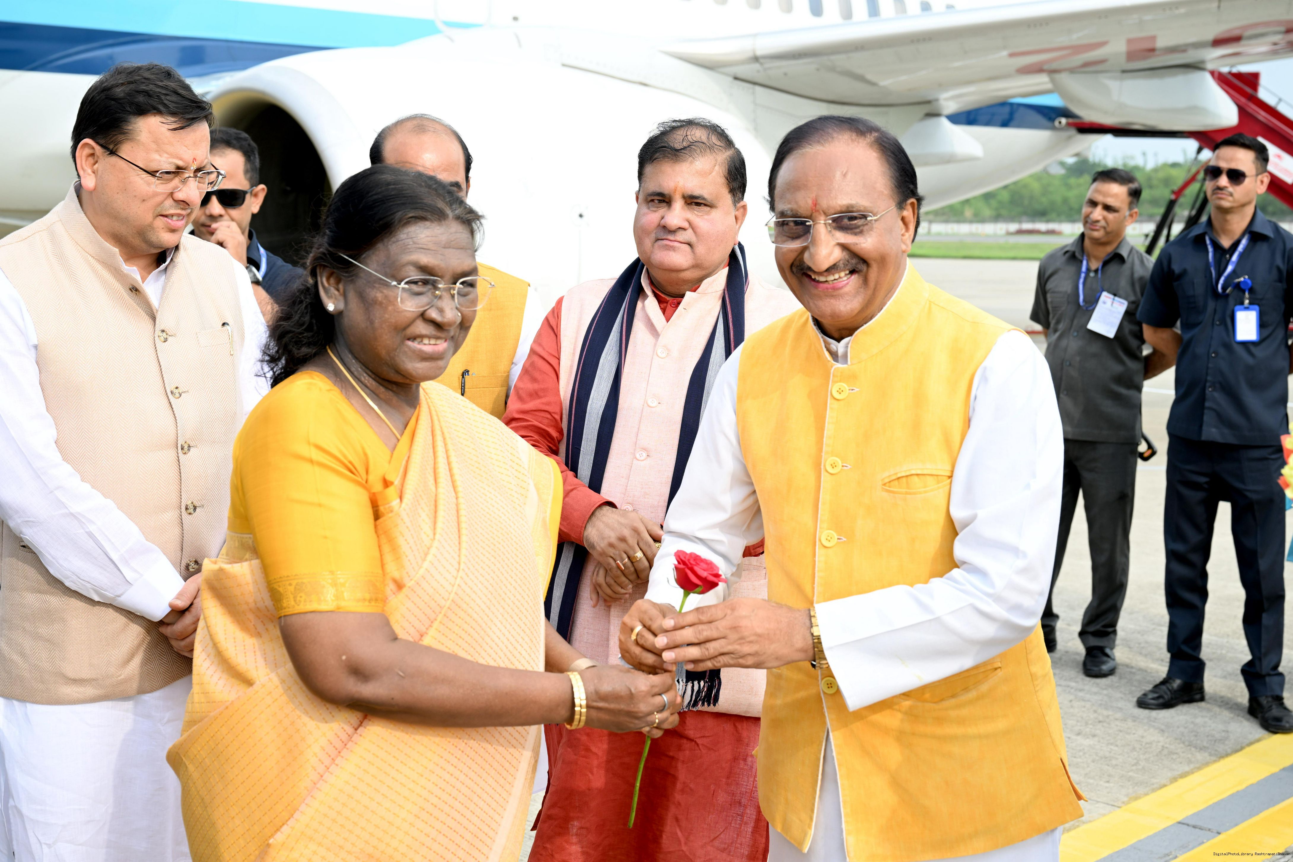 | Caption: | The Governor of Uttarakhand, Lt Gen Gurmit Singh (Retd.) and Chief Minister, Shri Pushkar Singh Dhami received the President of India, Smt Droupadi Murmu on her arrival at Dehradun on June 19, 2025. |