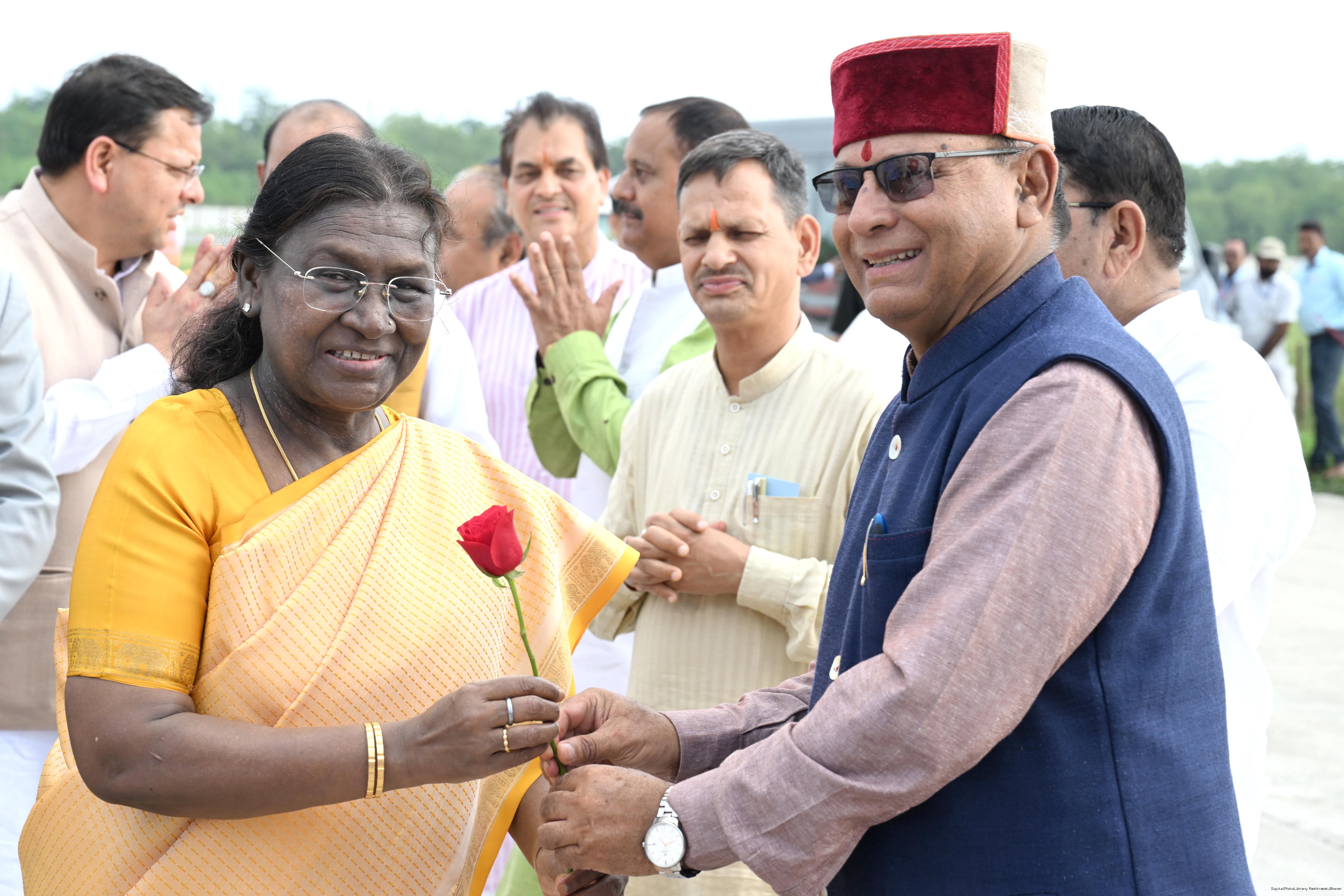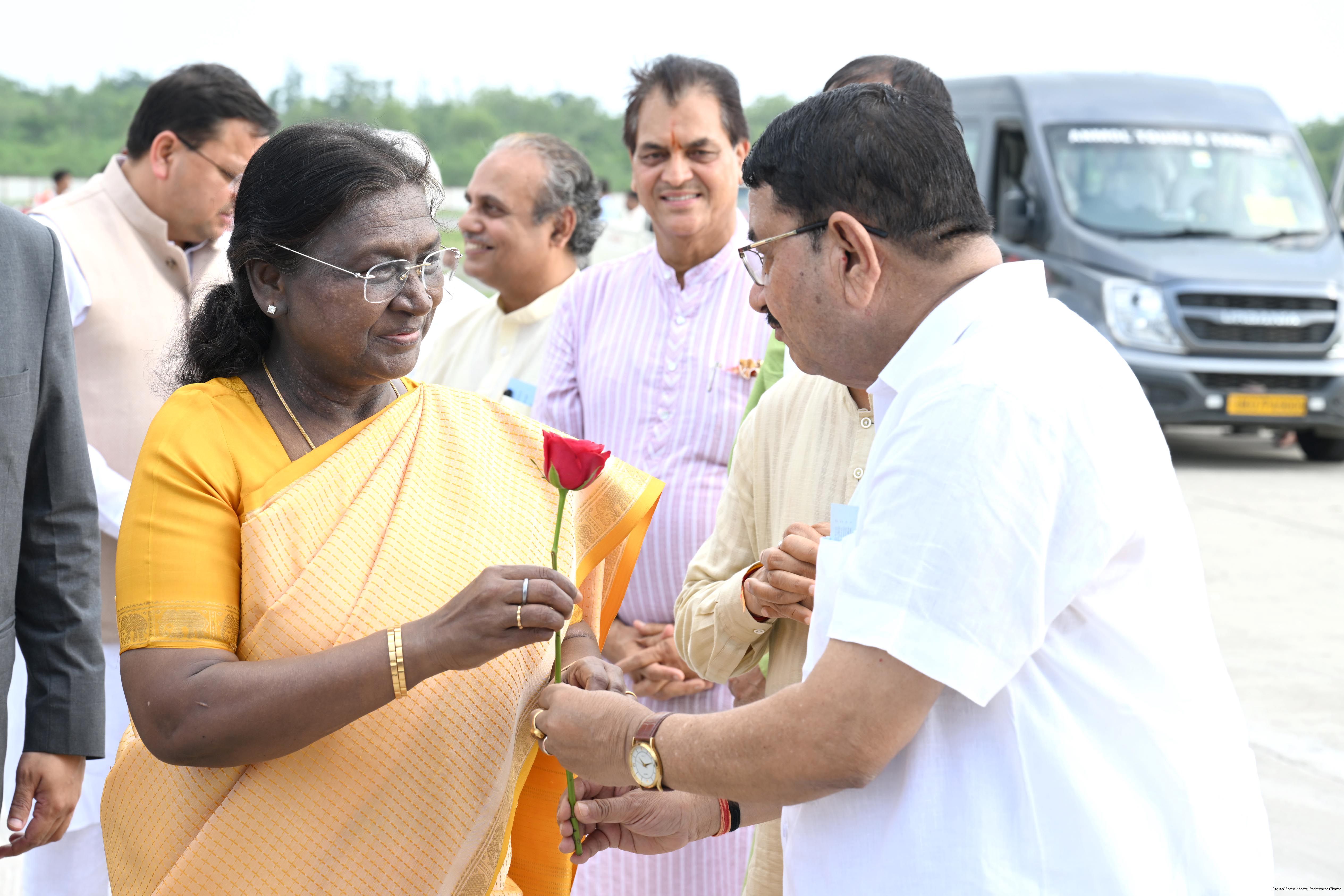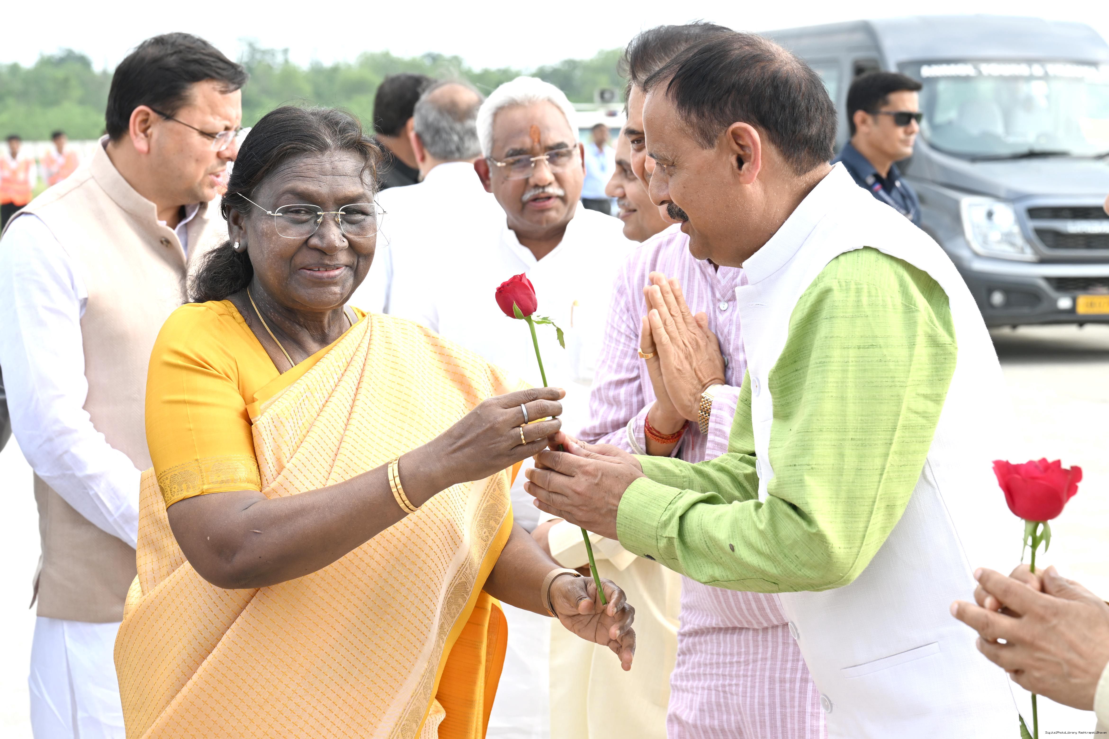 | Caption: | The Governor of Uttarakhand, Lt Gen Gurmit Singh (Retd.) and Chief Minister, Shri Pushkar Singh Dhami received the President of India, Smt Droupadi Murmu on her arrival at Dehradun on June 19, 2025. |
