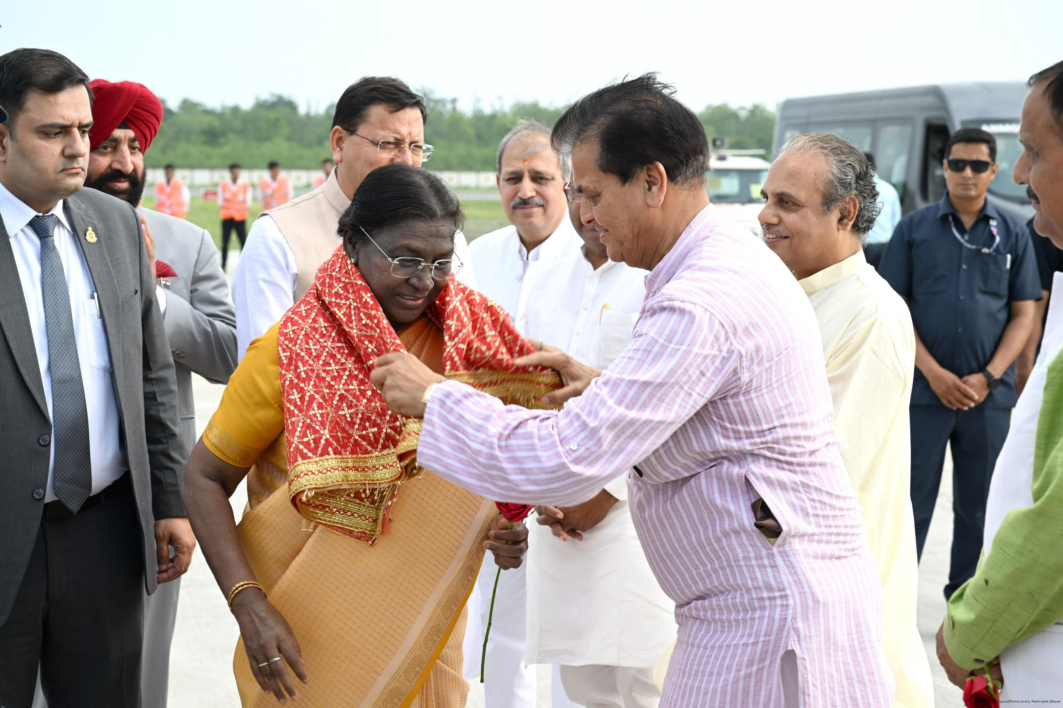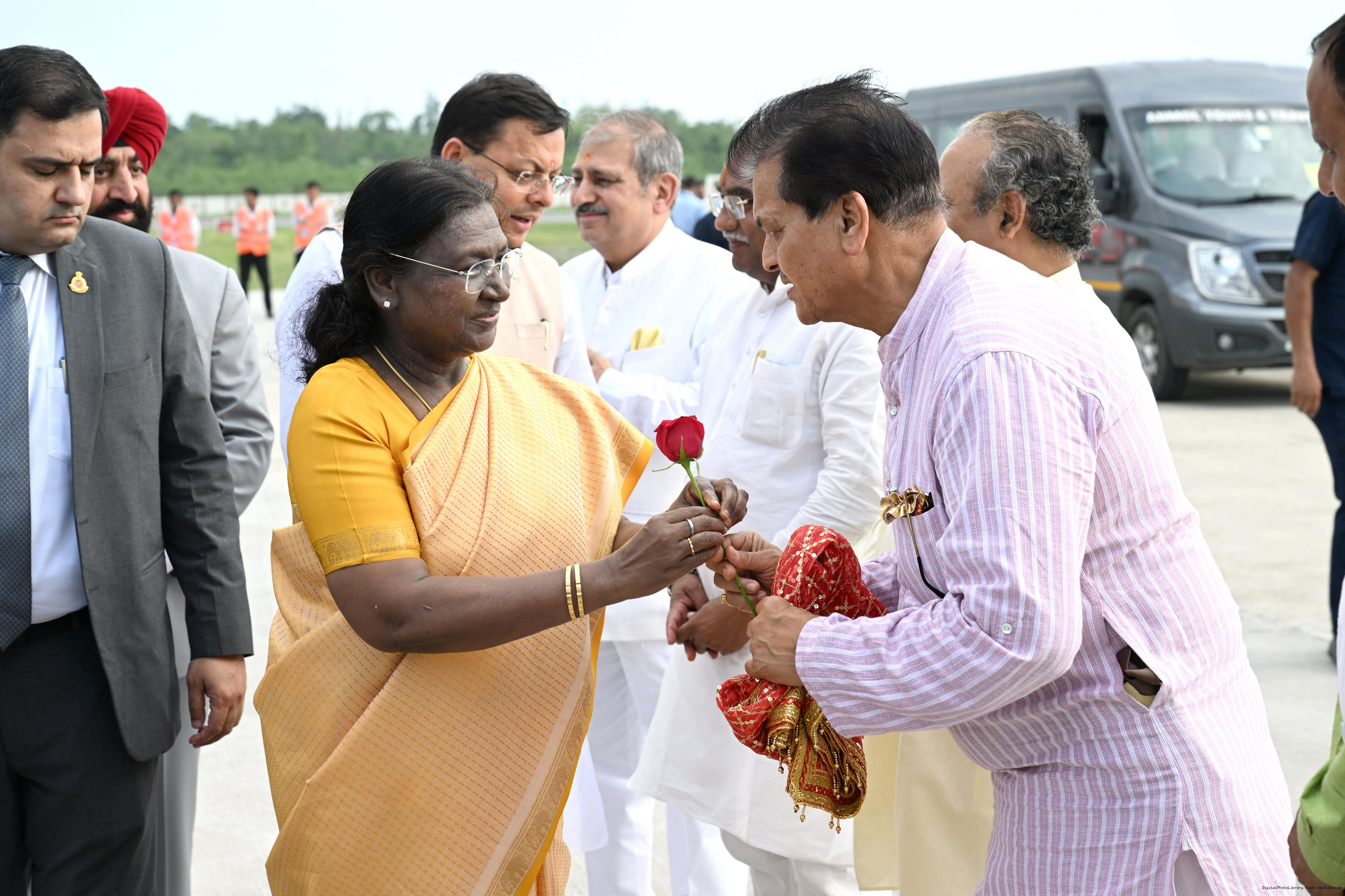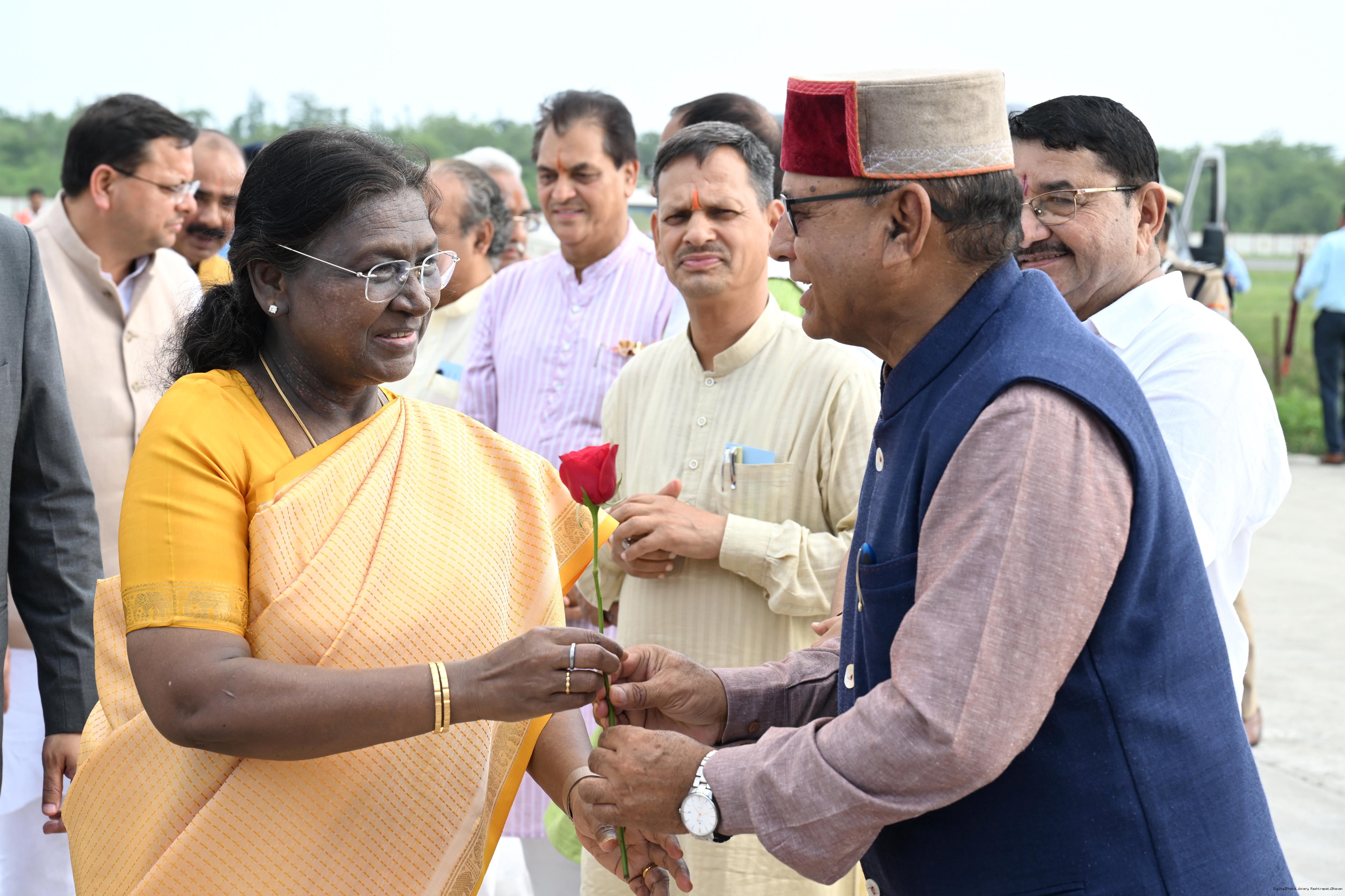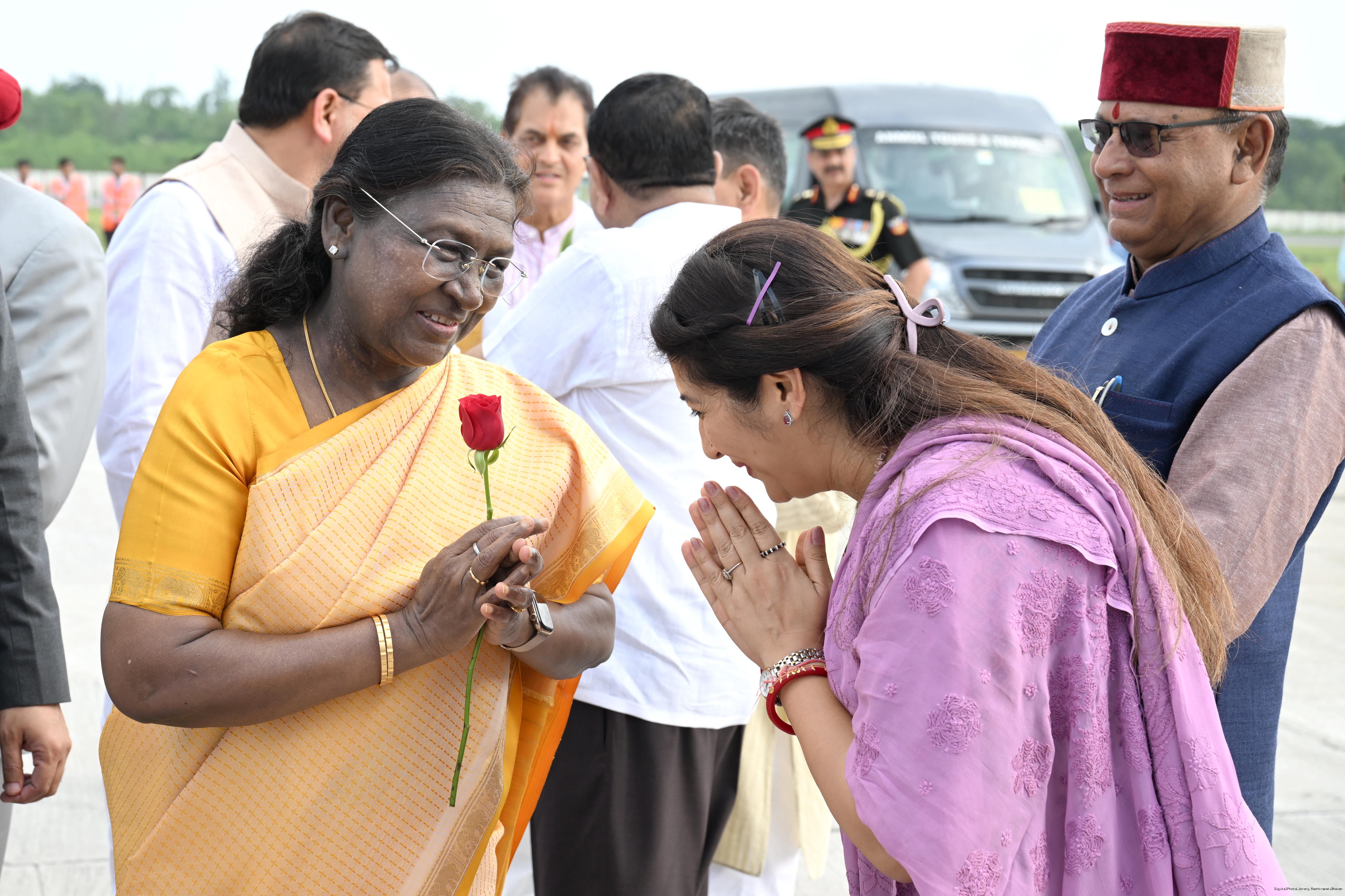 | Caption: | The Governor of Uttarakhand, Lt Gen Gurmit Singh (Retd.) and Chief Minister, Shri Pushkar Singh Dhami received the President of India, Smt Droupadi Murmu on her arrival at Dehradun on June 19, 2025. |