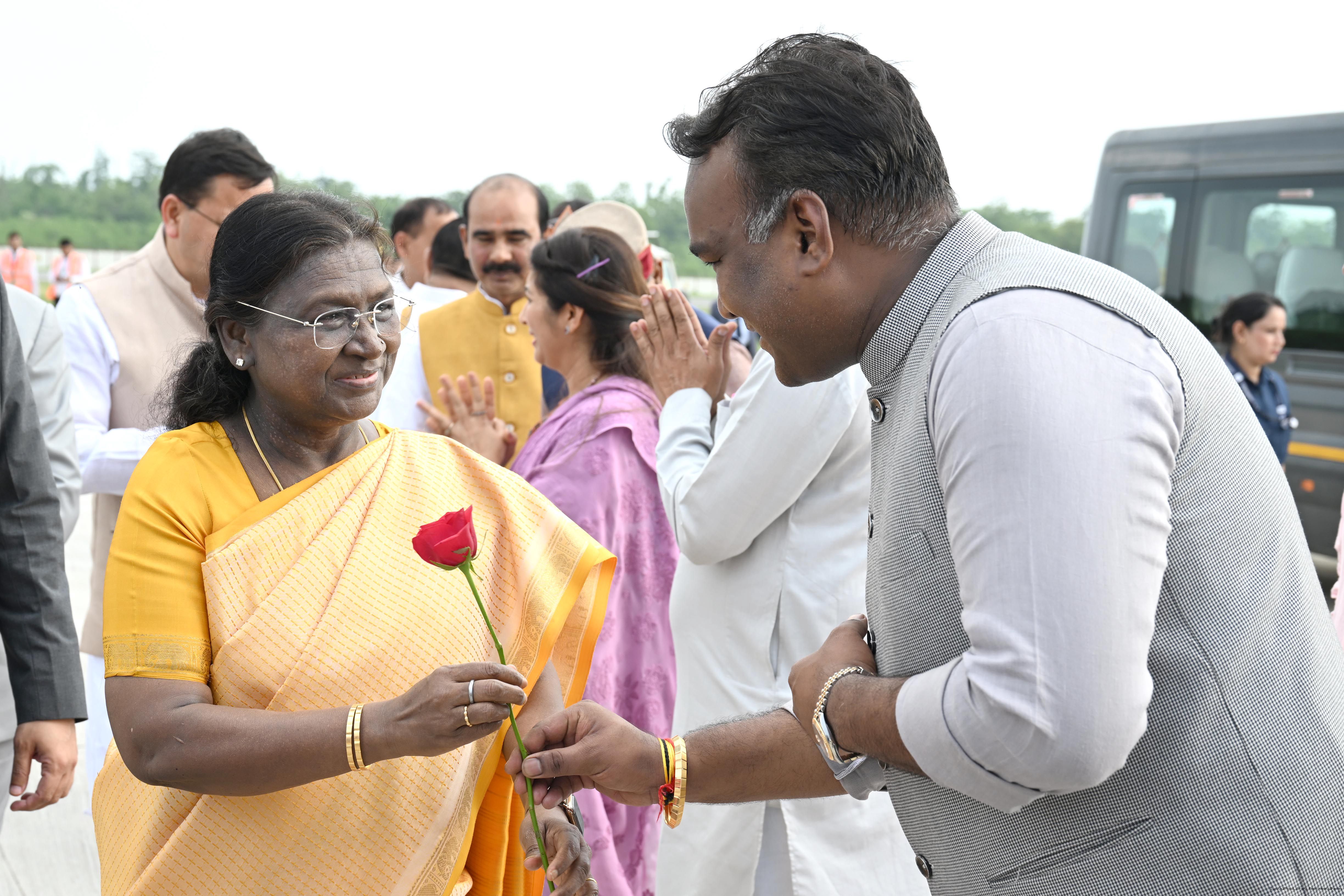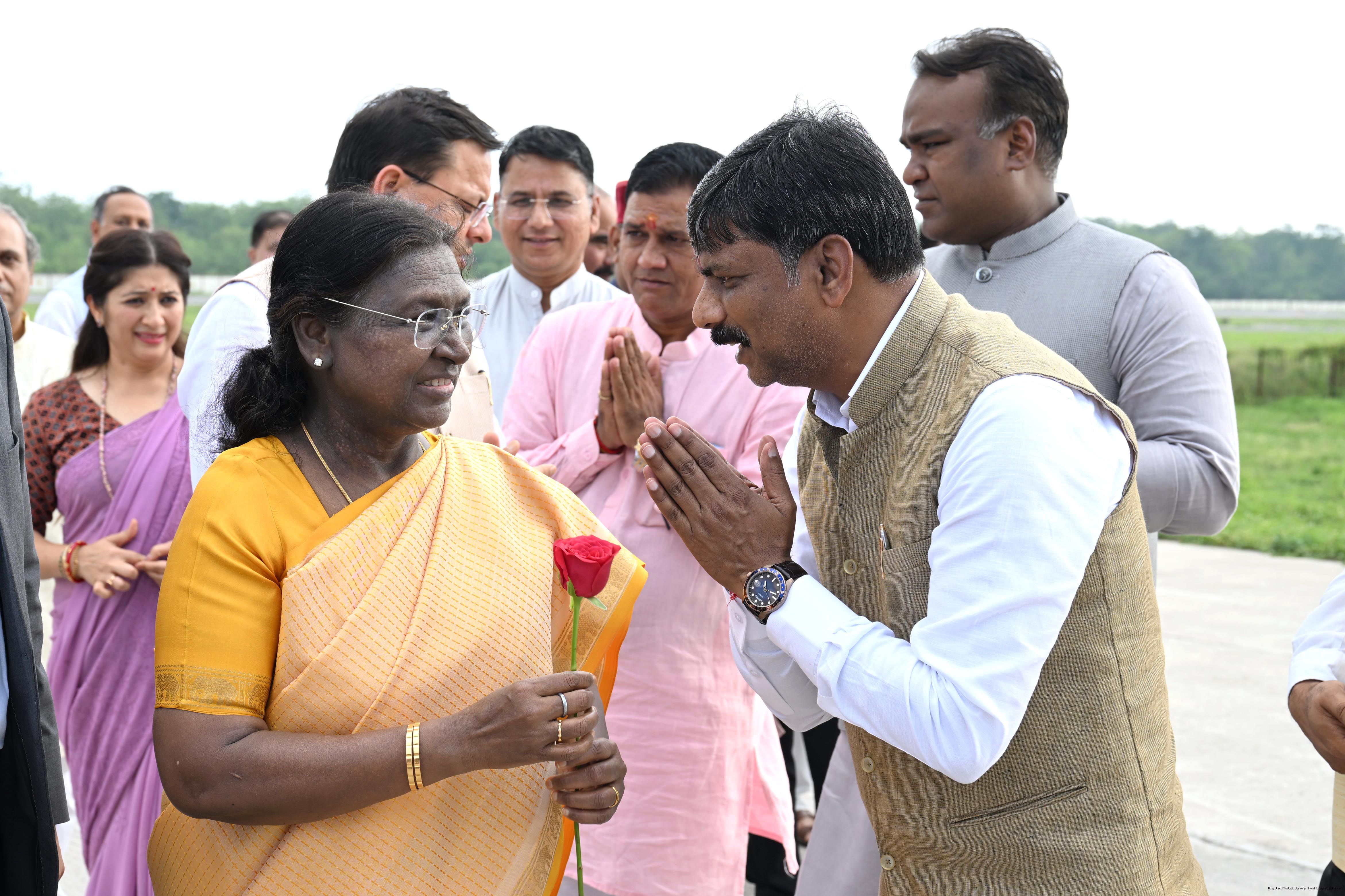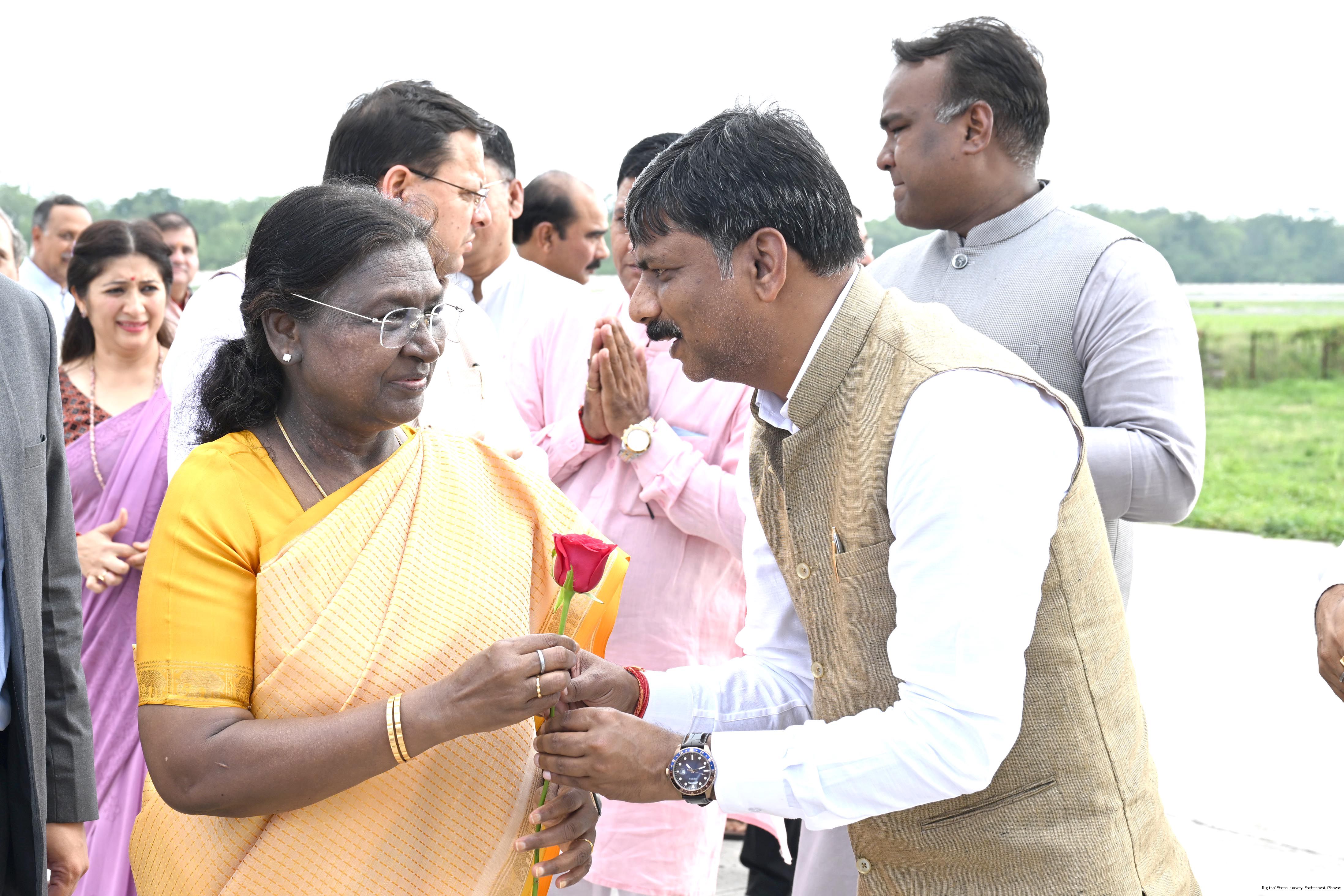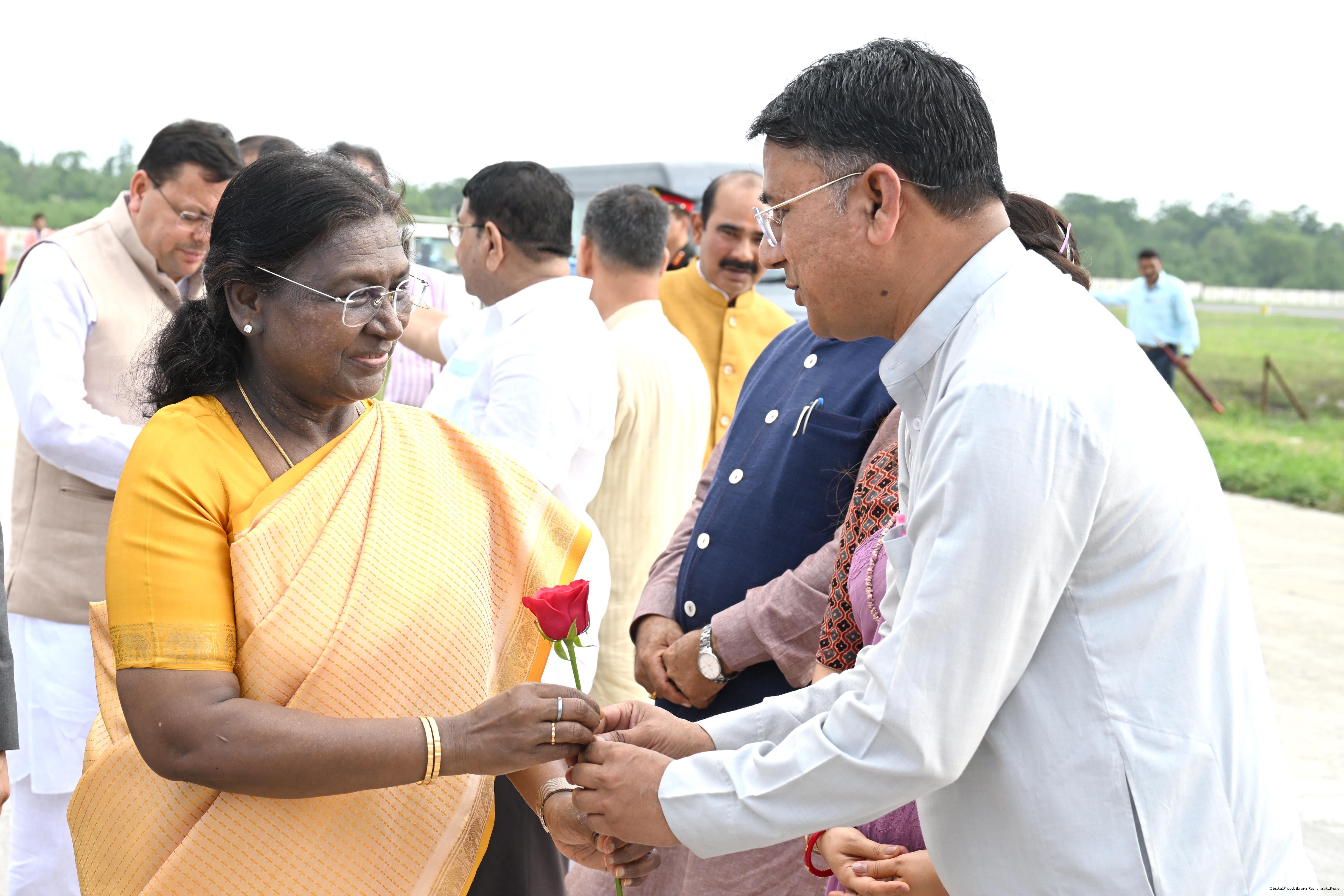 | Caption: | The Governor of Uttarakhand, Lt Gen Gurmit Singh (Retd.) and Chief Minister, Shri Pushkar Singh Dhami received the President of India, Smt Droupadi Murmu on her arrival at Dehradun on June 19, 2025. |
