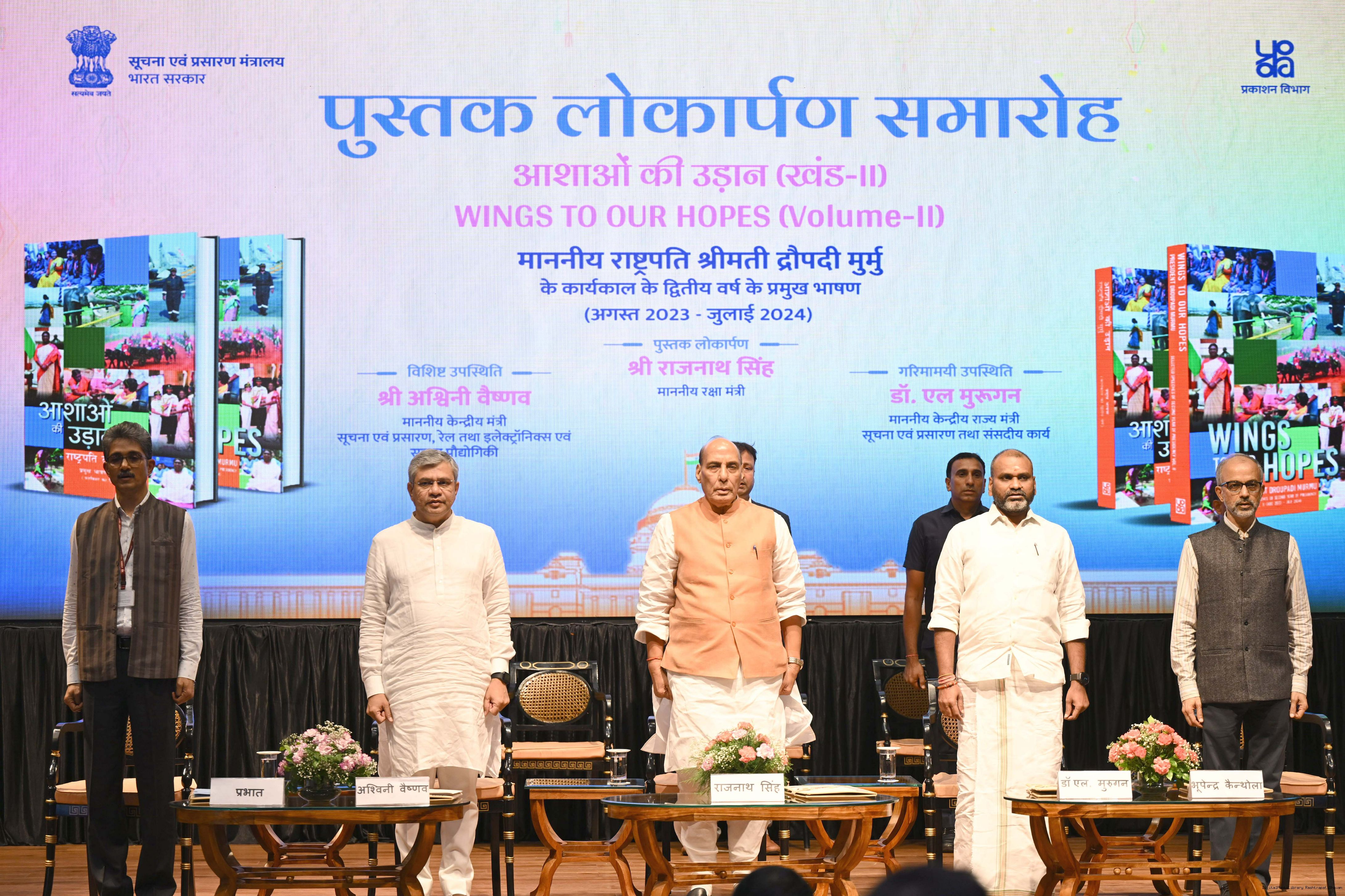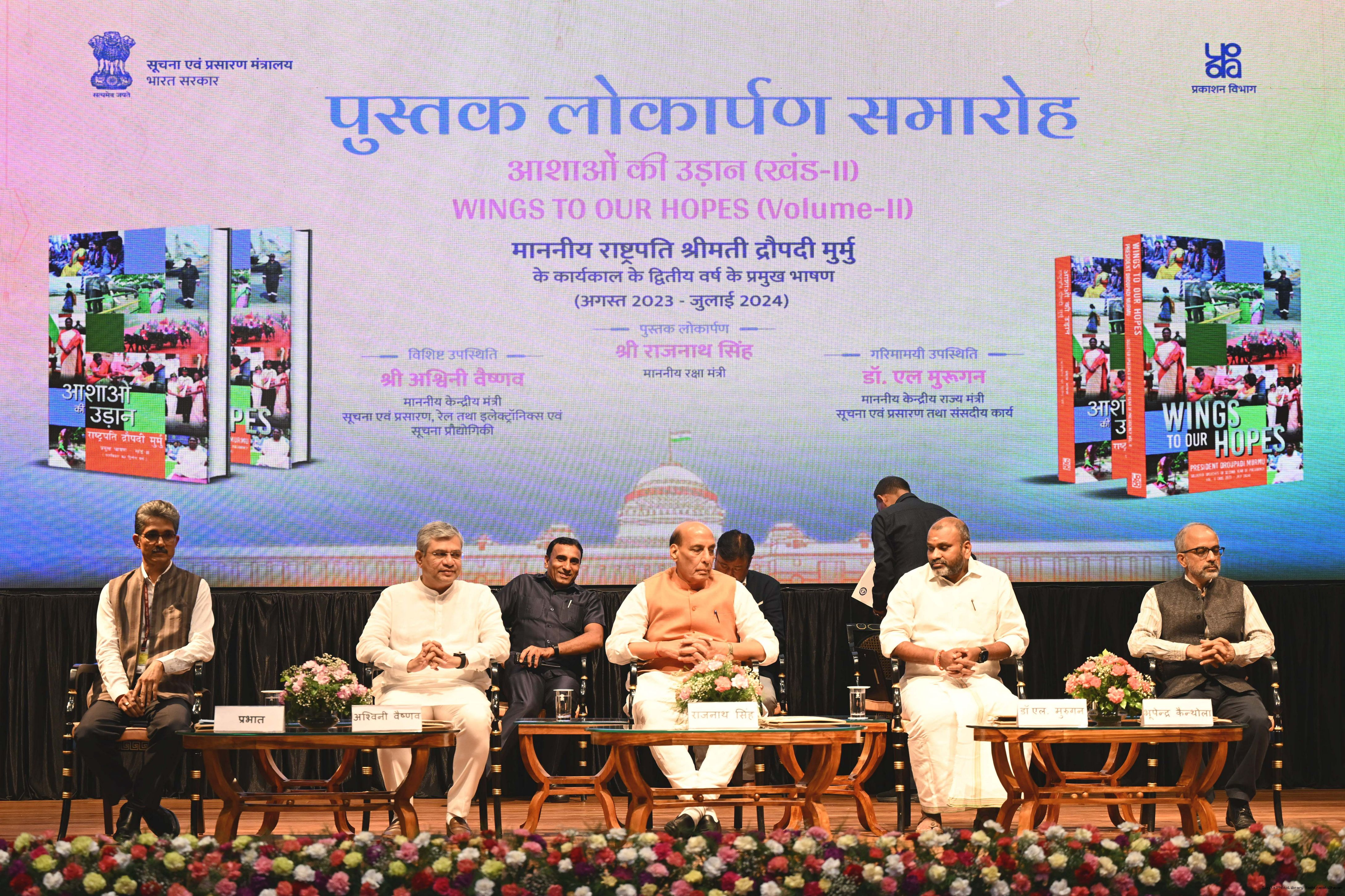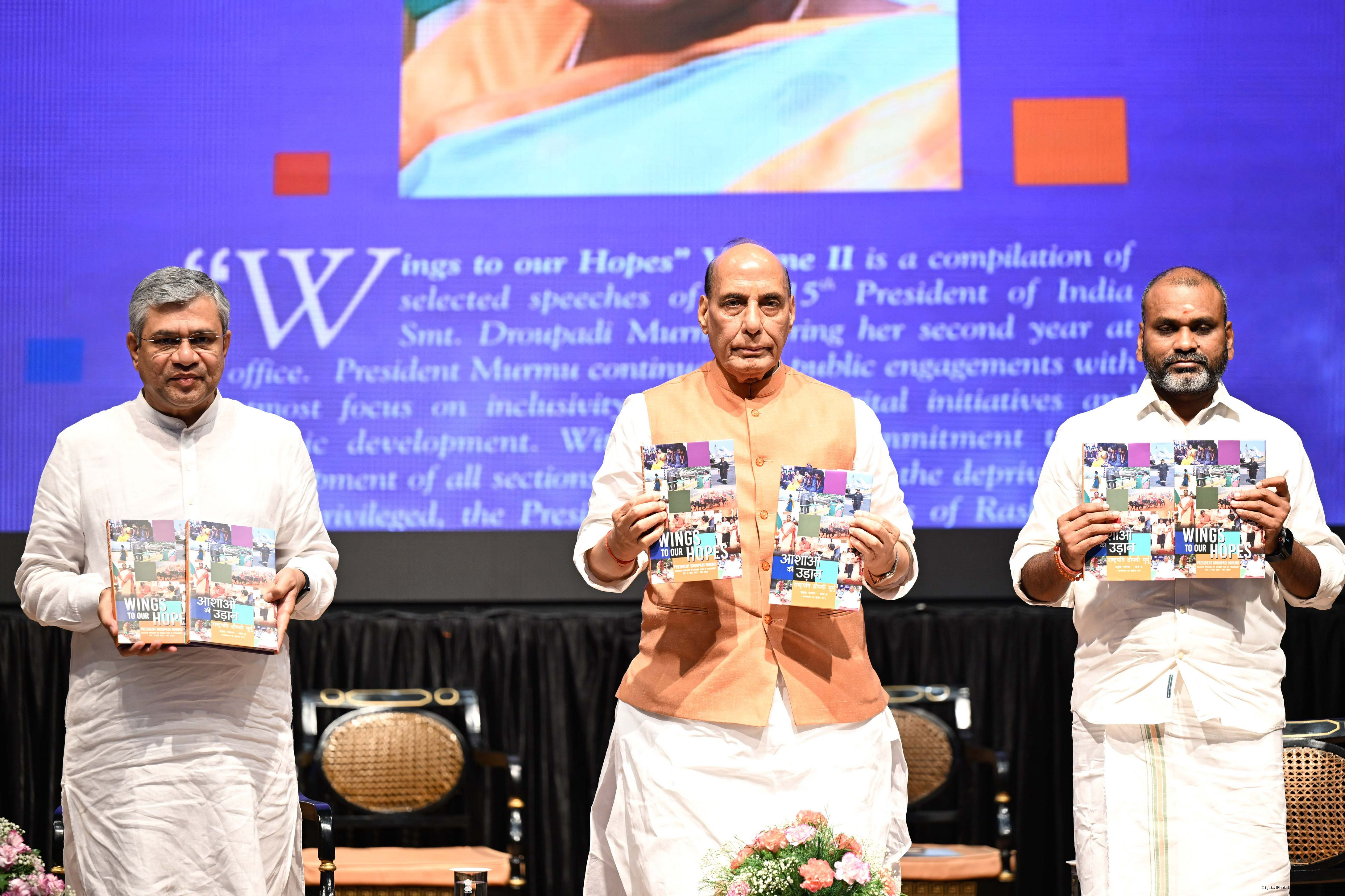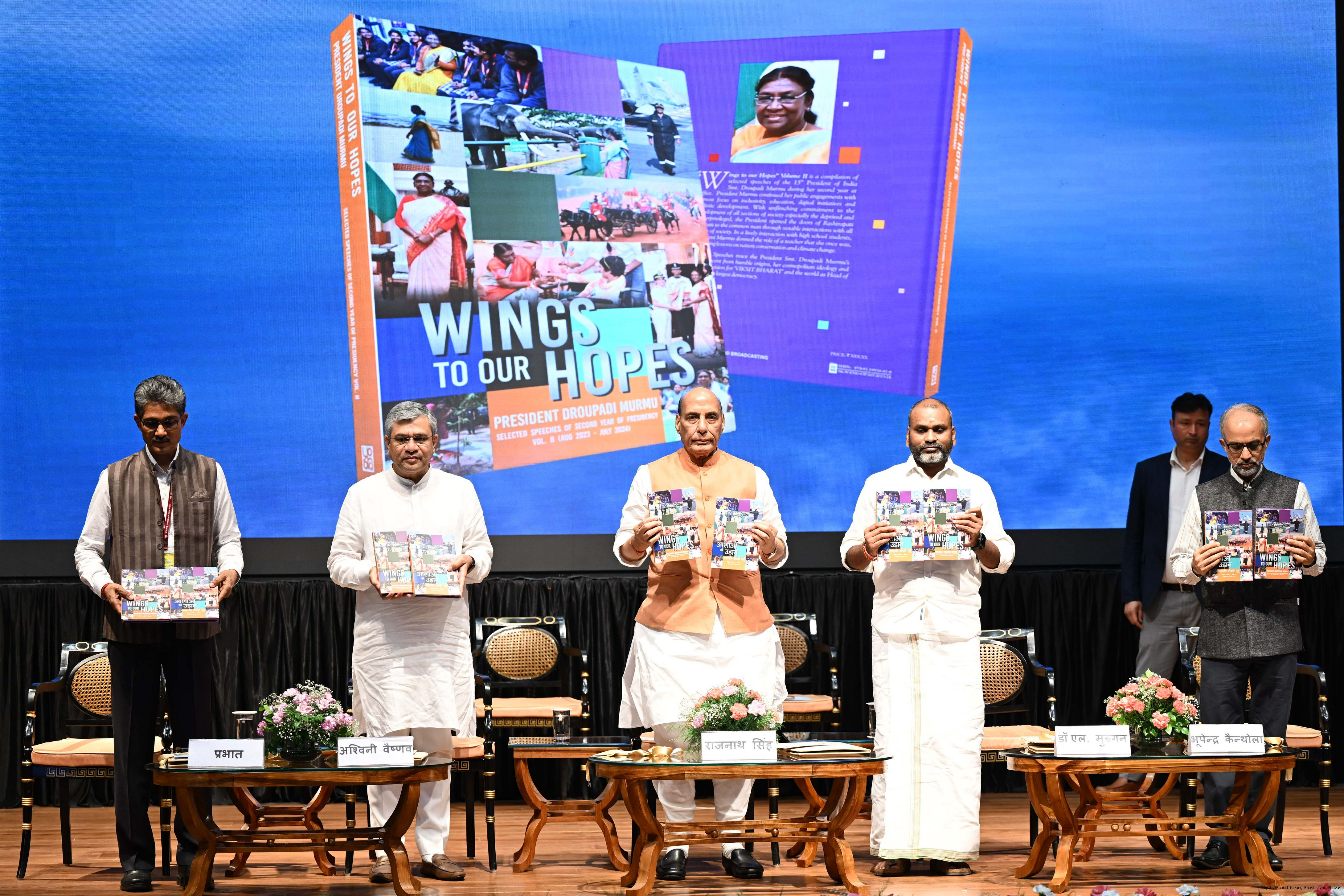 | Caption: | Raksha Mantri, Shri Rajnath Singh, along with Minister of Information Broadcasting, Shri Ashwini Vaishnaw and Minister of State for Information Broadcasting, Dr L. Murugan, presented first copies of the second volume of the books ‘Wings to Our Hopes’ and ‘Aashaon Ki Udaan’ to the President of India, Smt. Droupadi Murmu at Rashtrapati Bhavan on June 23, 2025. |