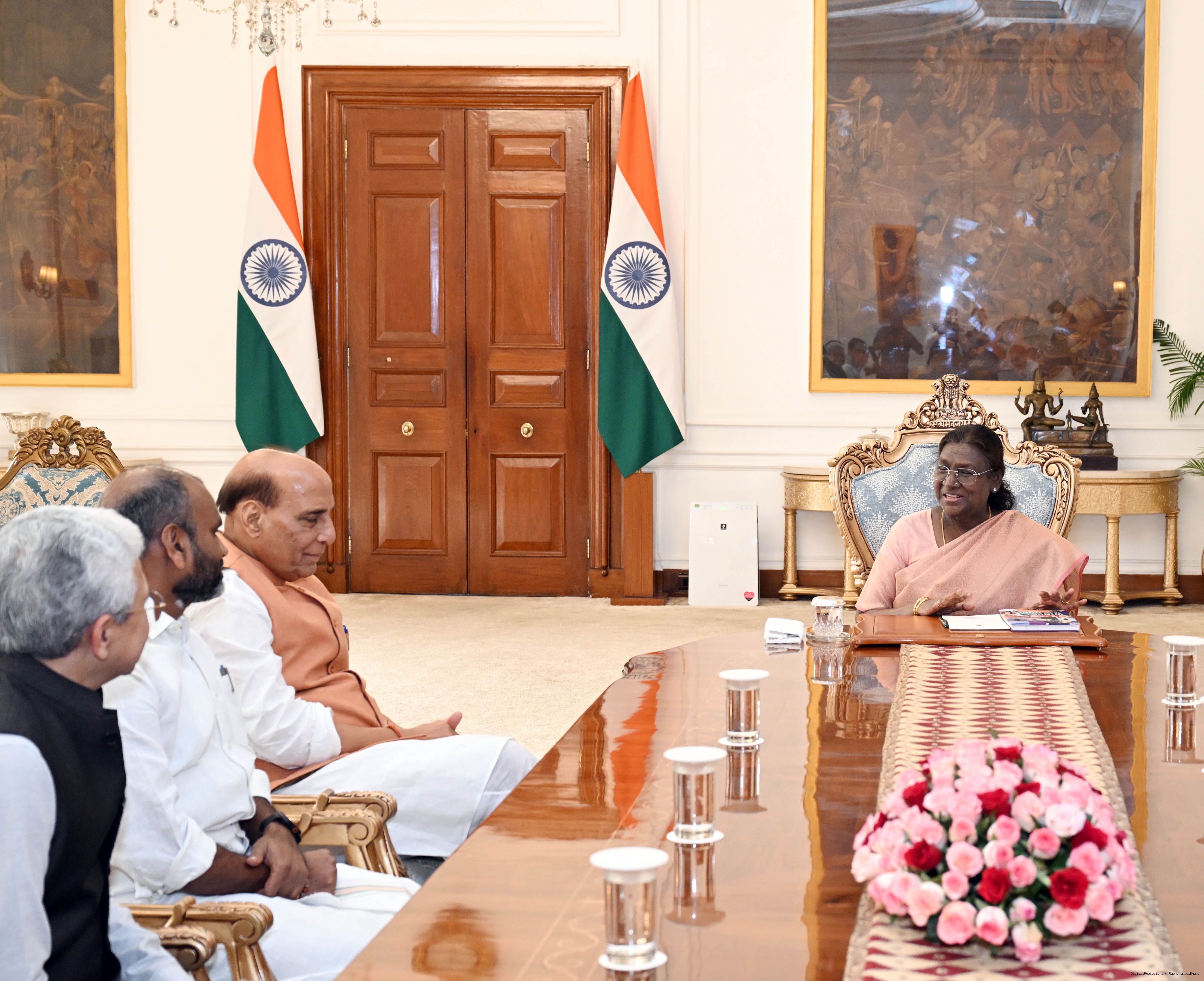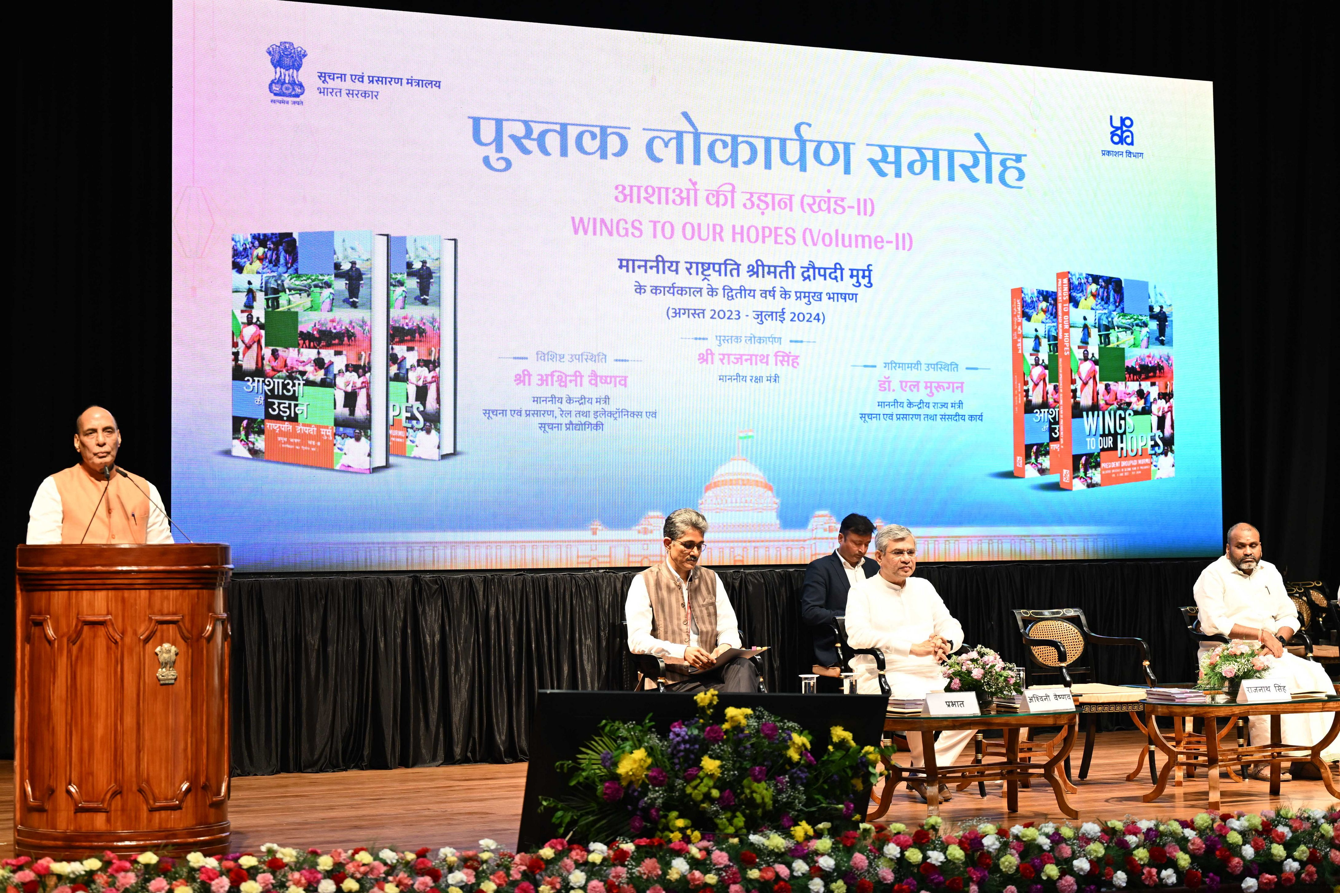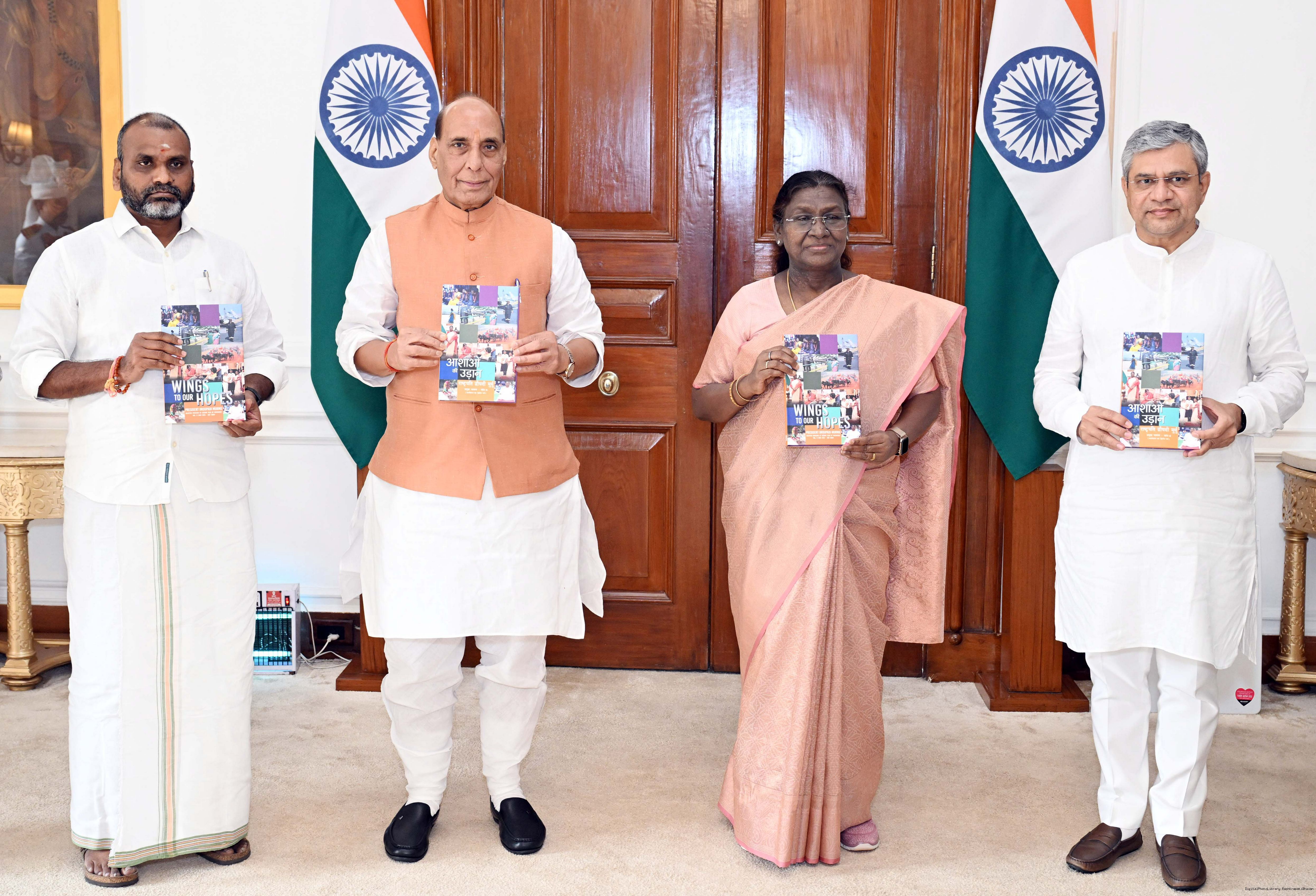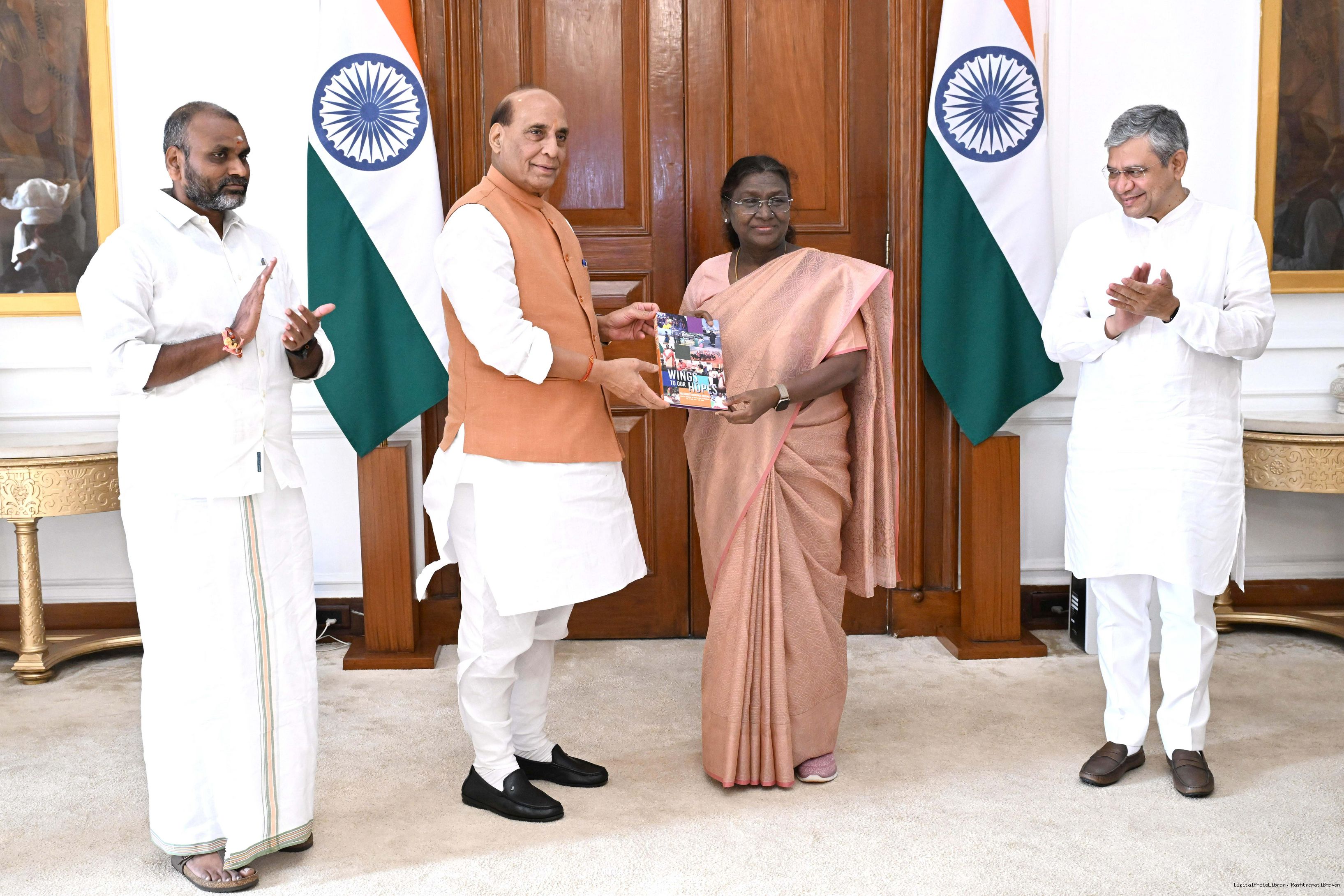 | Caption: | Raksha Mantri, Shri Rajnath Singh, along with Minister of Information Broadcasting, Shri Ashwini Vaishnaw and Minister of State for Information Broadcasting, Dr L. Murugan, presented first copies of the second volume of the books ‘Wings to Our Hopes’ and ‘Aashaon Ki Udaan’ to the President of India, Smt. Droupadi Murmu at Rashtrapati Bhavan on June 23, 2025. |