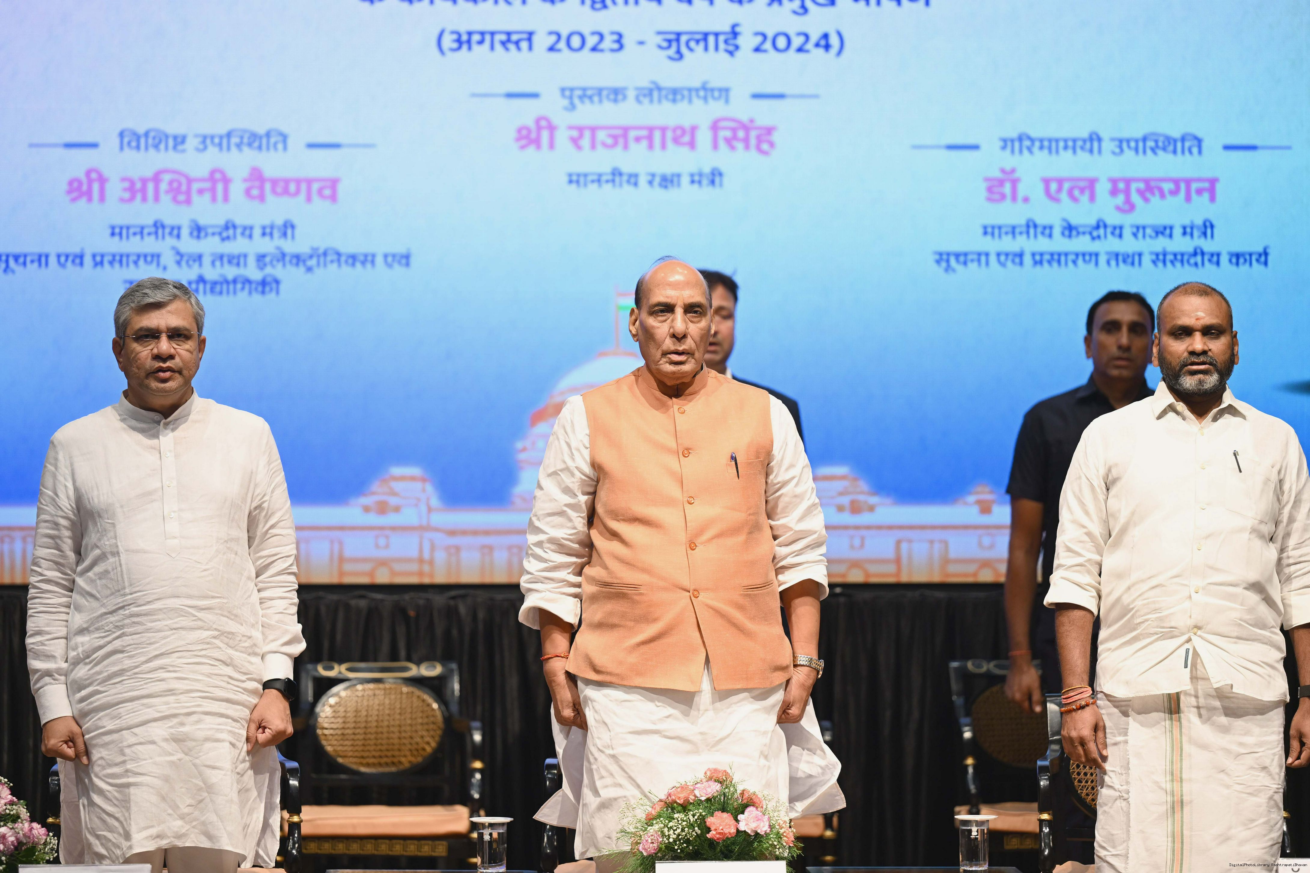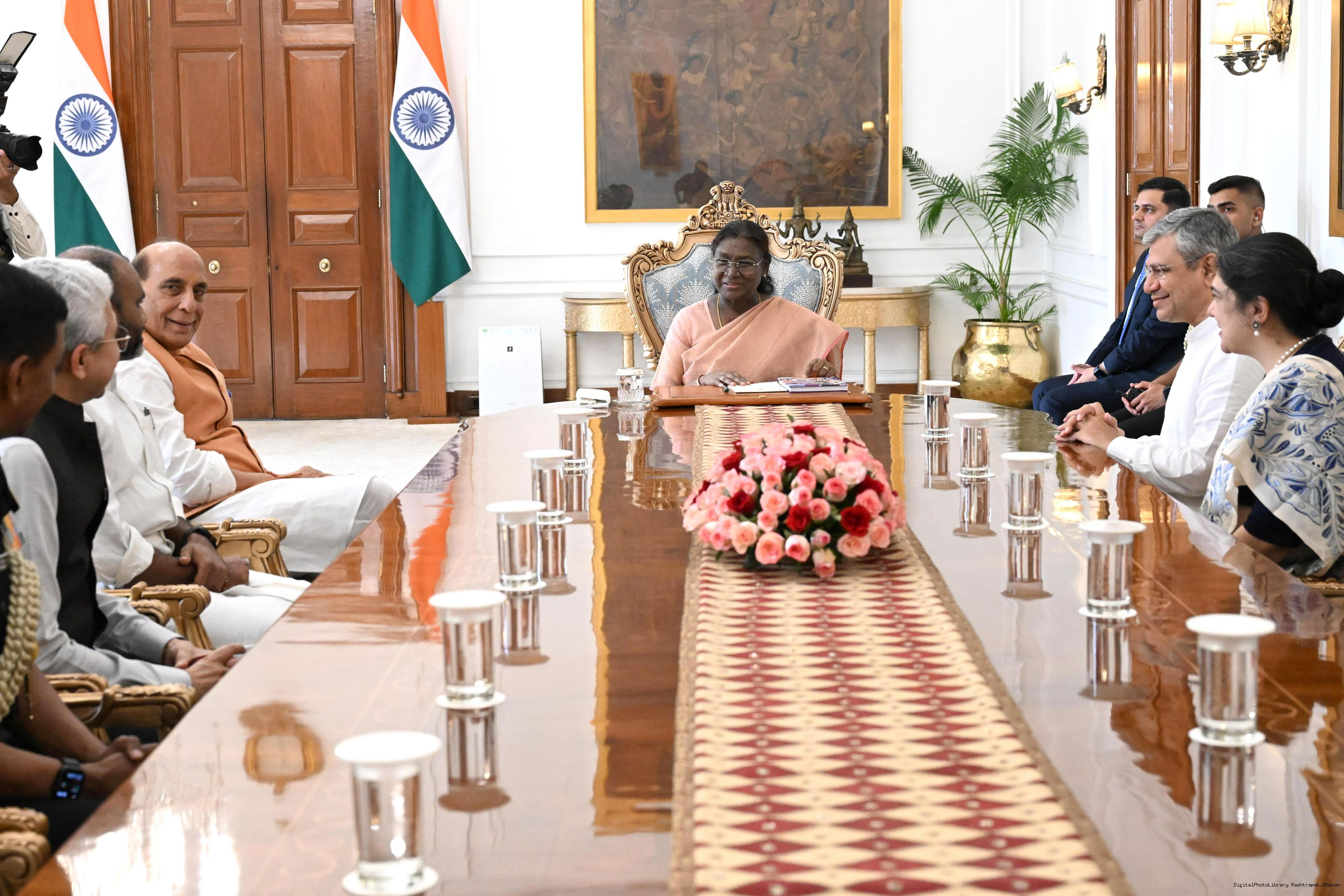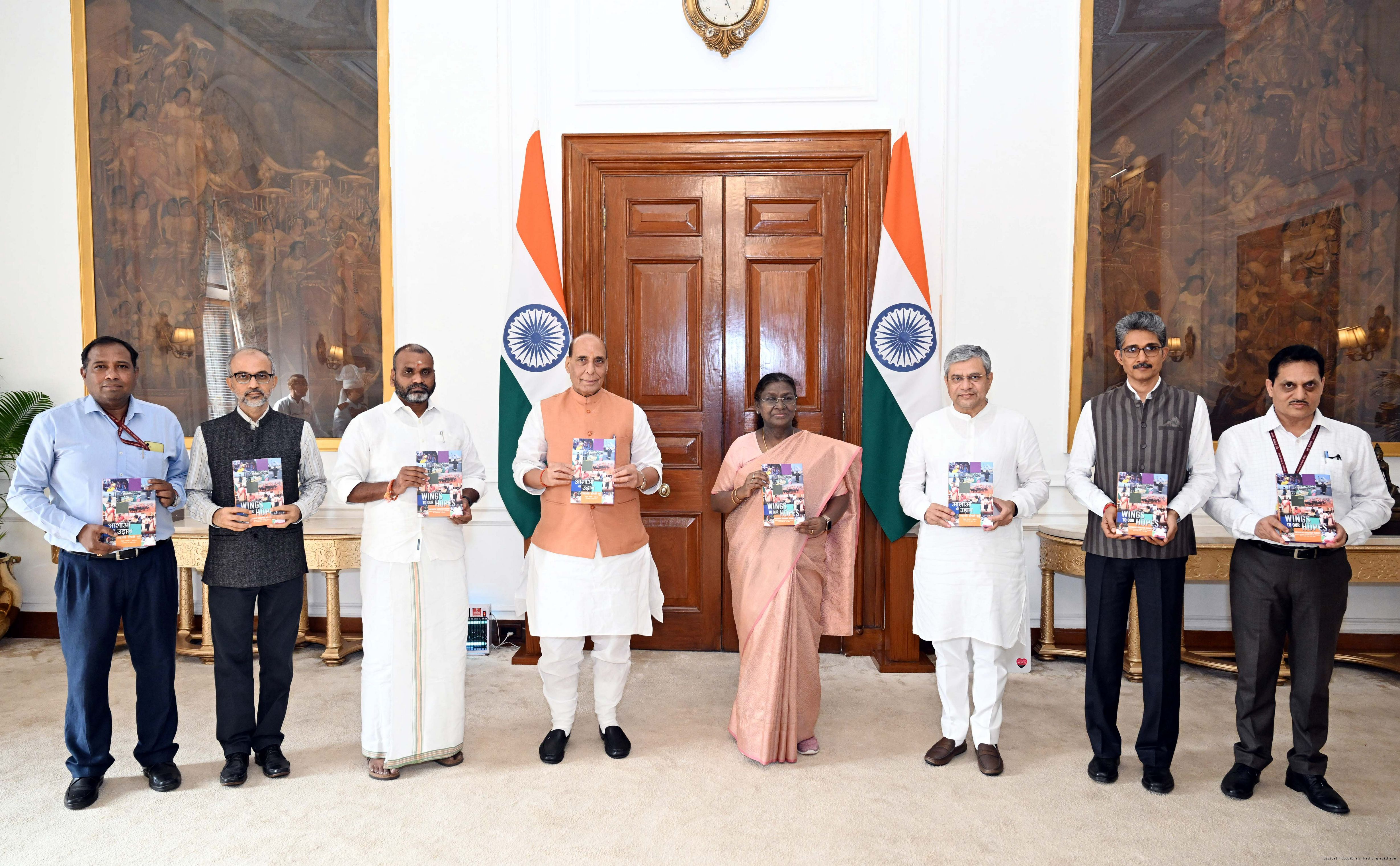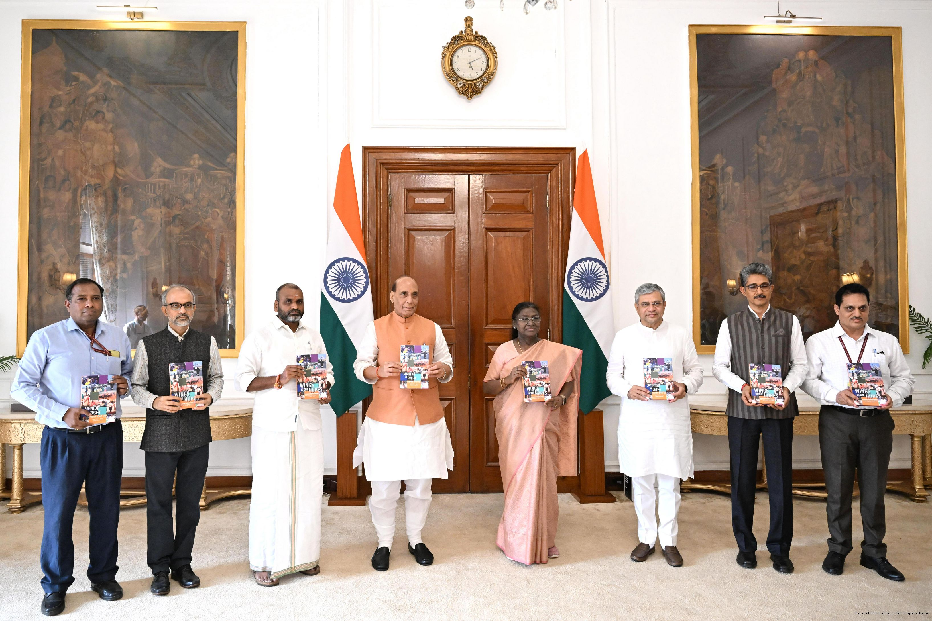 | Caption: | Raksha Mantri, Shri Rajnath Singh, along with Minister of Information Broadcasting, Shri Ashwini Vaishnaw and Minister of State for Information Broadcasting, Dr L. Murugan, presented first copies of the second volume of the books ‘Wings to Our Hopes’ and ‘Aashaon Ki Udaan’ to the President of India, Smt. Droupadi Murmu at Rashtrapati Bhavan on June 23, 2025. |